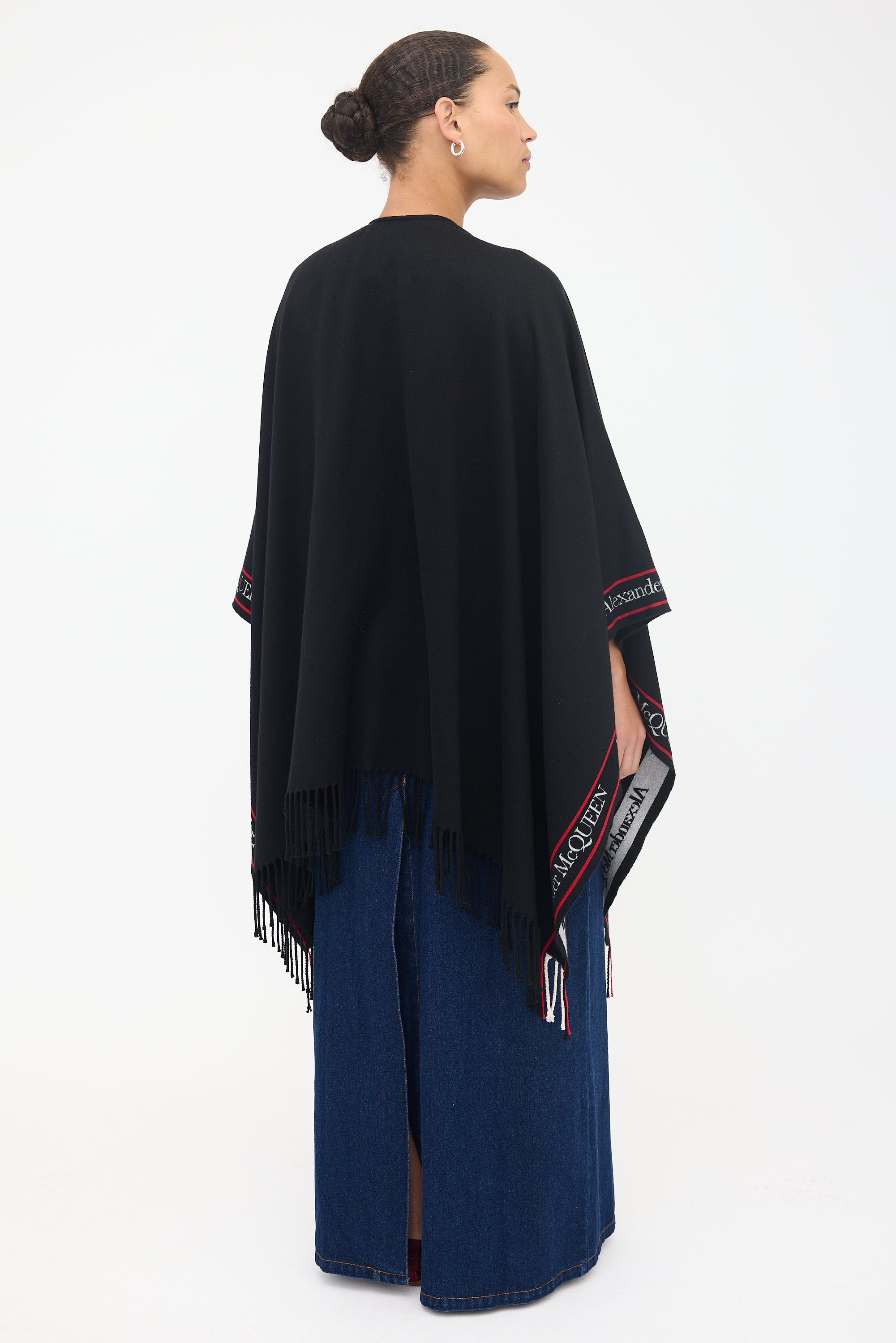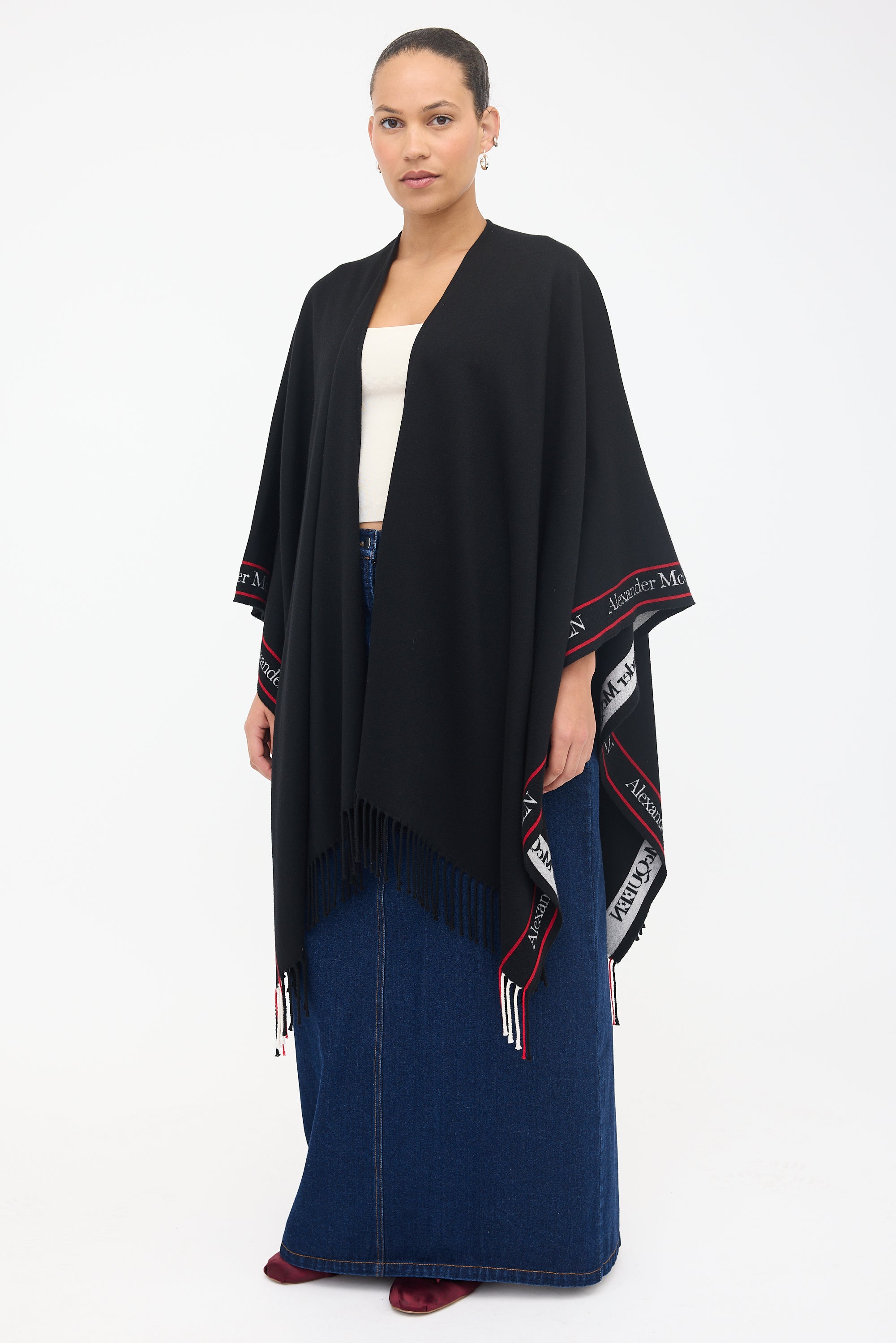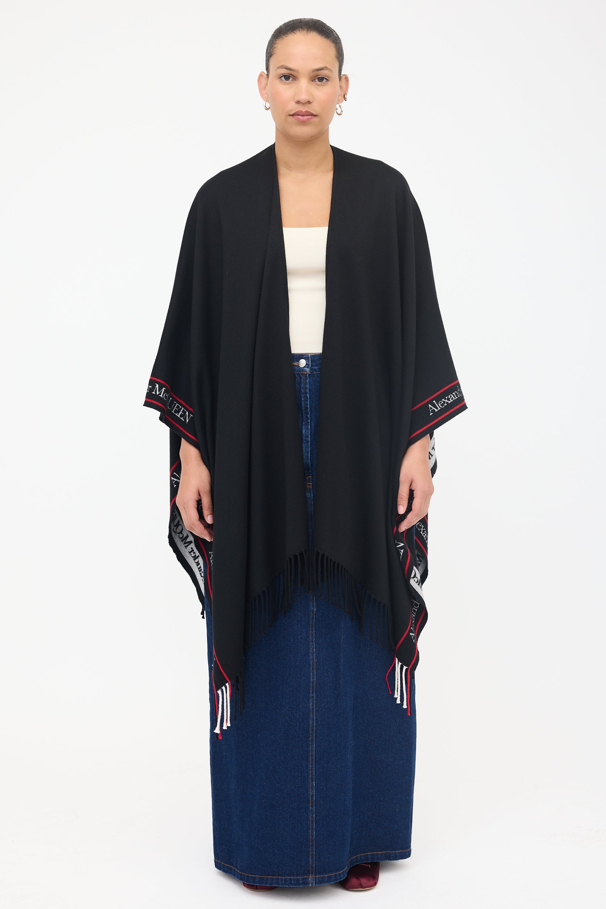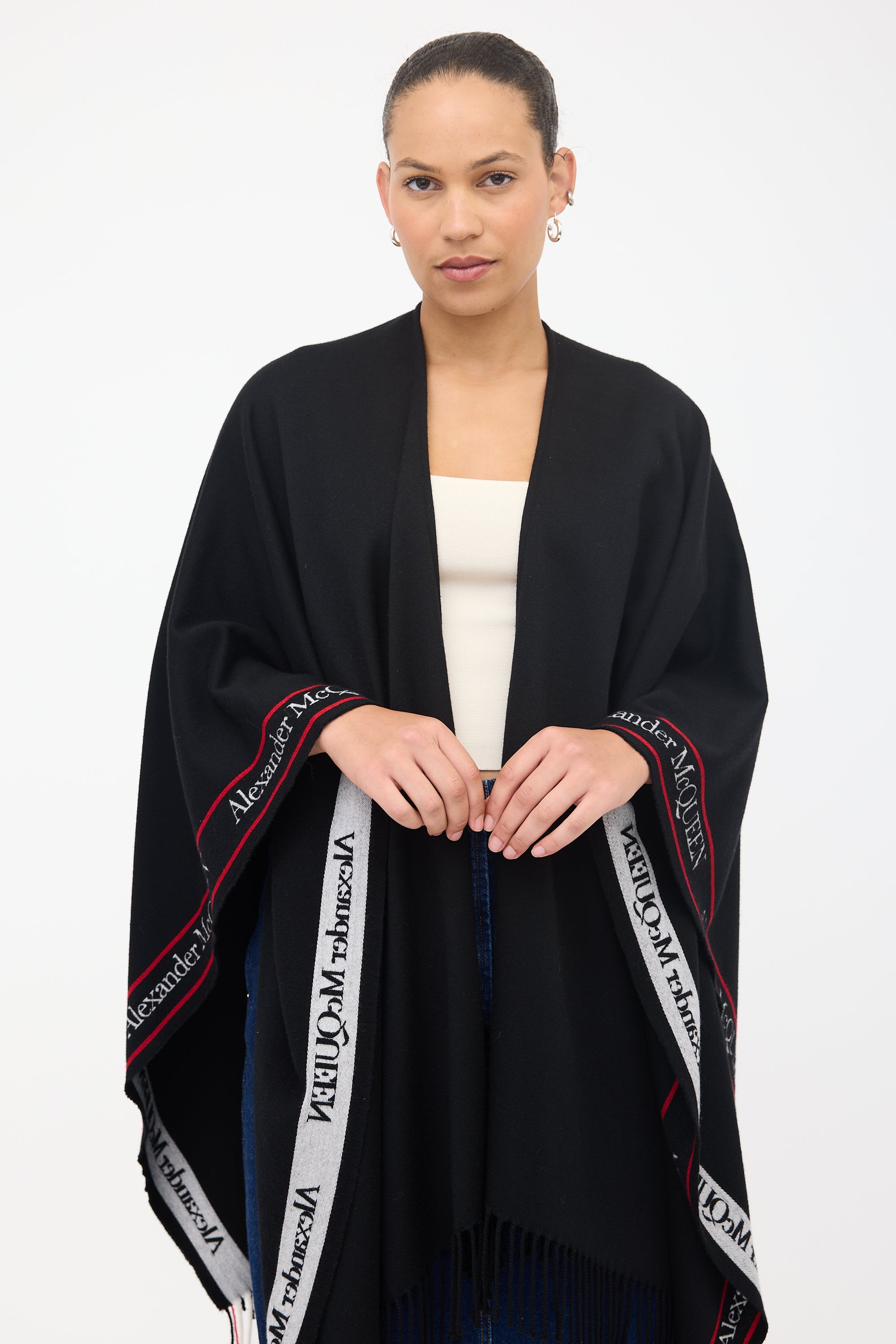 Pre-owned Alexander McQueen black wool shawl featuring white and red logo intarsia trim, open front design, and fringed edges.