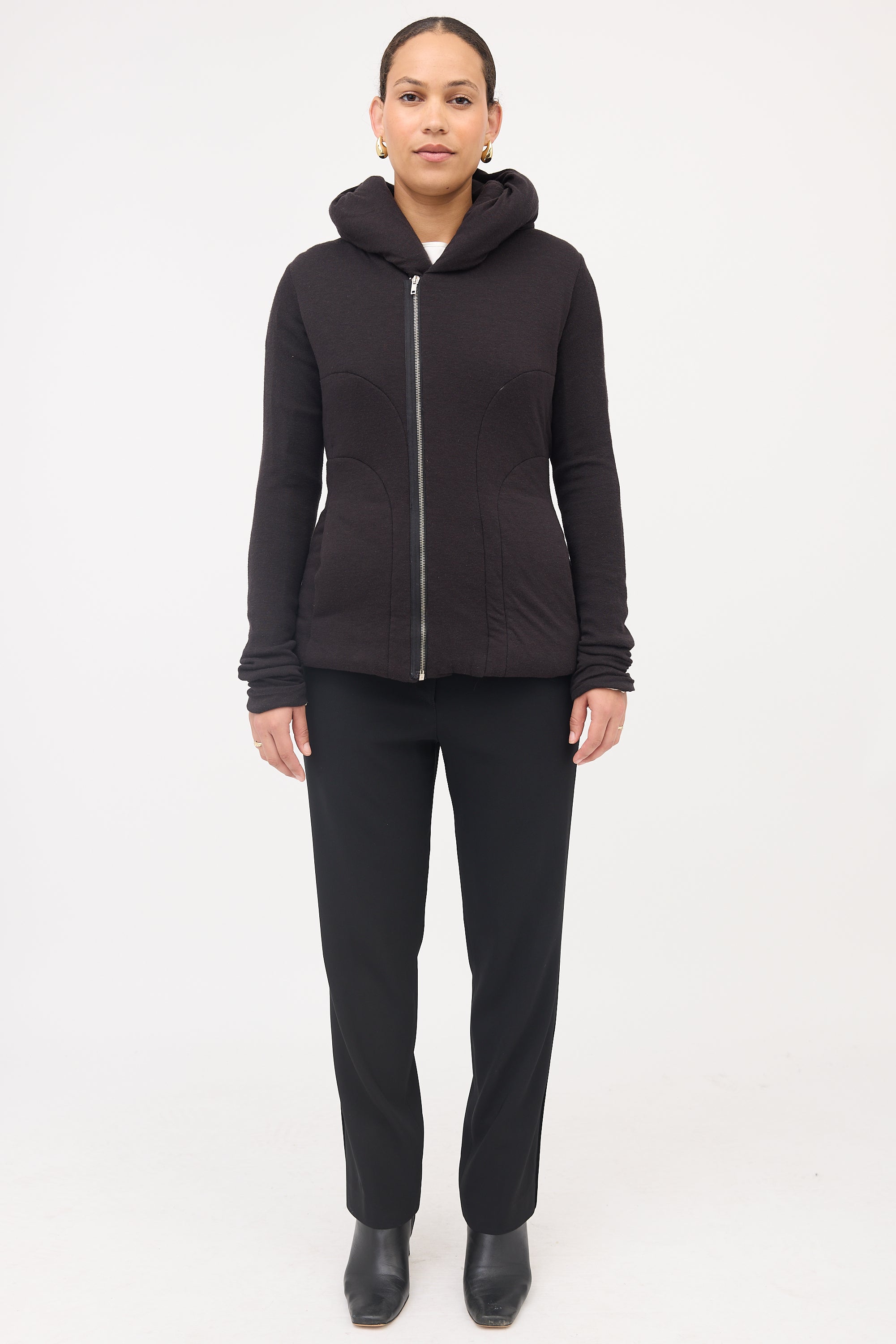 Pre-owned Rick Owens Lilies black padded sweater featuring an attached hood, zip front, and two slip pockets at hip.