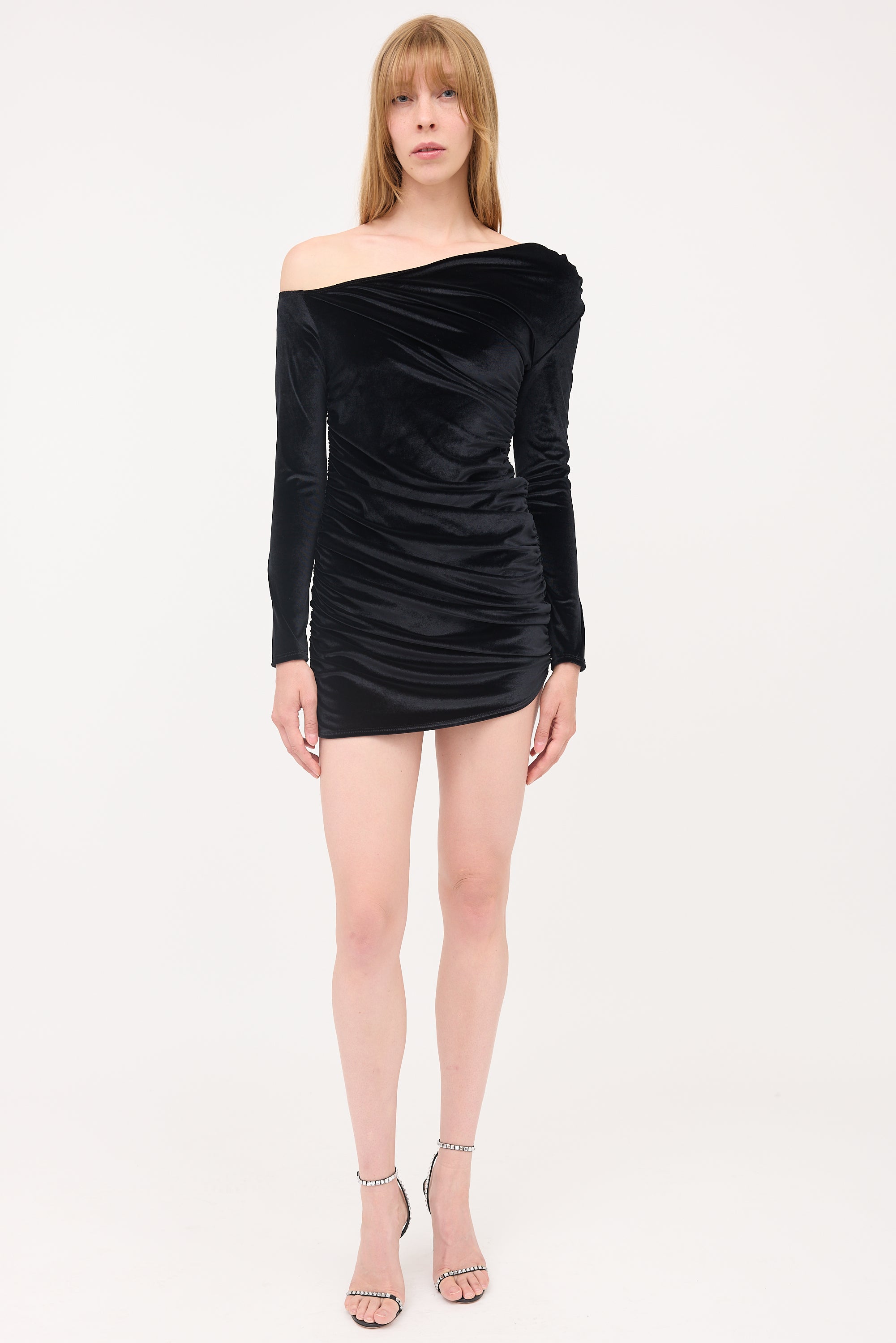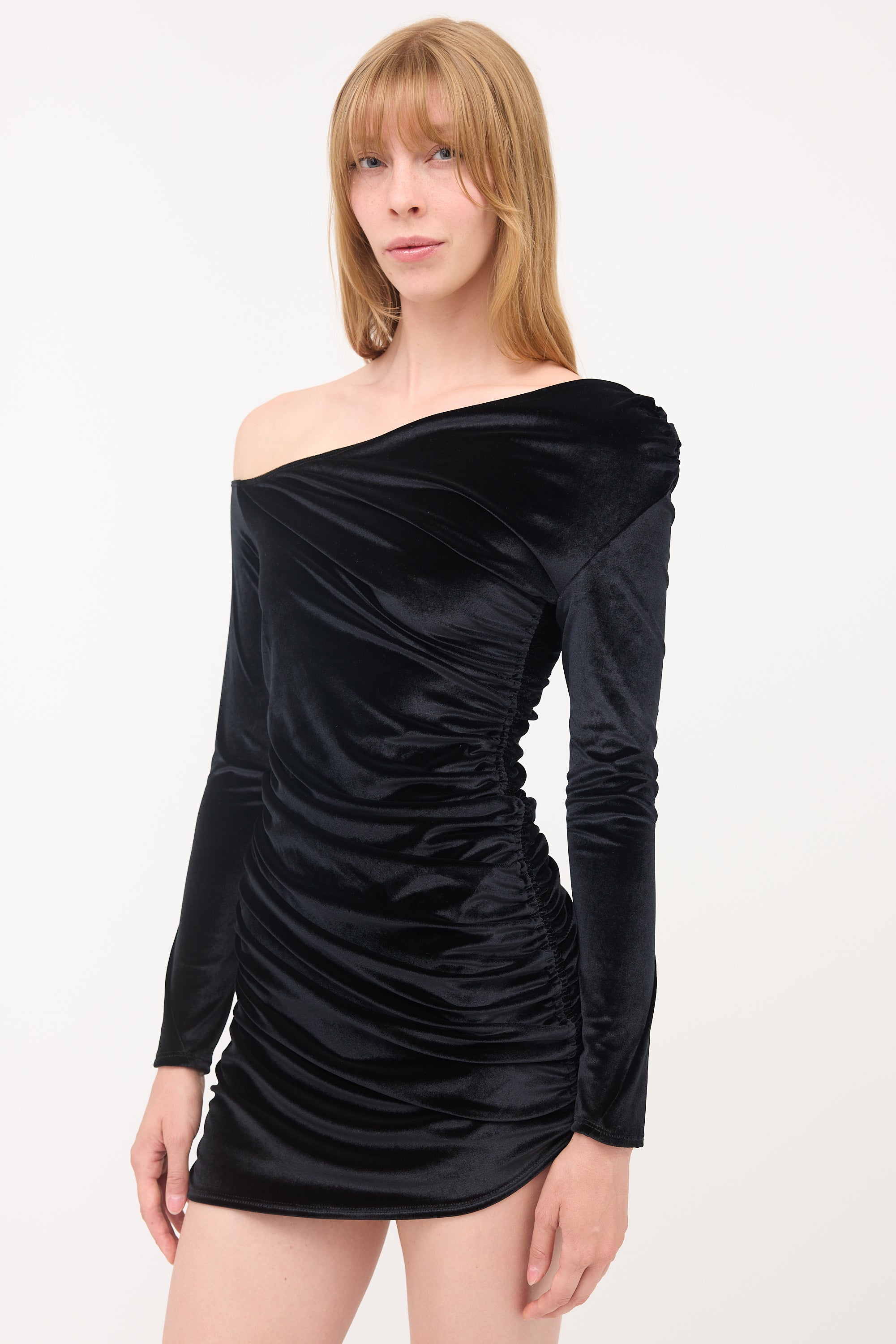Pre-owned Sid Neigum black velvet dress featuring an asymmetrical one shoulder styling and elasticized ruching throughout. Unlined.
