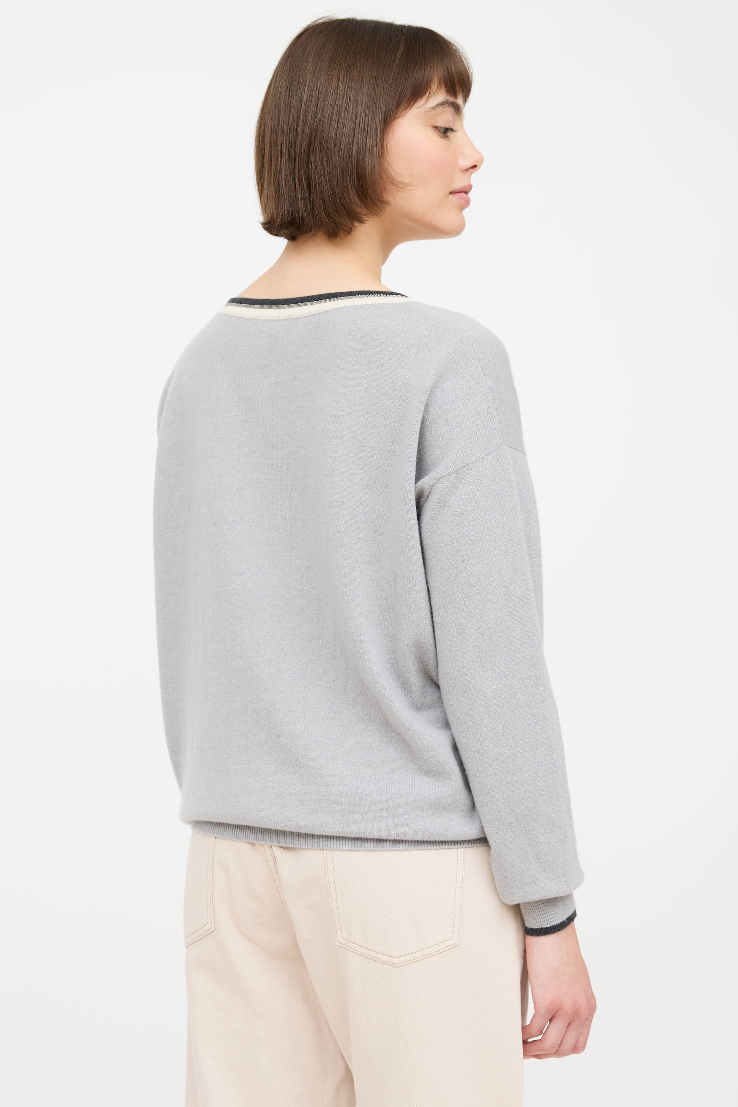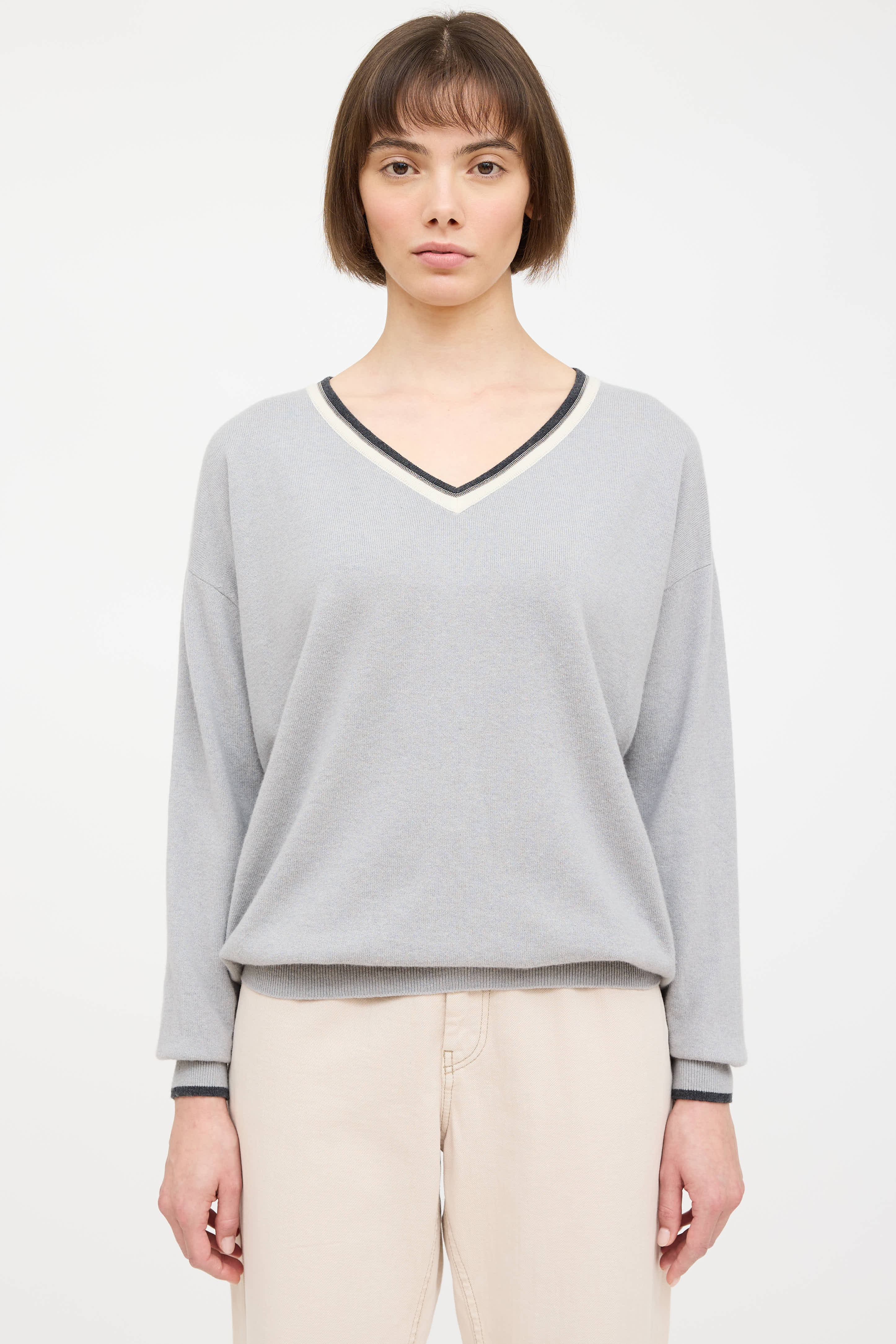 Pre-owned Brunello Cucinelli grey cashmere knit sweater featuring a black V-neckline with monili bead trim, long sleeves, and ribbed hem.