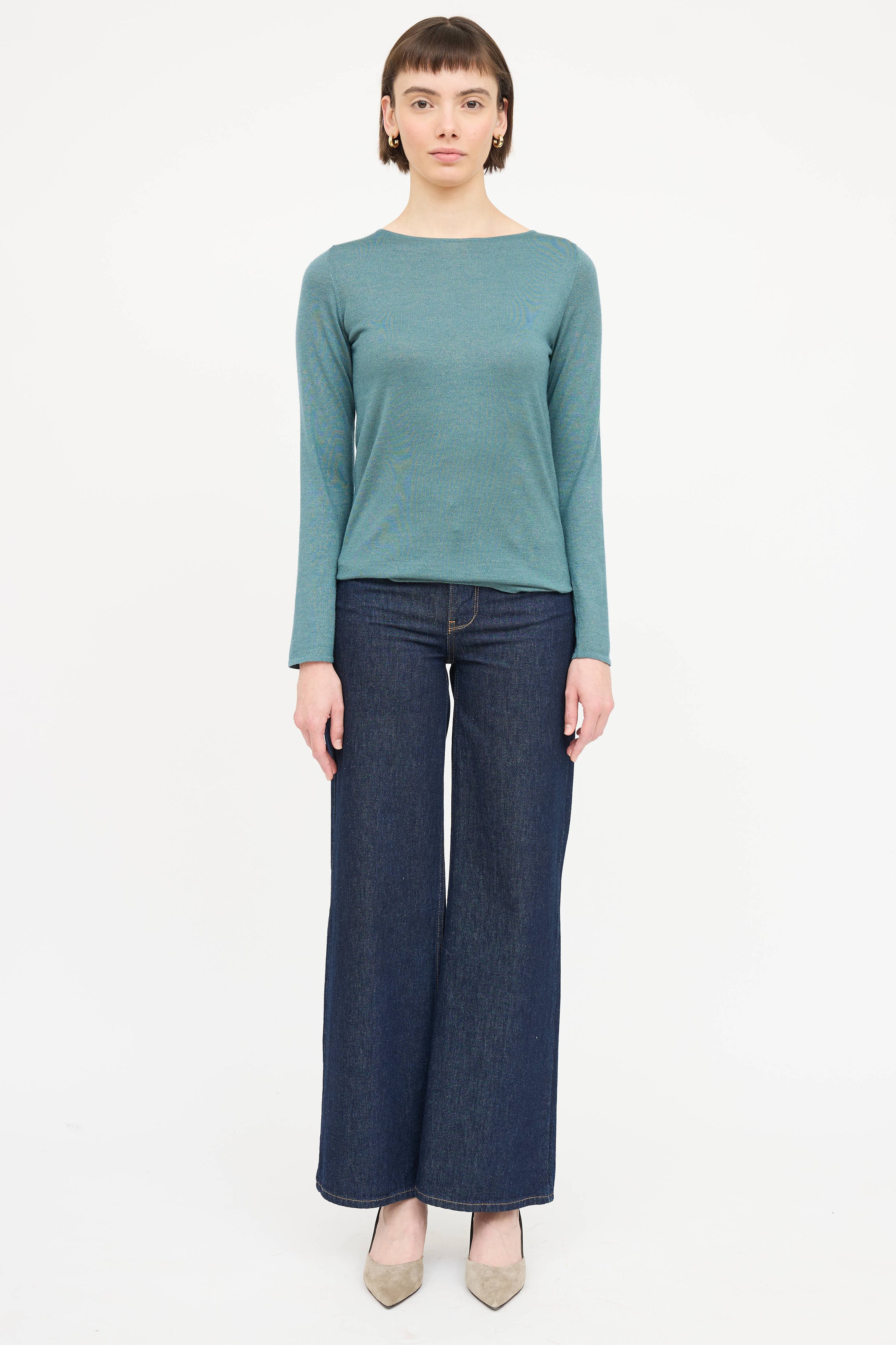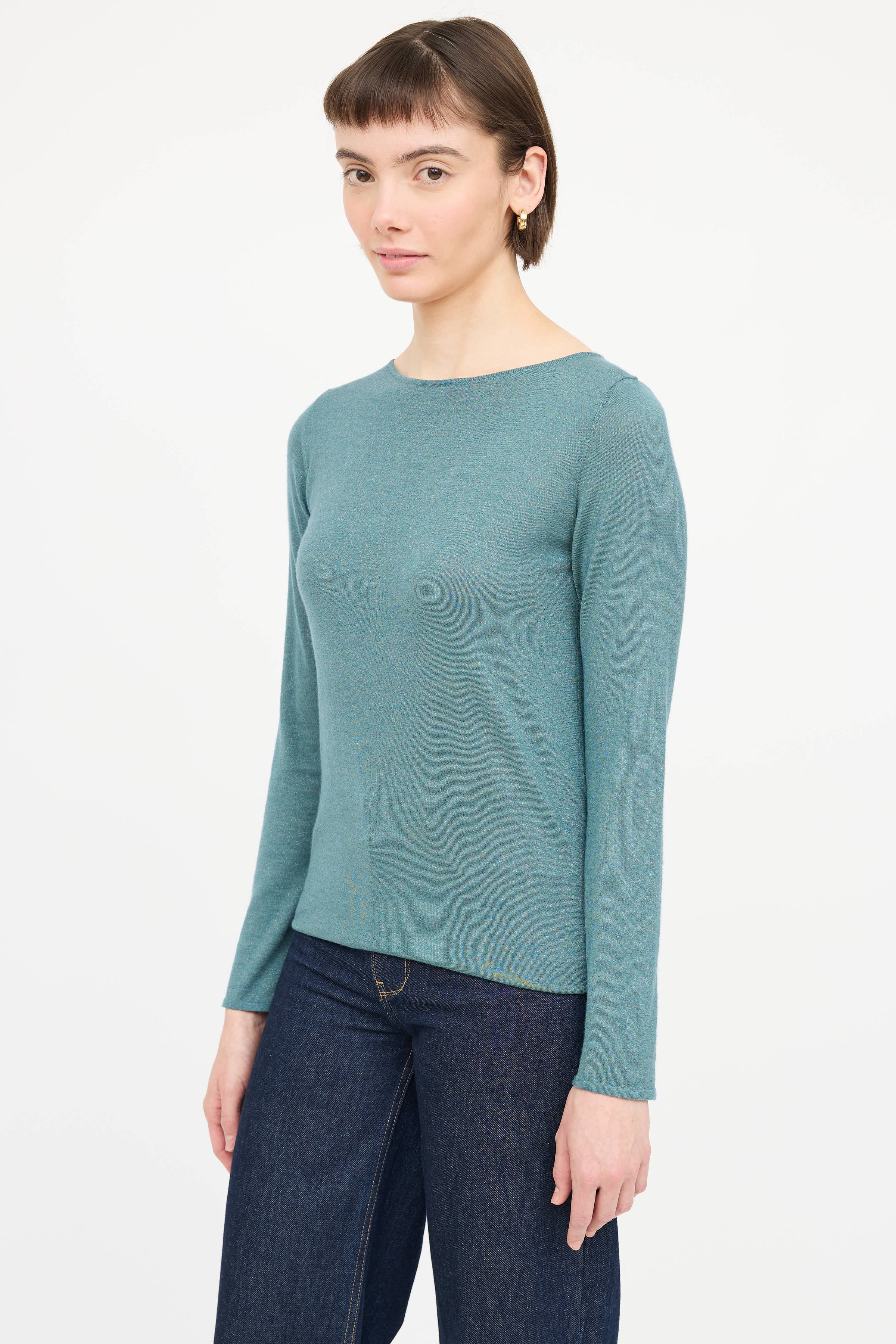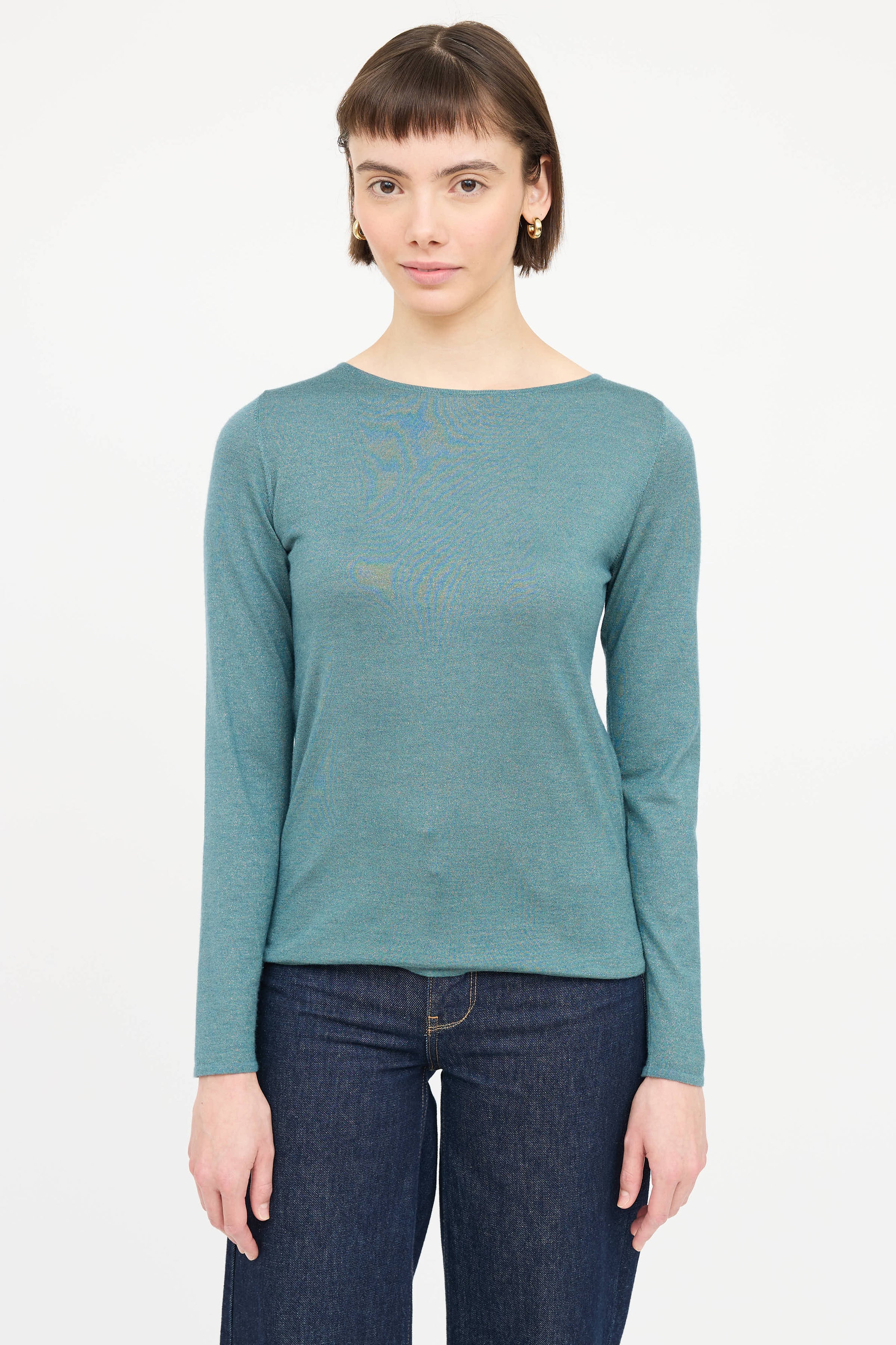 Pre-owned Brunello Cucinelli green long sleeve top featuring round neckline and gold metallic thread throughout.