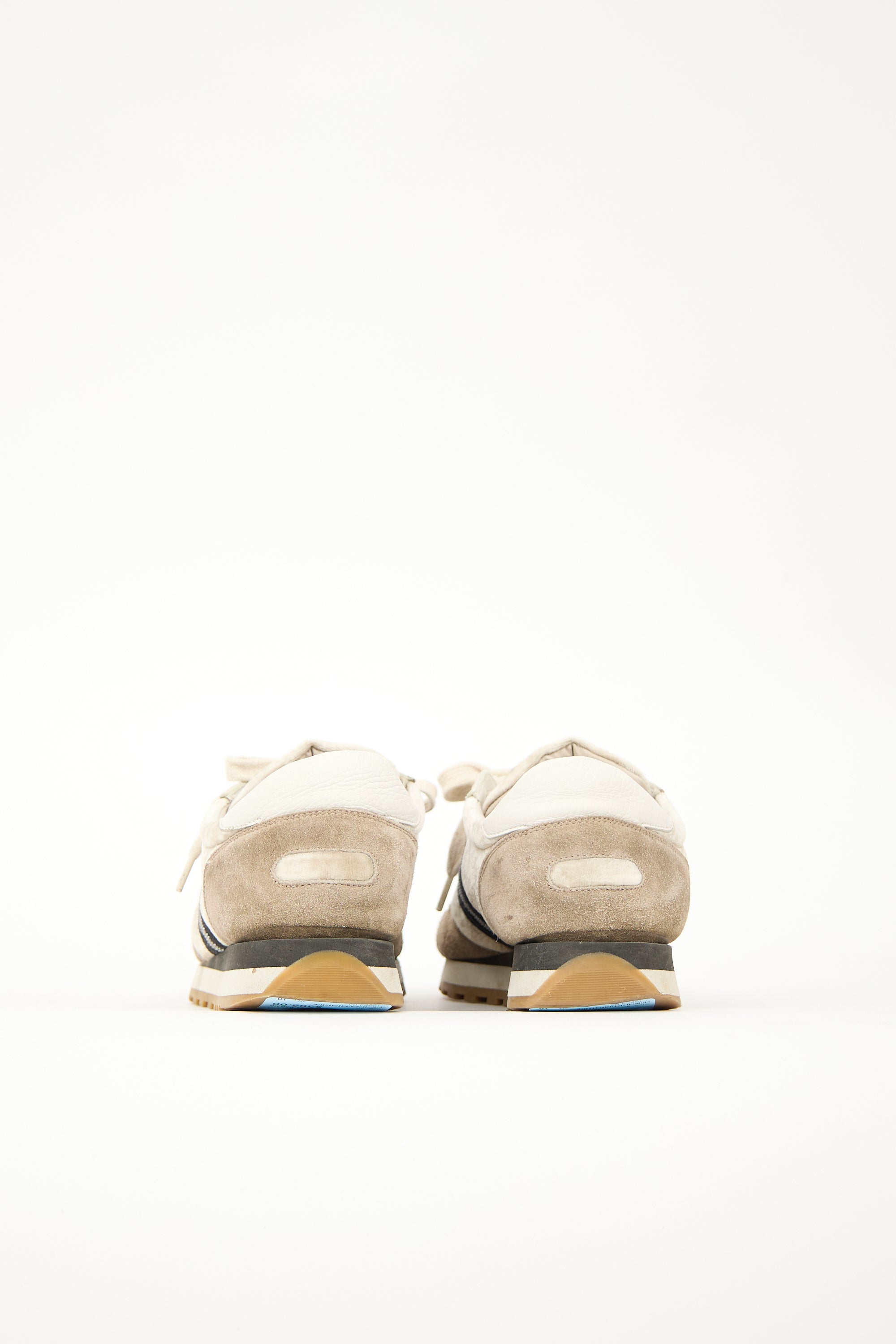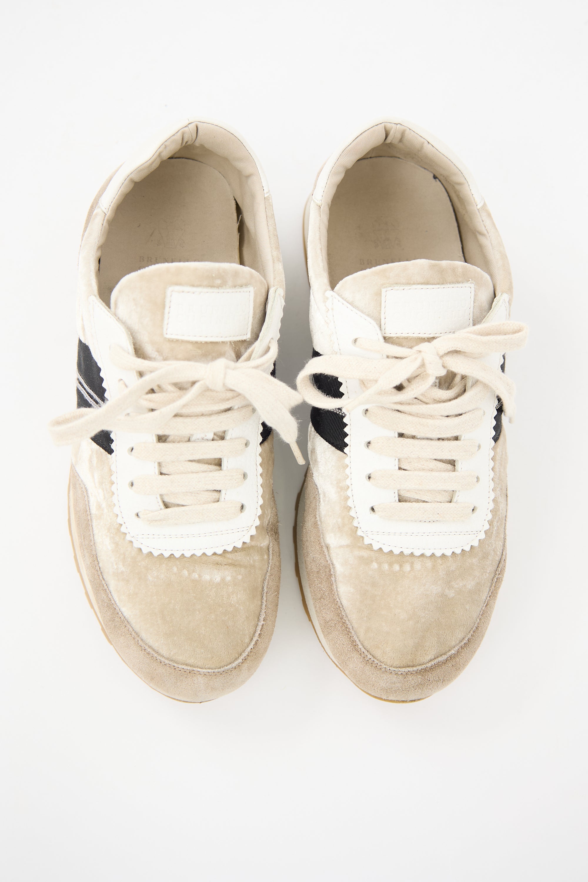 Pre-owned Brunello Cucinelli beige glitter velvet sneakers featuring rounded toe, lace up instep, black grosgrain side stripes with Monili bead trim, stamped logo tab at tongue, and layered rubber sole.
