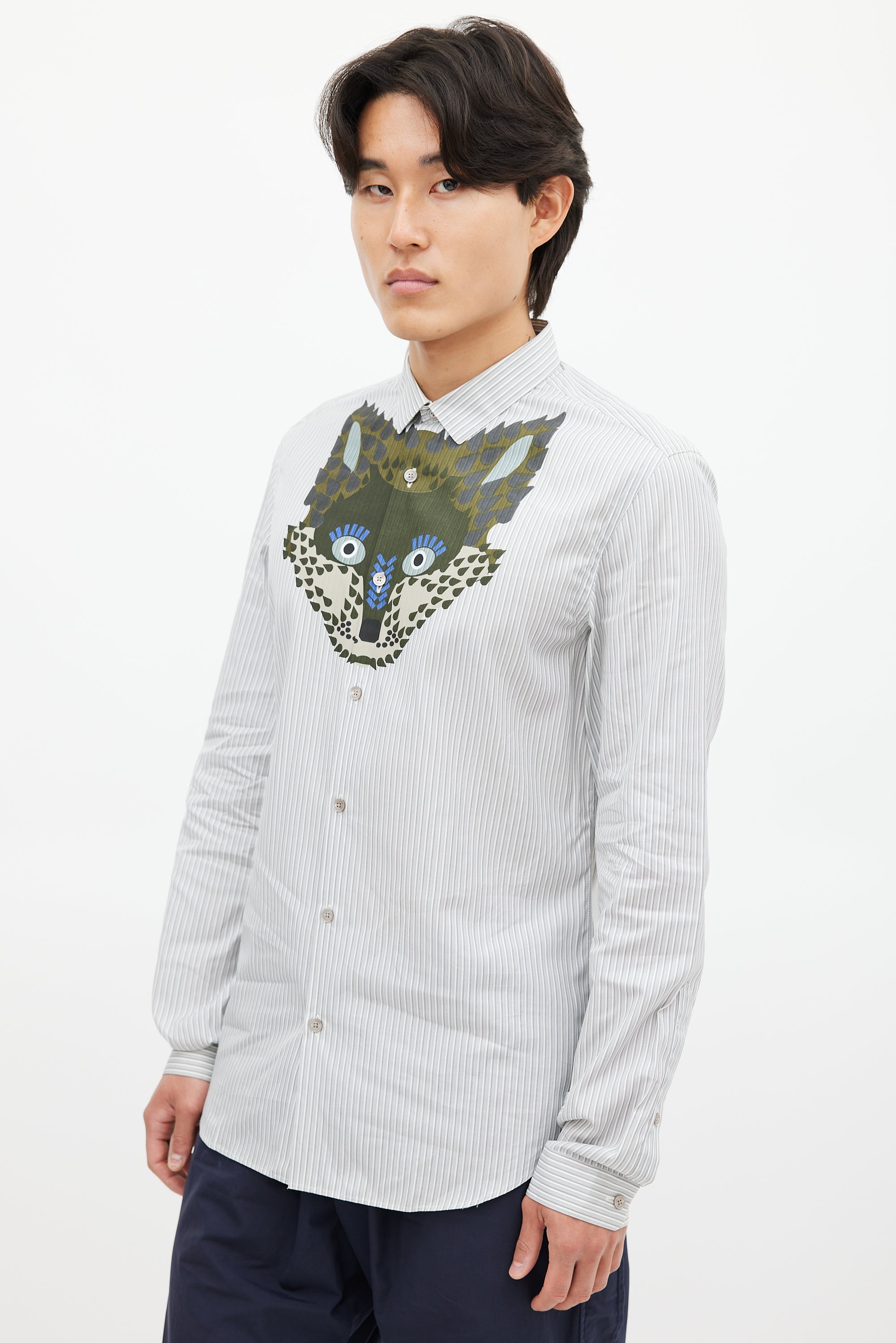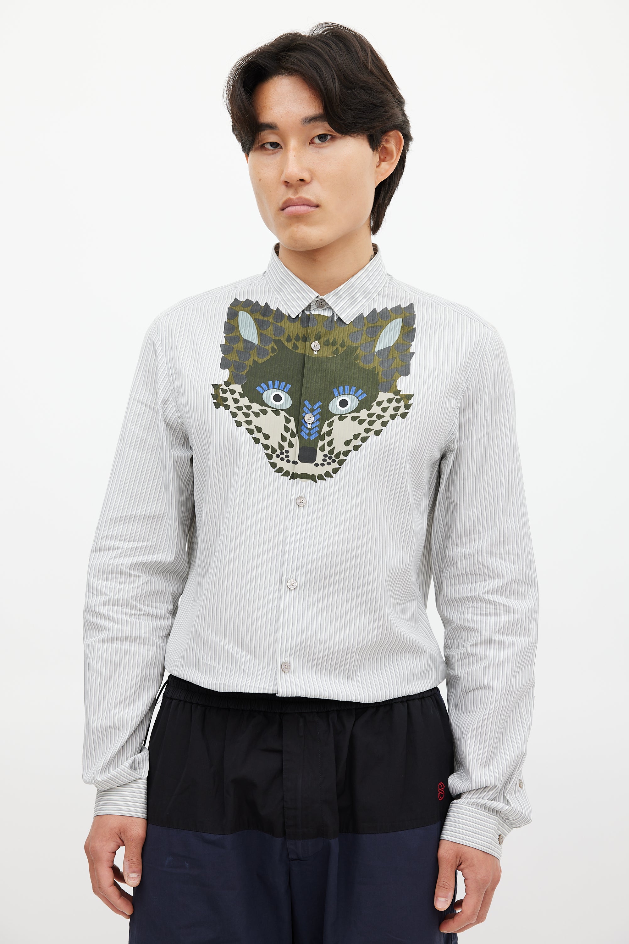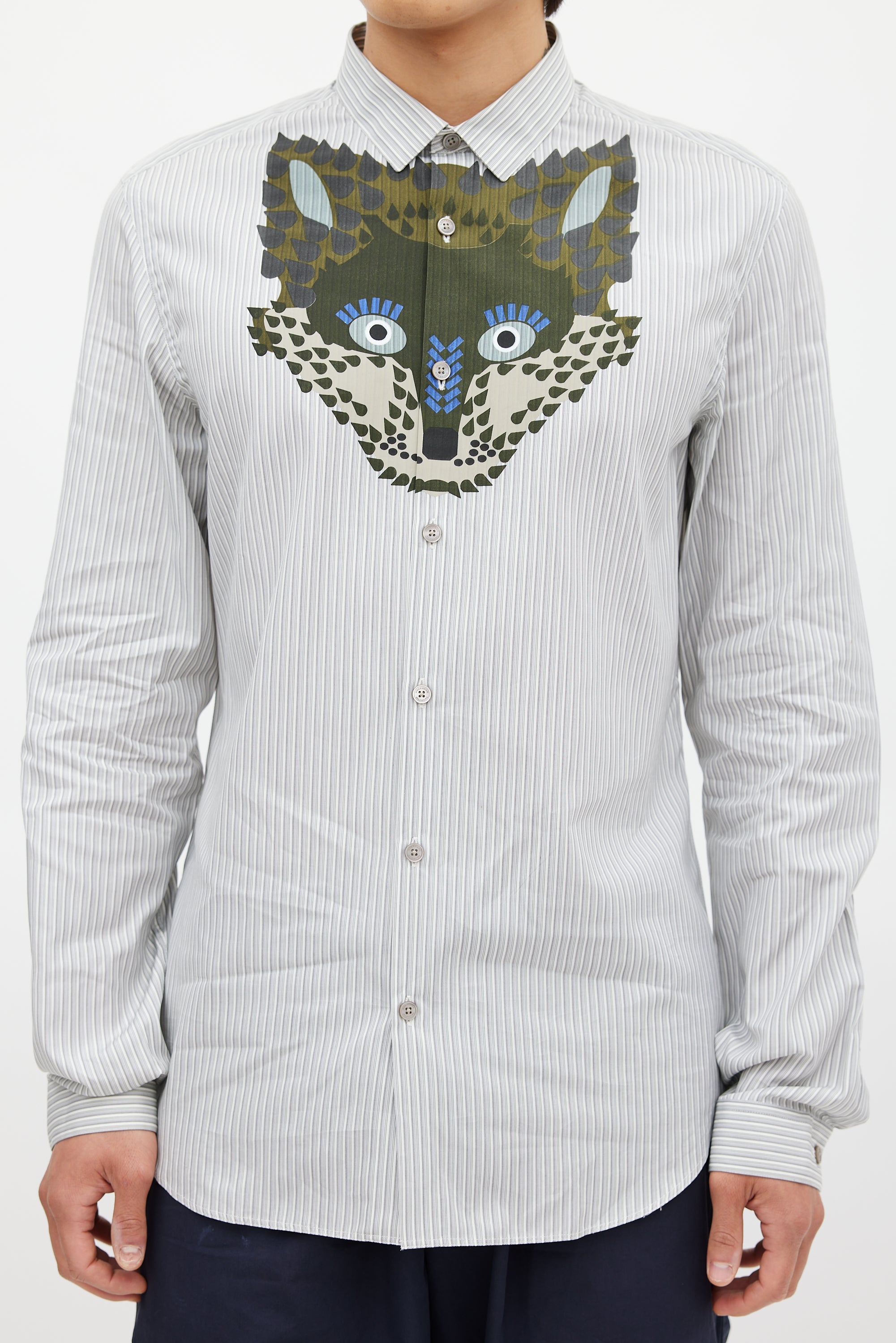 Pre-owned Burberry Prorsum grey shirt featuring a multicolour fox graphic at chest, tonal striped pattern throughout, long sleeves with buttoned cuffs, and button up closure.