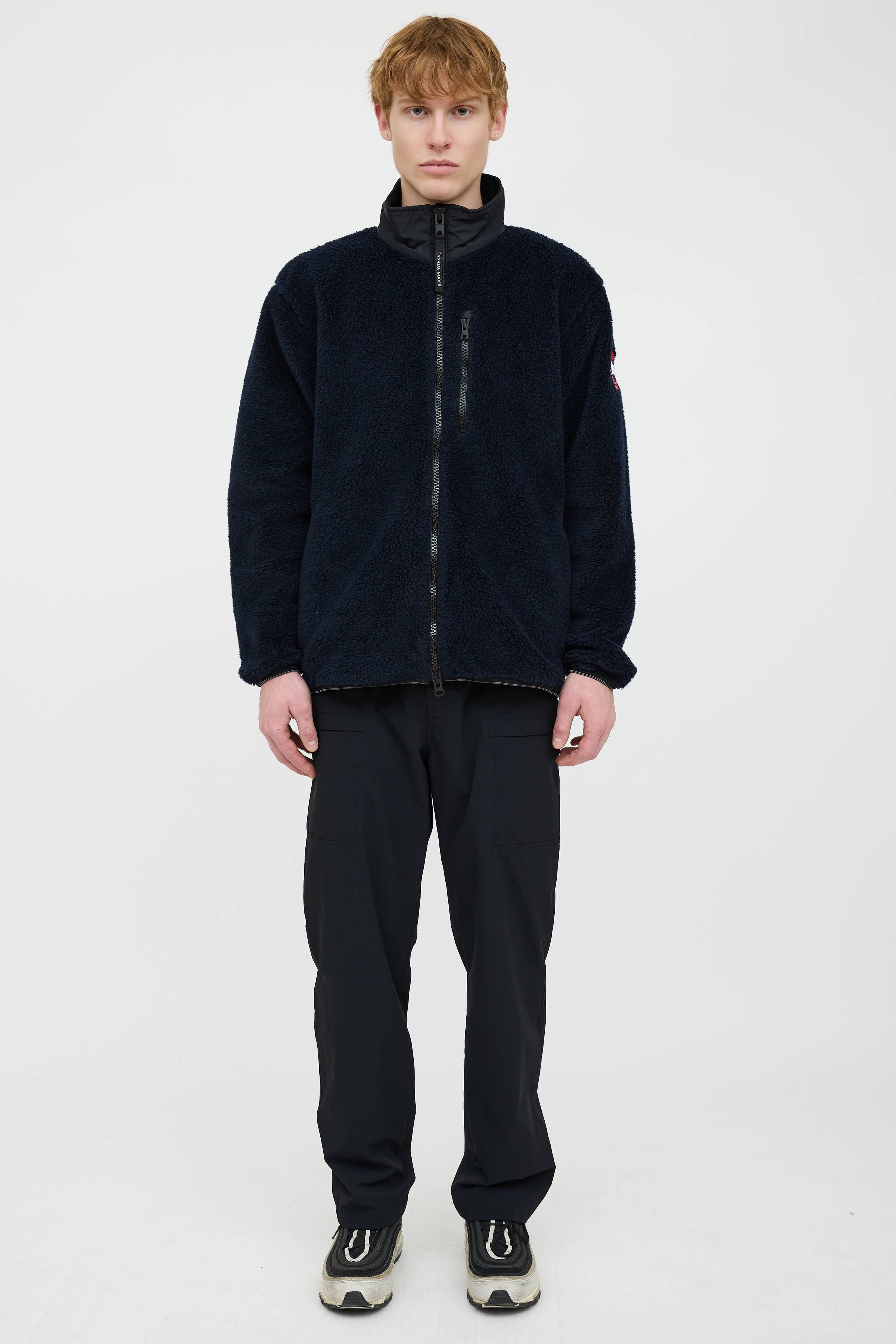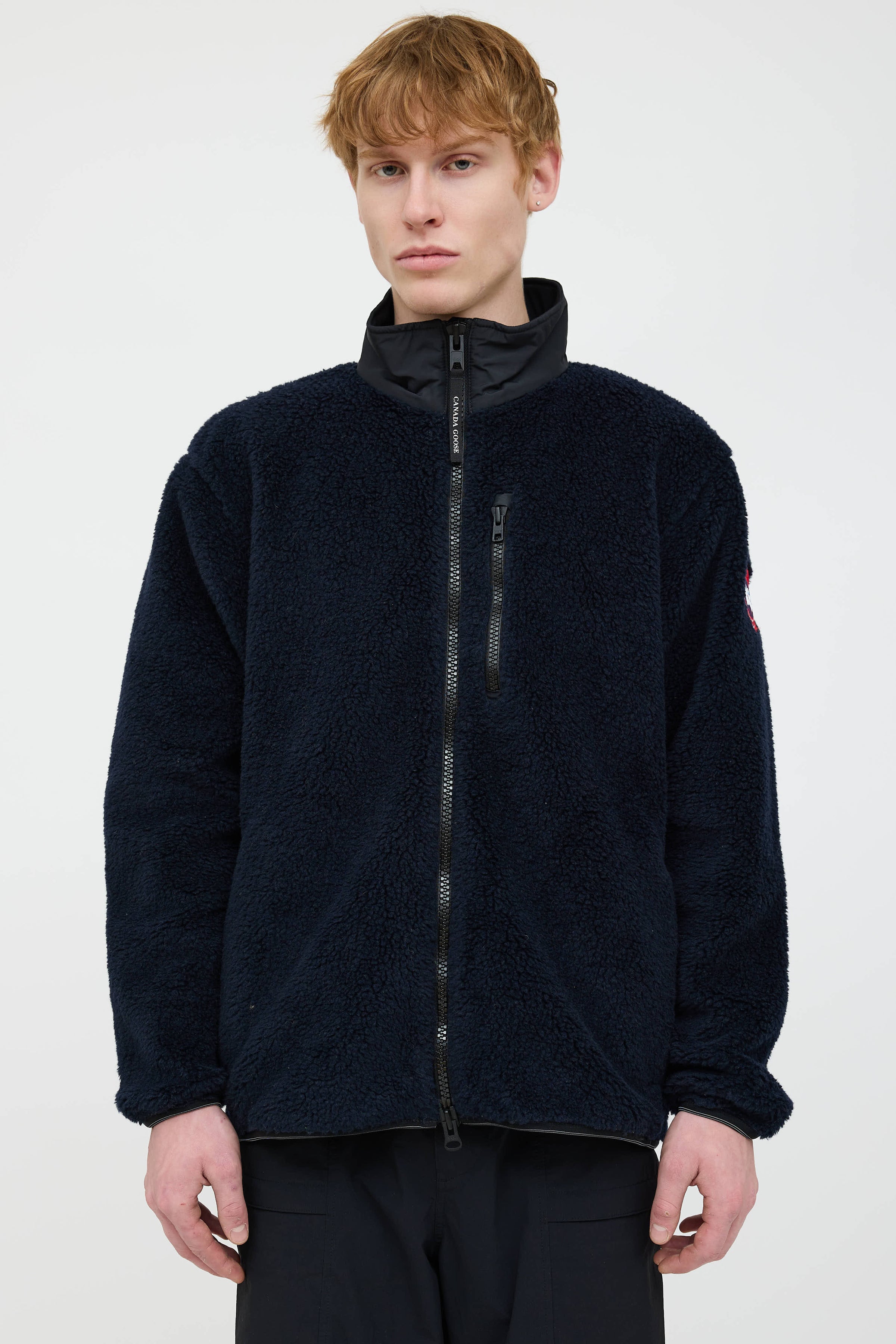Pre-owned Canada Goose navy and black long sleeve Kelowna jacket featuring funnel neck collar, double zip front, nylon elbow patch, zip pockets at chest and at side, and embroidered logo patch at left sleeve.