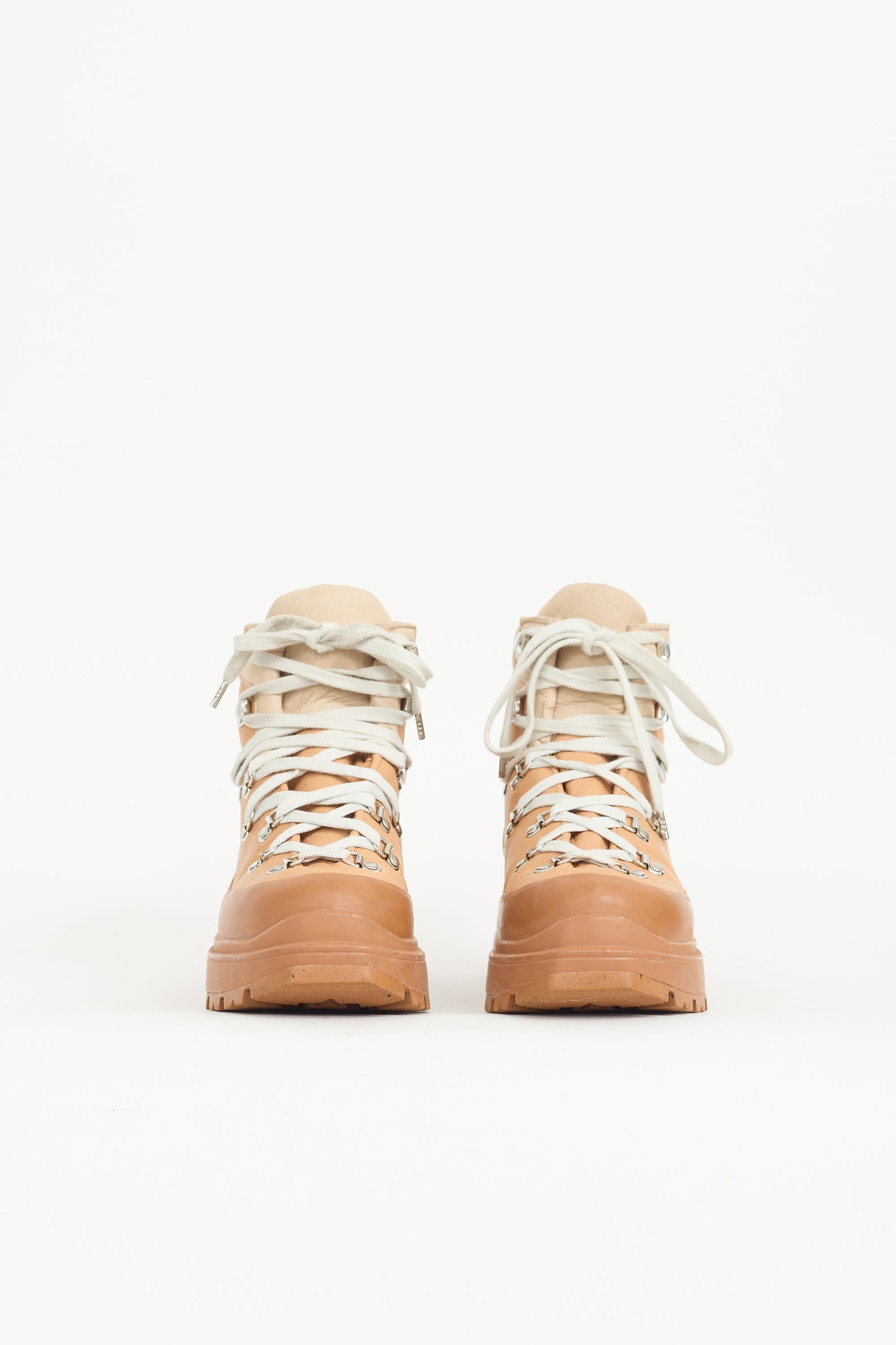 Pre-owned Canada Goose brown leather Journey boots featuring rounded toe, lace up front, stamped logos at tongue and outer shaft, padded collar, and rubber lug sole with rubber trim.