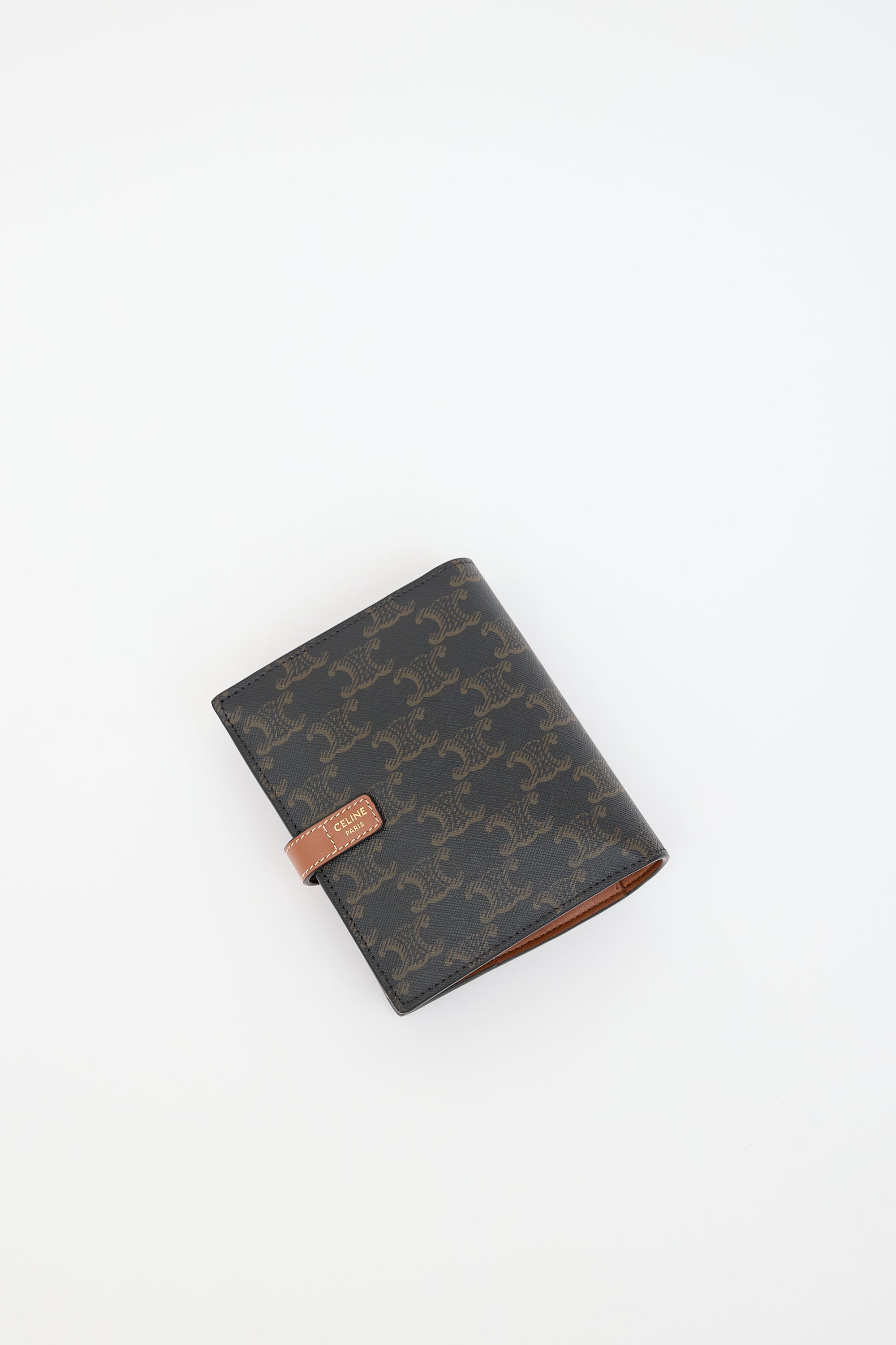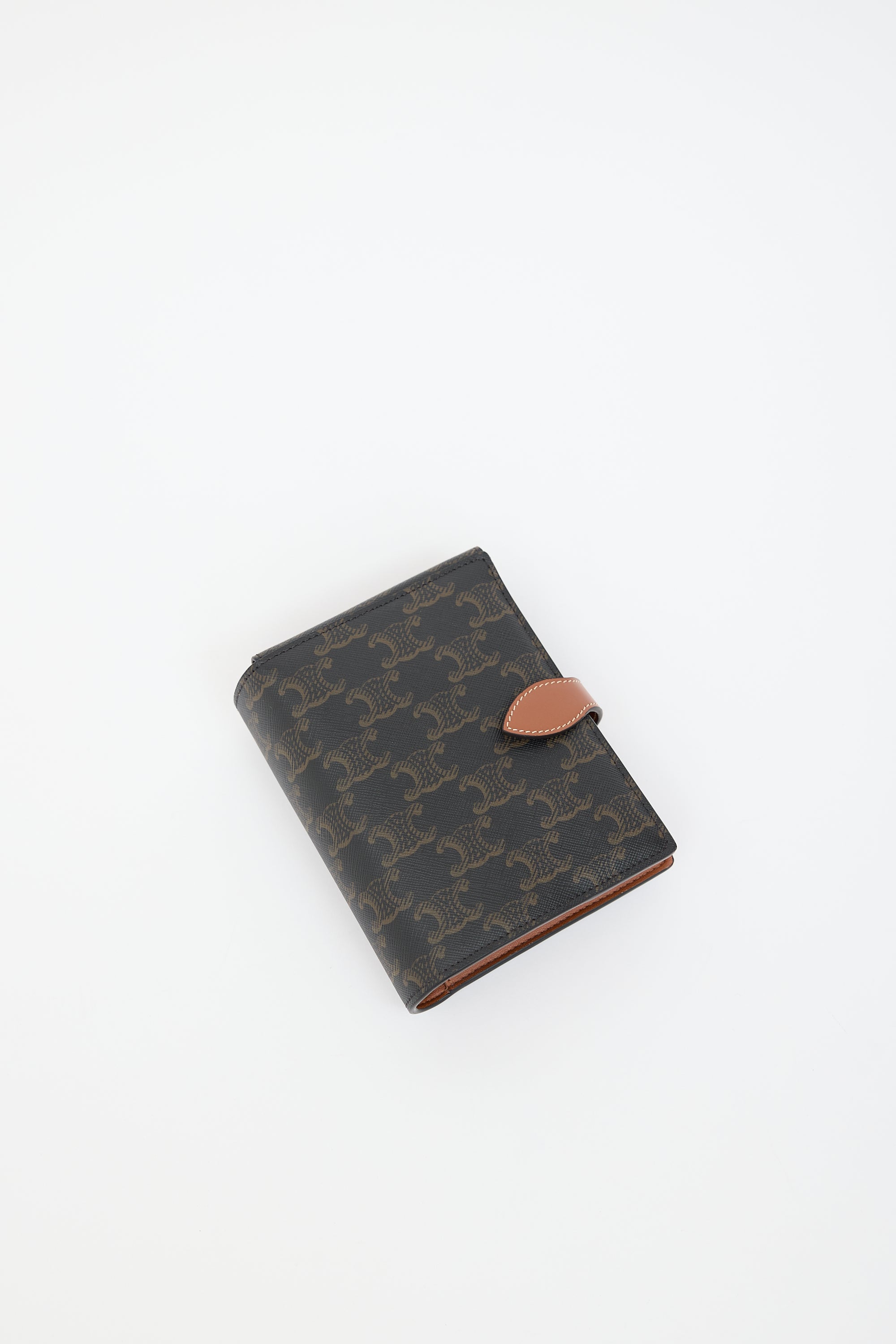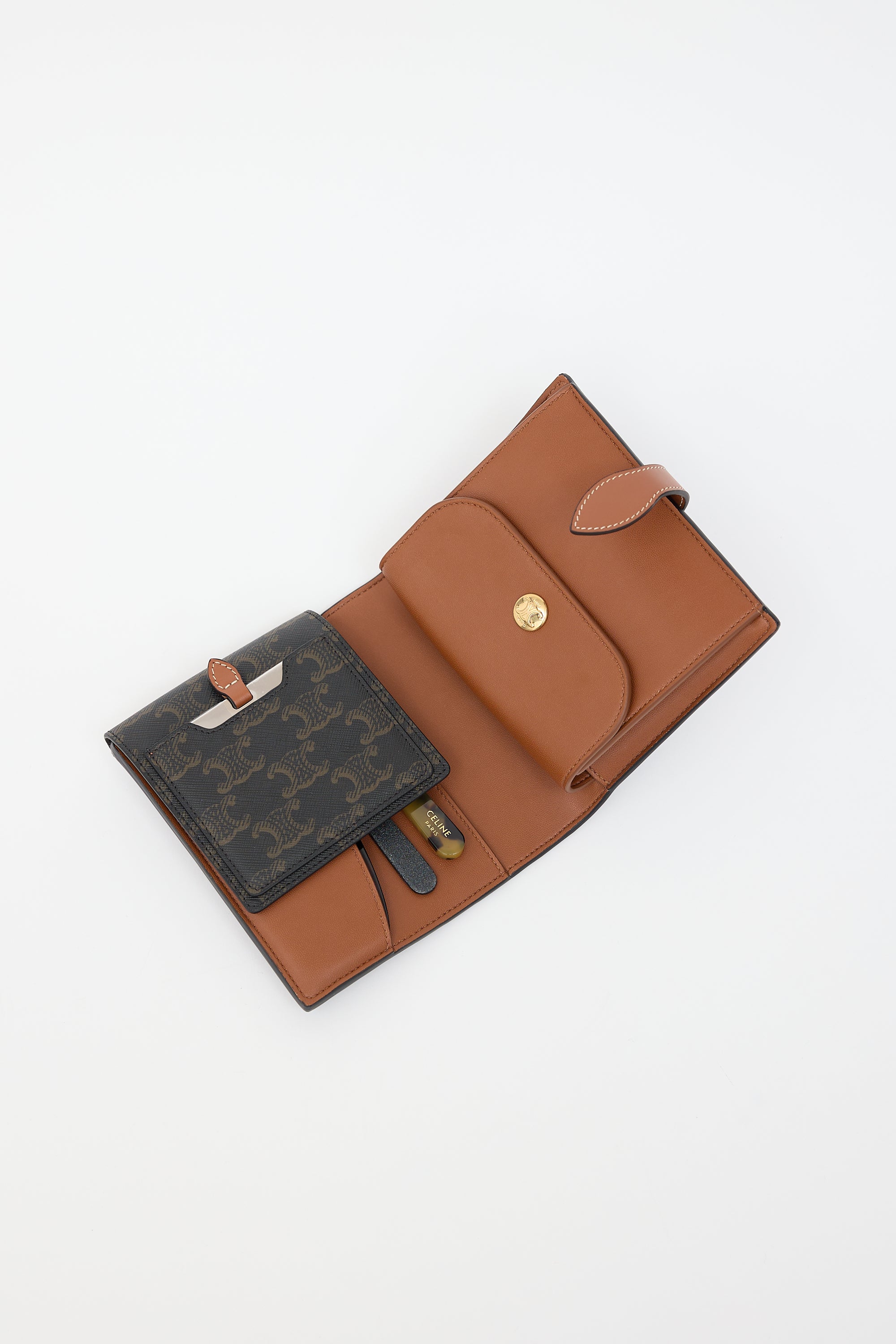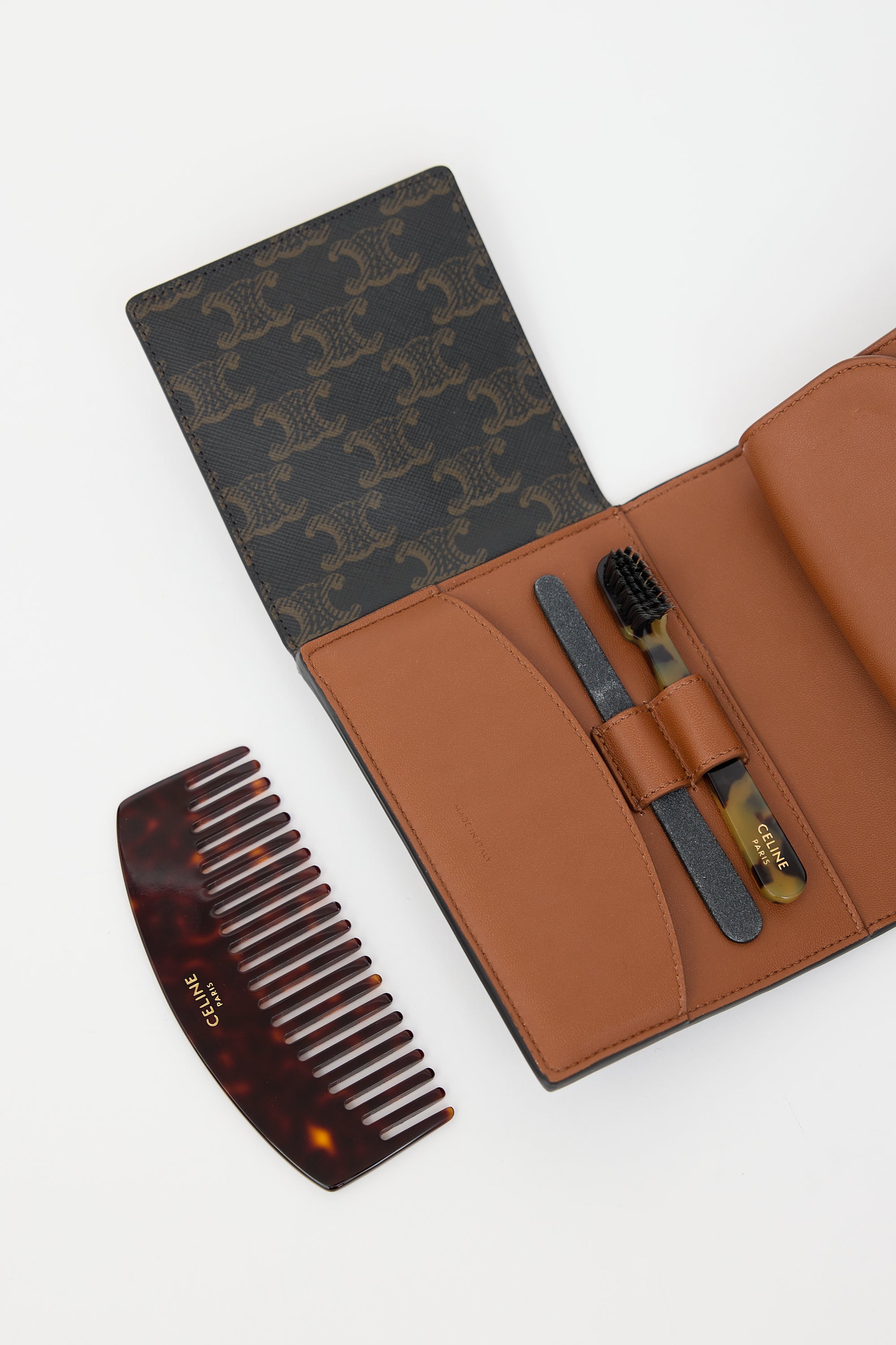 Celine brown Triomphe Travel Kit pouch featuring signature Triomphe print throughout outer, gold tone hardware, snap button closure, one lined main compartment with one inner flat pocket, one pocket mirror, one curved hair comb, one travel size toothbrush, one nail file, and one Triomphe printed eye mask. Comes with original dust bag.