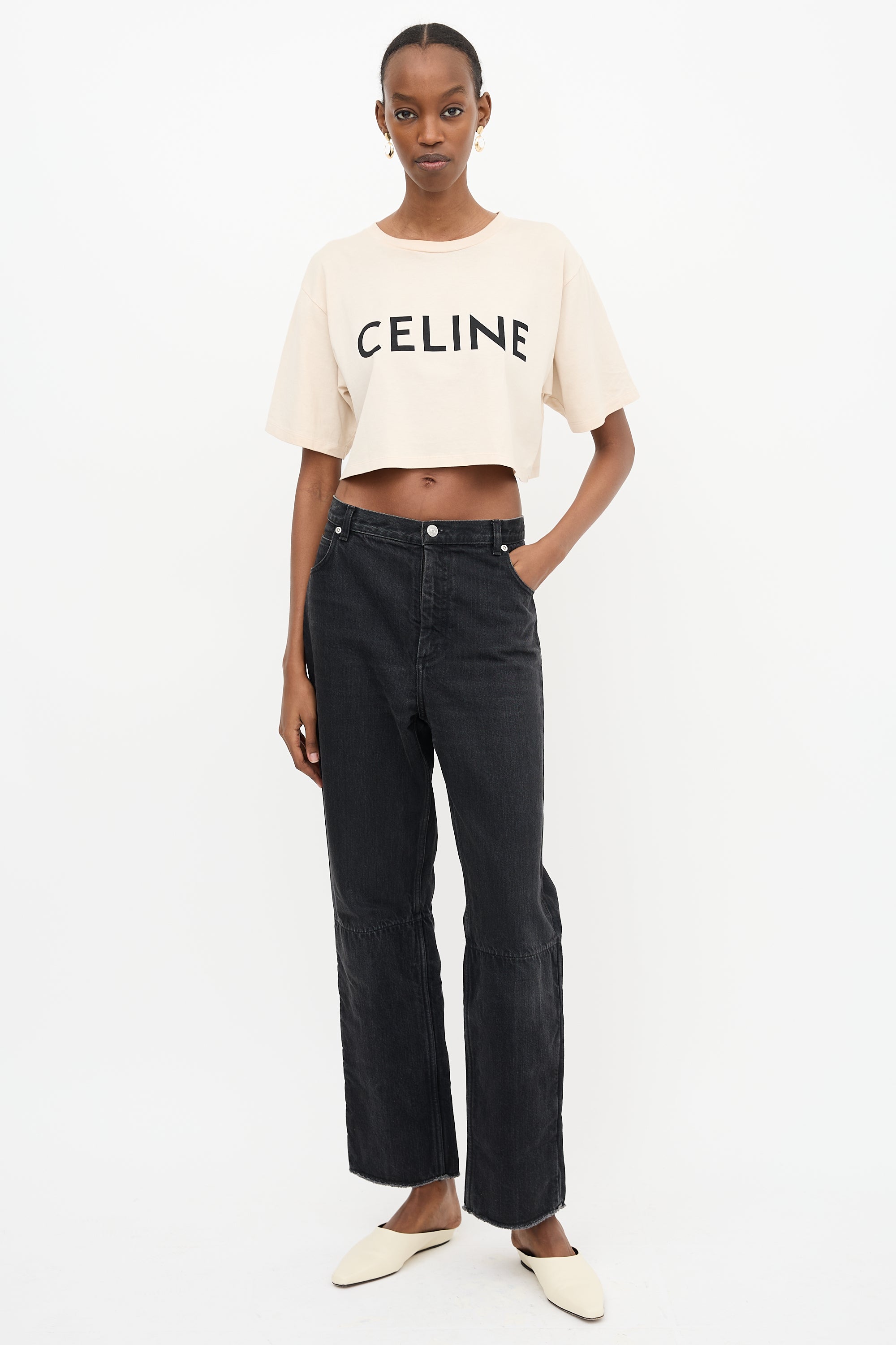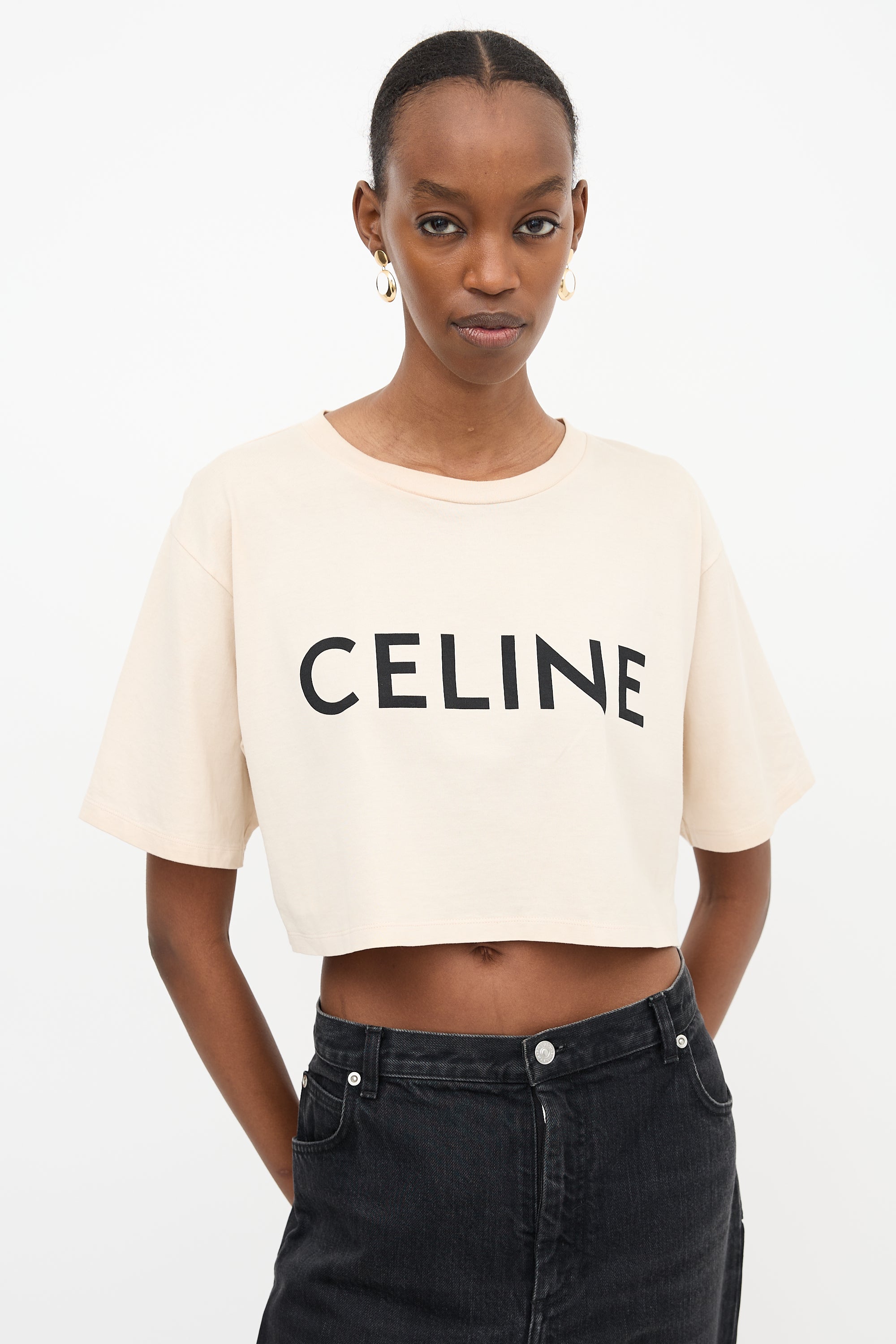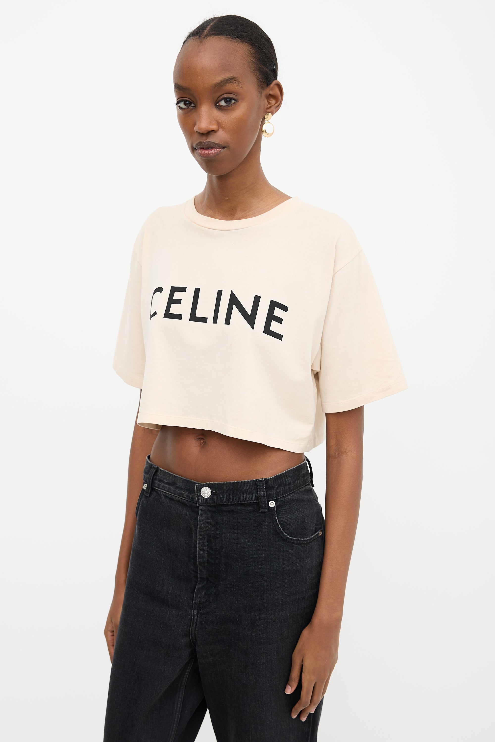 Pre-owned Celine beige cropped T-shirt featuring a crew neckline and a black printed logo at chest.