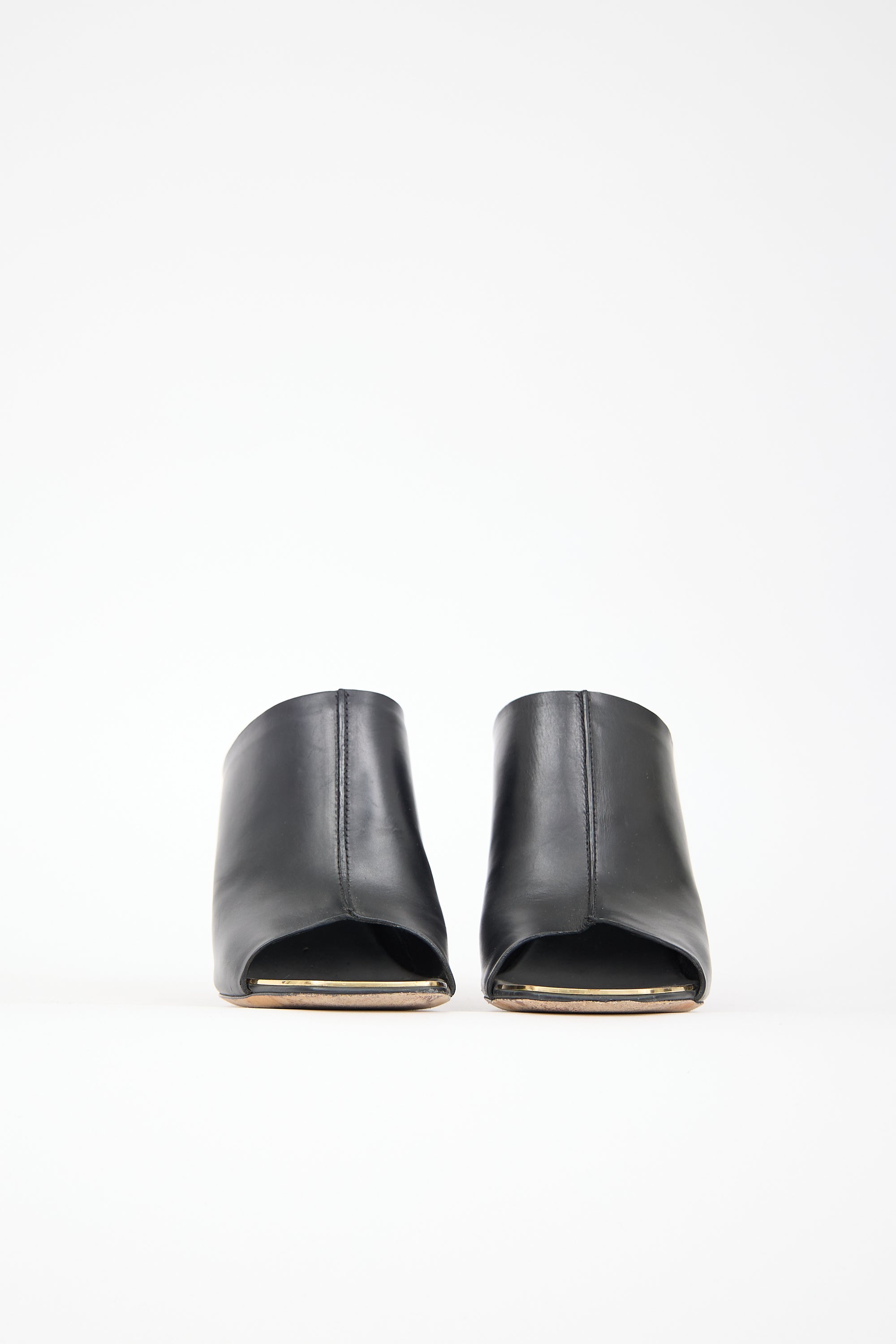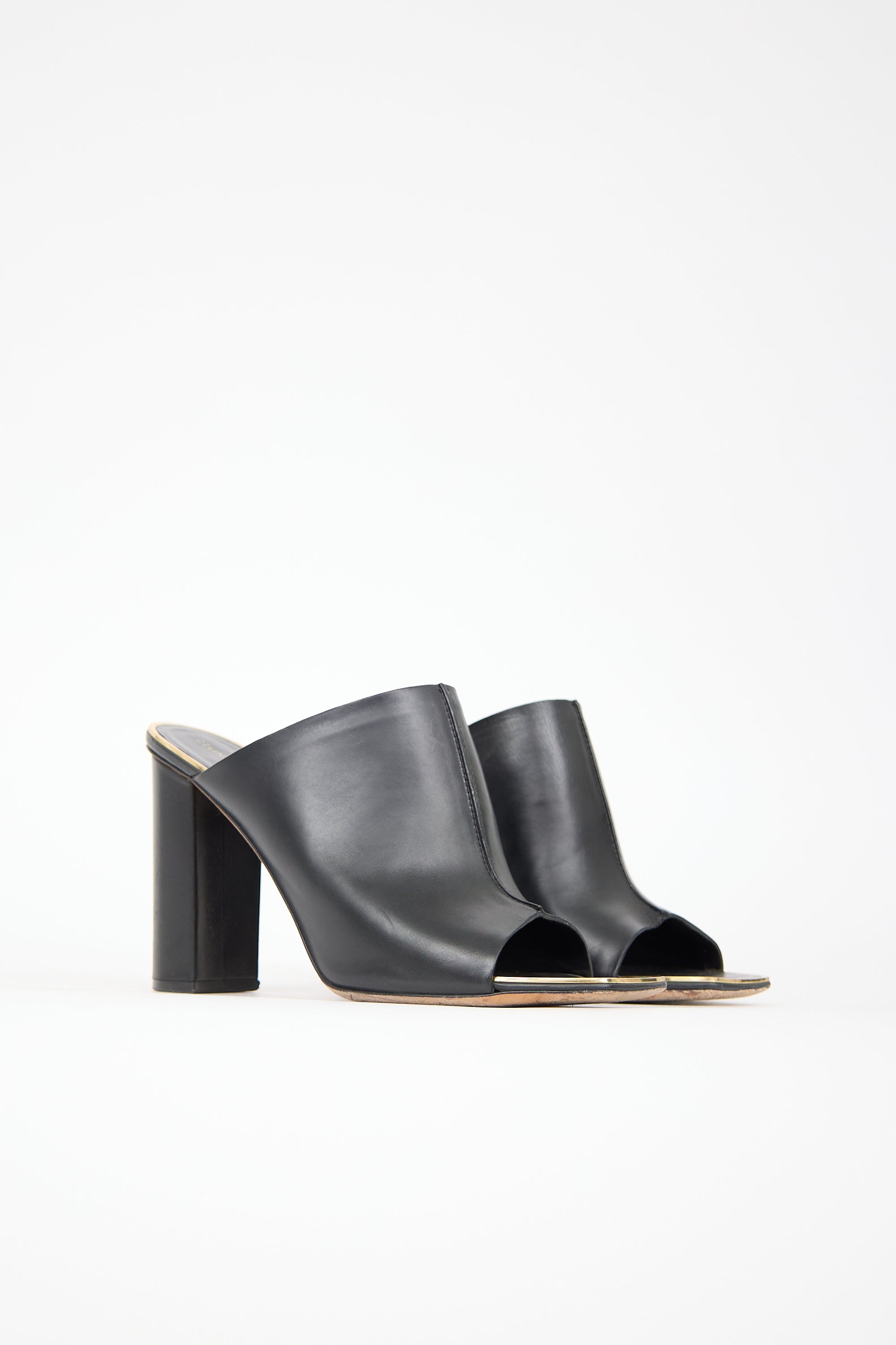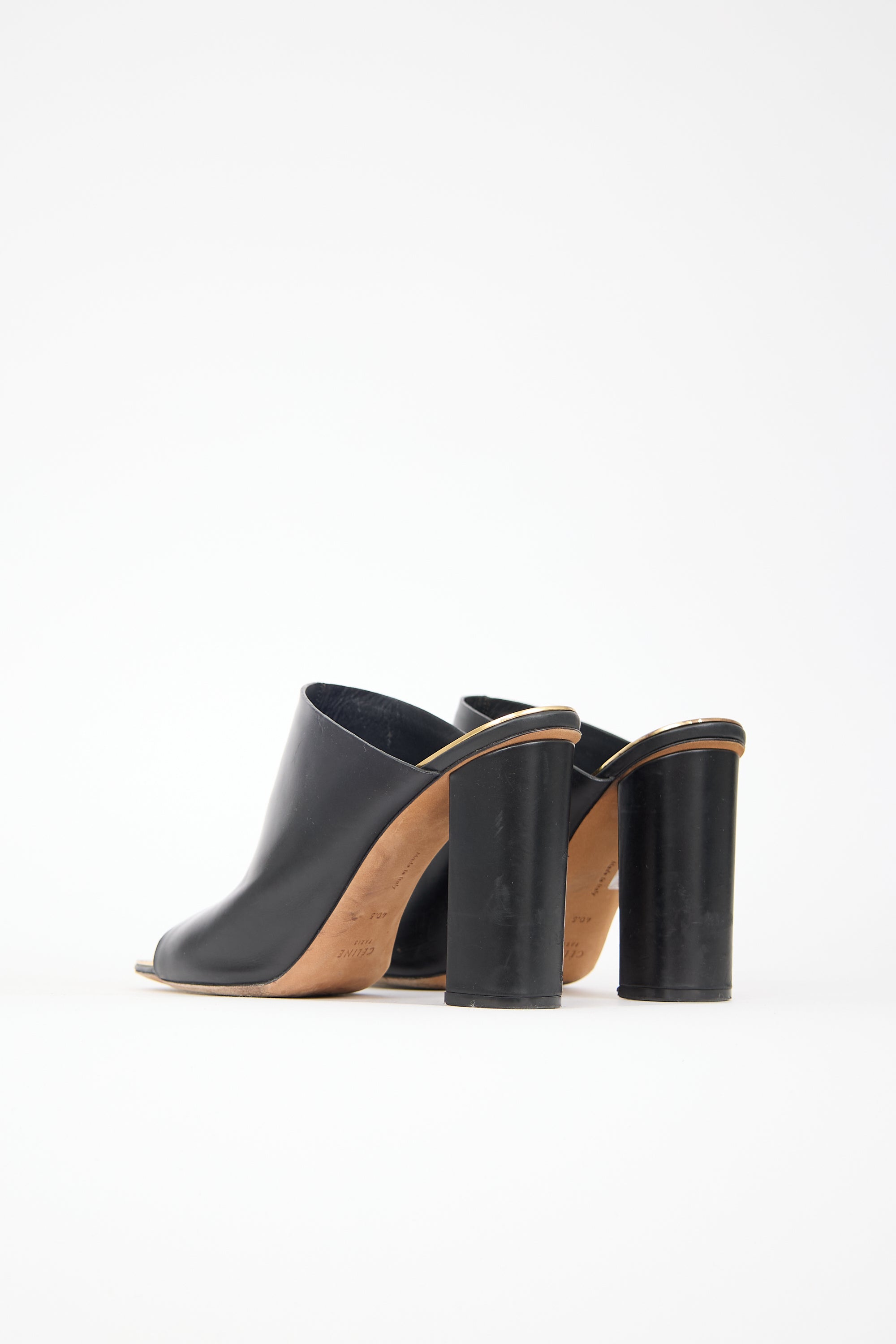 Pre-owned Celine black leather mules featuring square peep toe, gold tone metal footbed trim, and covered block heel. Comes with original dust bag.