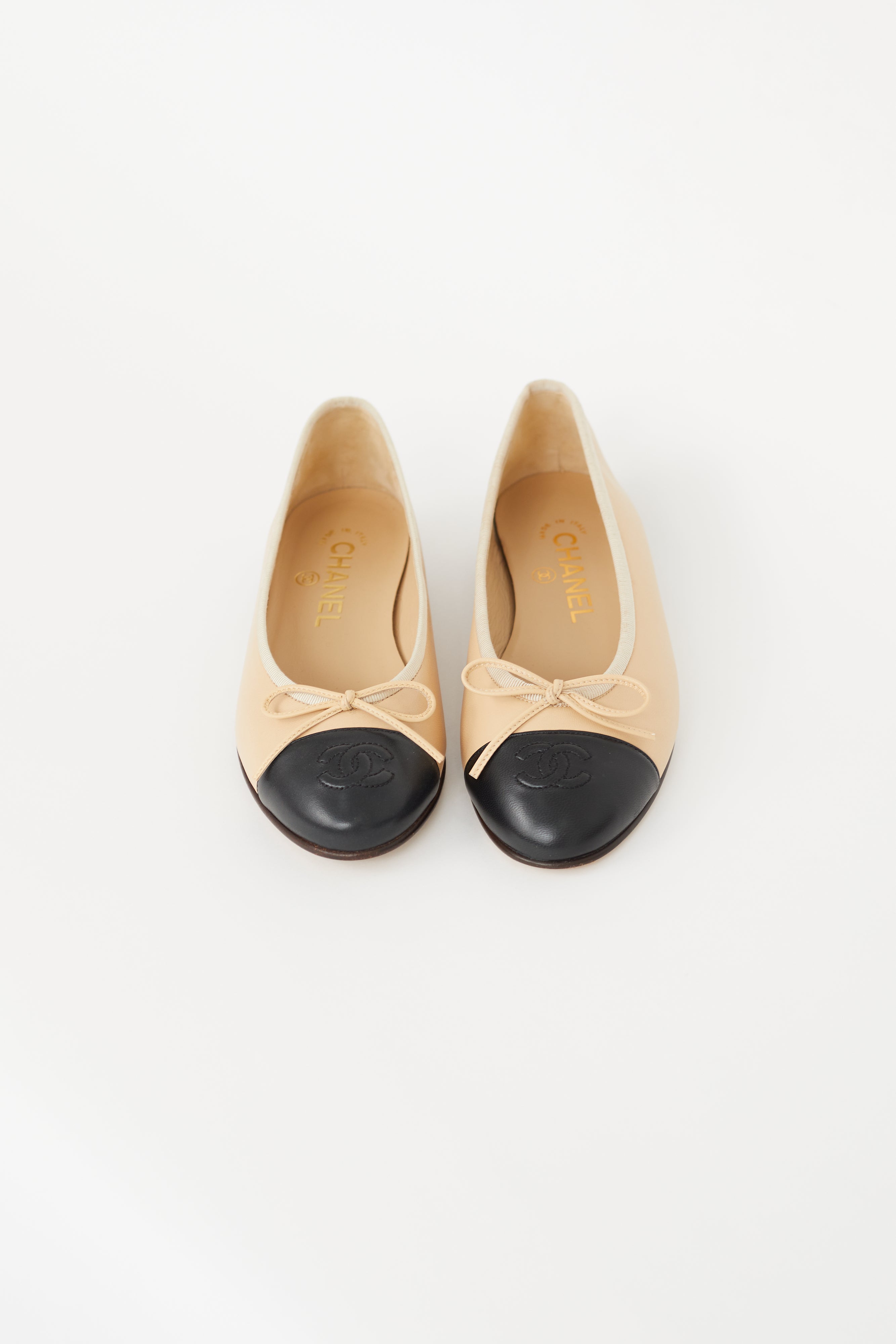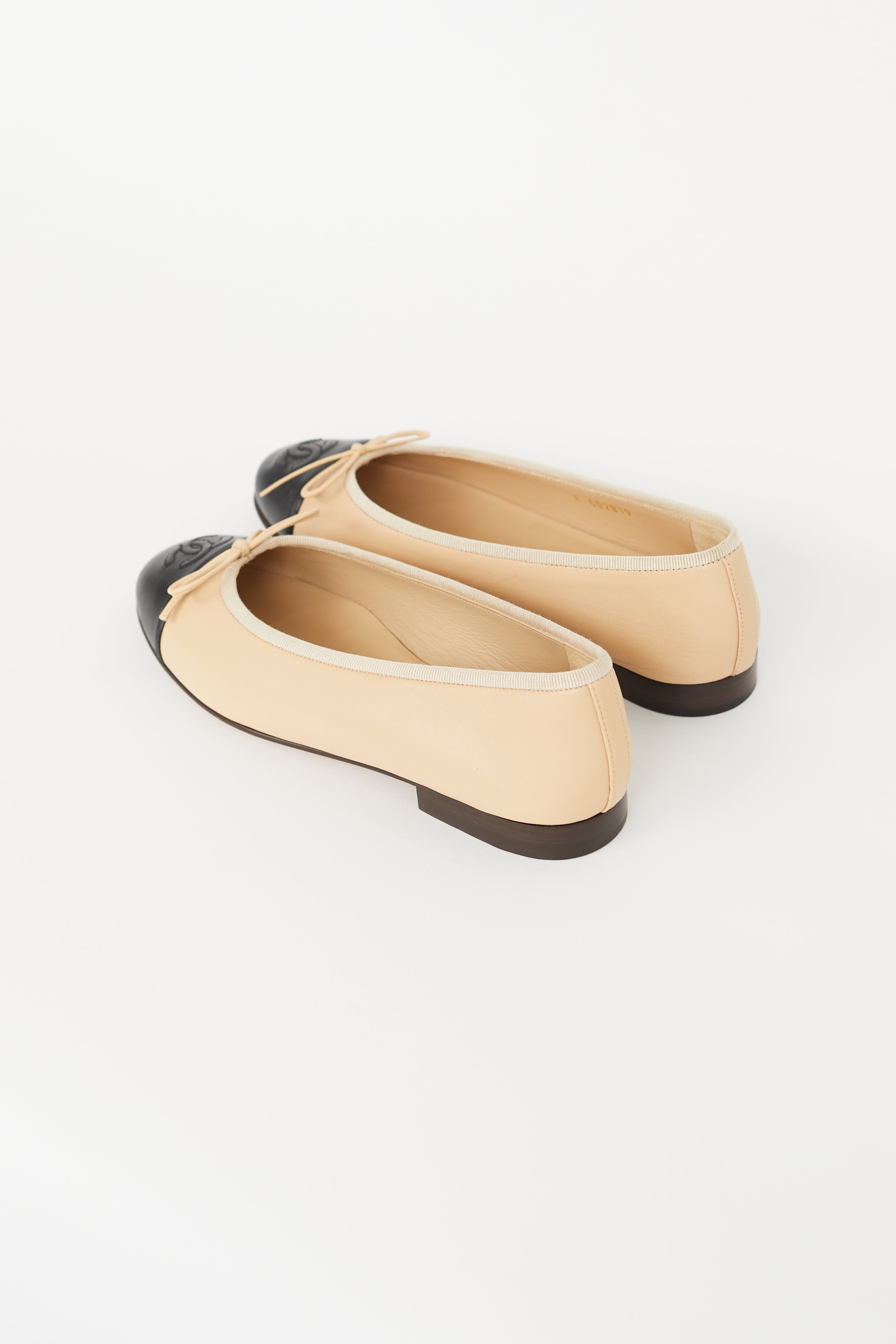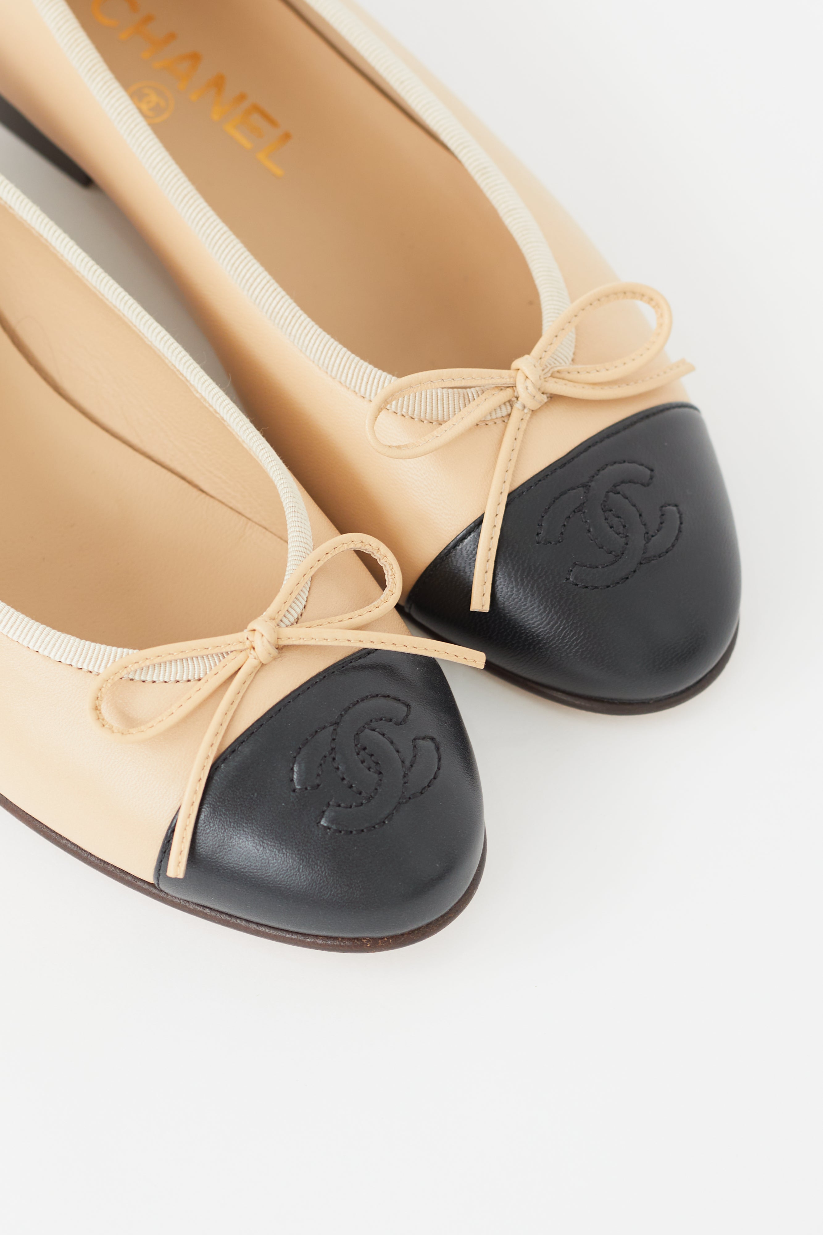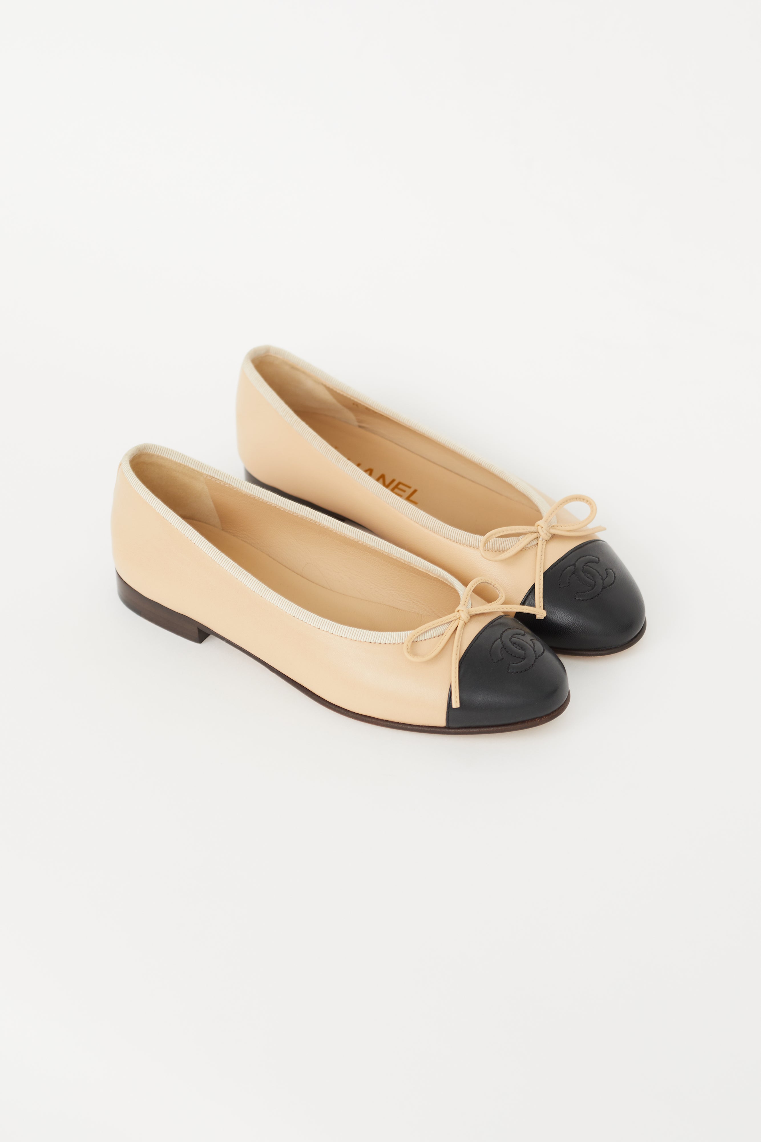 Pre-owned Chanel beige ballet flats featuring rounded toe, black toe cap with stitched CC logo, bow at collar, and stacked heel.