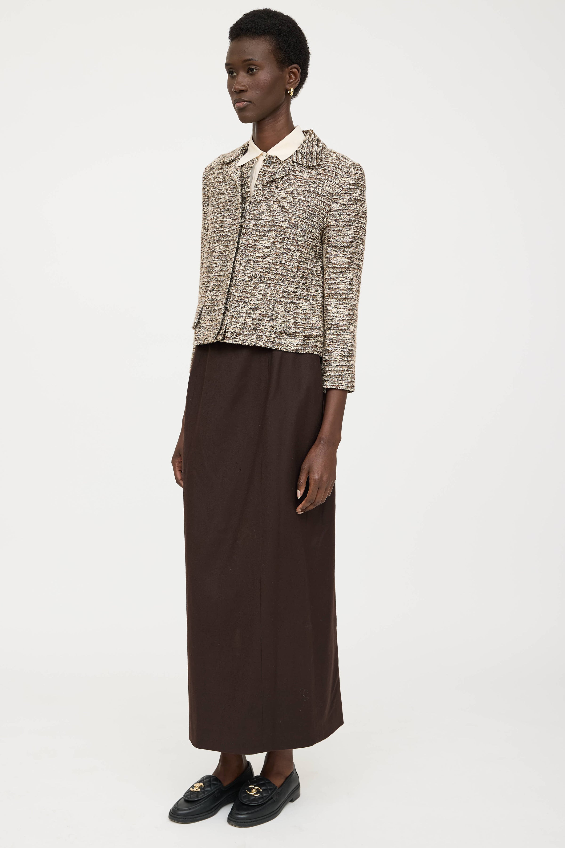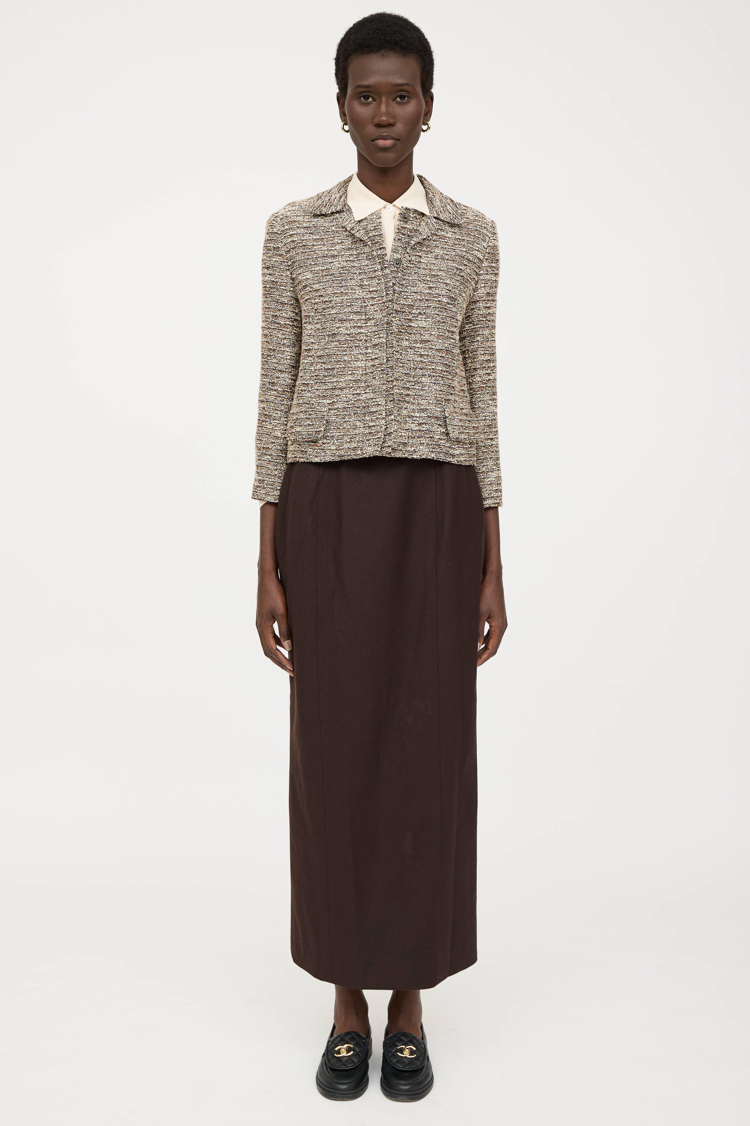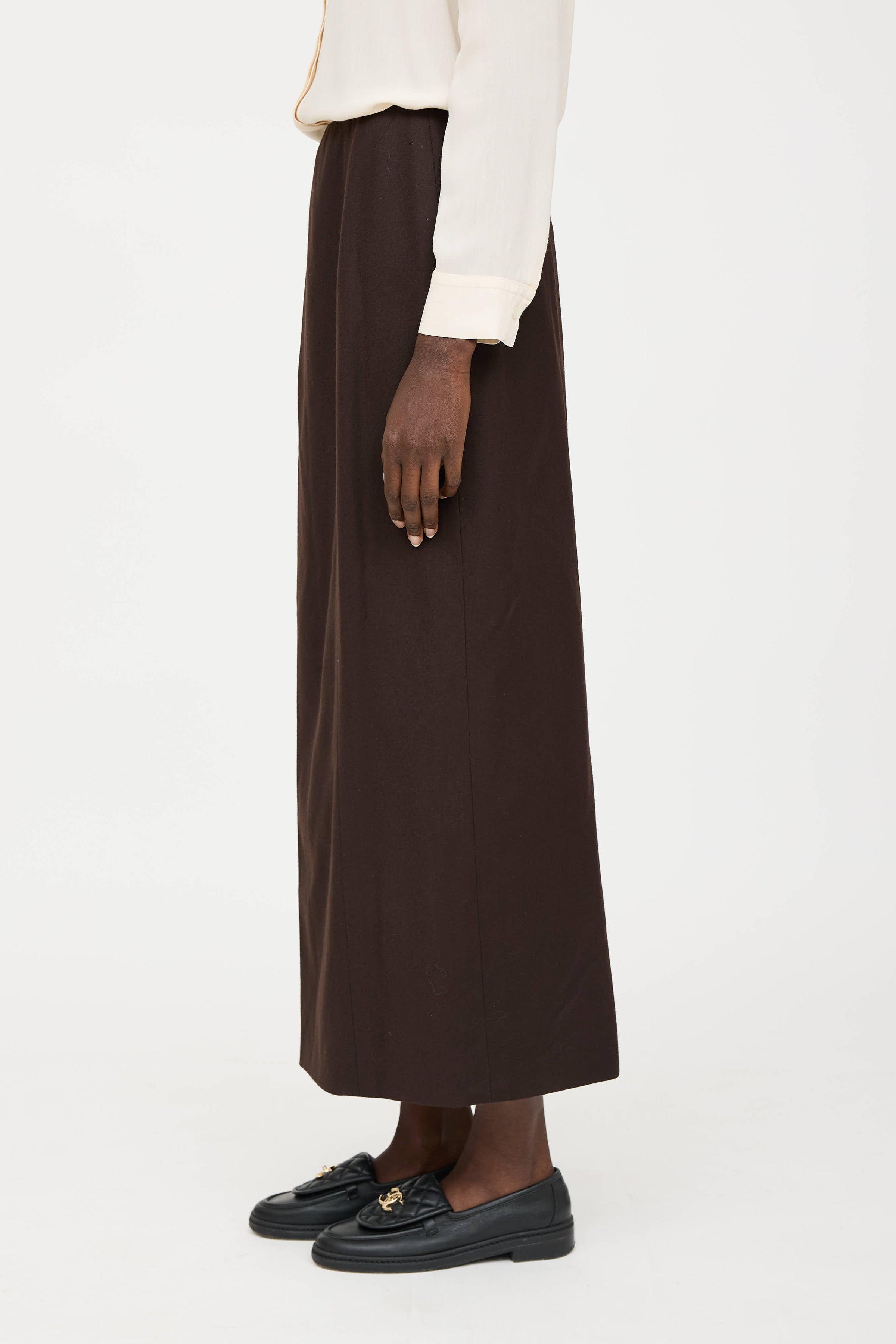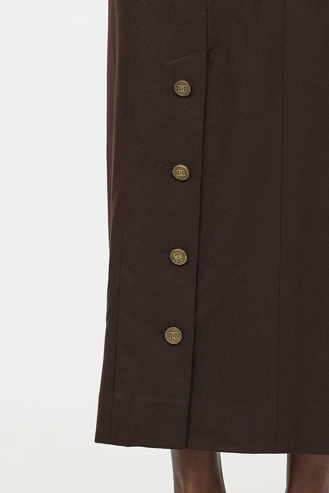 Pre-owned Chanel Fall 1998 brown wool skirt featuring panelled seams, slit at hem with logo button detailing, and zip at back with hook and eye closure. Lined.