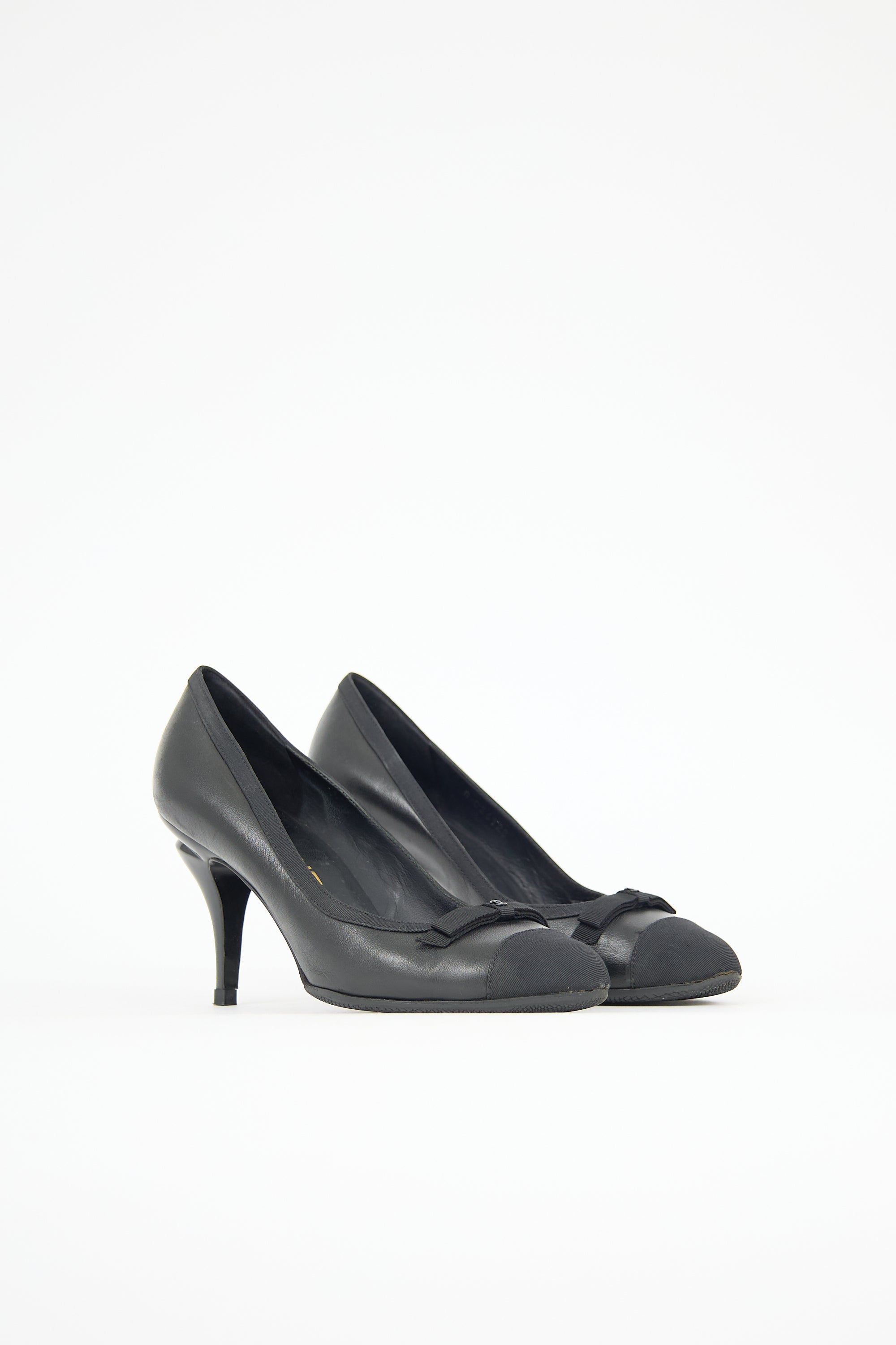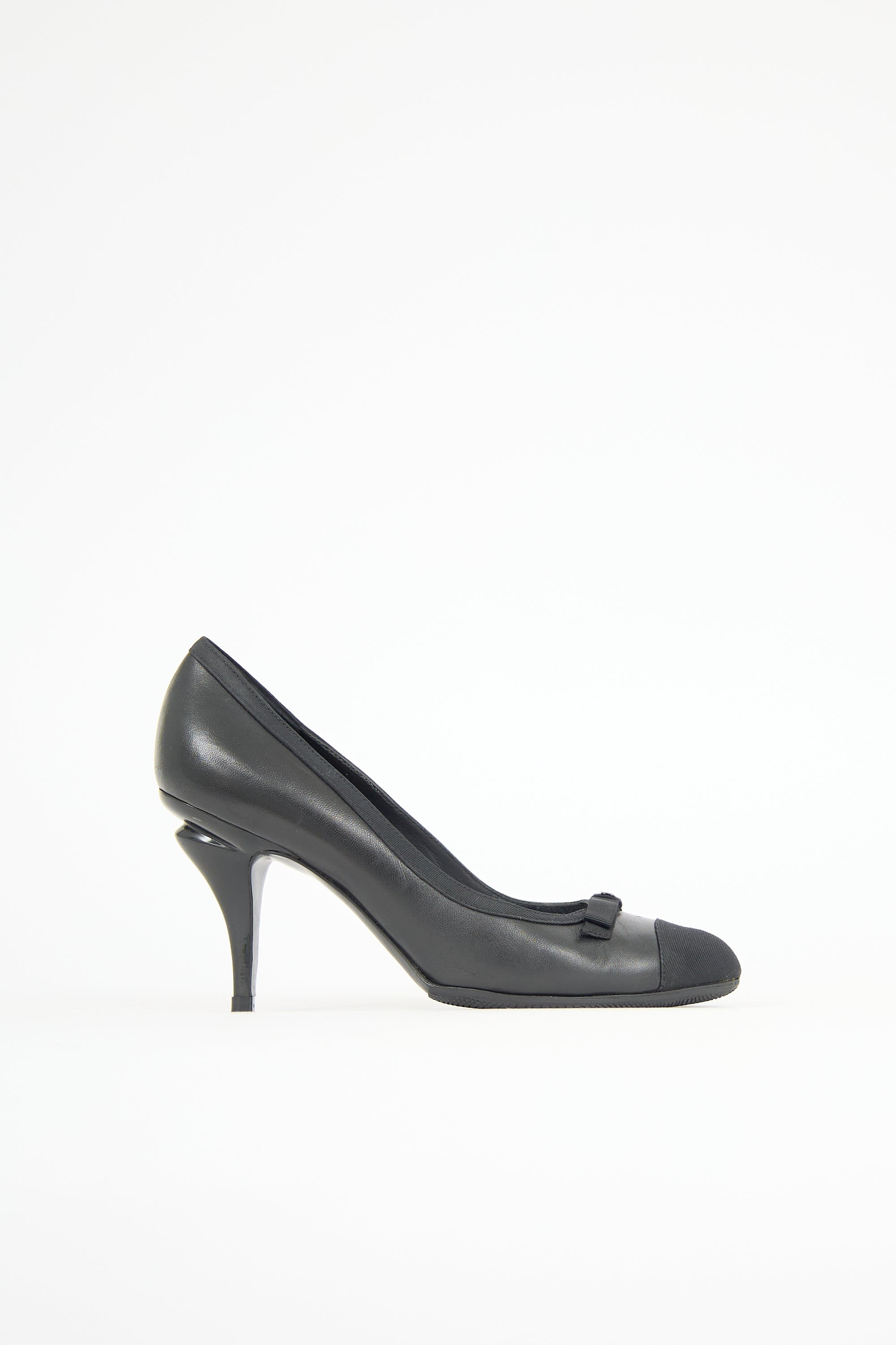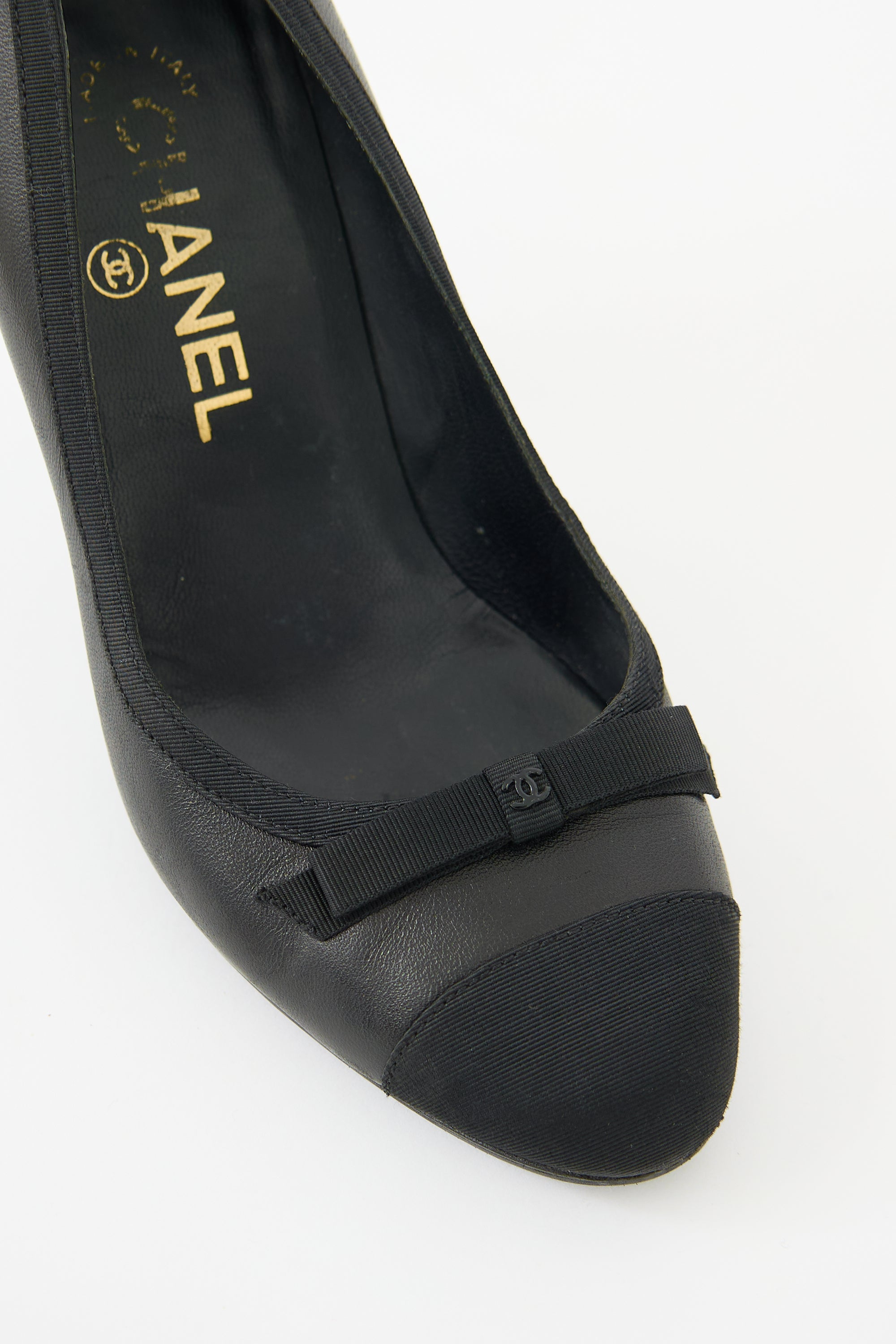 Pre-owned Chanel black leather pumps featuring a rounded toe with a grosgrain cap, grosgrain bow at vamp with tonal CC hardware, grosgrain trimmed collar, and a sculptural heel. Comes with original dust bags.