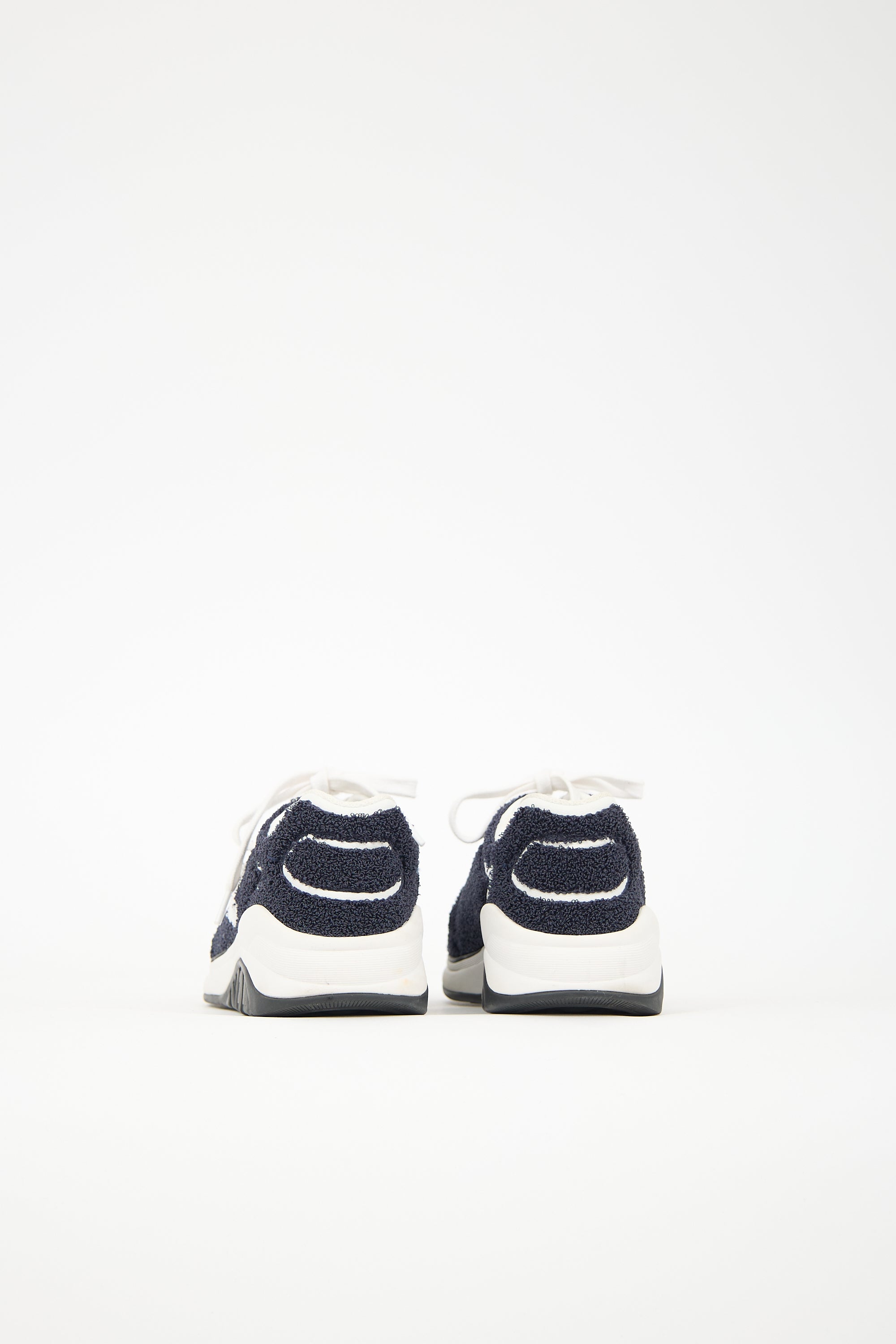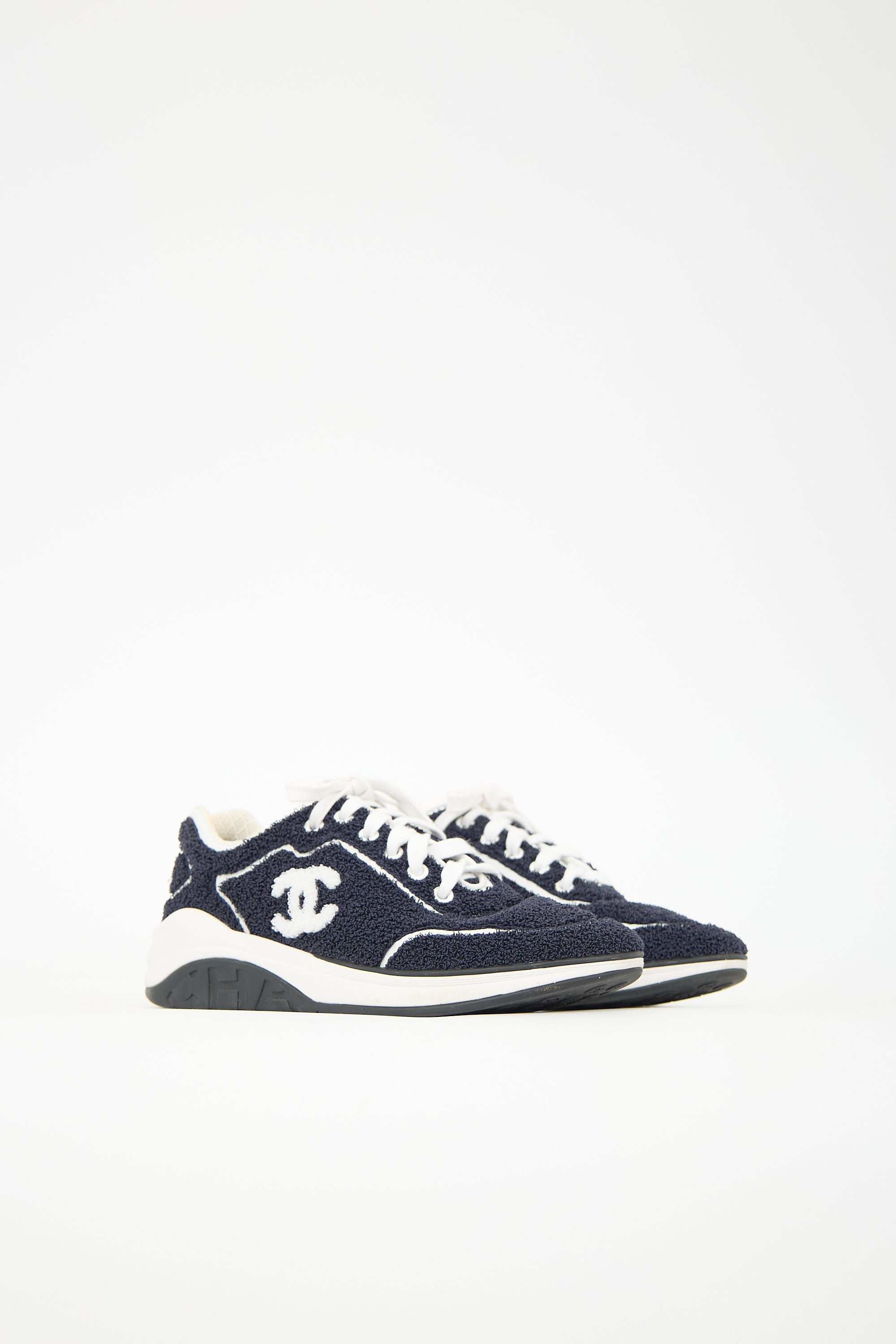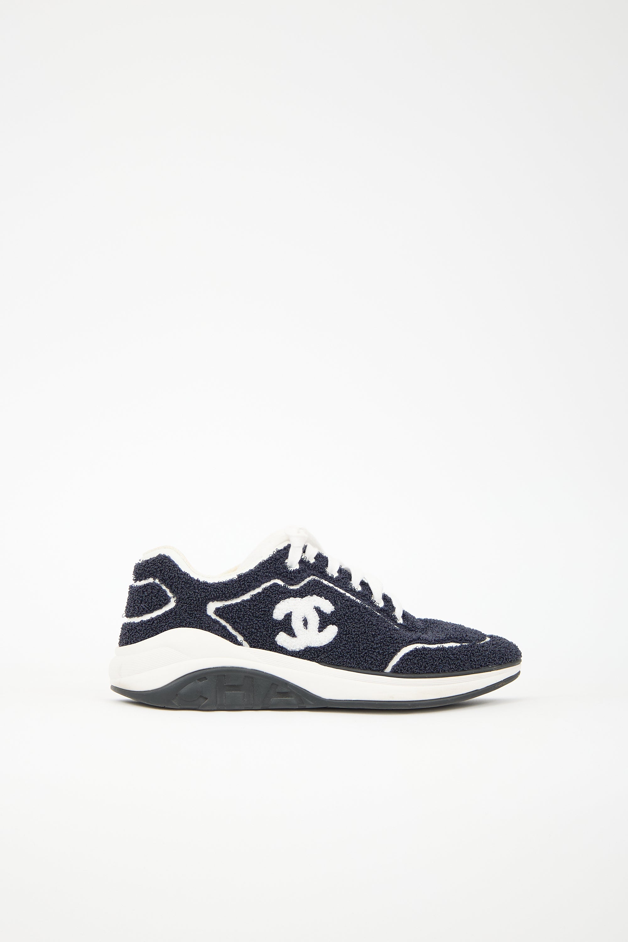 Pre-owned Chanel black and white sneakers featuring rounded toe, terry cloth upper, lace up front, CC logo at side, and rubber outsole.