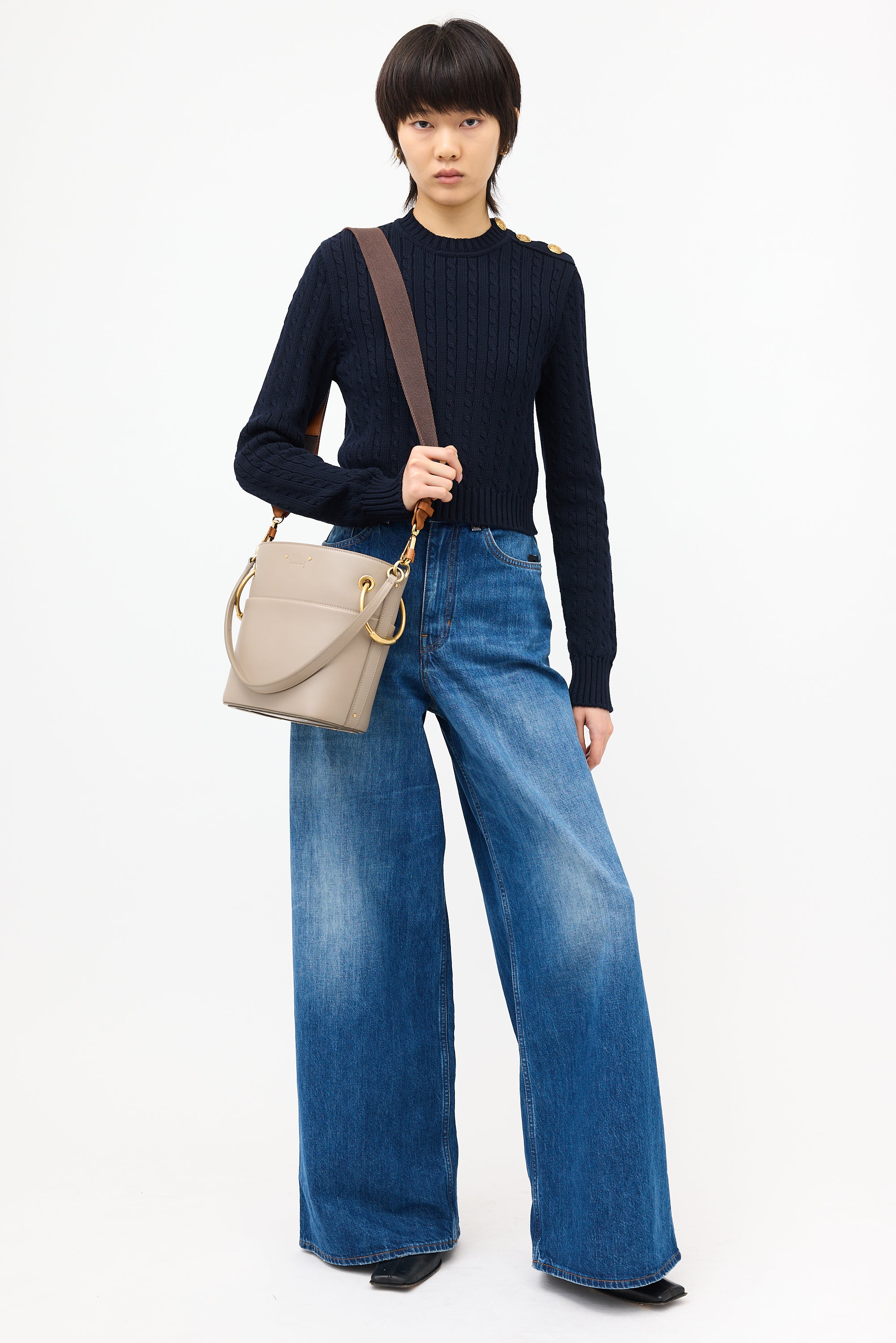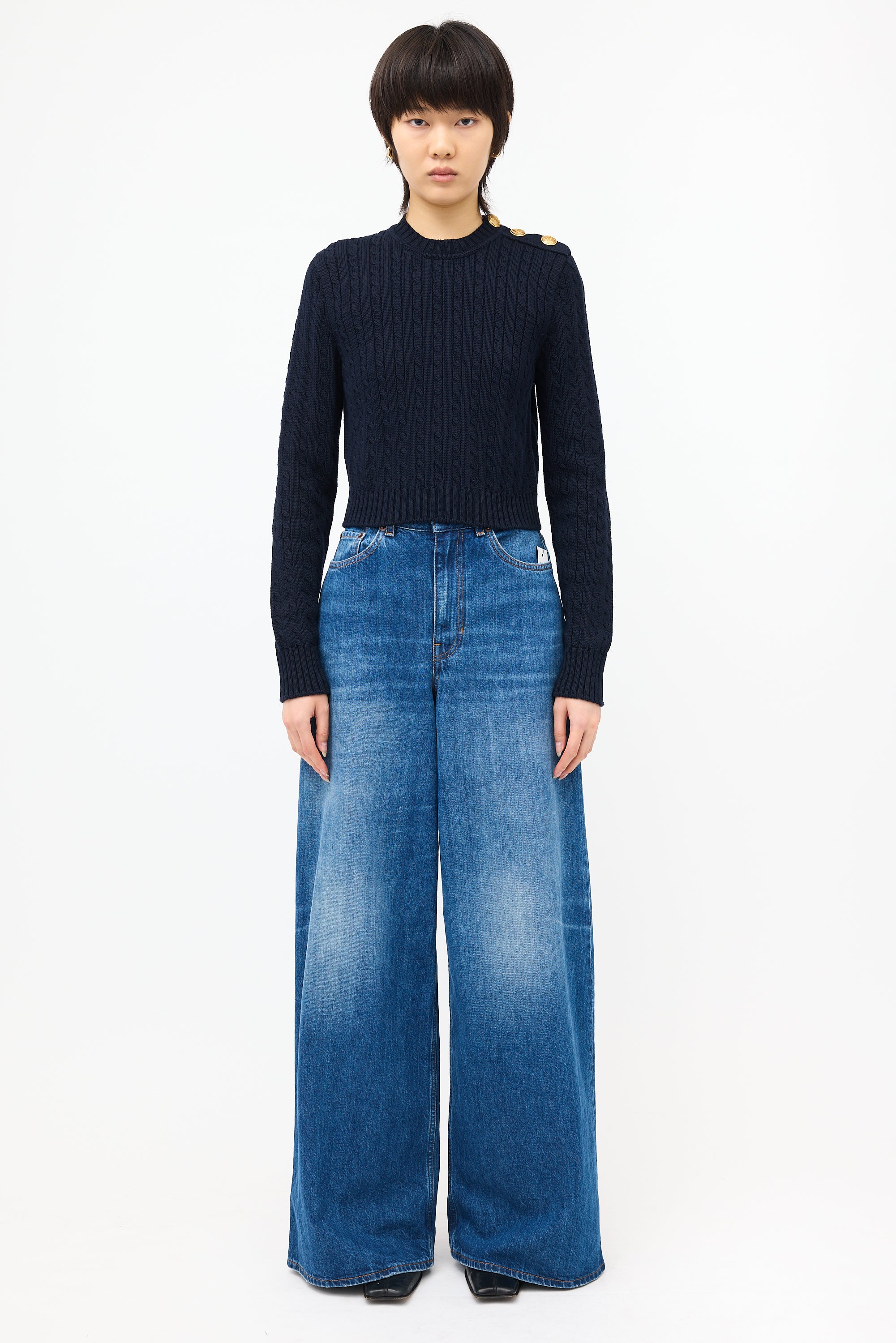 Pre-owned Chloé navy cropped sweater featuring cable knit design, crew neckline, and gold tone button closure at left shoulder.