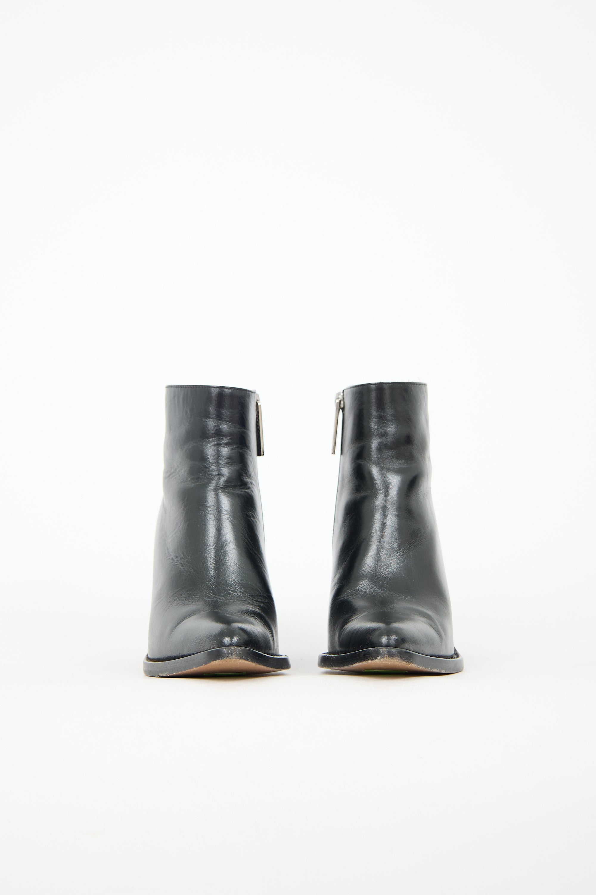 Pre-owned Chloé black leather Rylee ankle boots featuring pointed toe, inner side zip closure, silver tone zipper pull tab with debossed logo, and black block heel. Comes with original box and dust bags.