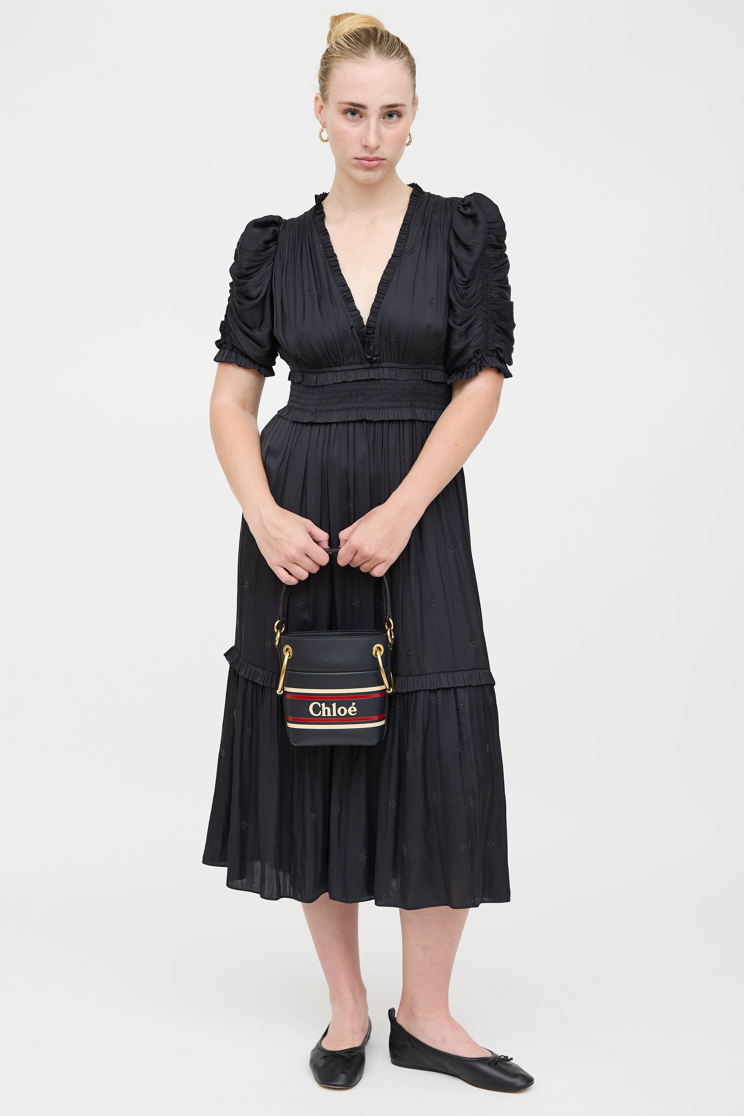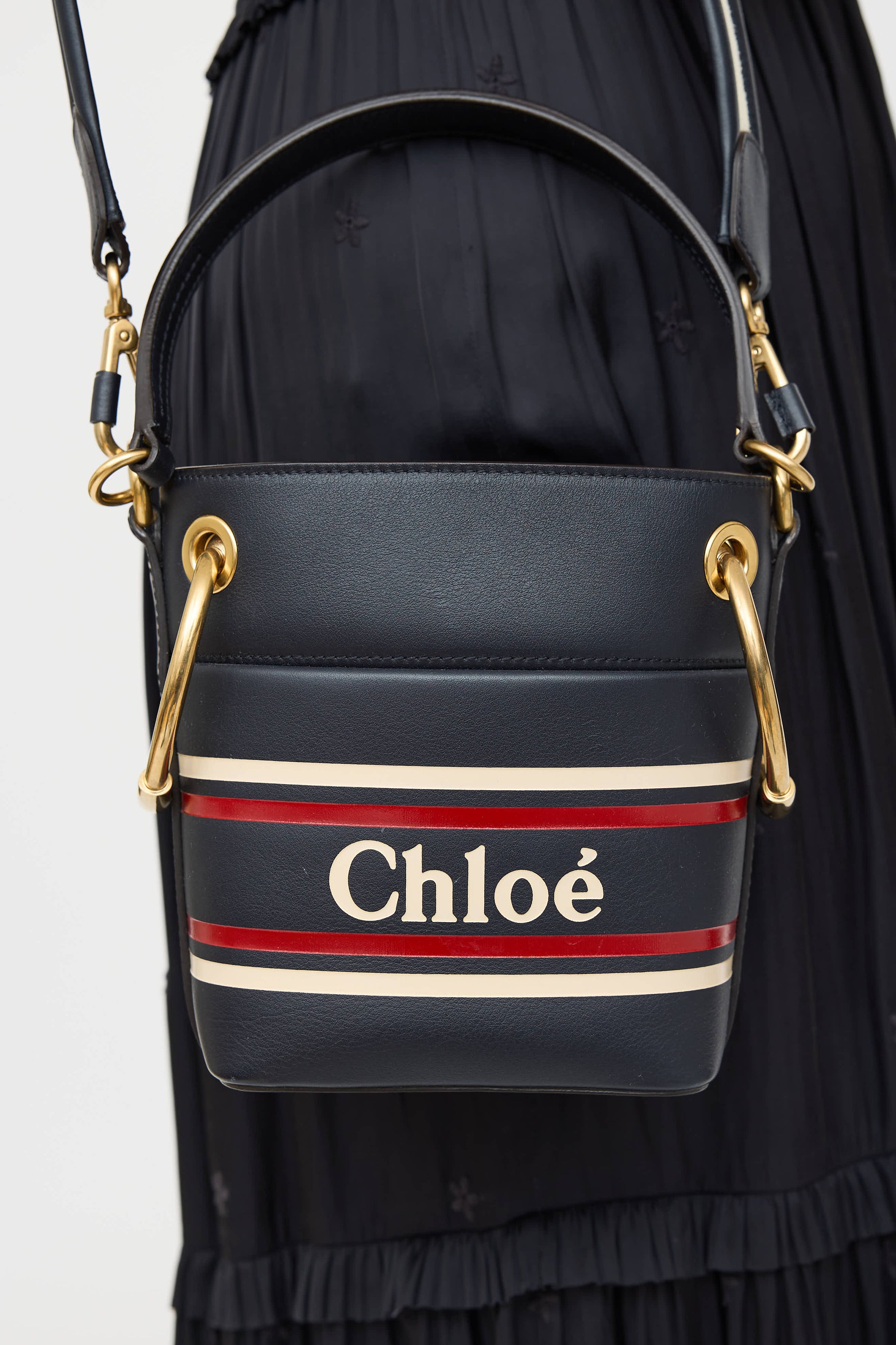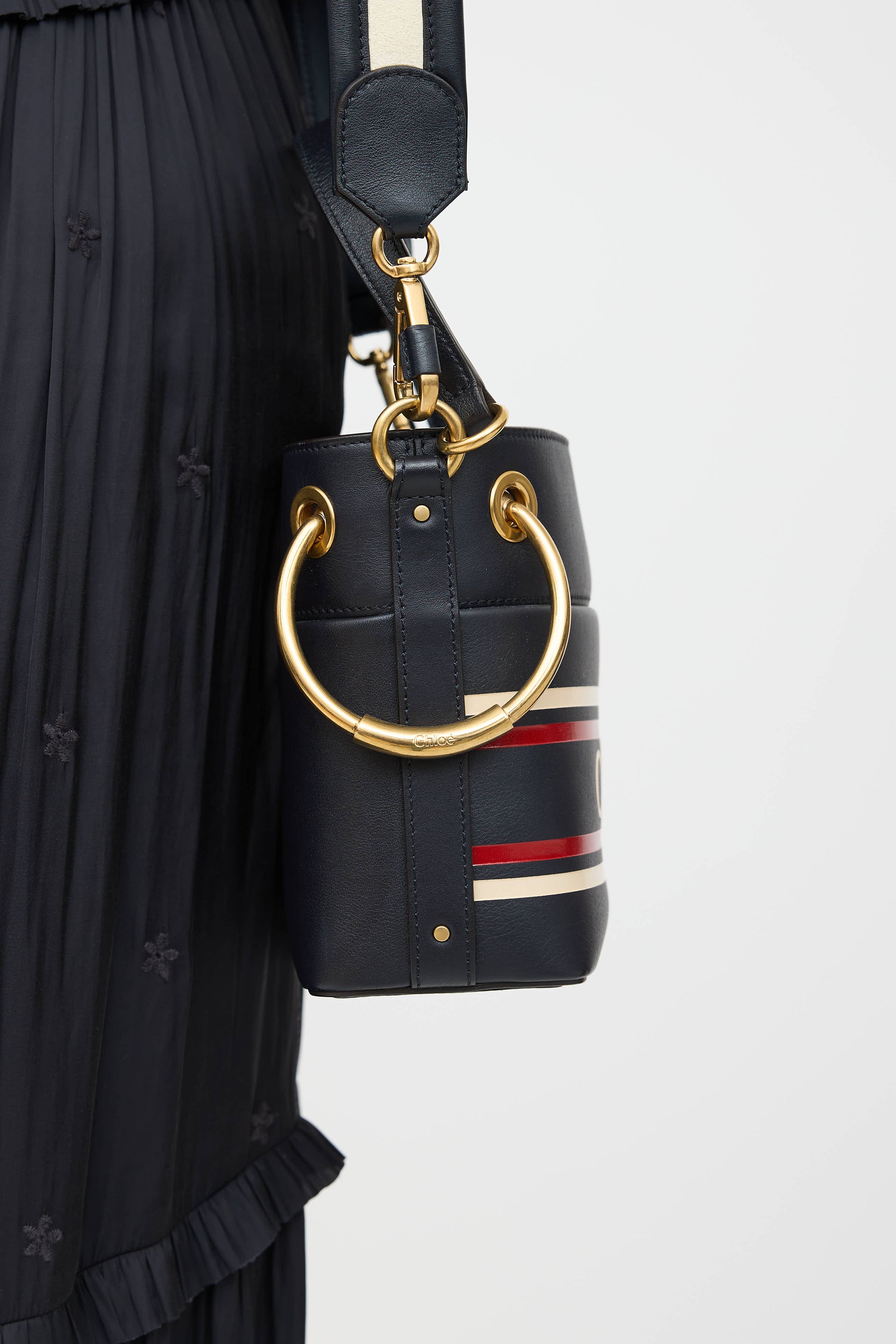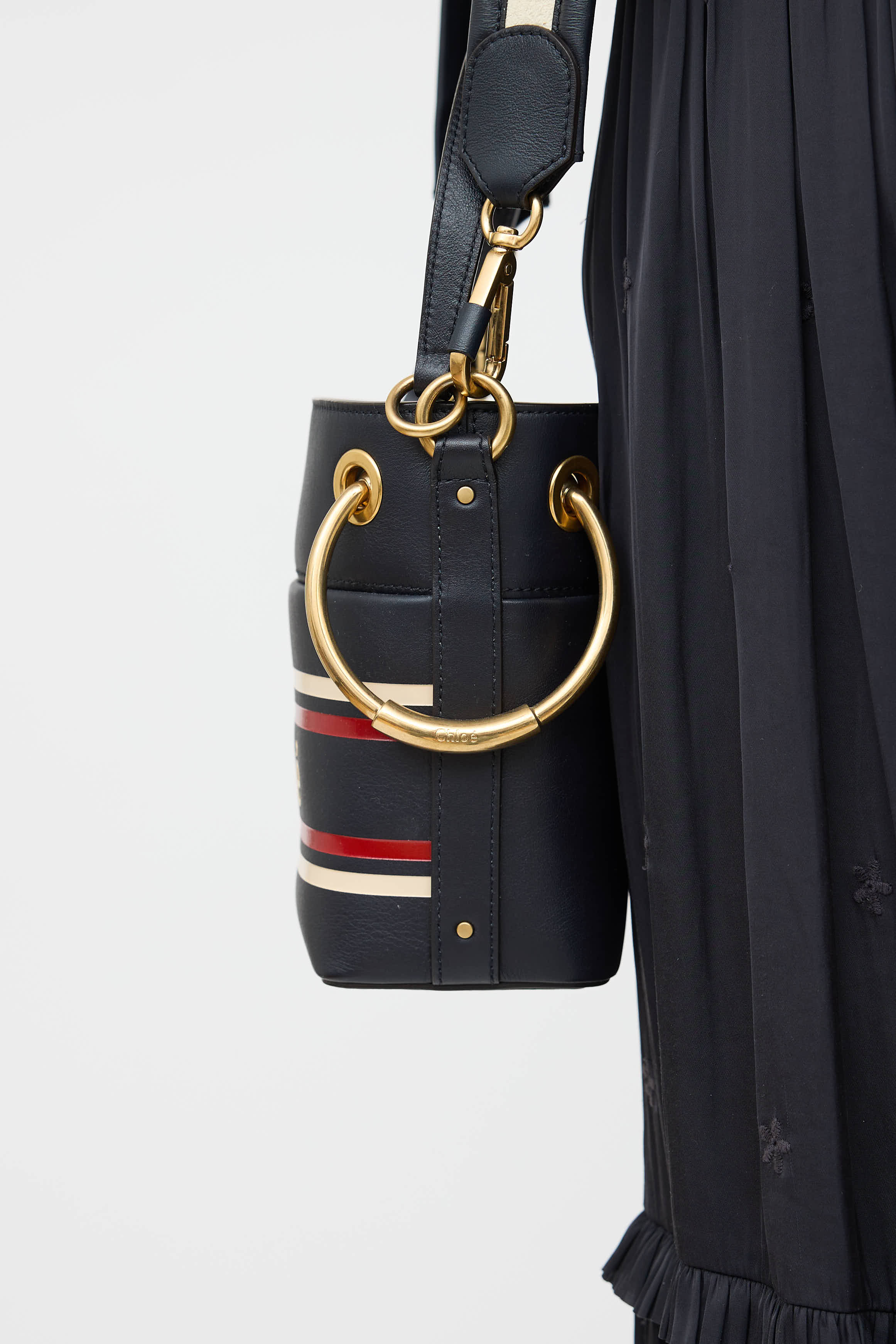 Pre-owned Chloé black and multicolor Roy Bucket bag featuring gold tone hardware, flat top handle, adjustable and detachable webbing shoulder strap, striped logo at front, open top with drawstring interior closure, and one lined main compartment.