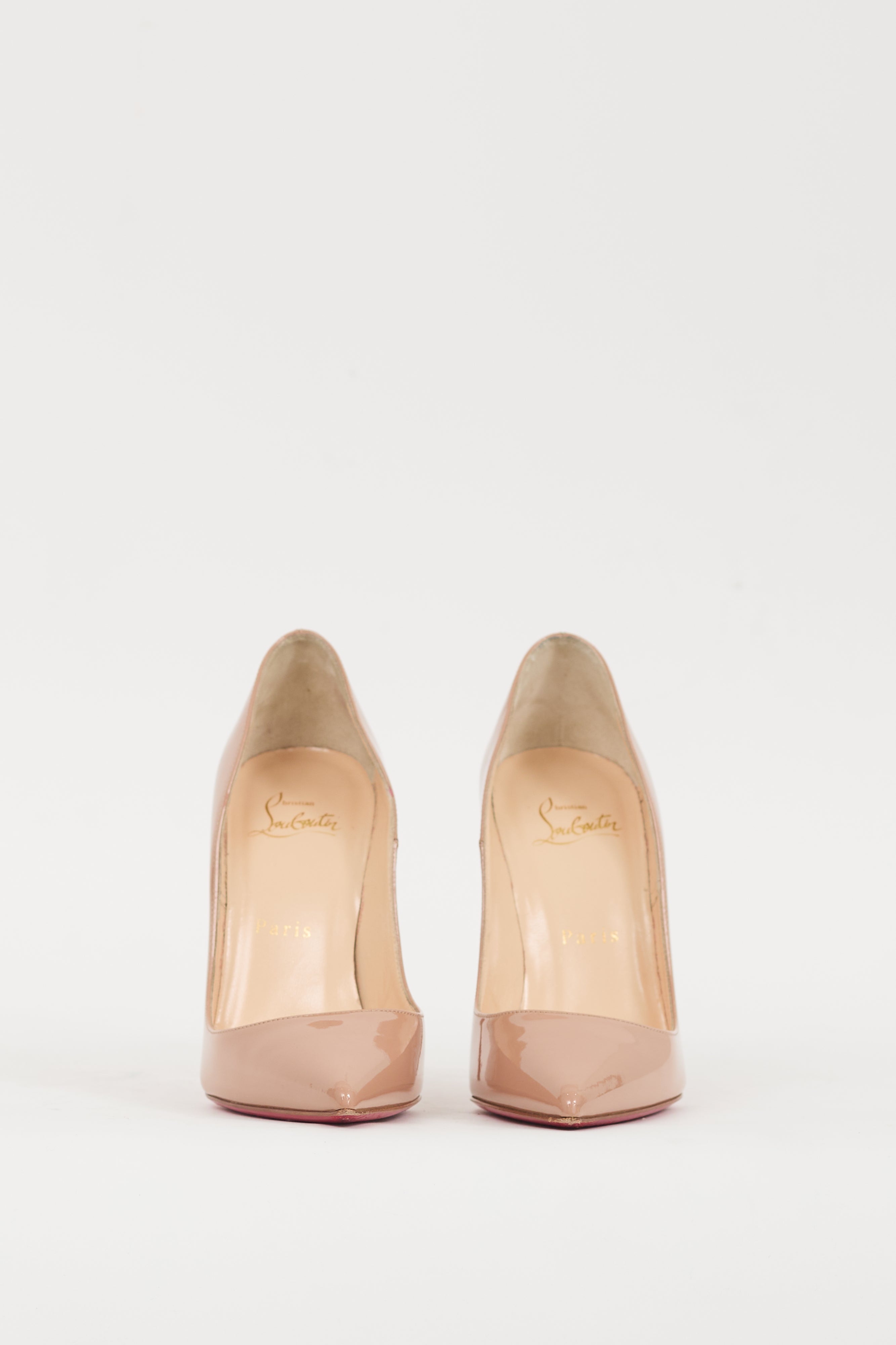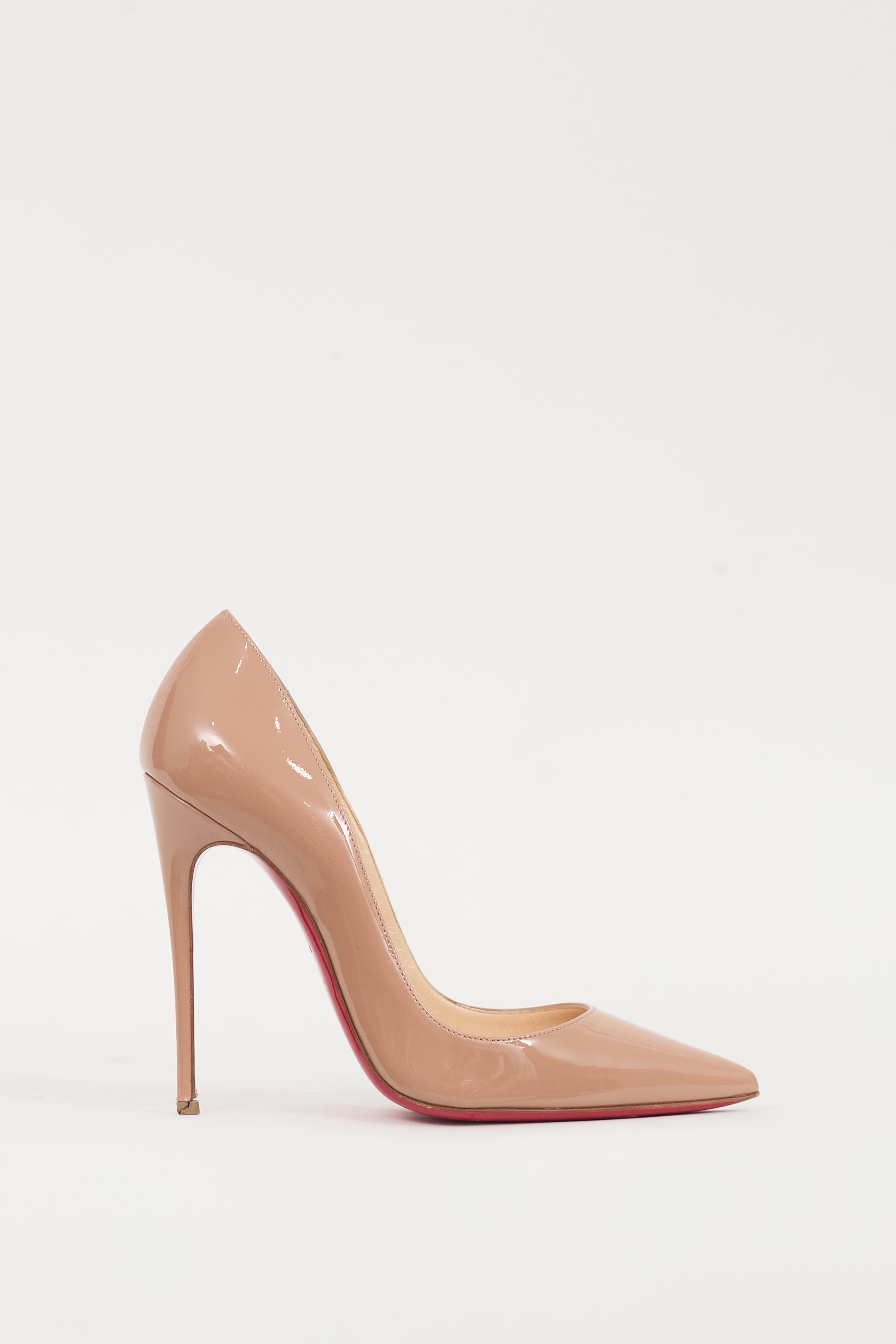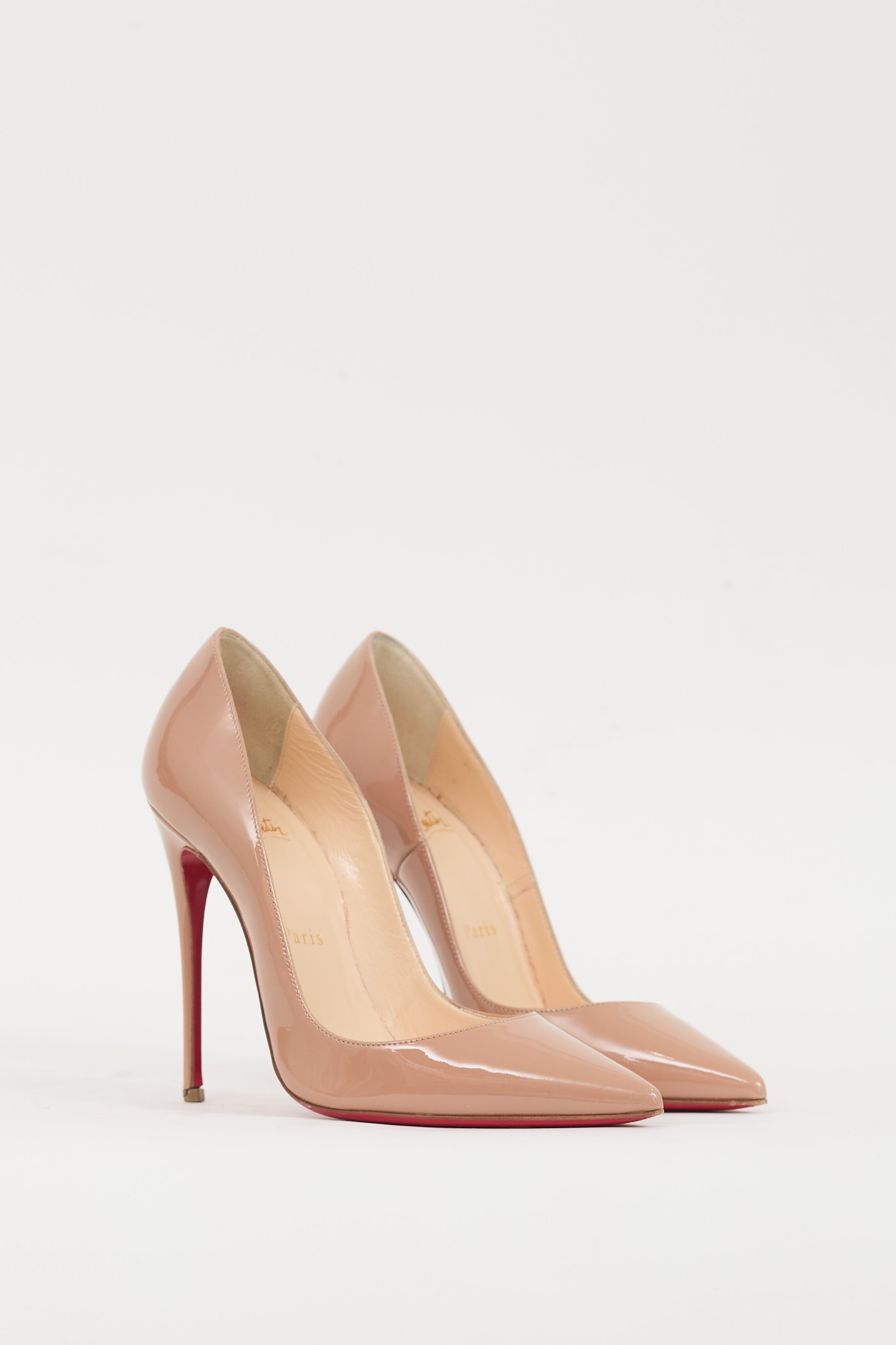 Pre-owned Christian Louboutin beige So Kate patent leather heels featuring a pointed toe, wrapped stiletto heel, and slip on entry. Comes with original box.