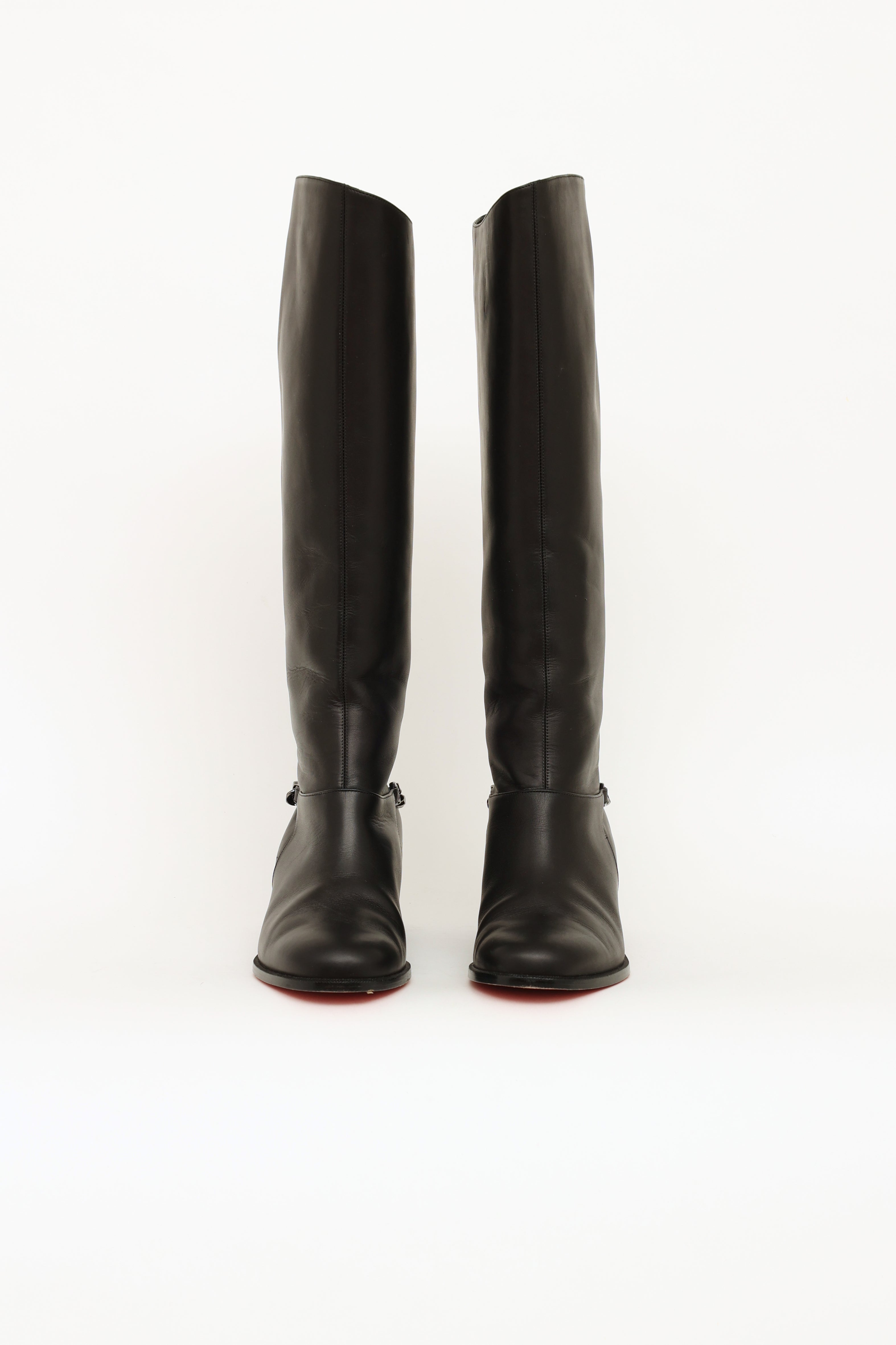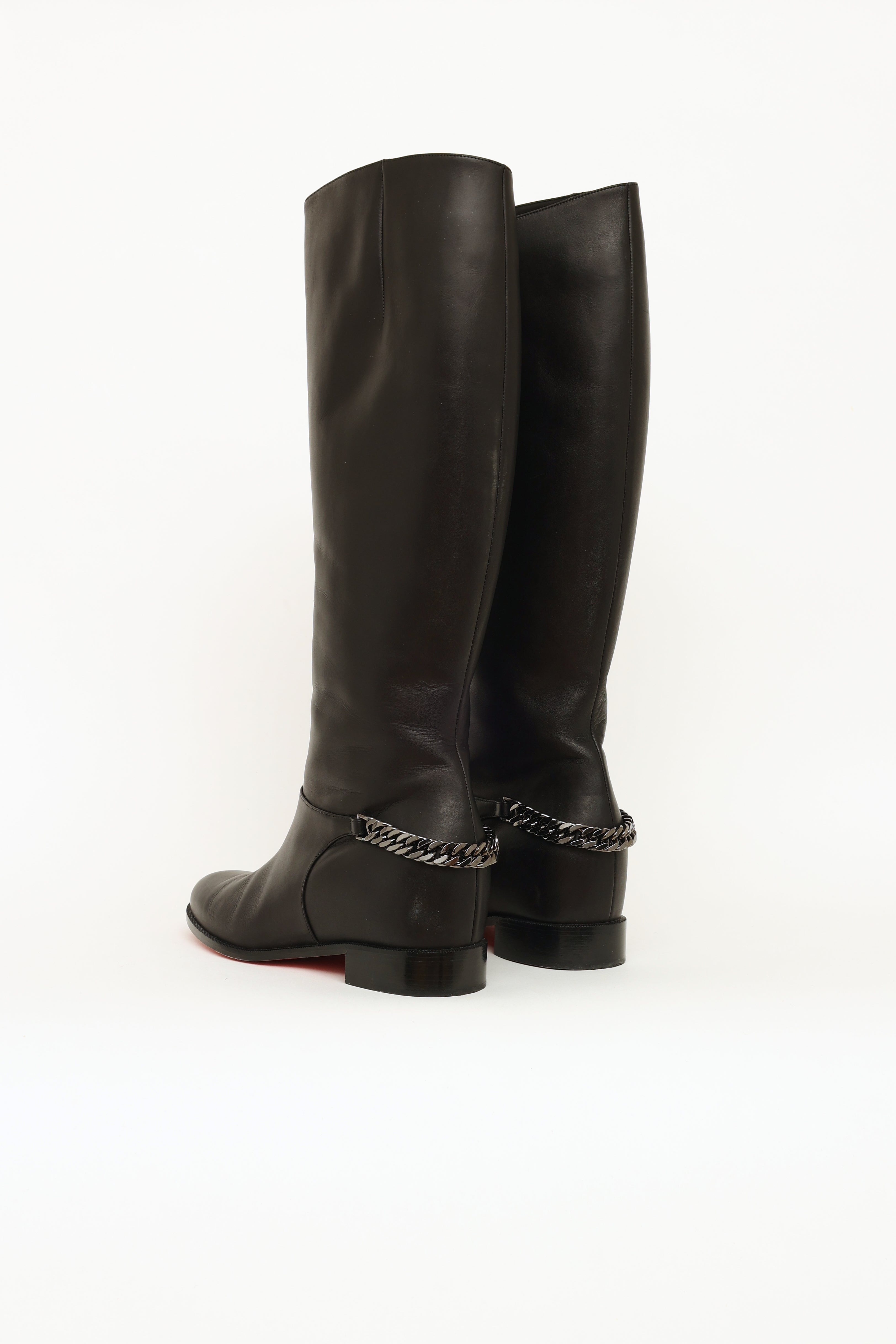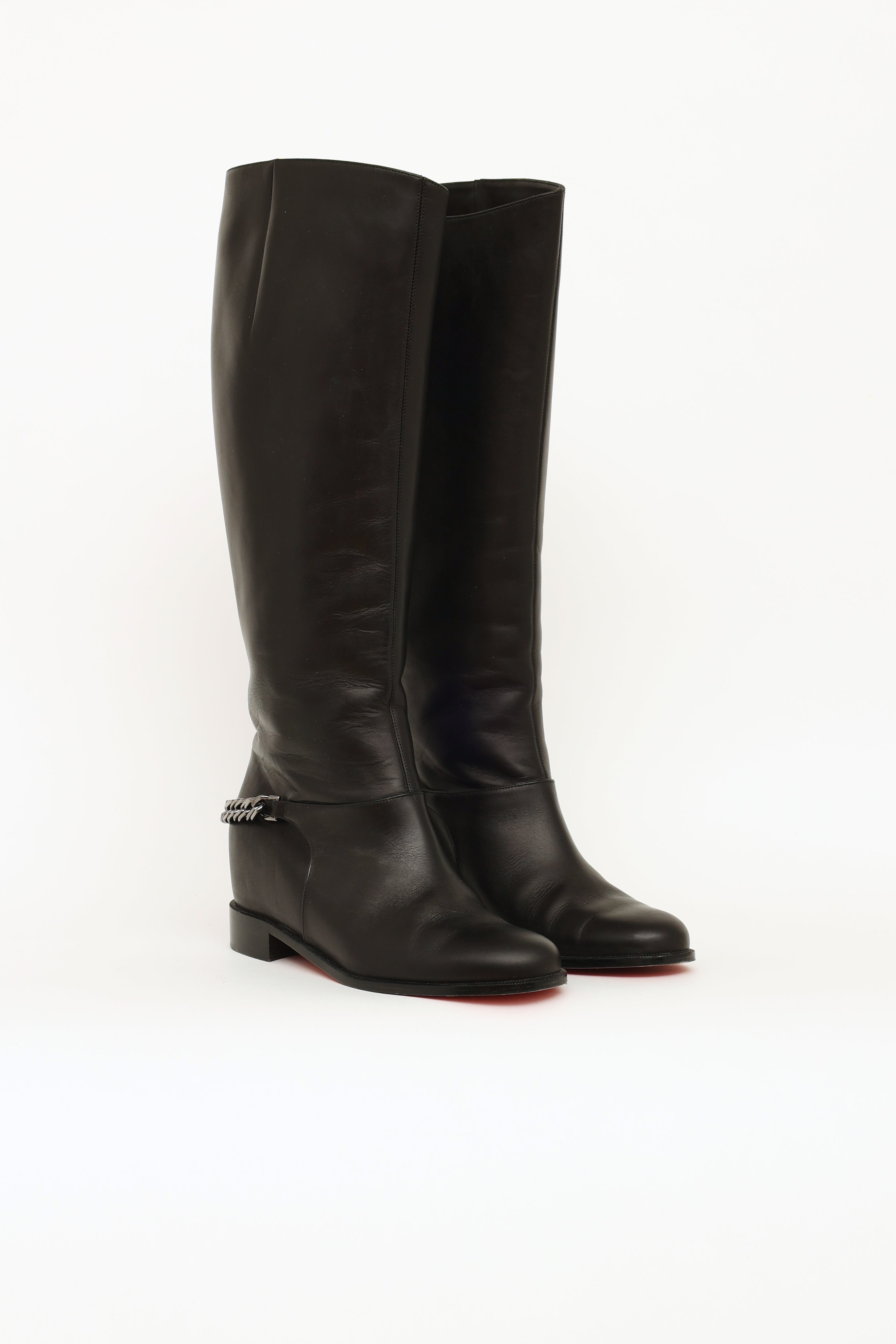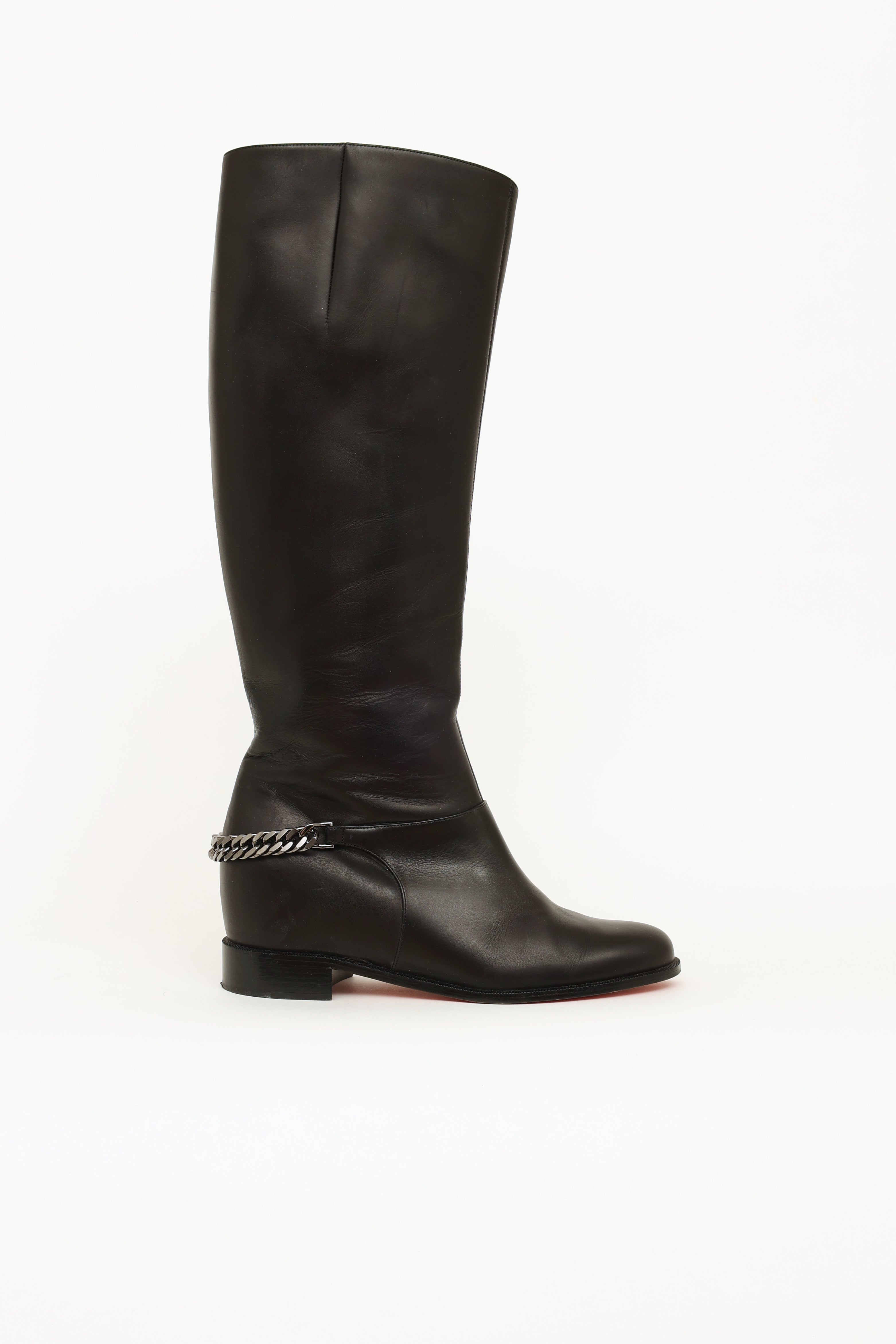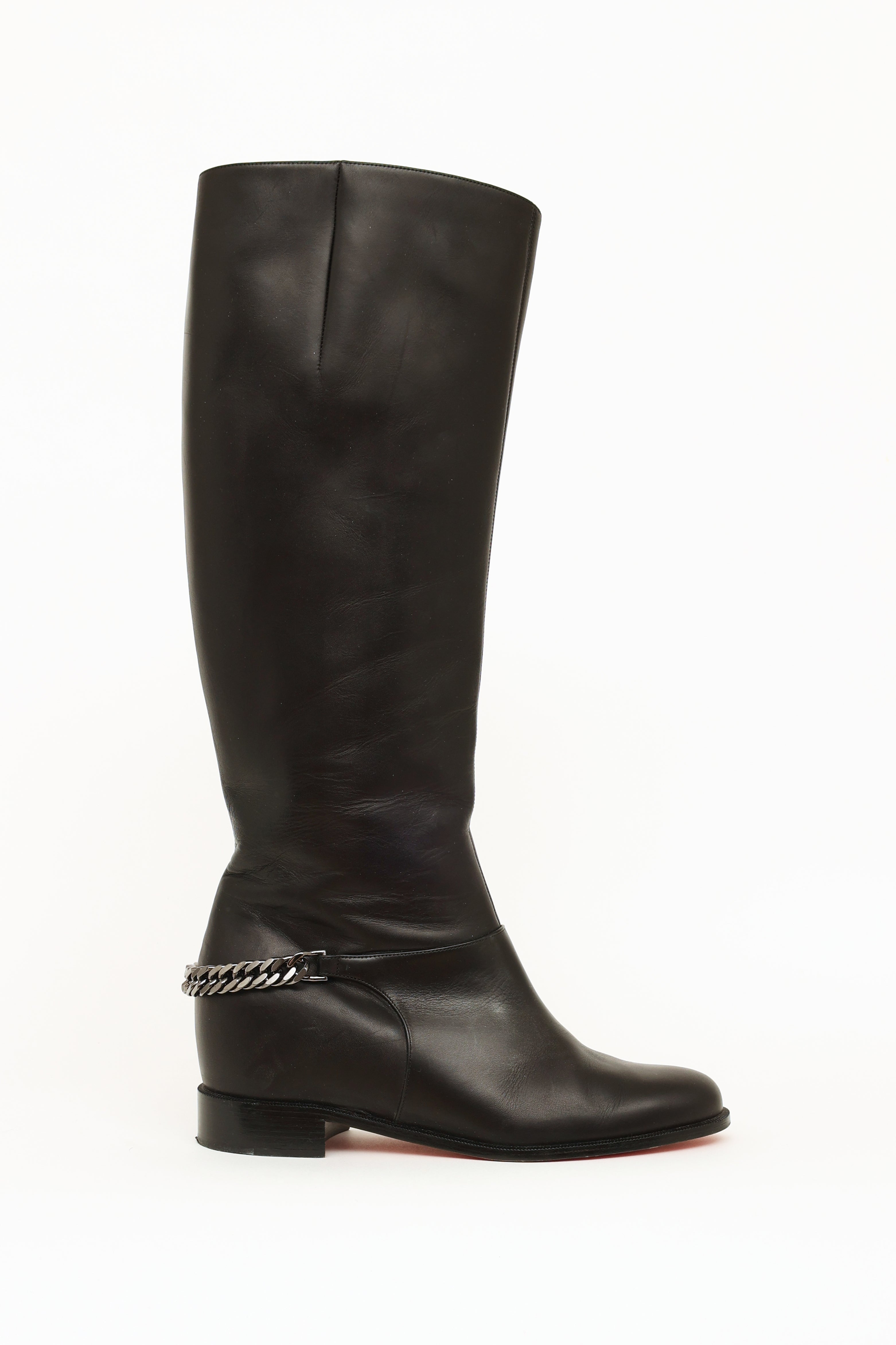 Pre-owned Christian Louboutin black Cate mid high chain boots featuring rounded toe, black leather upper, tall shaft, gunmetal chain along counter, signature red lacquered outsole and leather insole.