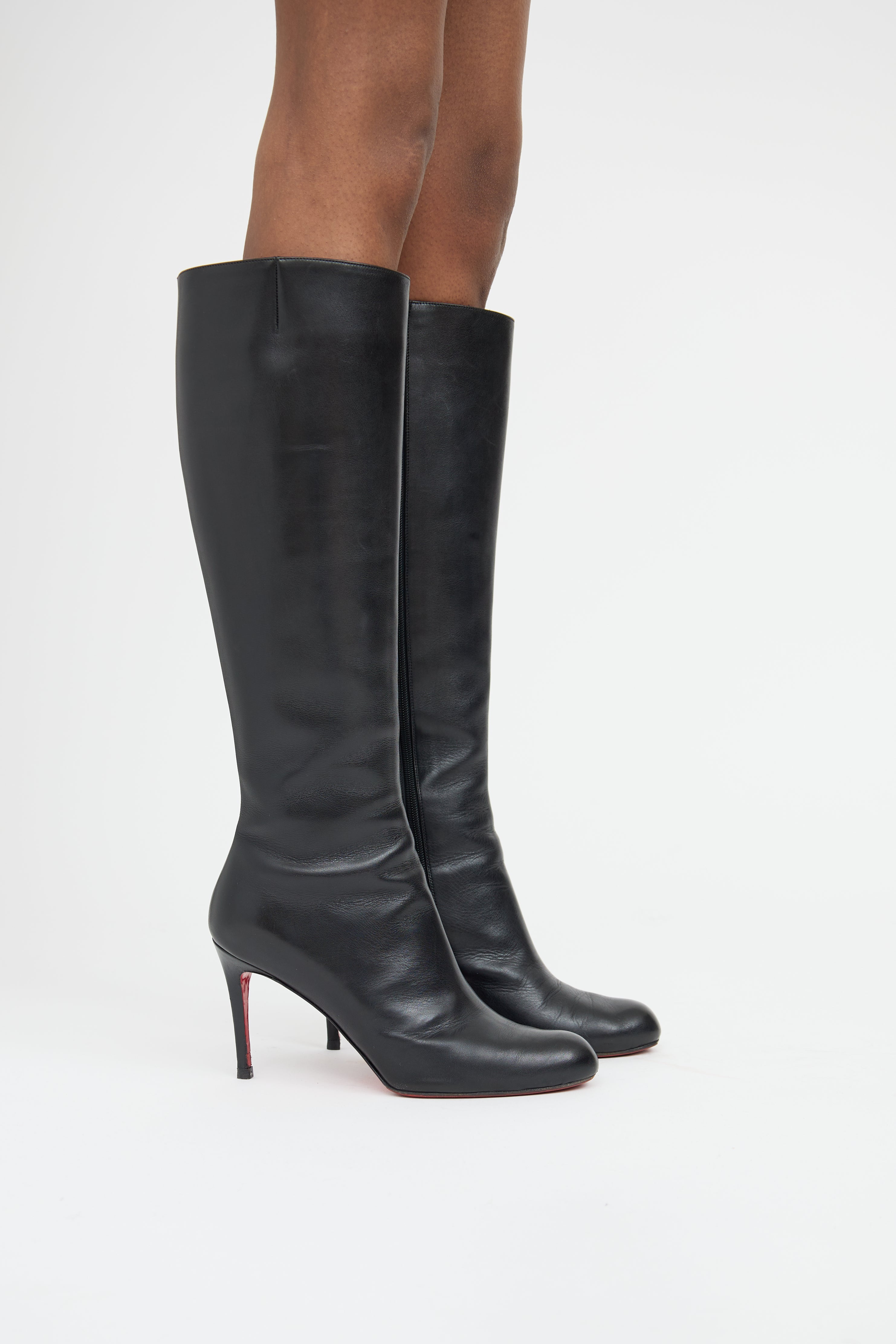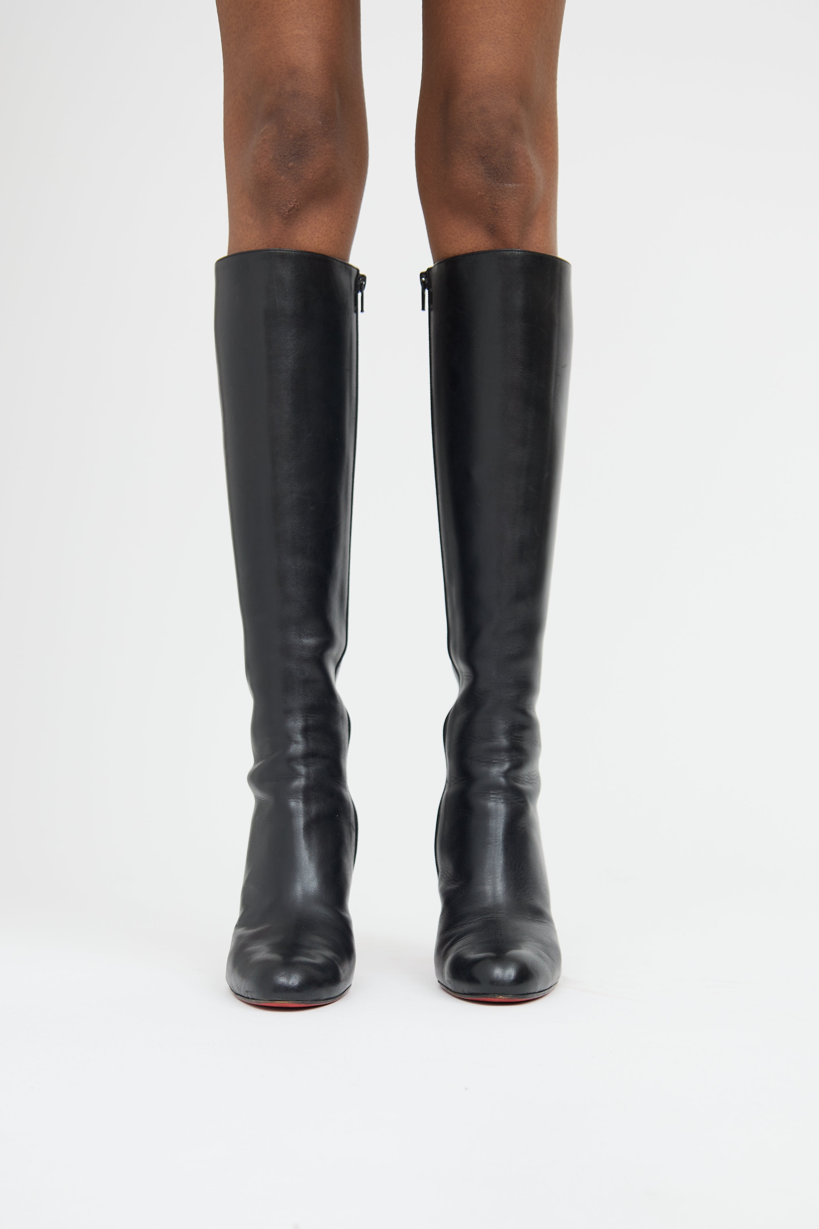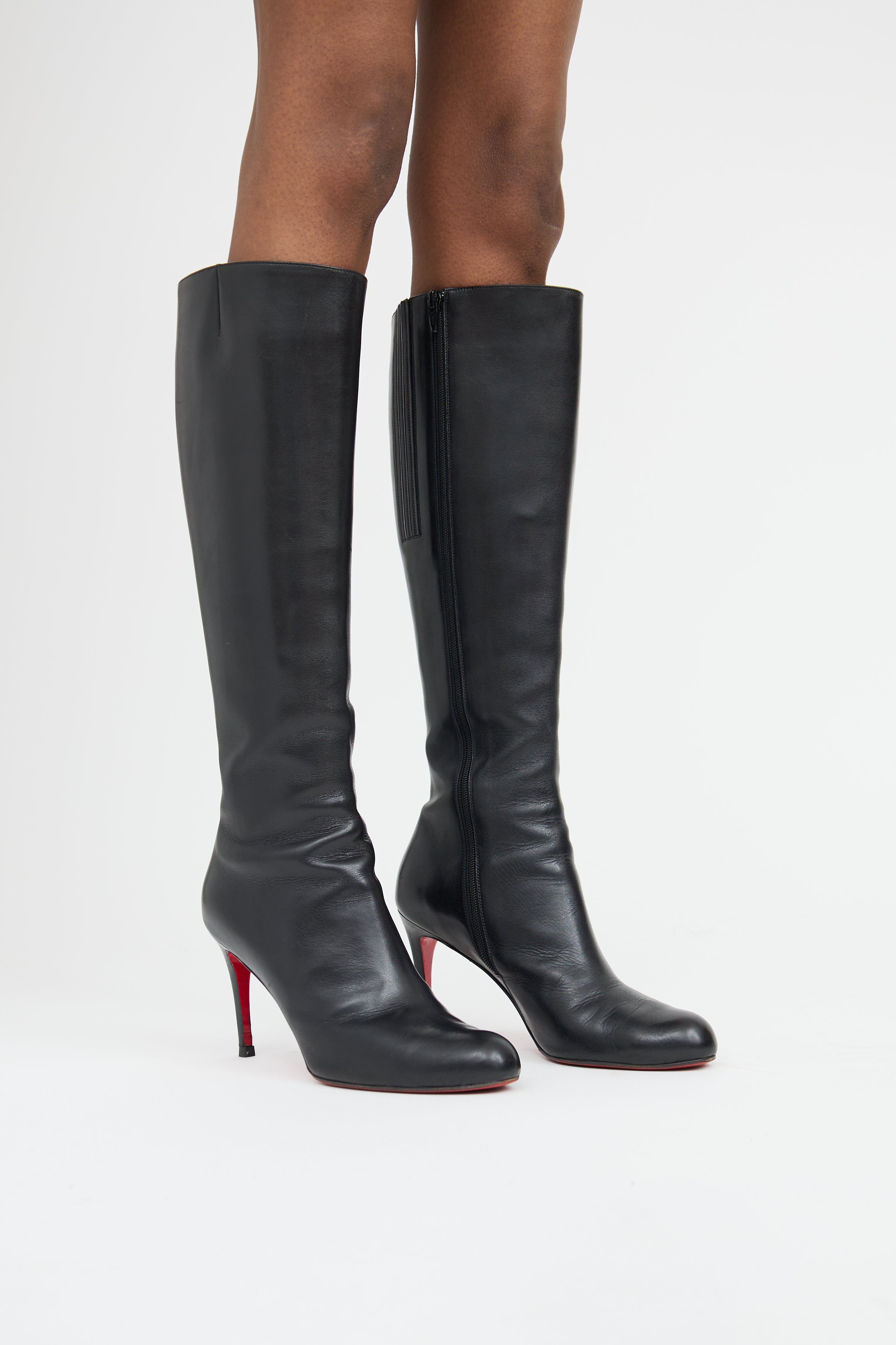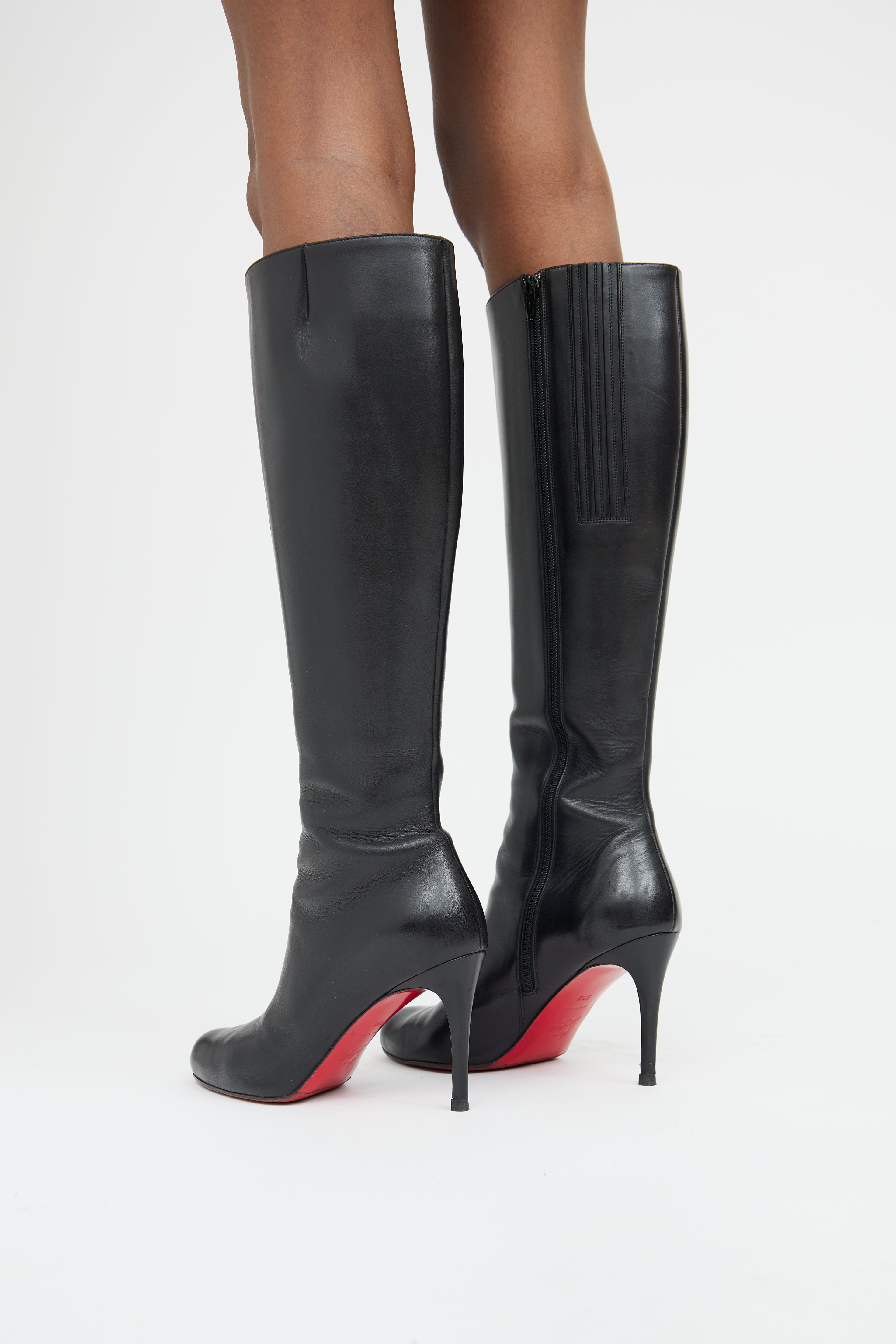 Pre-owned Christian Louboutin black Botalili leather boots featuring a pointed rounded toe, wrapped stiletto heel, knee high shaft, and zip closure at side. Comes with original box and dust bag.