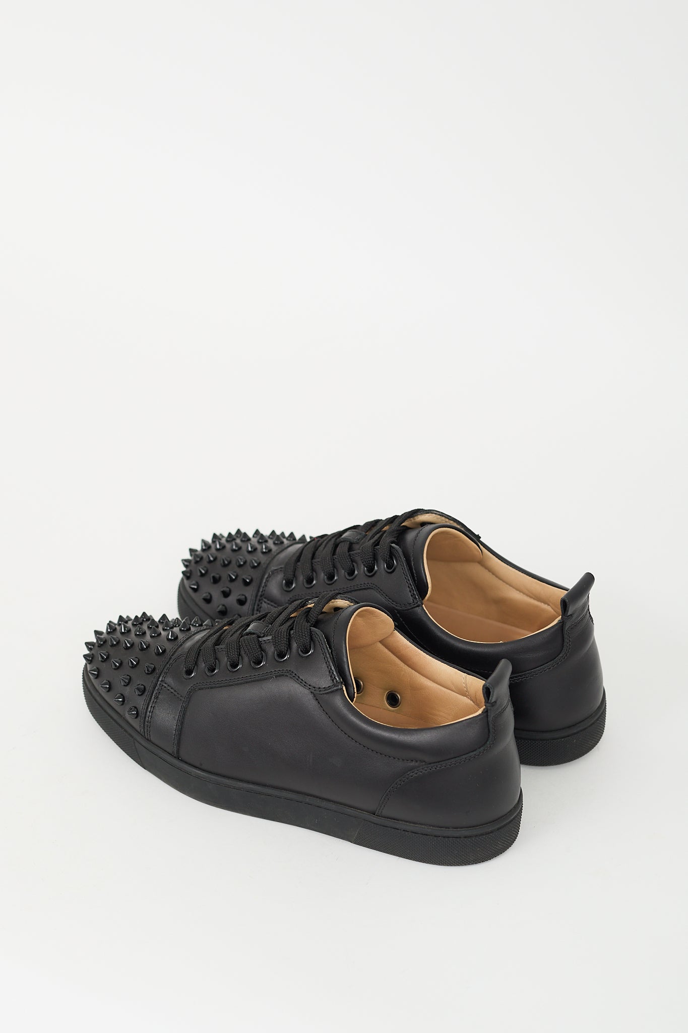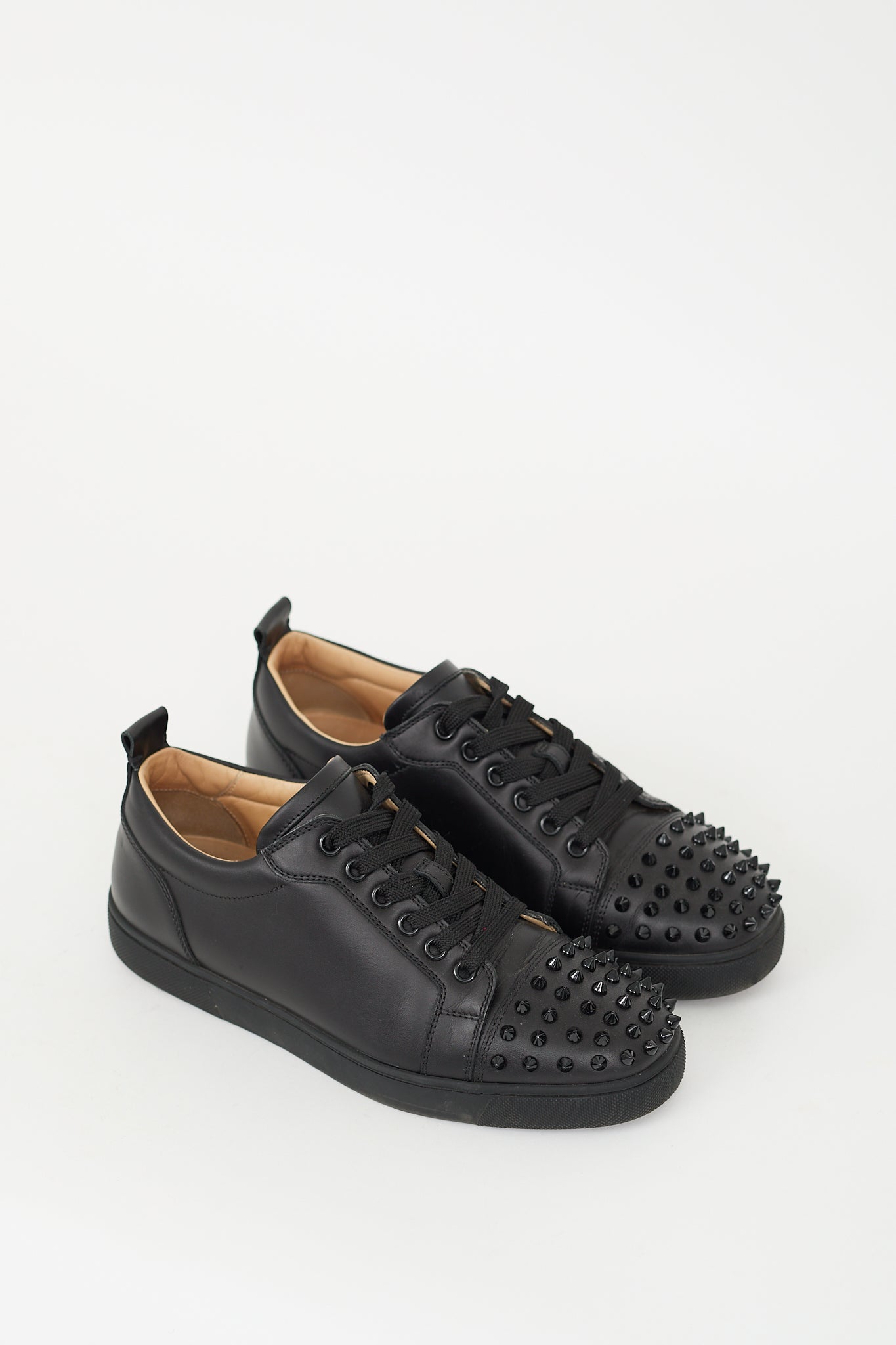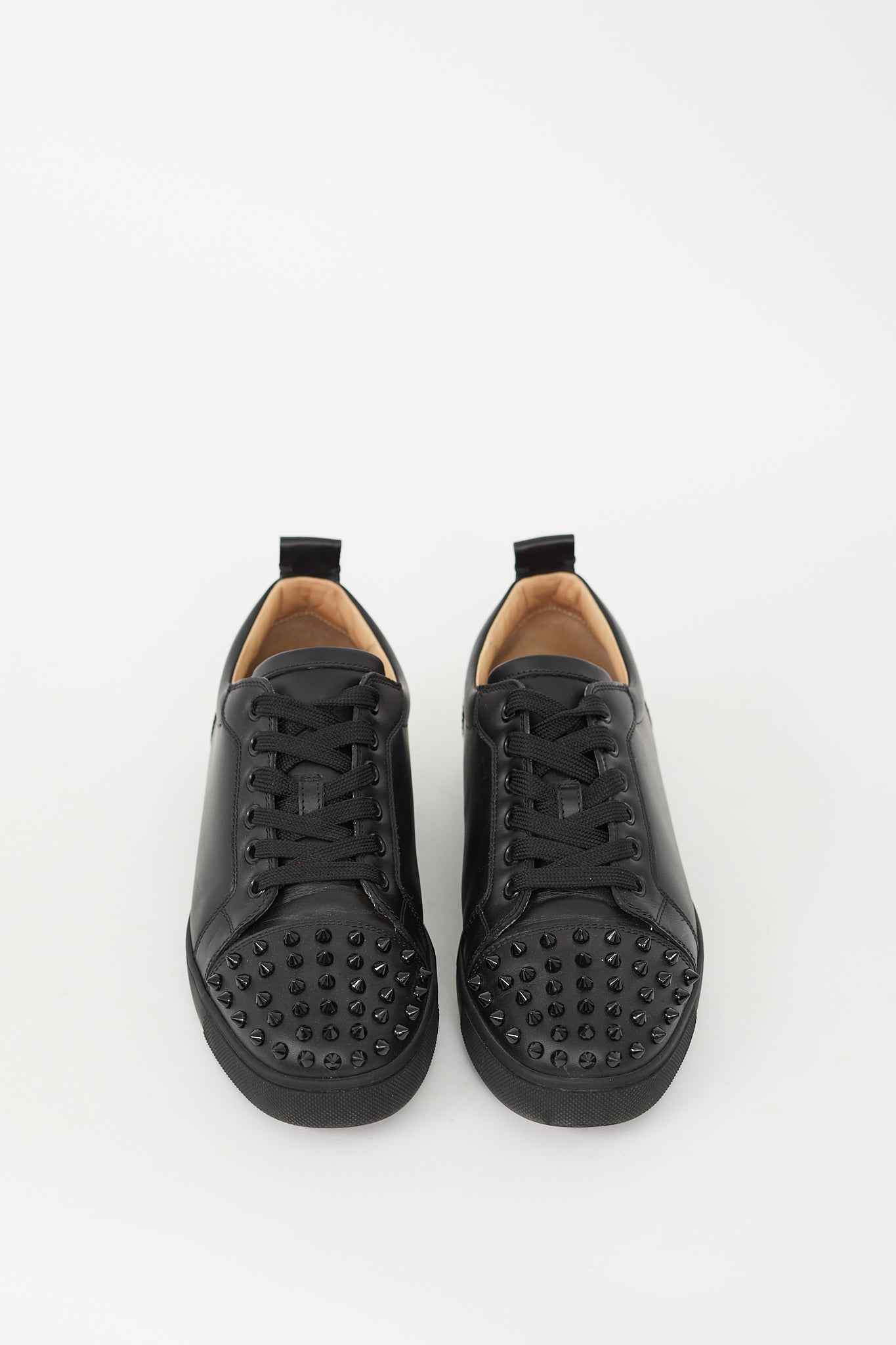Pre-owned Christian Louboutin black leather Louis Junior Spikes sneakers featuring rounded toe, tonal spike embellished toe cap, lace up front, pull tab at back, and signature red outsole. Comes with original dust bag.