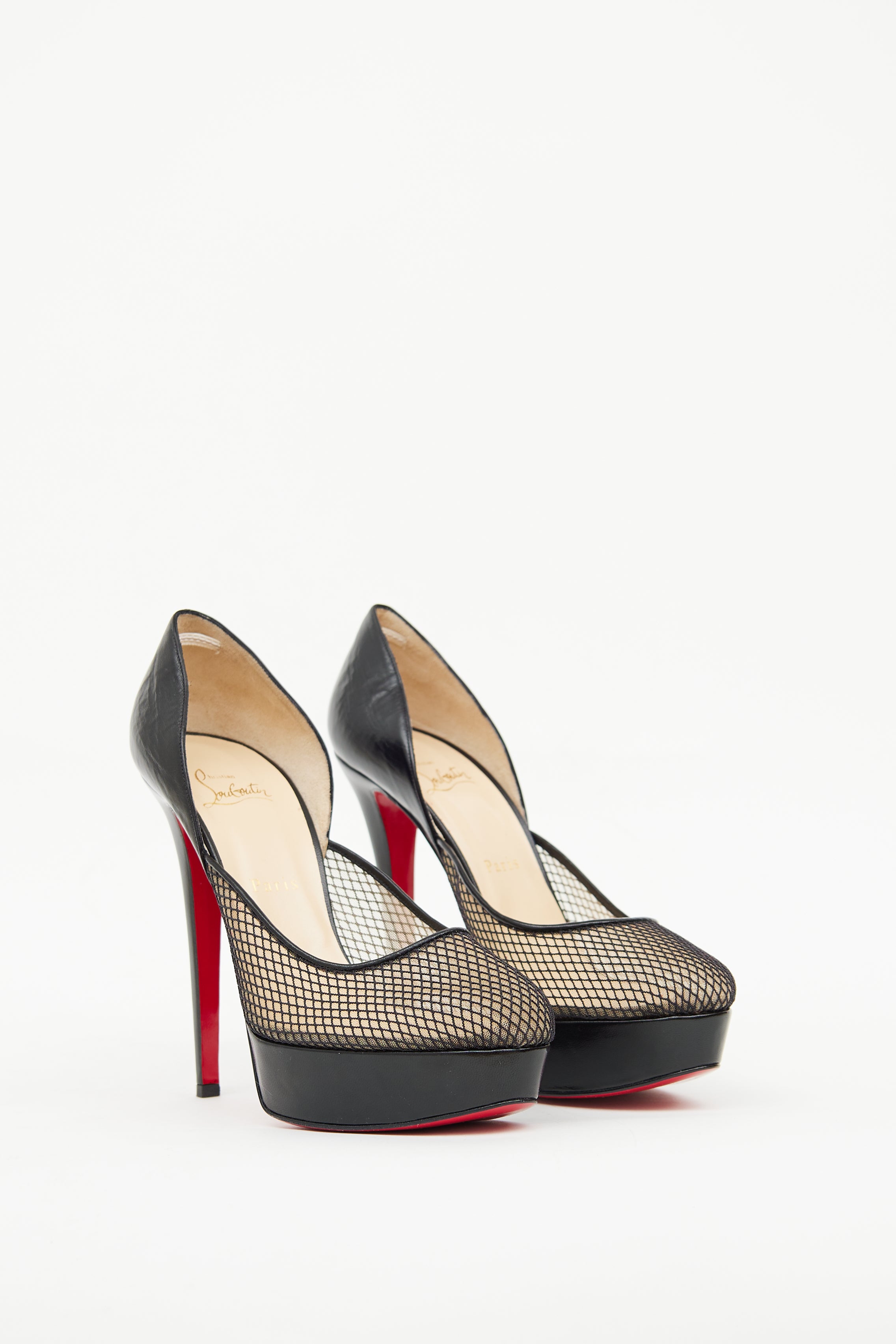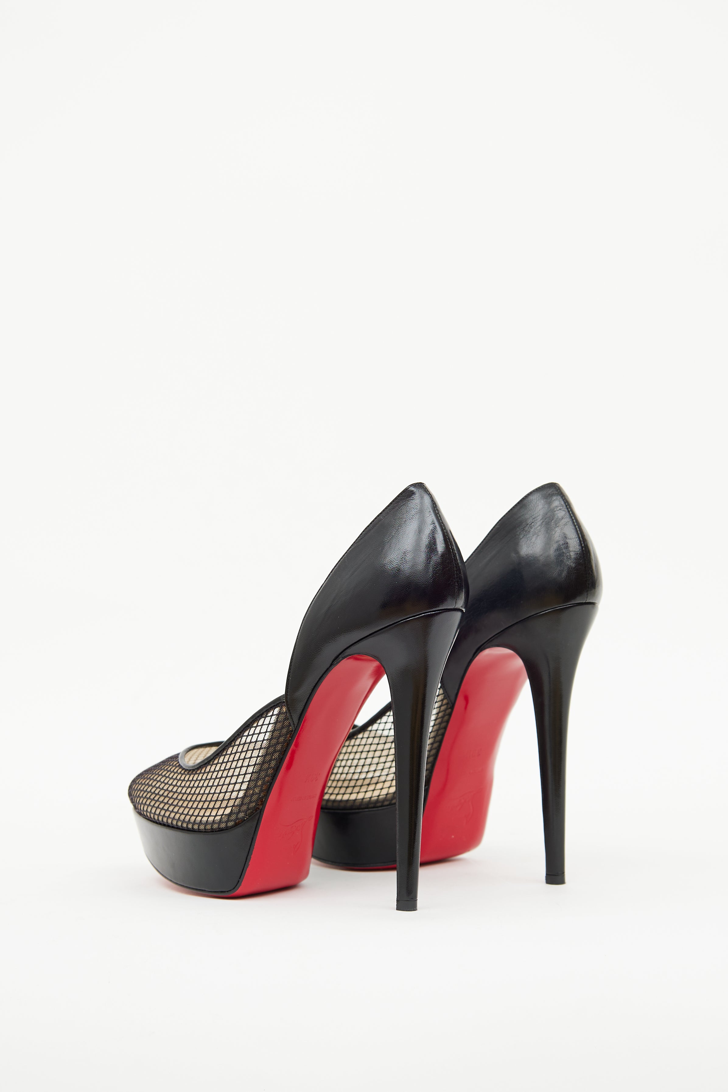 Pre-owned Christian Louboutin black leather platform pumps featuring soft pointed toe, black mesh uppers and signature red sole.