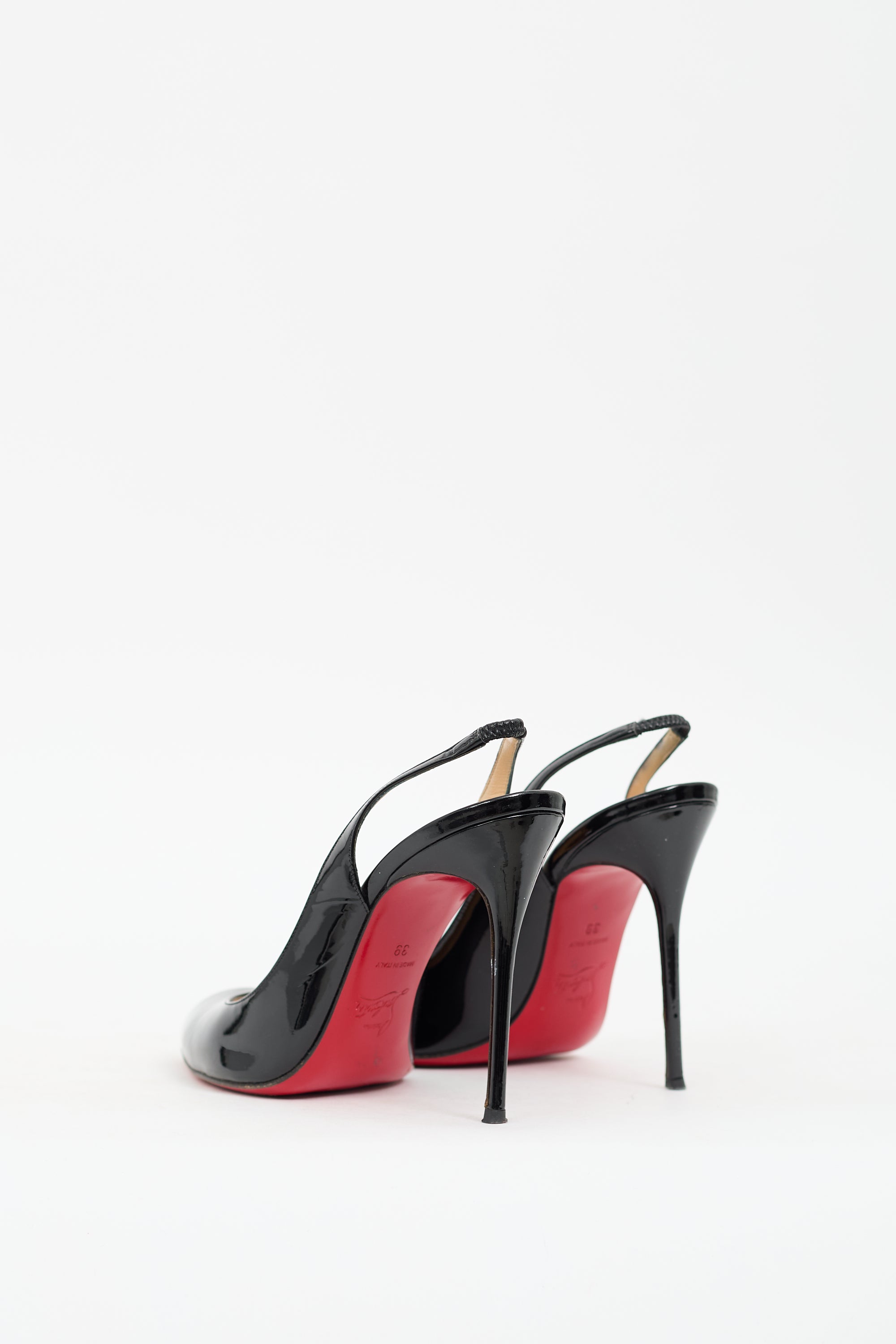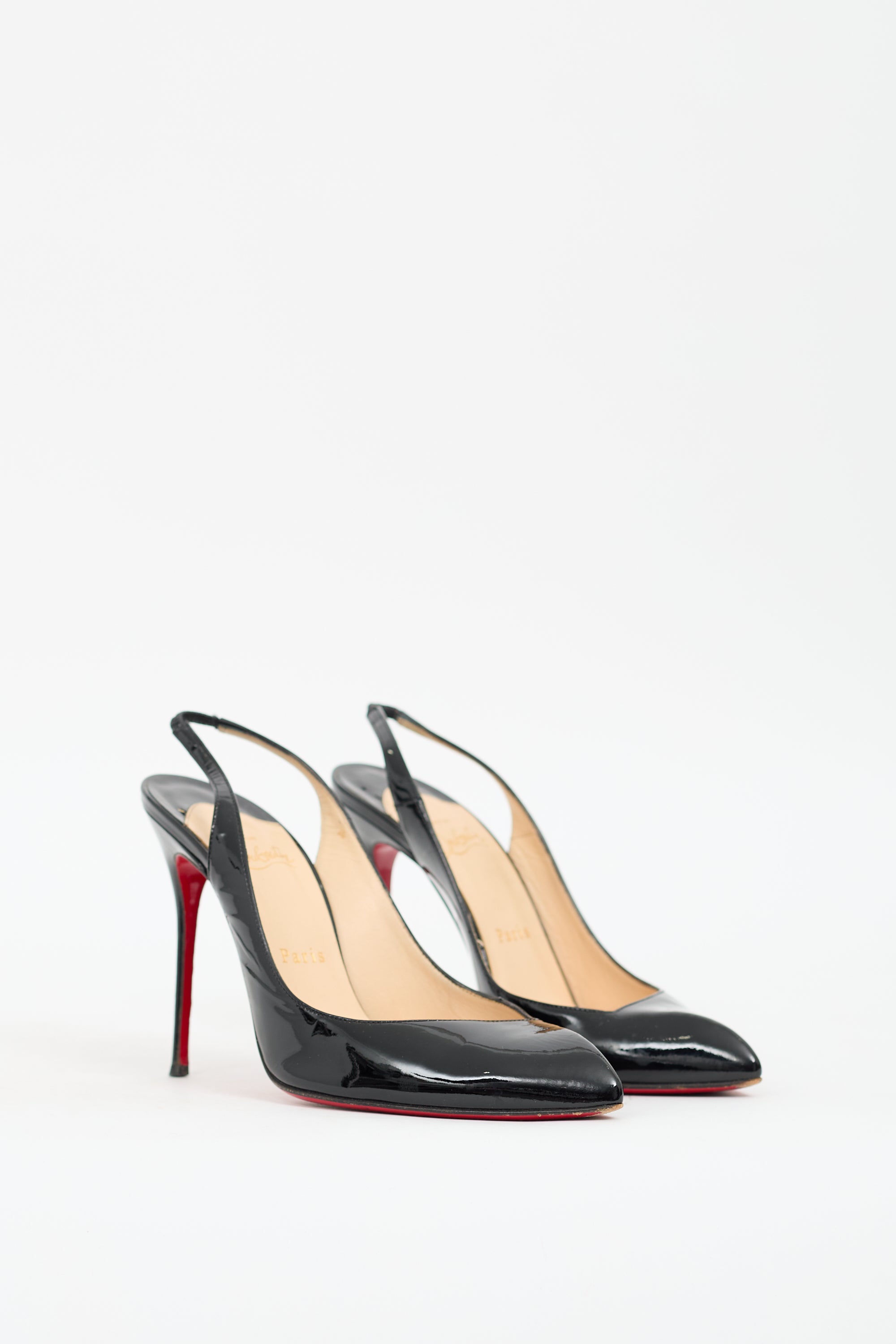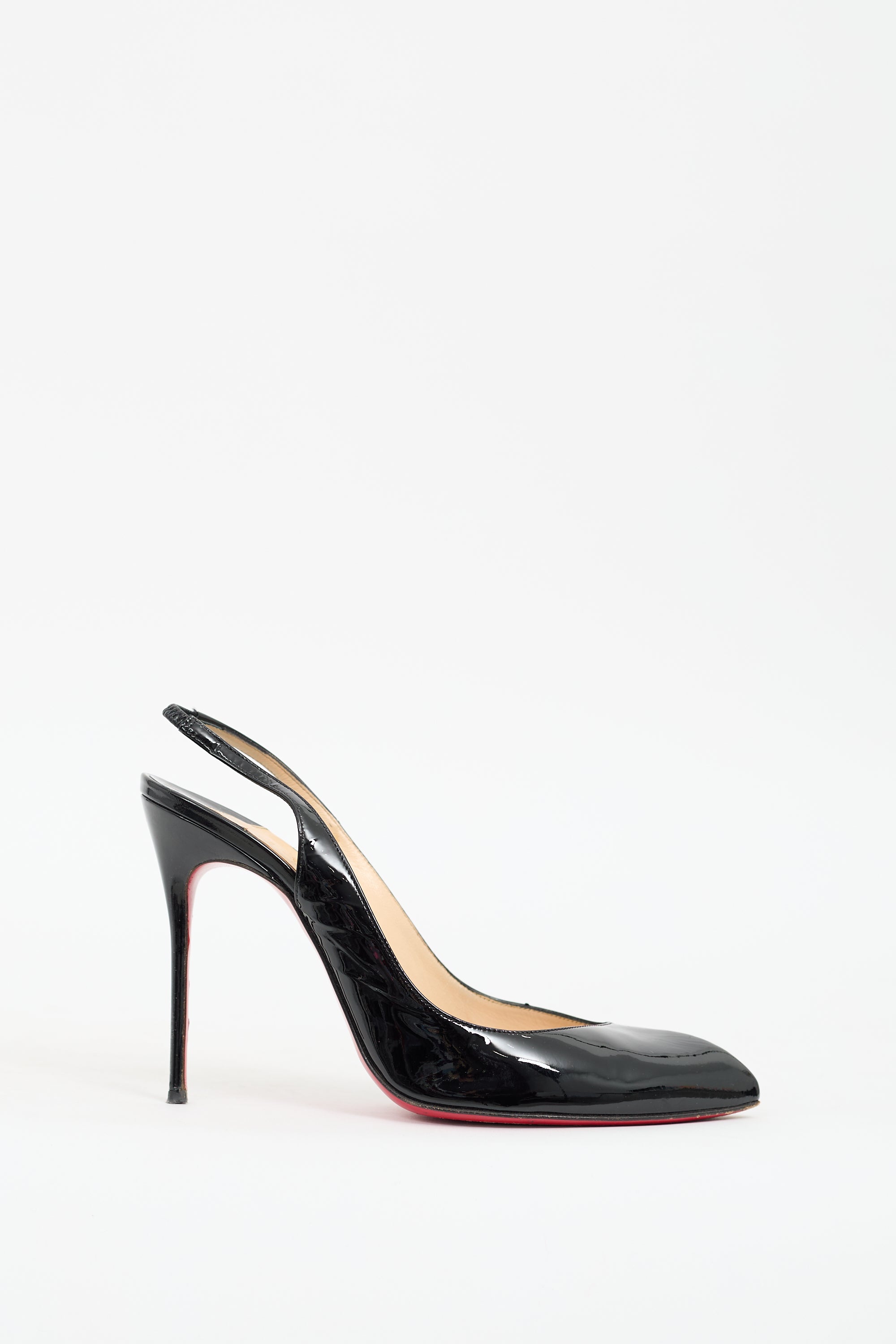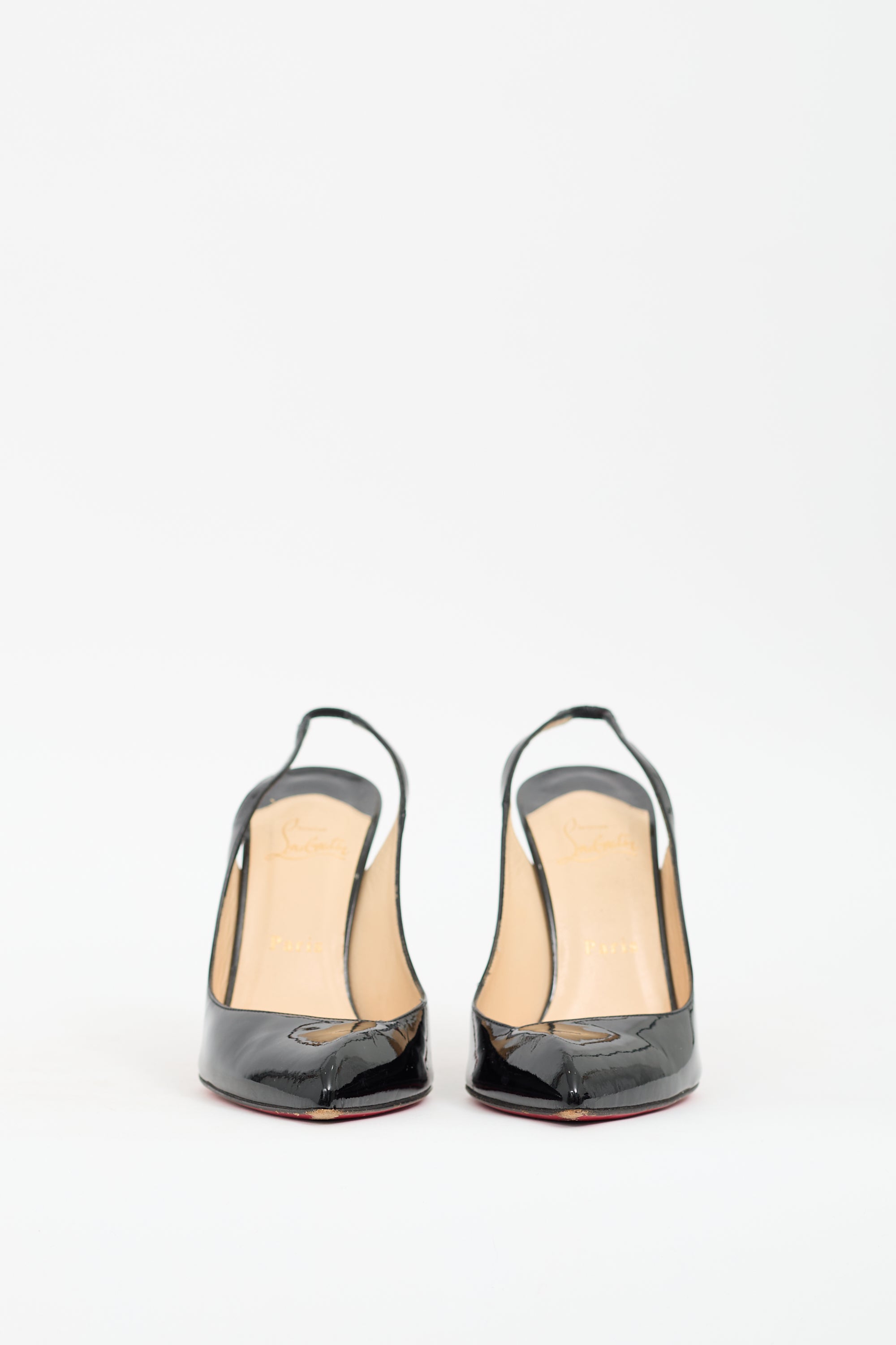 Pre-owned Christian Louboutin black patent leather Corneille pumps featuring pointed toe, asymmetric V-topline, elasticized slingback strap, covered stiletto heel, signature red lacquered sole, and slip on entry. Comes with original dust bag.