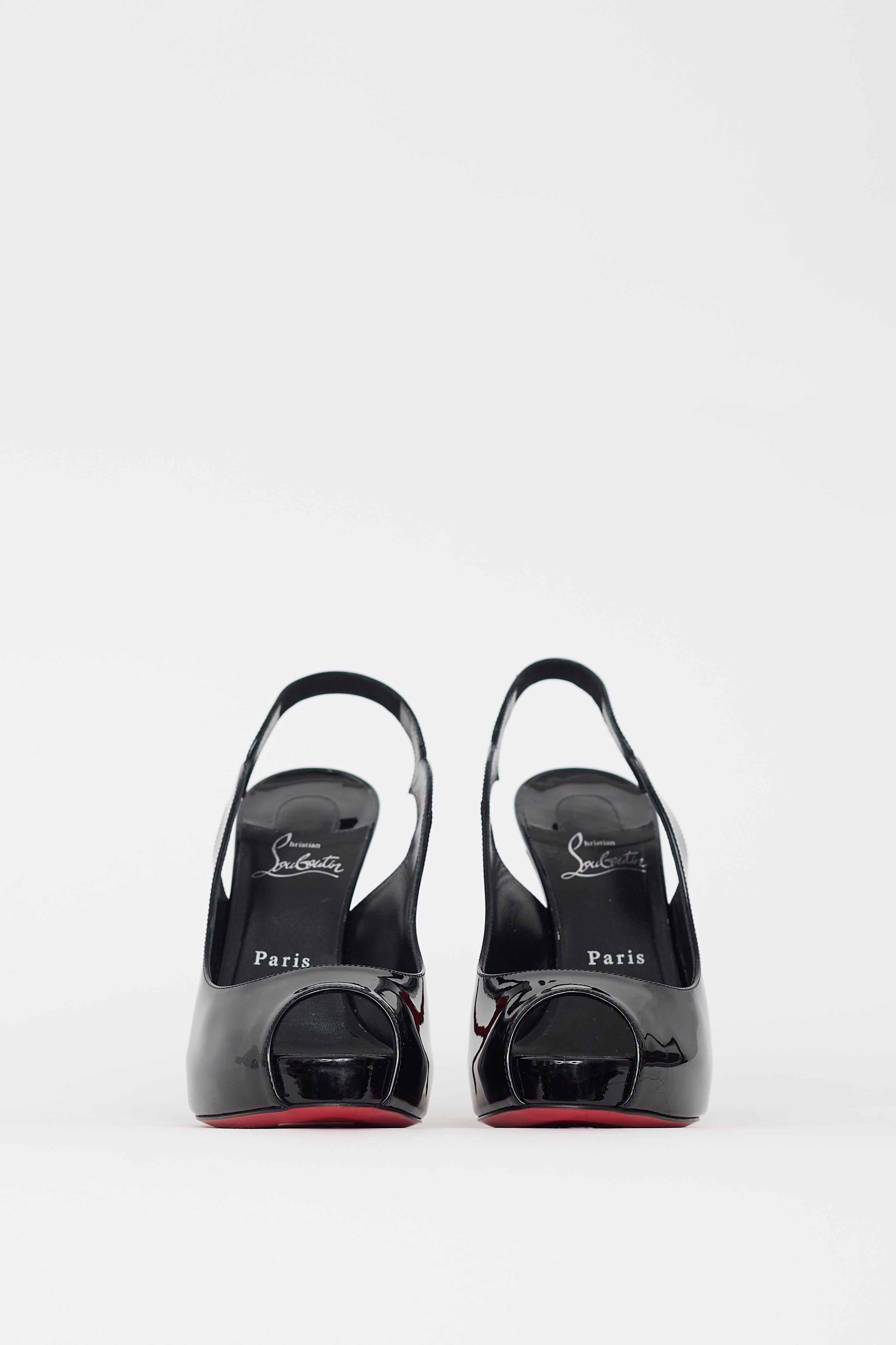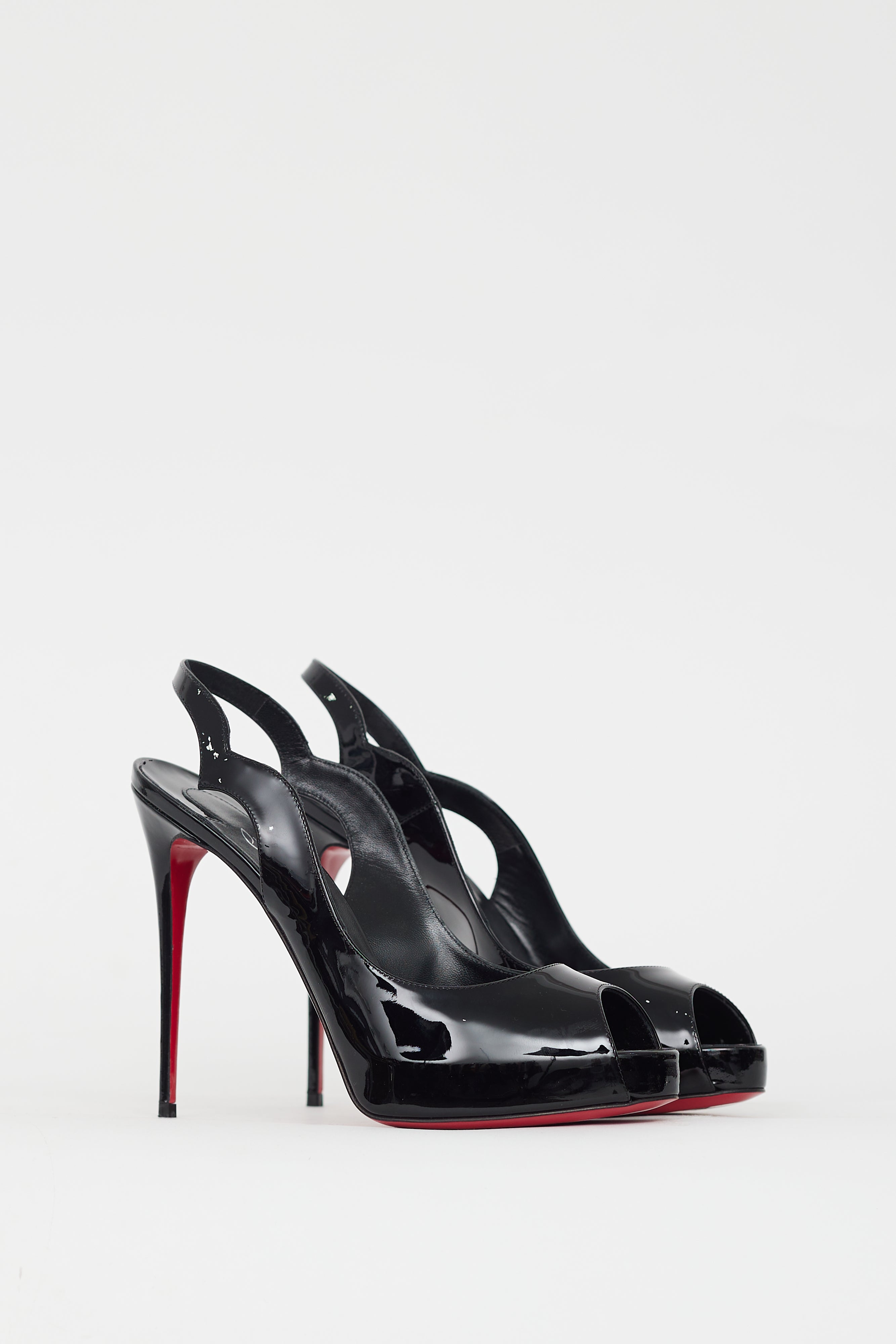 Pre-owned Christian Louboutin black patent Hot Chick heels featuring peep almond toe, scalloped ankle strap, stiletto heel, concealed platform toe box, and signature red lacquered outsole. Comes with original box.