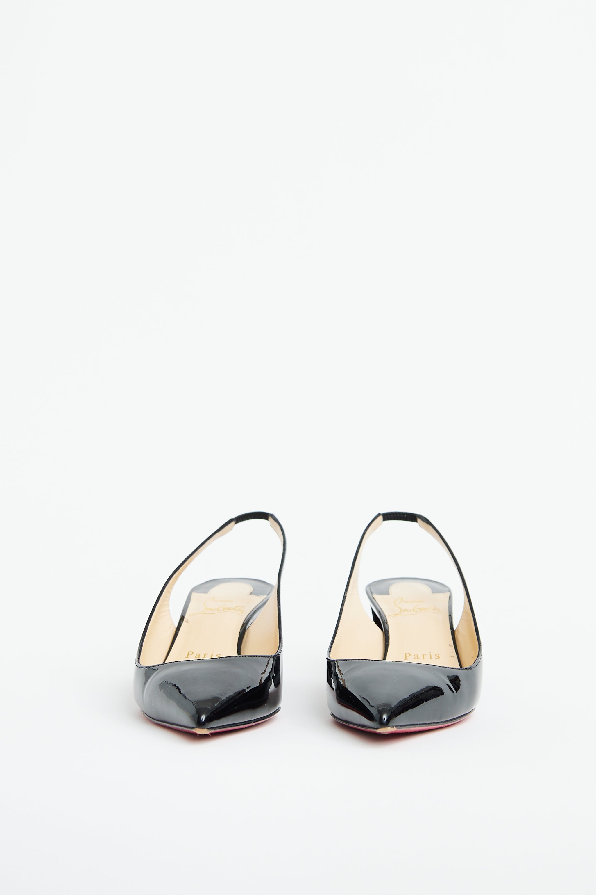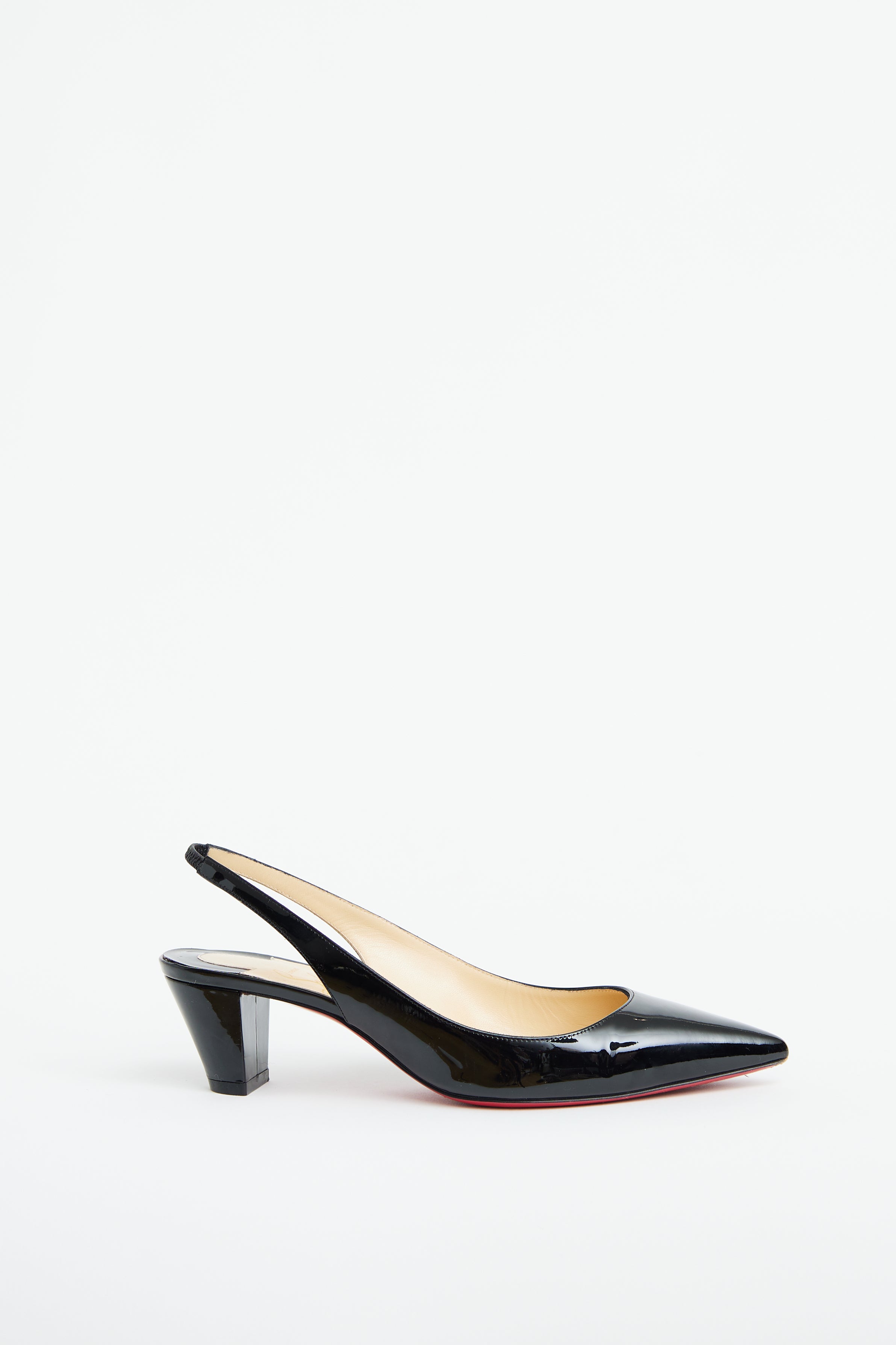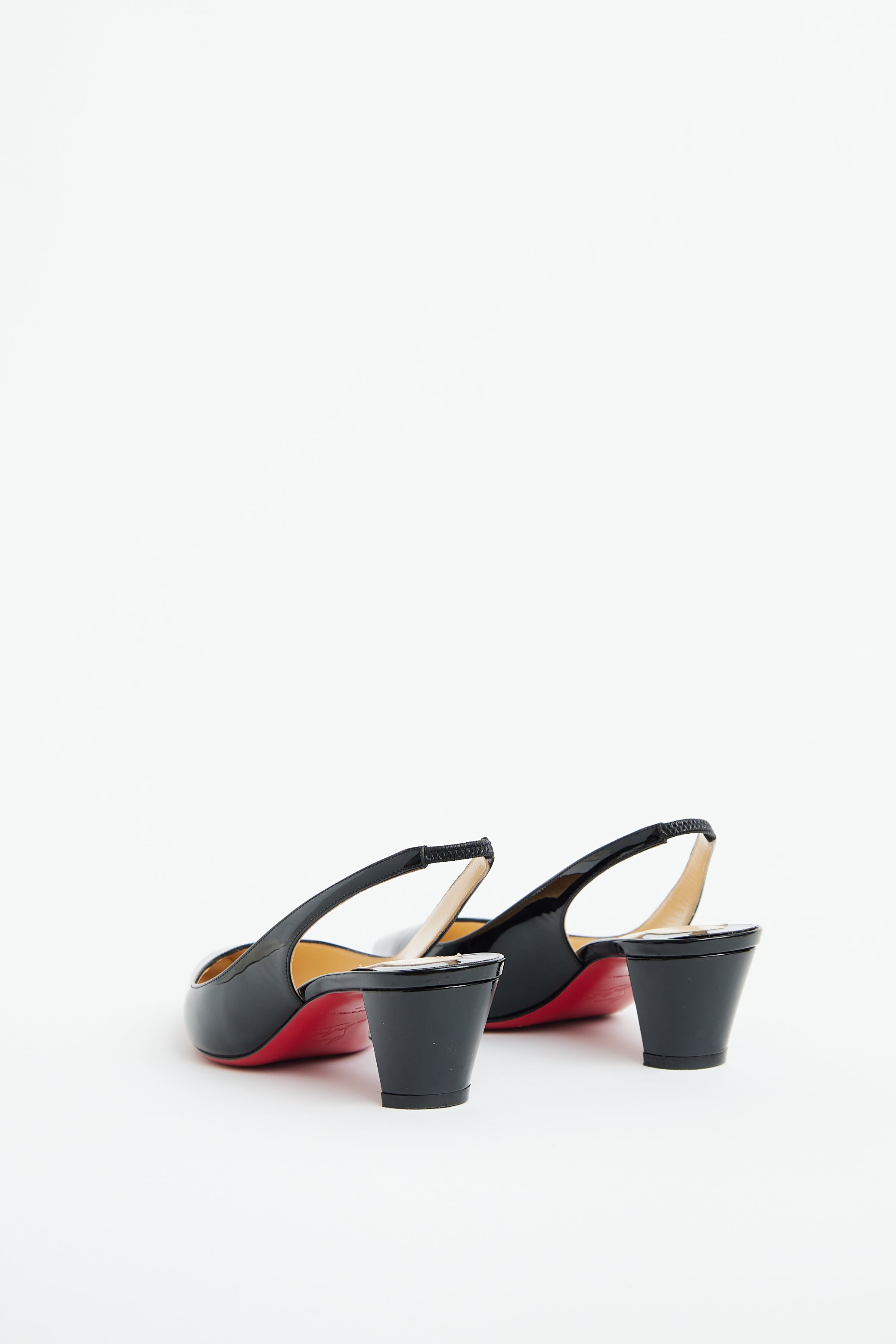 Pre-owned Christian Louboutin black patent leather slingbacks featuring pointed toe, slingback strap, and wrapped block heel.