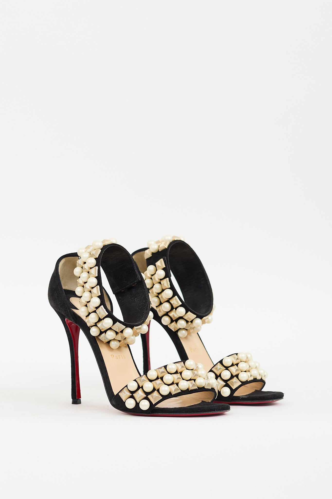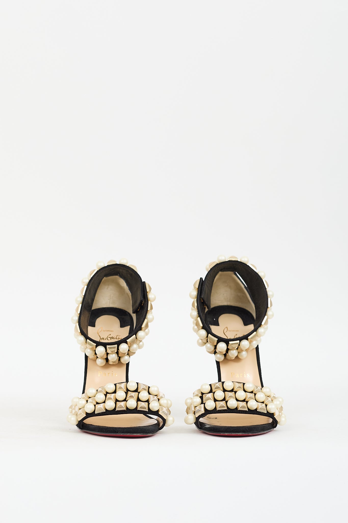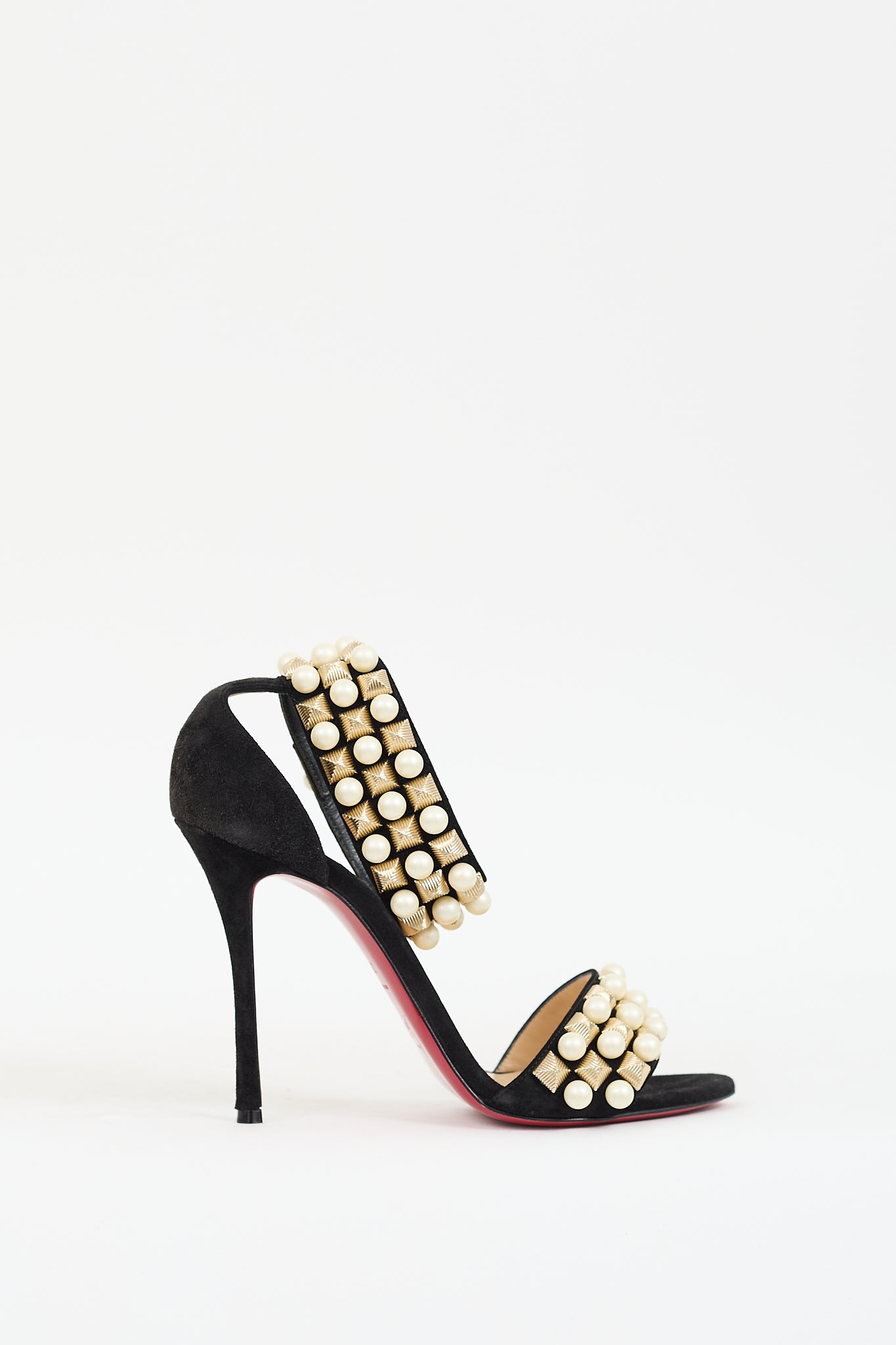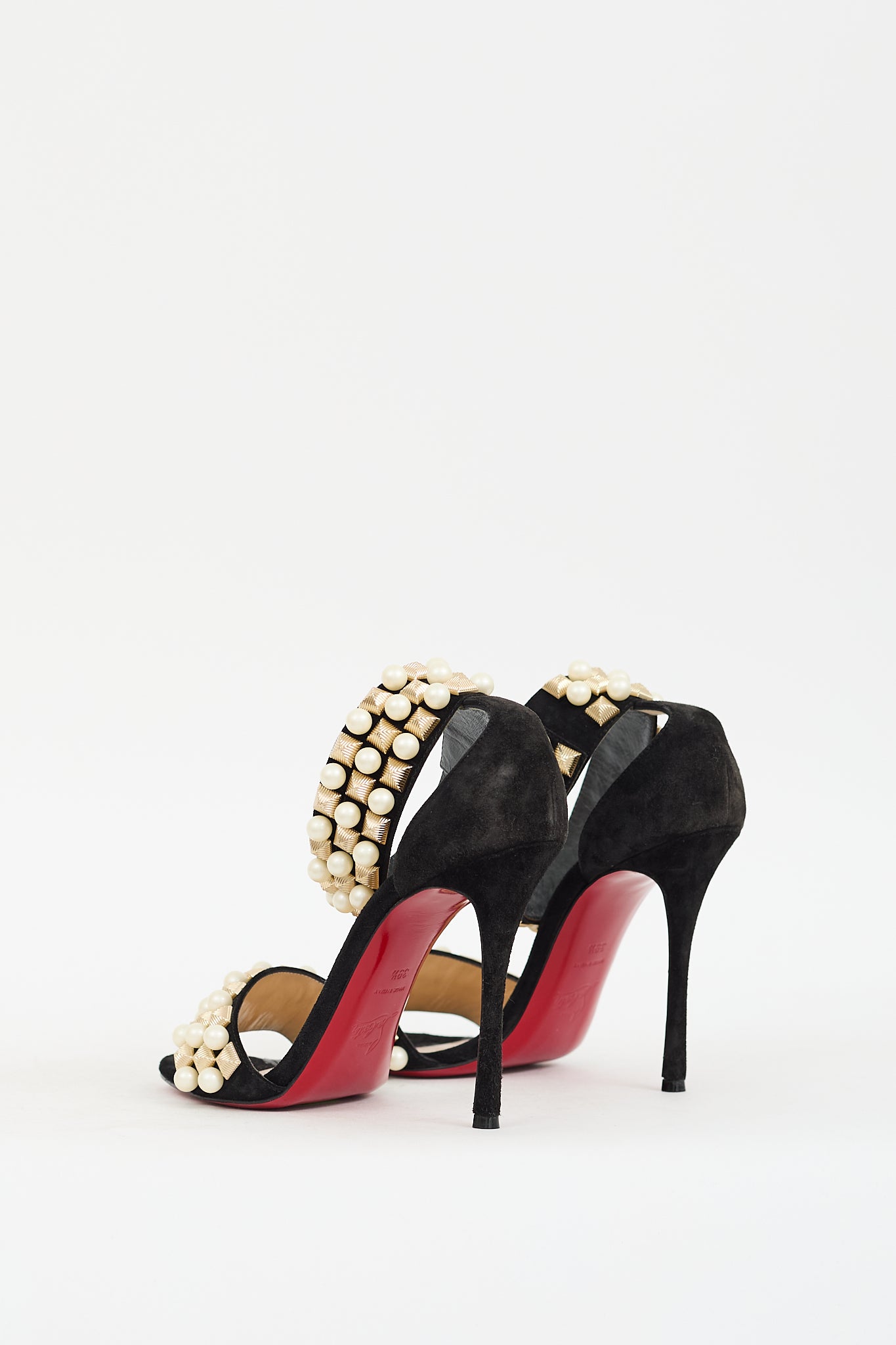 Pre-owned Christian Louboutin black suede Tudor Bal heels featuring open rounded toe, covered stiletto heel, pearls and gold tone square studs throughout upper, adjustable strap at ankle, and signature red lacquered outsole.