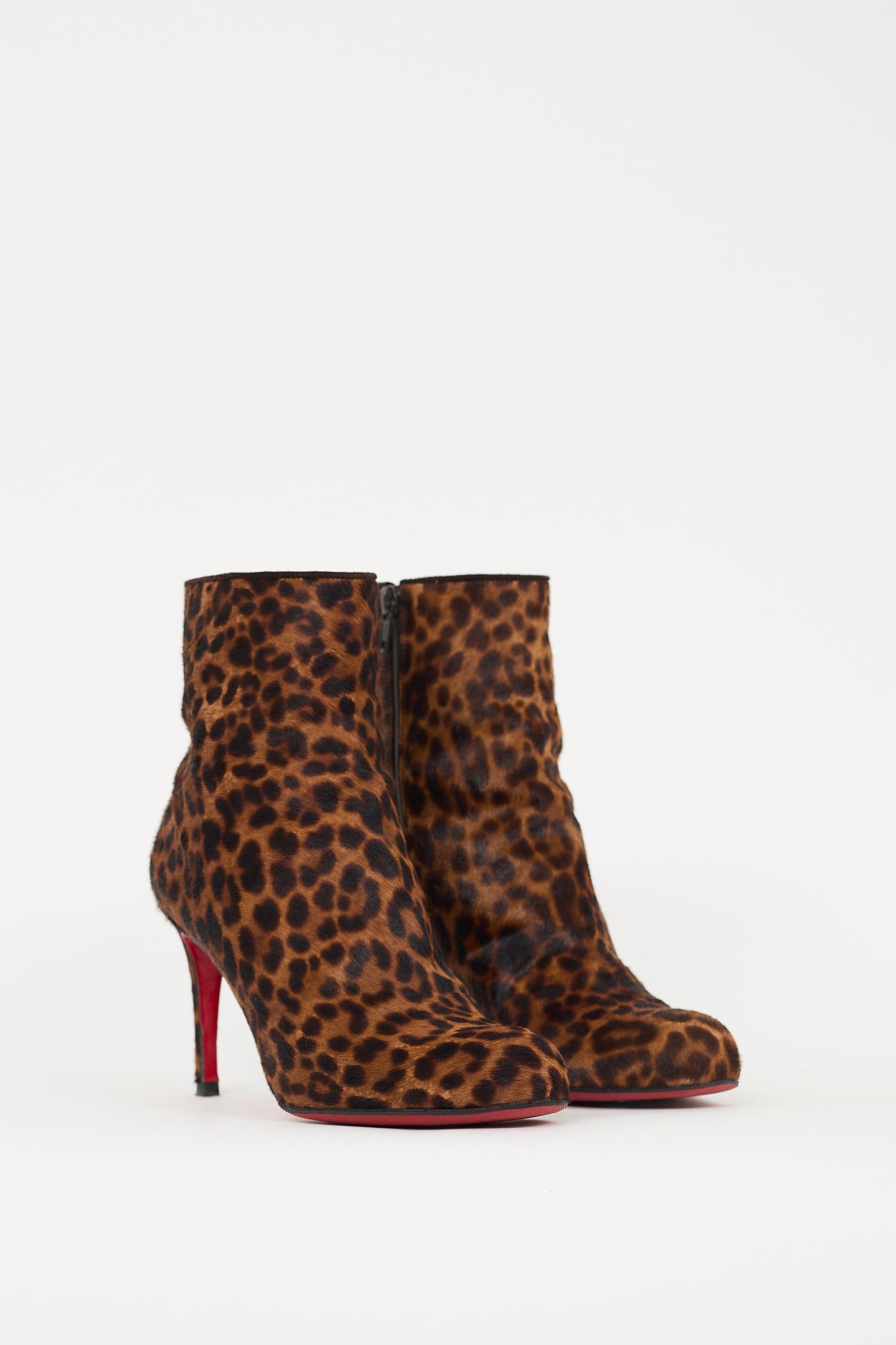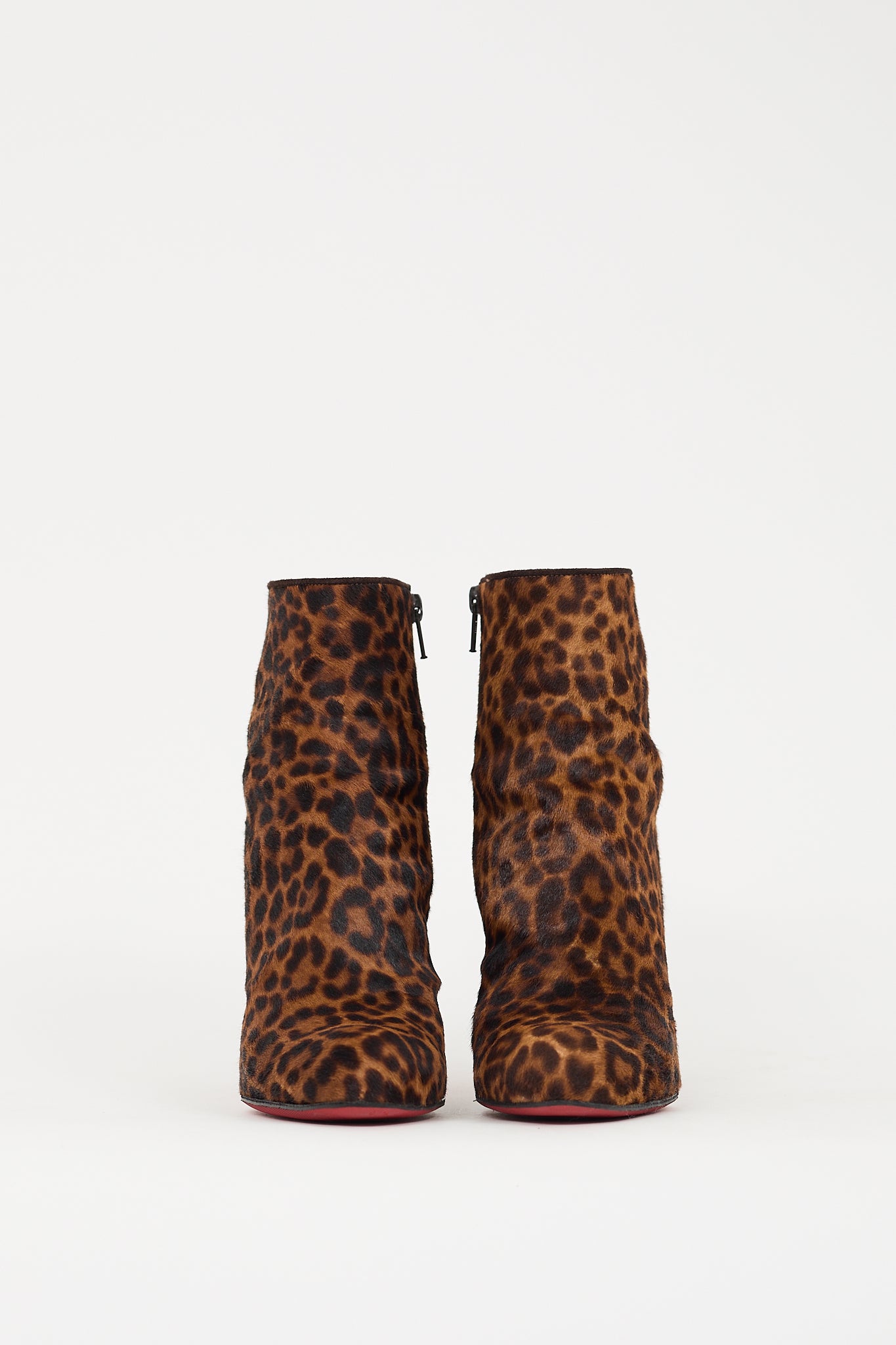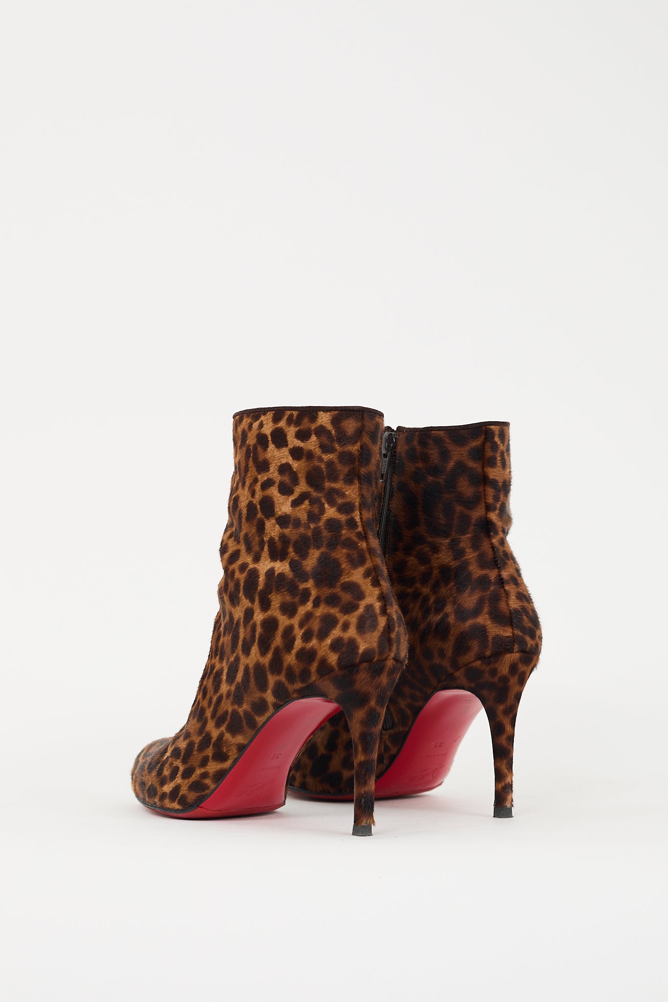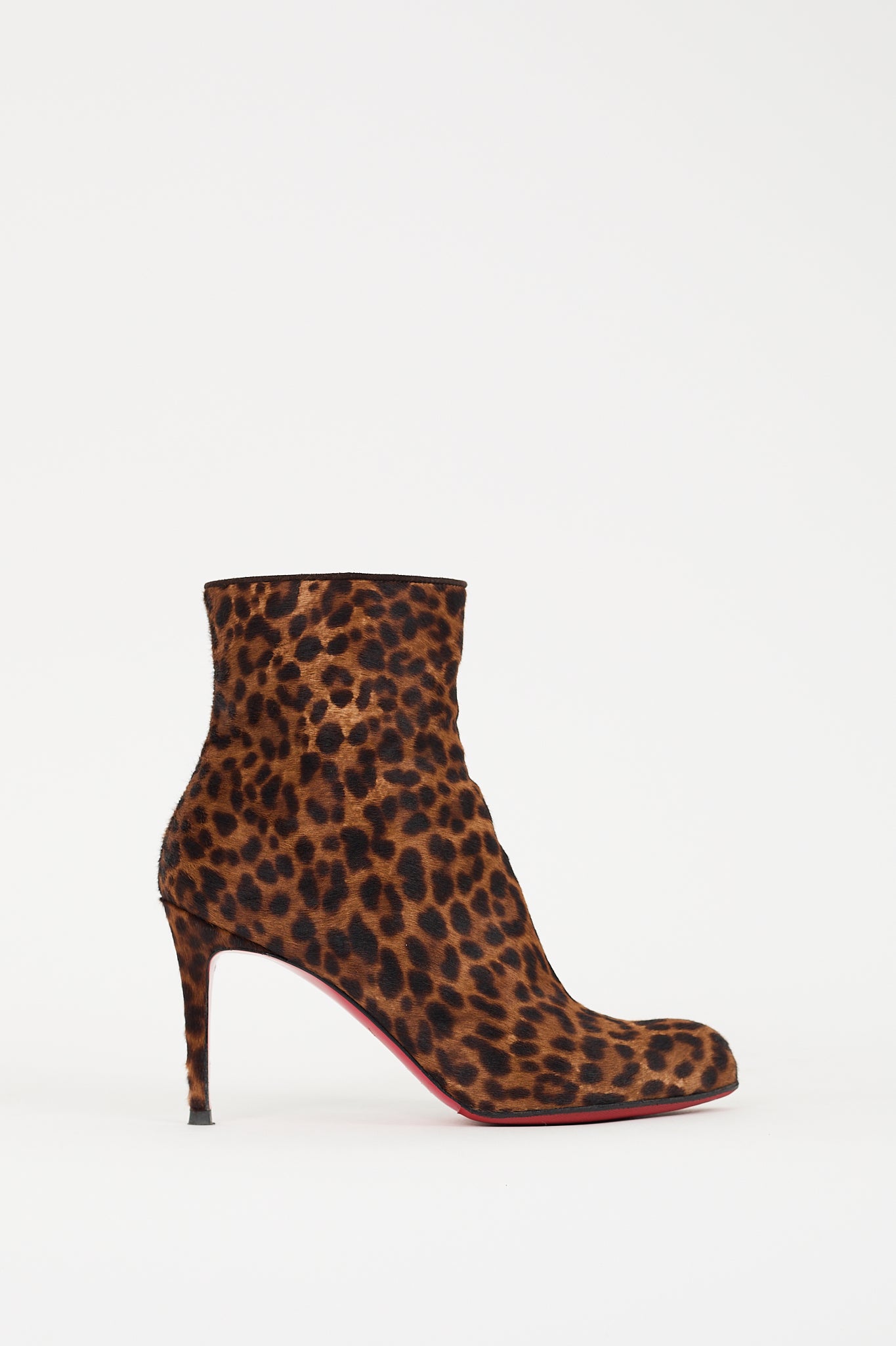 Pre-owned Christian Louboutin brown and black pony hair boots featuring an almond toe, leopard print throughout, inner side zip closure, covered stiletto heel, and signature red lacquered outsole.