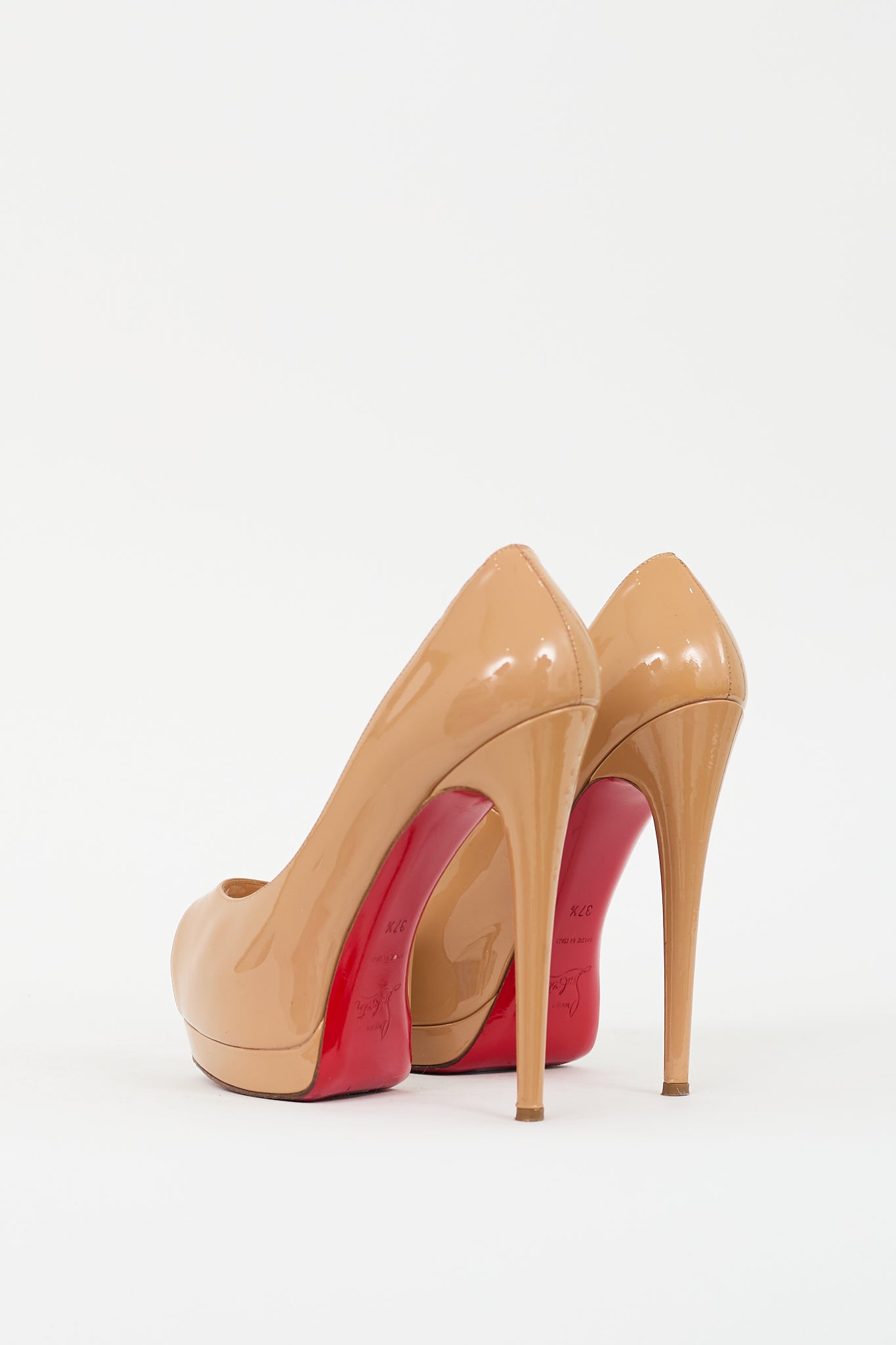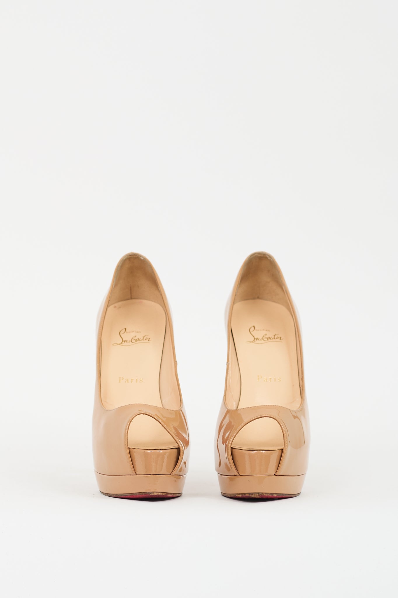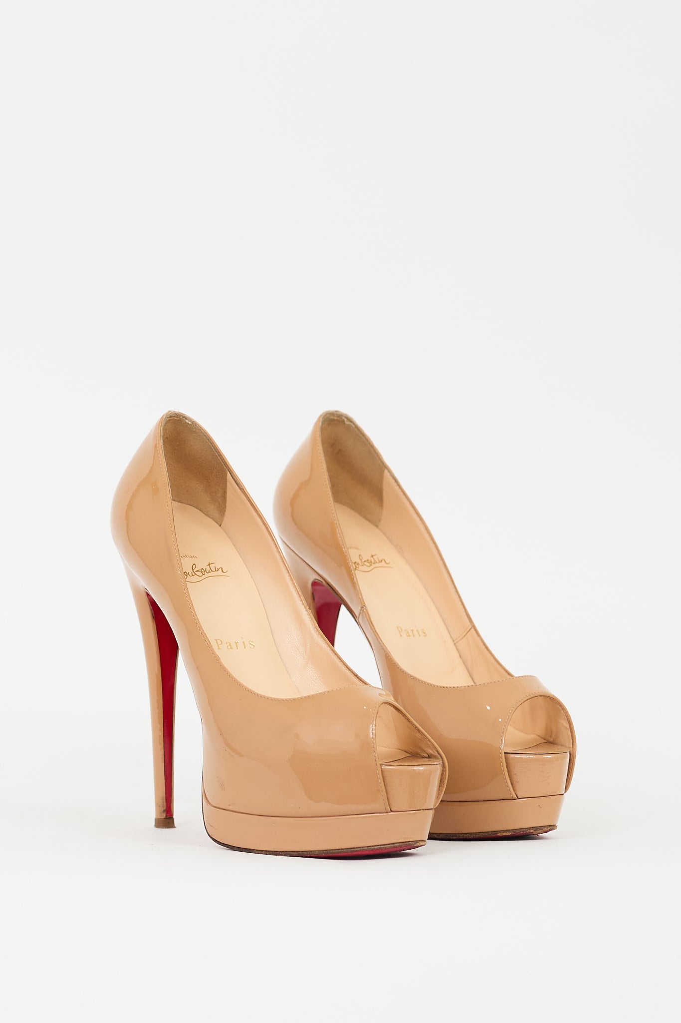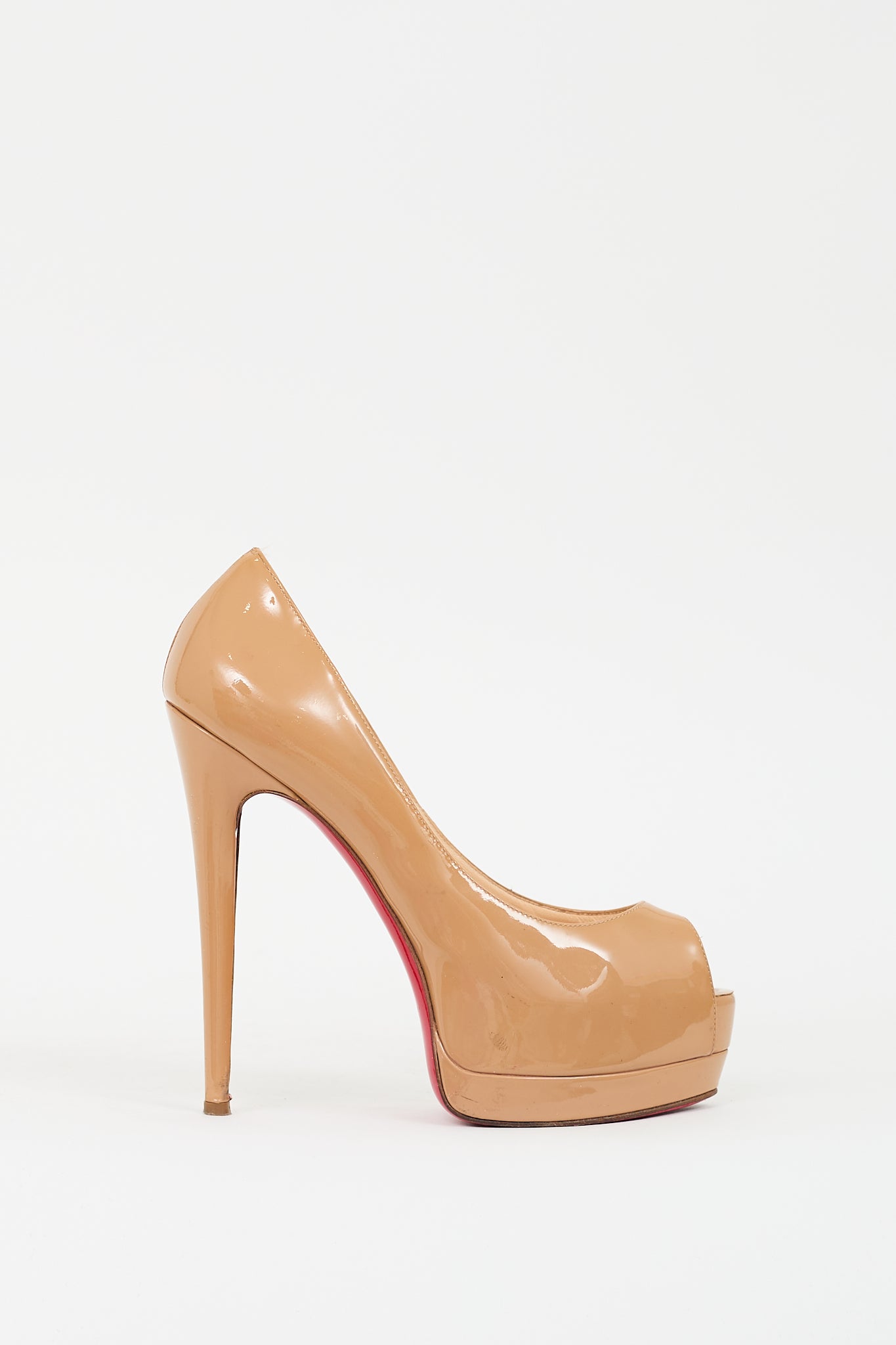 Pre-owned Christian Louboutin brown patent leather Palais Royal pumps featuring almond peep toe, covered platform and stiletto heel, and signature red lacquered outsole.