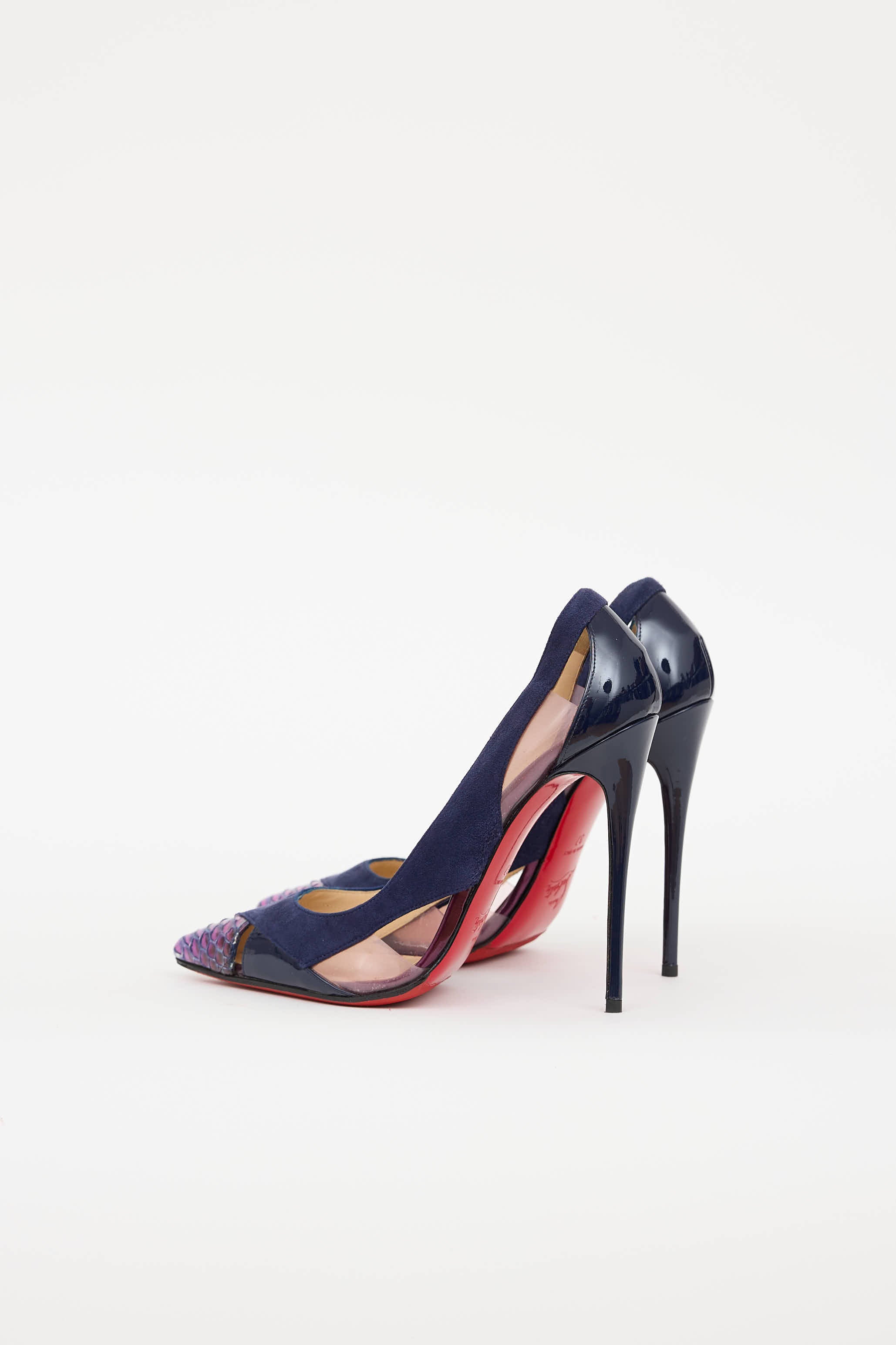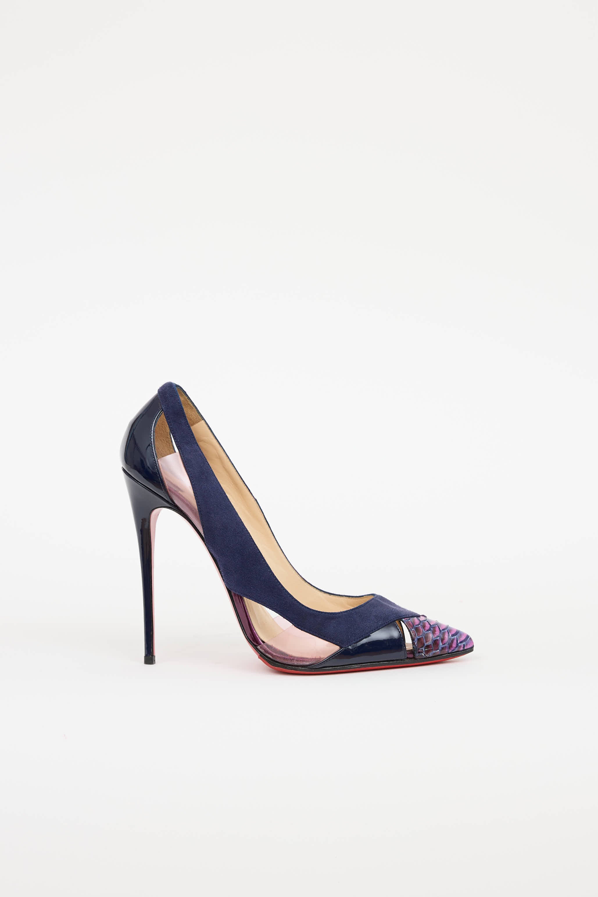 Pre-owned Christian Louboutin navy and purple Galata pump featuring pointed snakeskin toe, suede upper, clear pink tinted PVC cutouts at side, patent leather covered heel, and signature red bottoms.