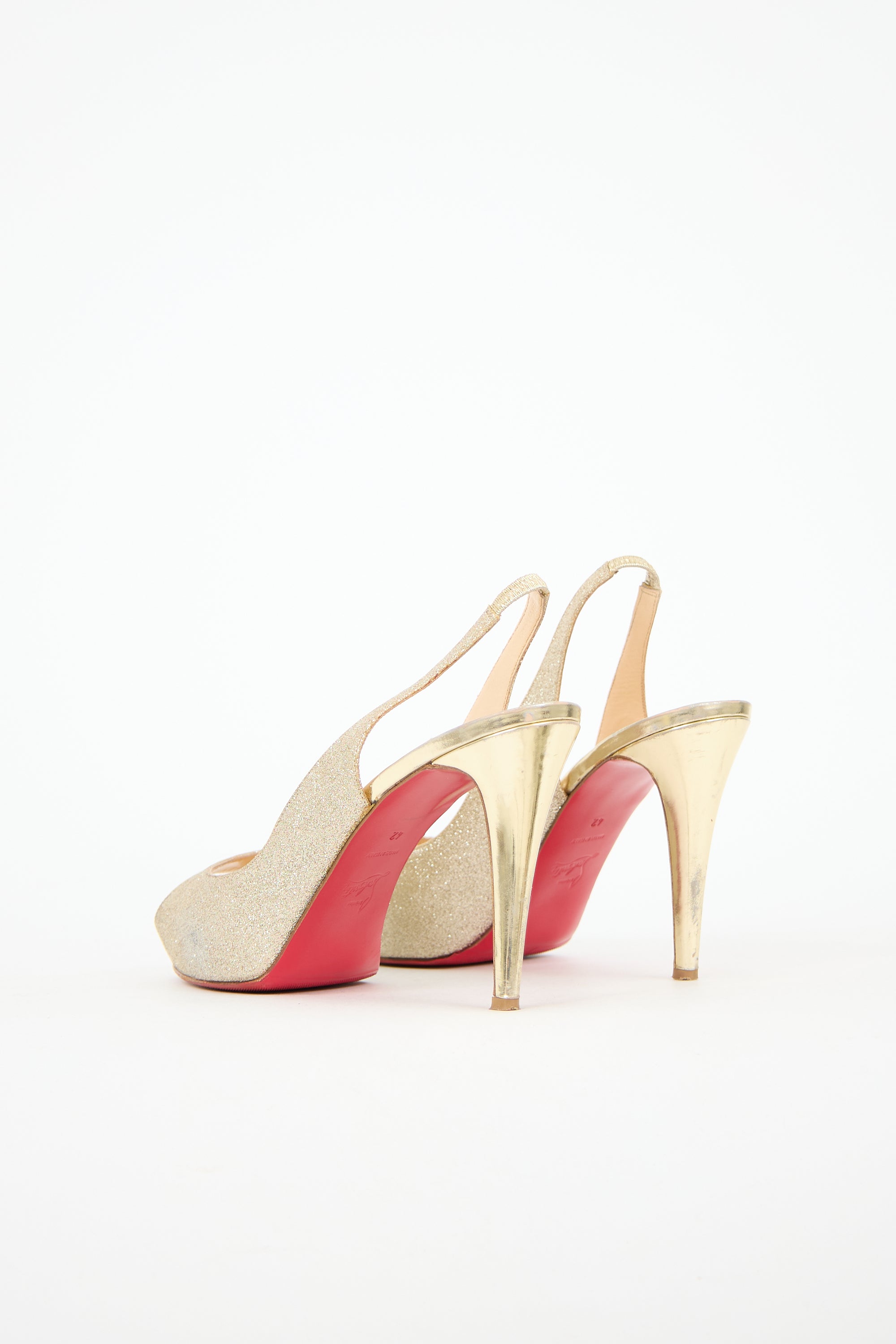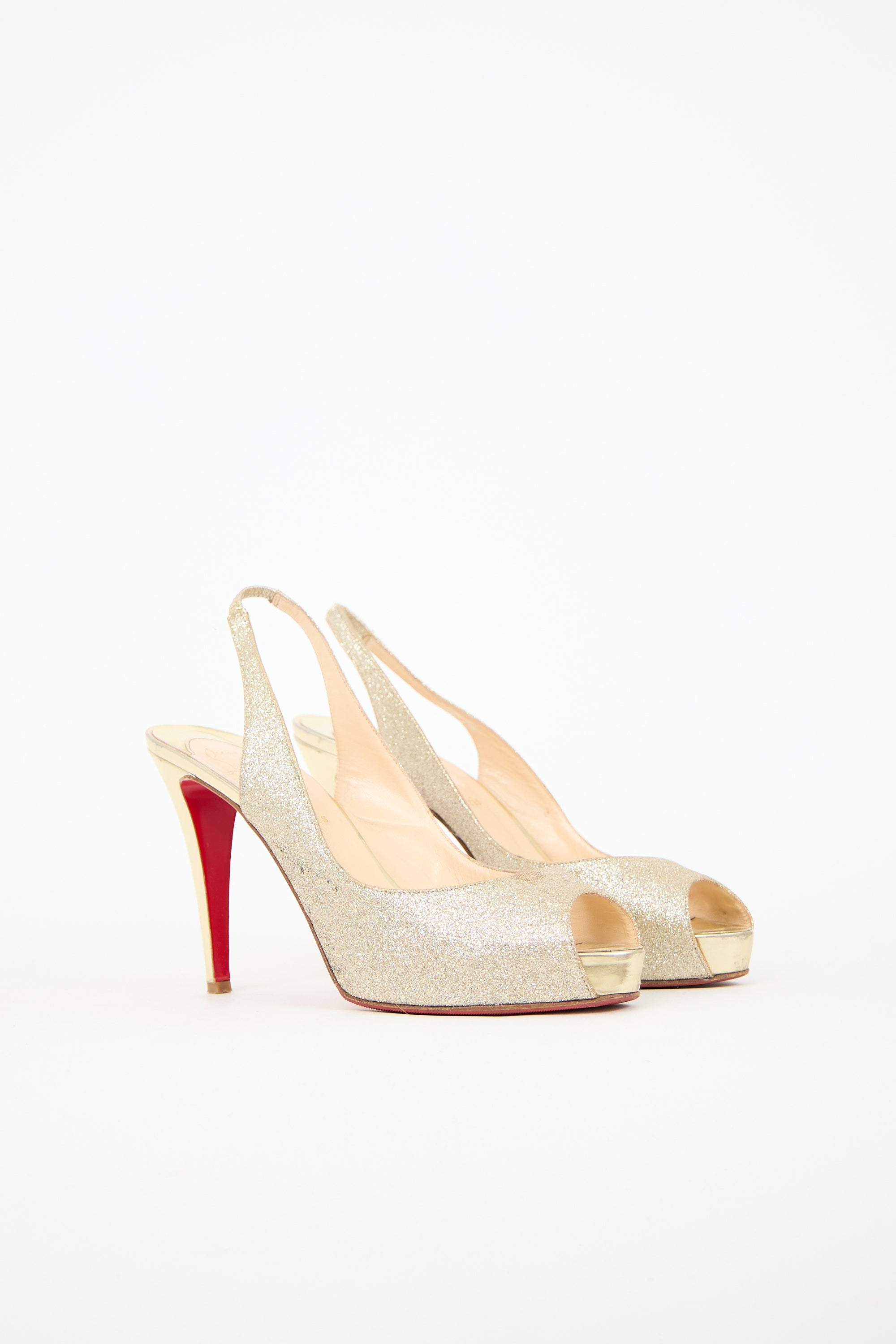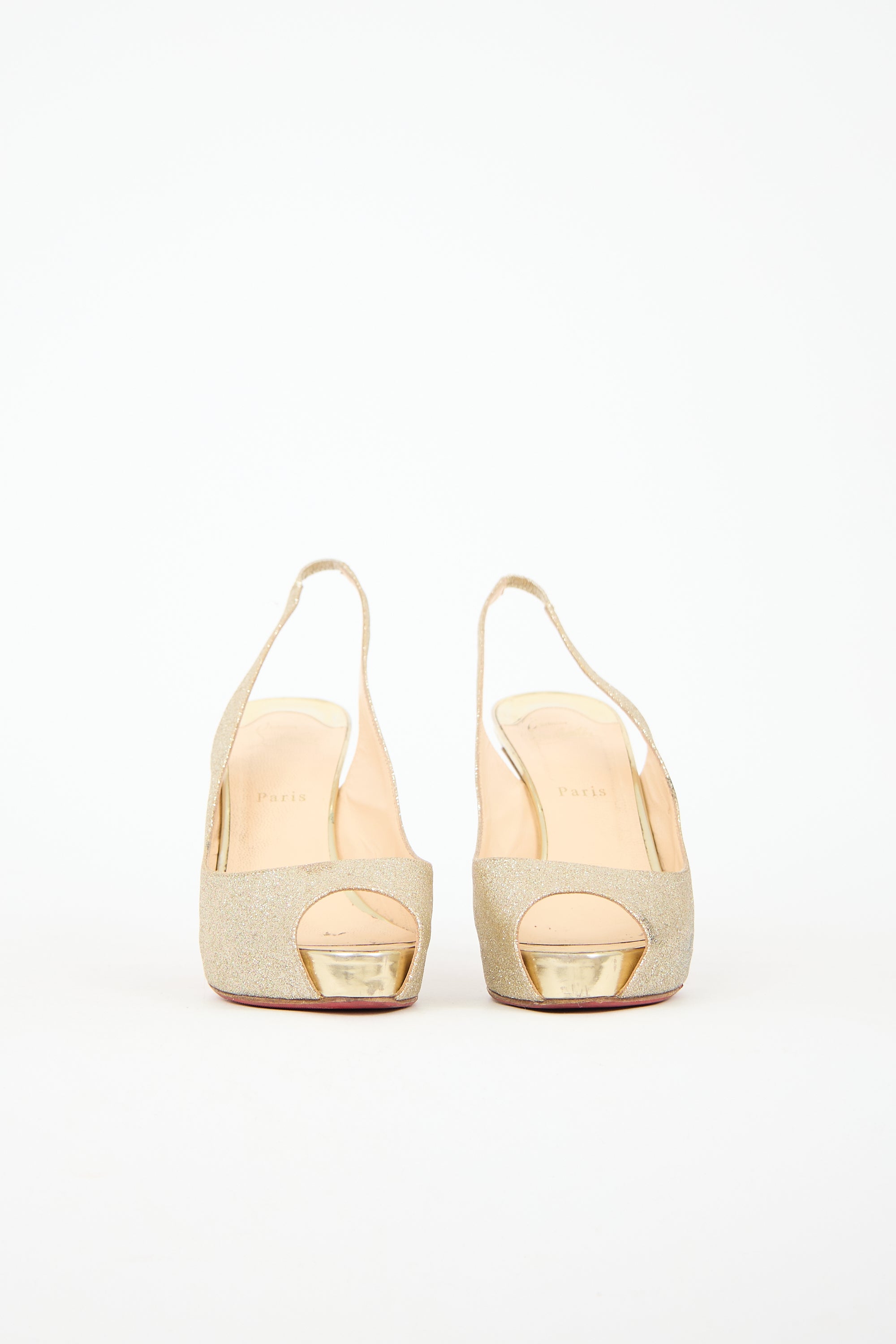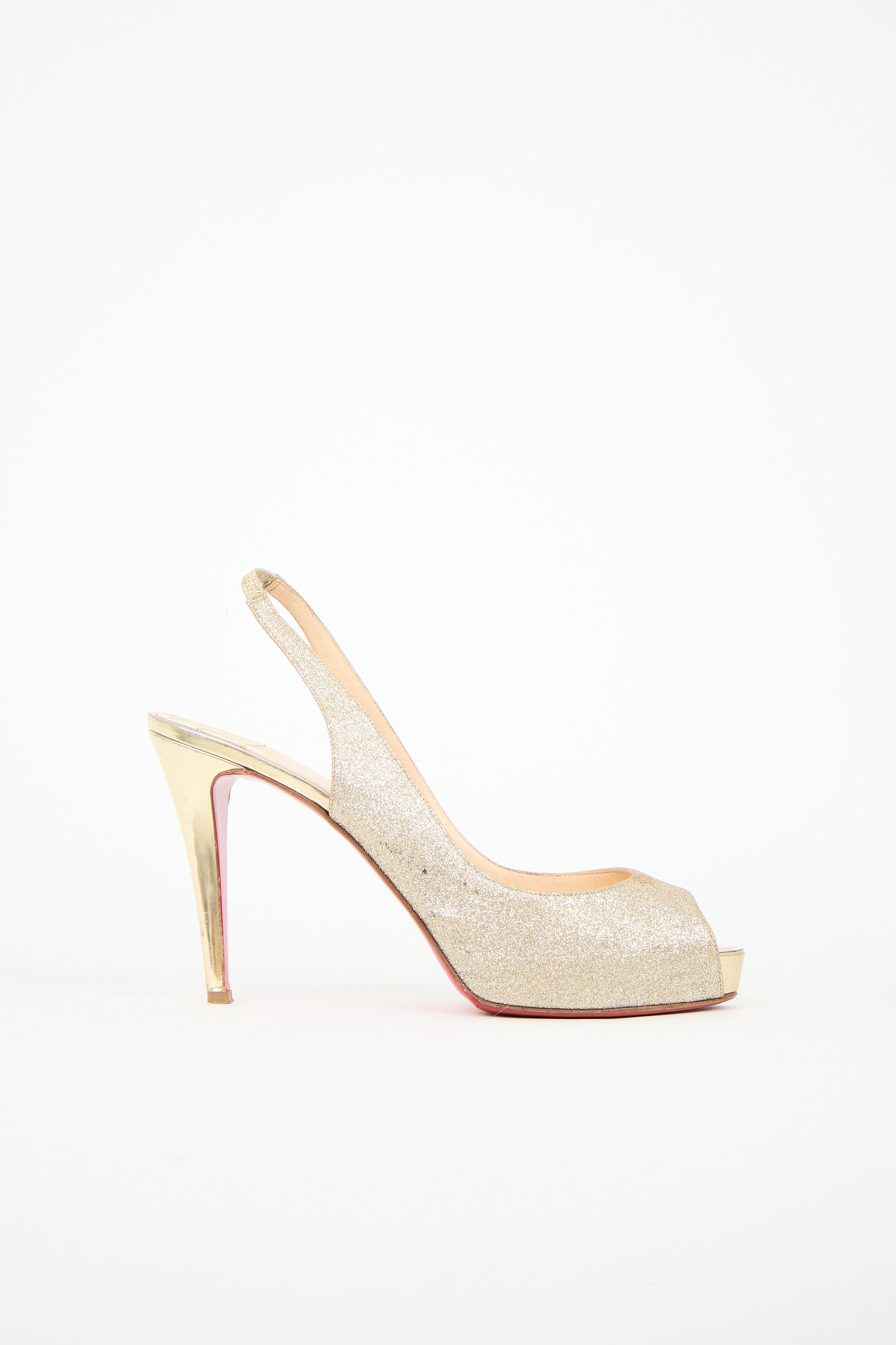 Pre-owned Christian Louboutin gold tone No Prive heels featuring almond peep toe, elasticized slingback strap, concealed platform, covered stiletto heel, and signature red lacquered outsole. Comes with extra set of heel tips.