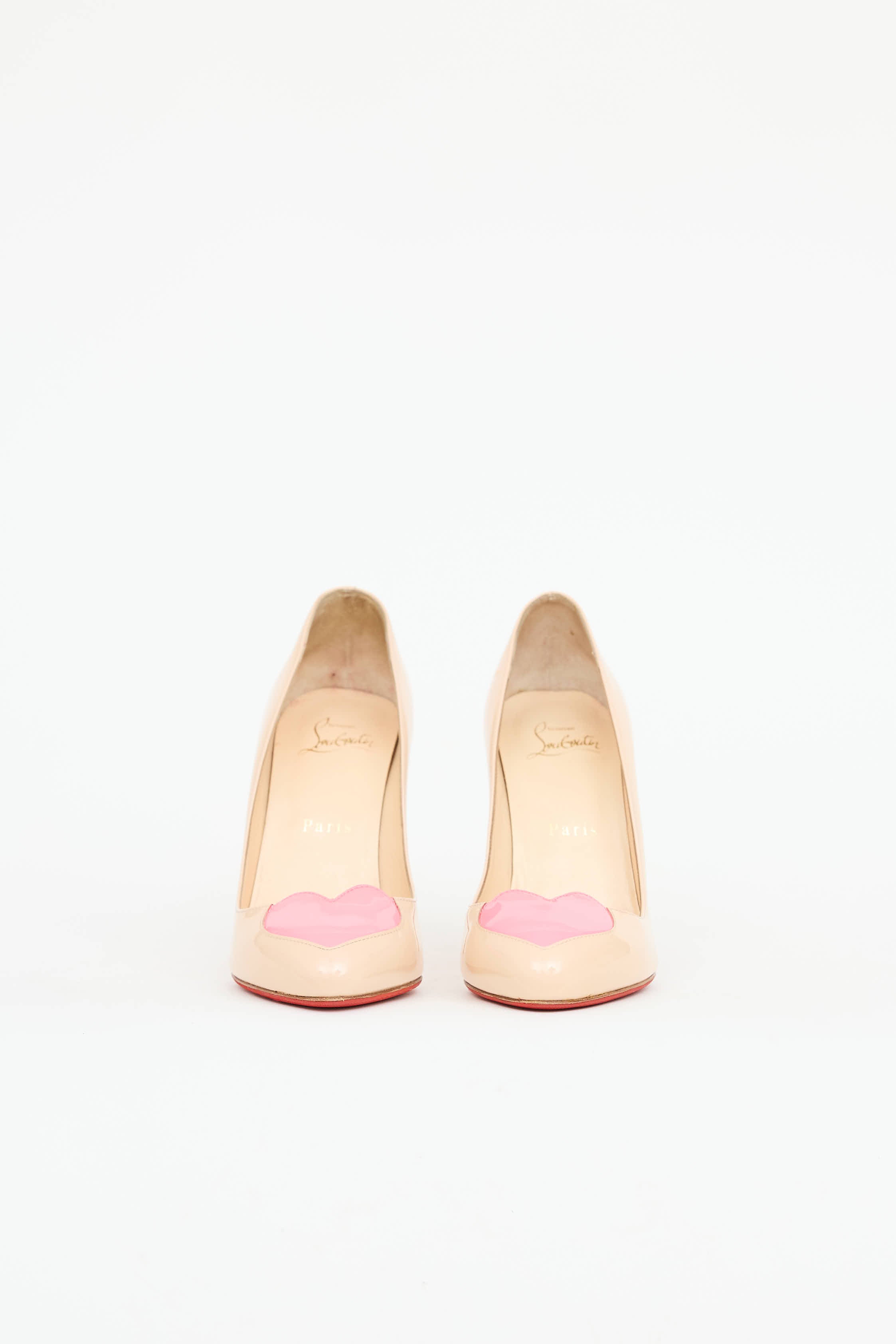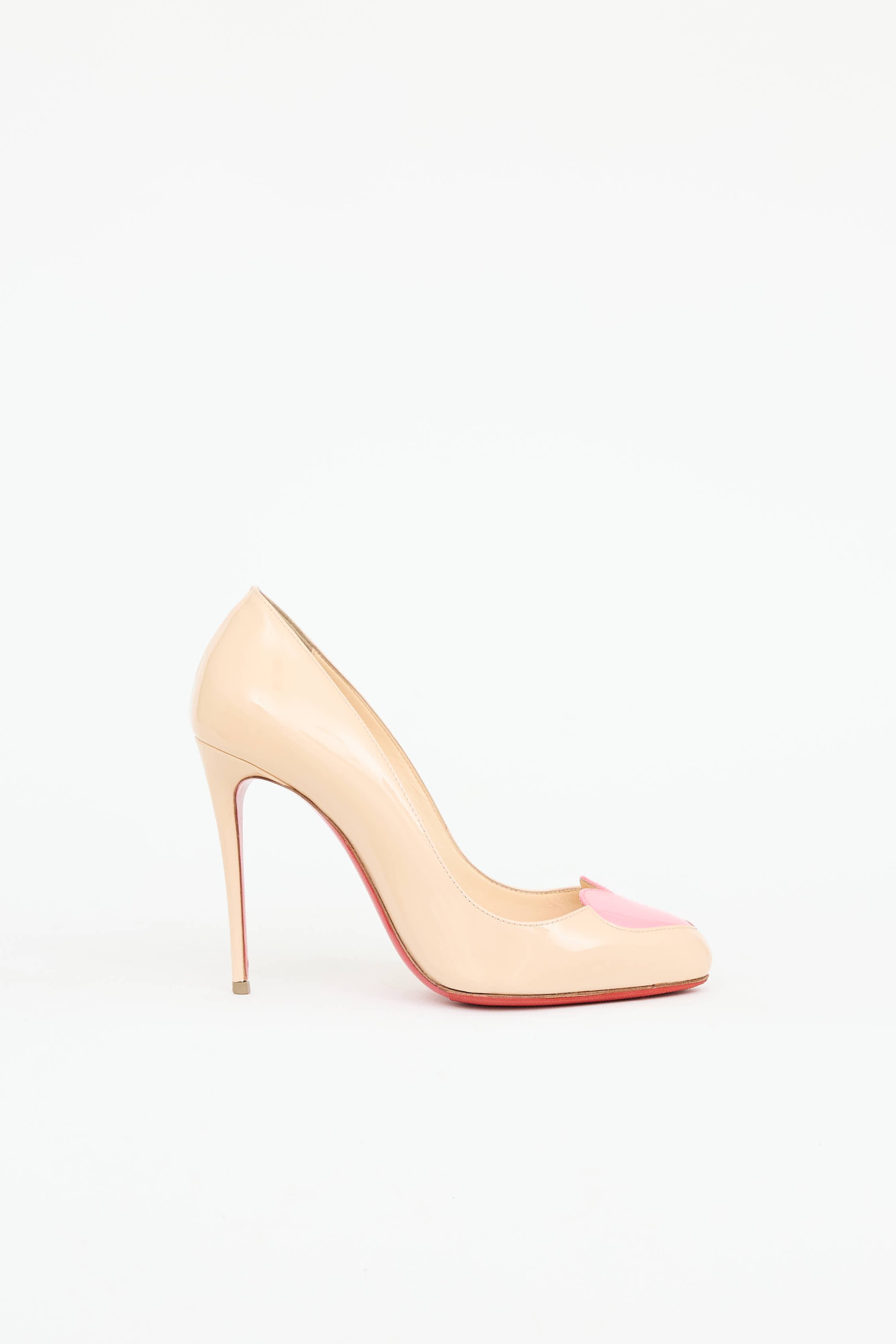 Pre-owned Christian Louboutin beige and pink patent pump featuring round toe, pink neon heart at vamp, covered heel, and signature red lacquered bottoms.