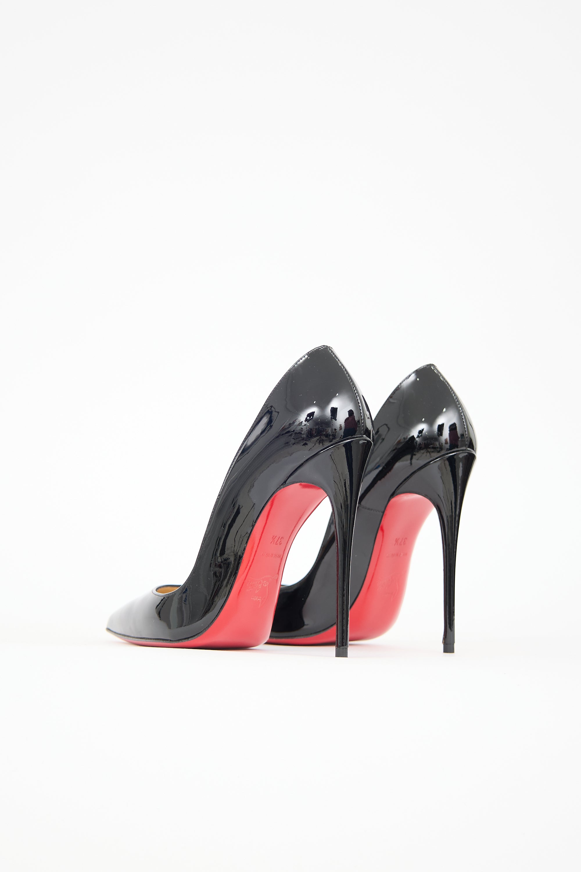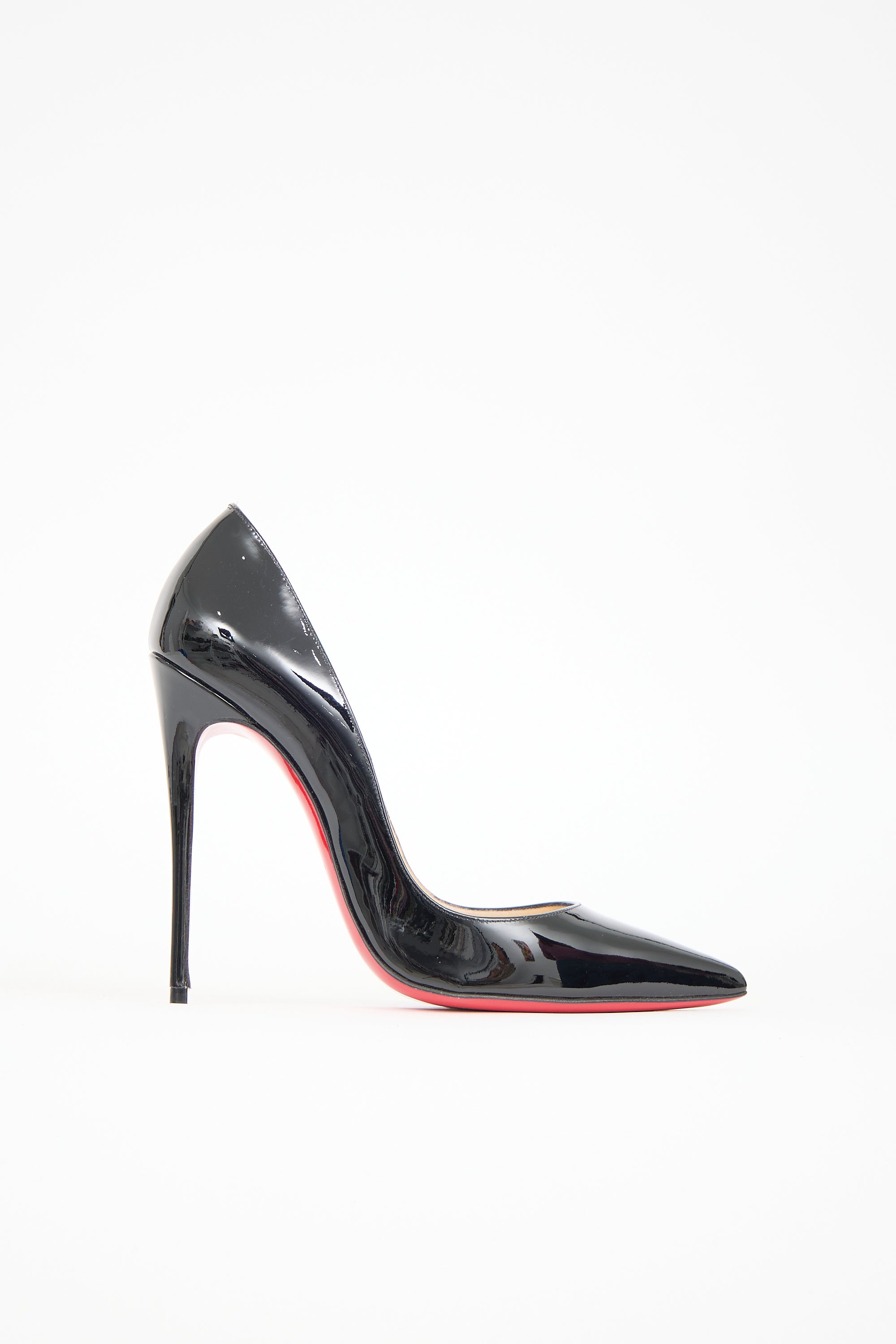 Pre-owned Christian Louboutin black patent So Kate pumps featuring pointed toe, covered stiletto heel, and signature red lacquered outsole. Comes with original box.