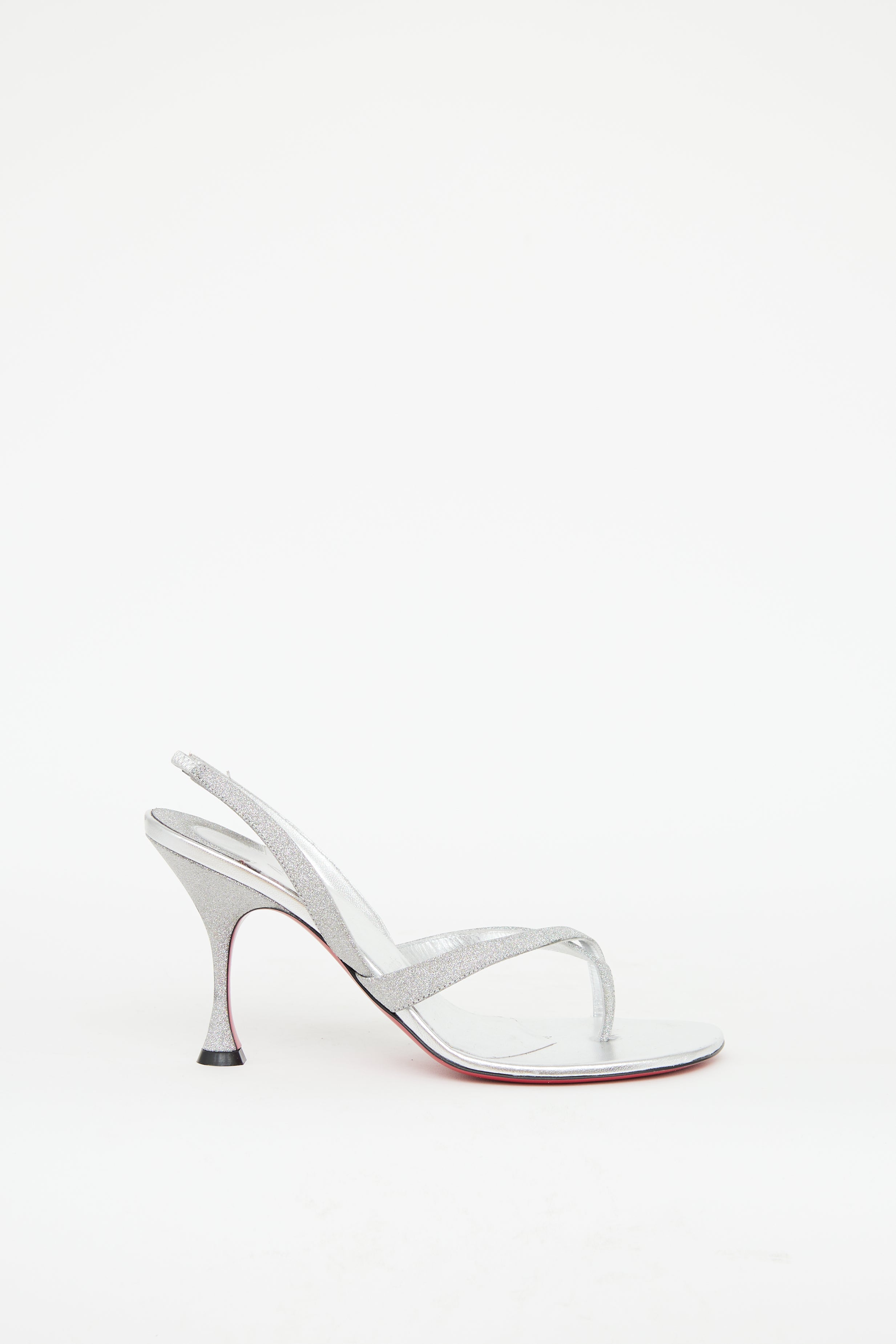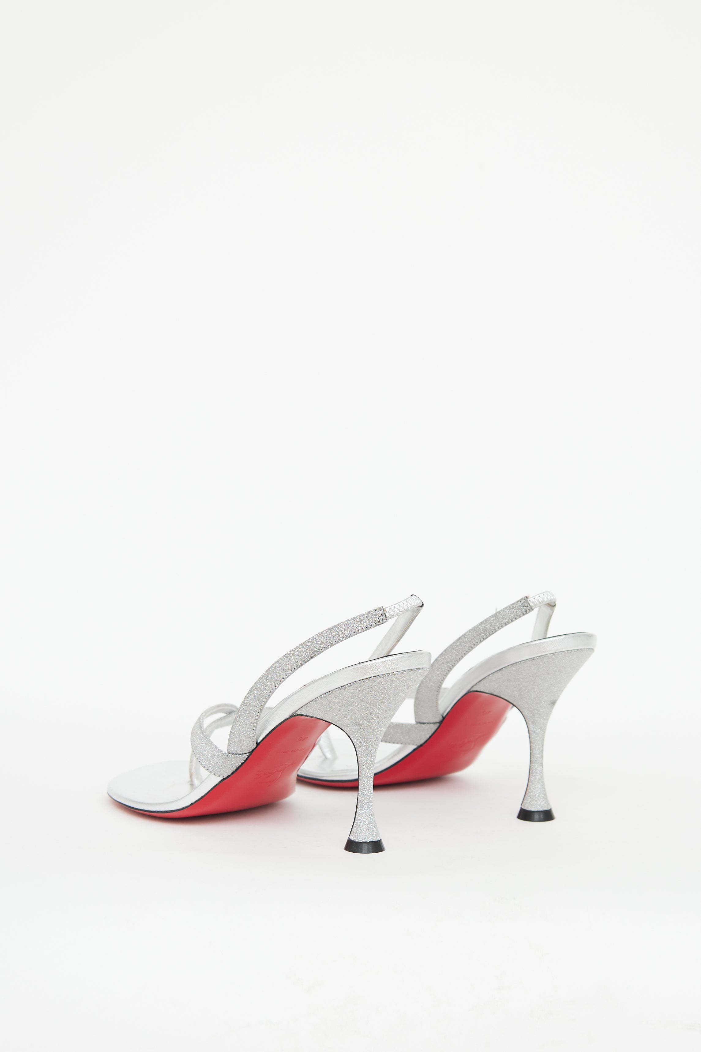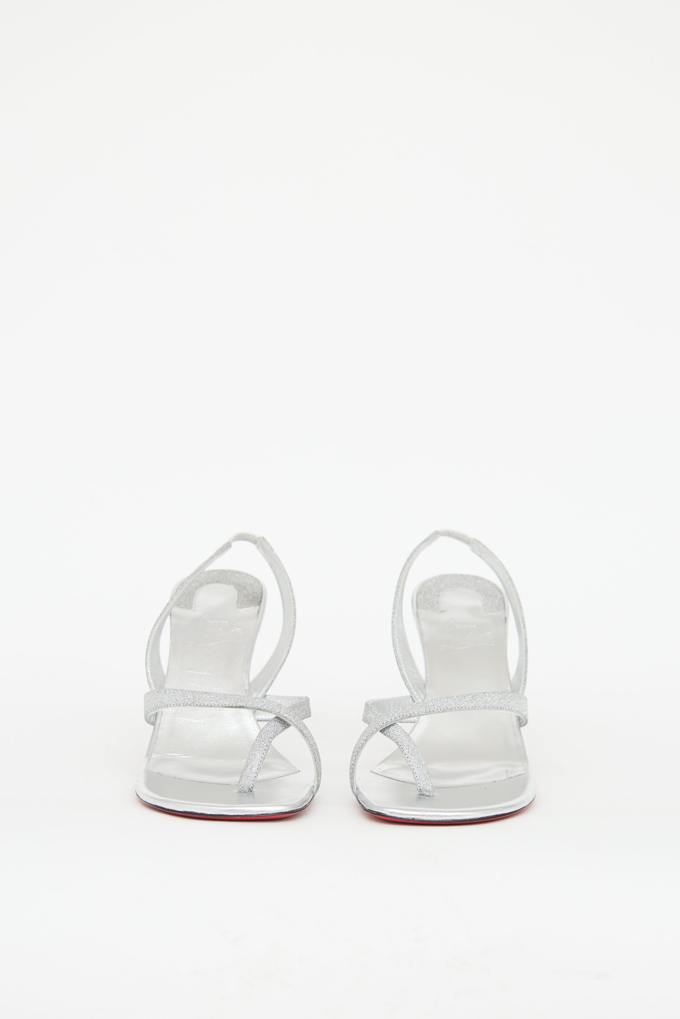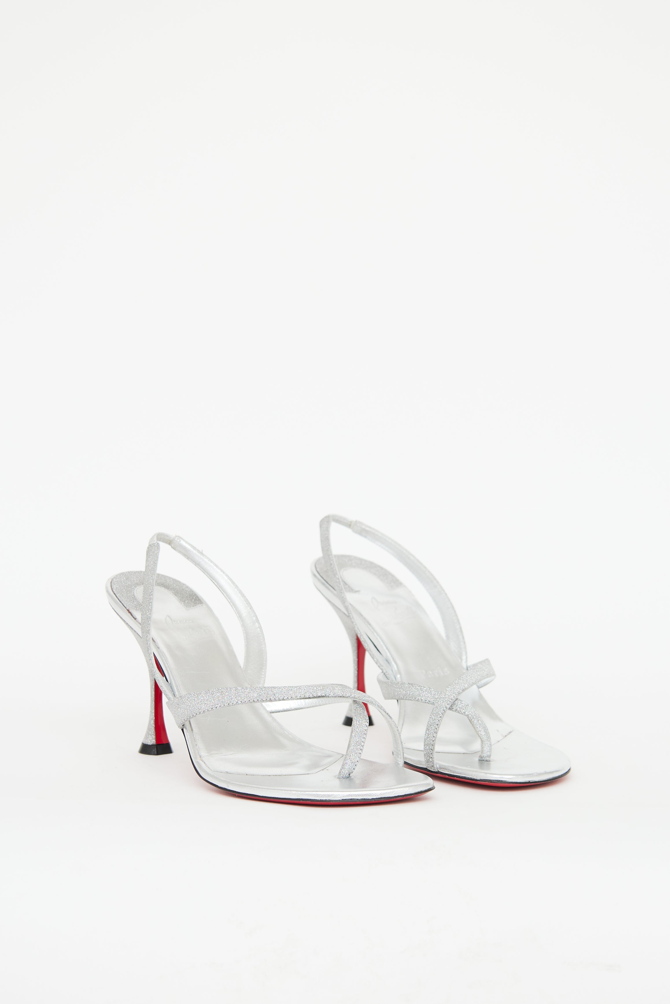 Pre-owned Christian Louboutin silver tone Taralita sandals featuring square open toe, criss cross strap with glitter finish at upper, slingback strap and covered heel with signature red bottom outsole.