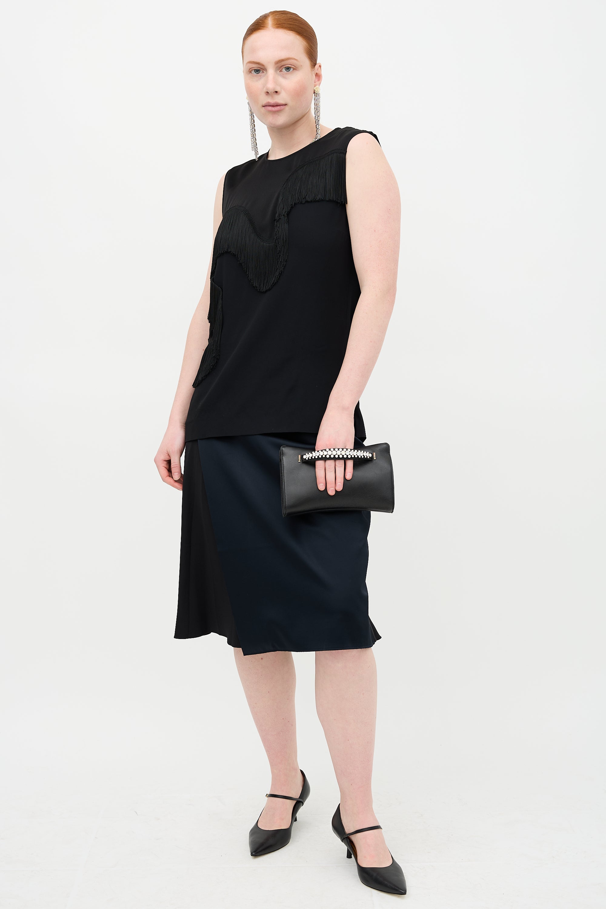 Pre-owned Jimmy Choo black leather Venus Crystal clutch featuring a crystal embellished wrist strap, snap closure, one lined main compartment with slip pocket, and detachable gold tone shoulder chain.