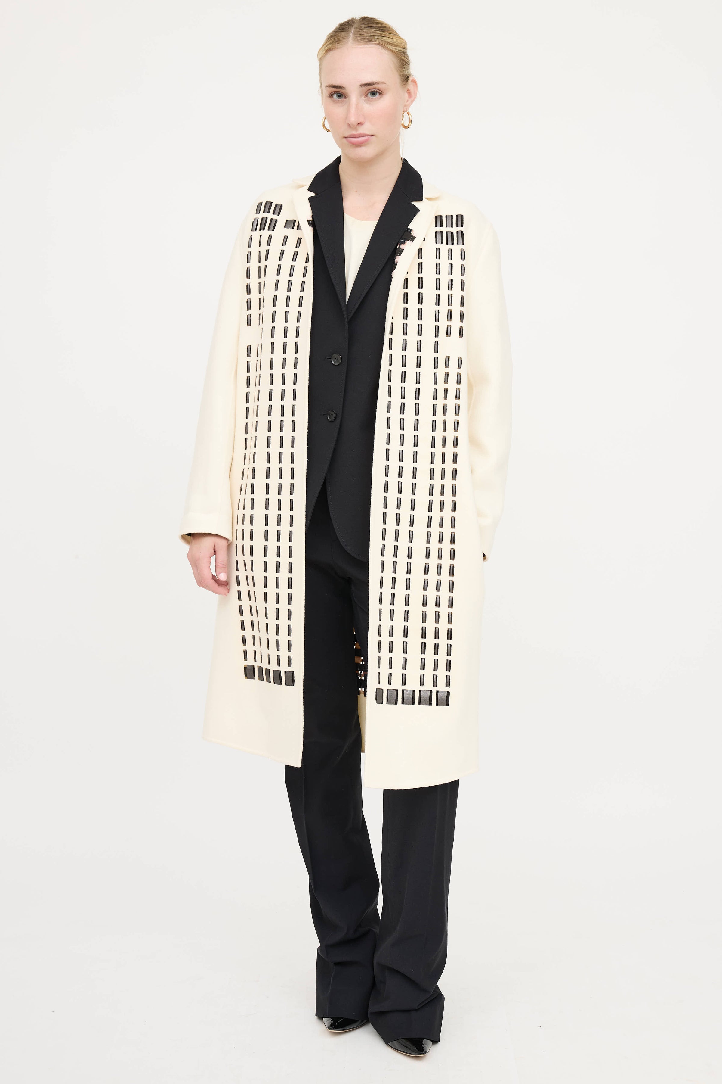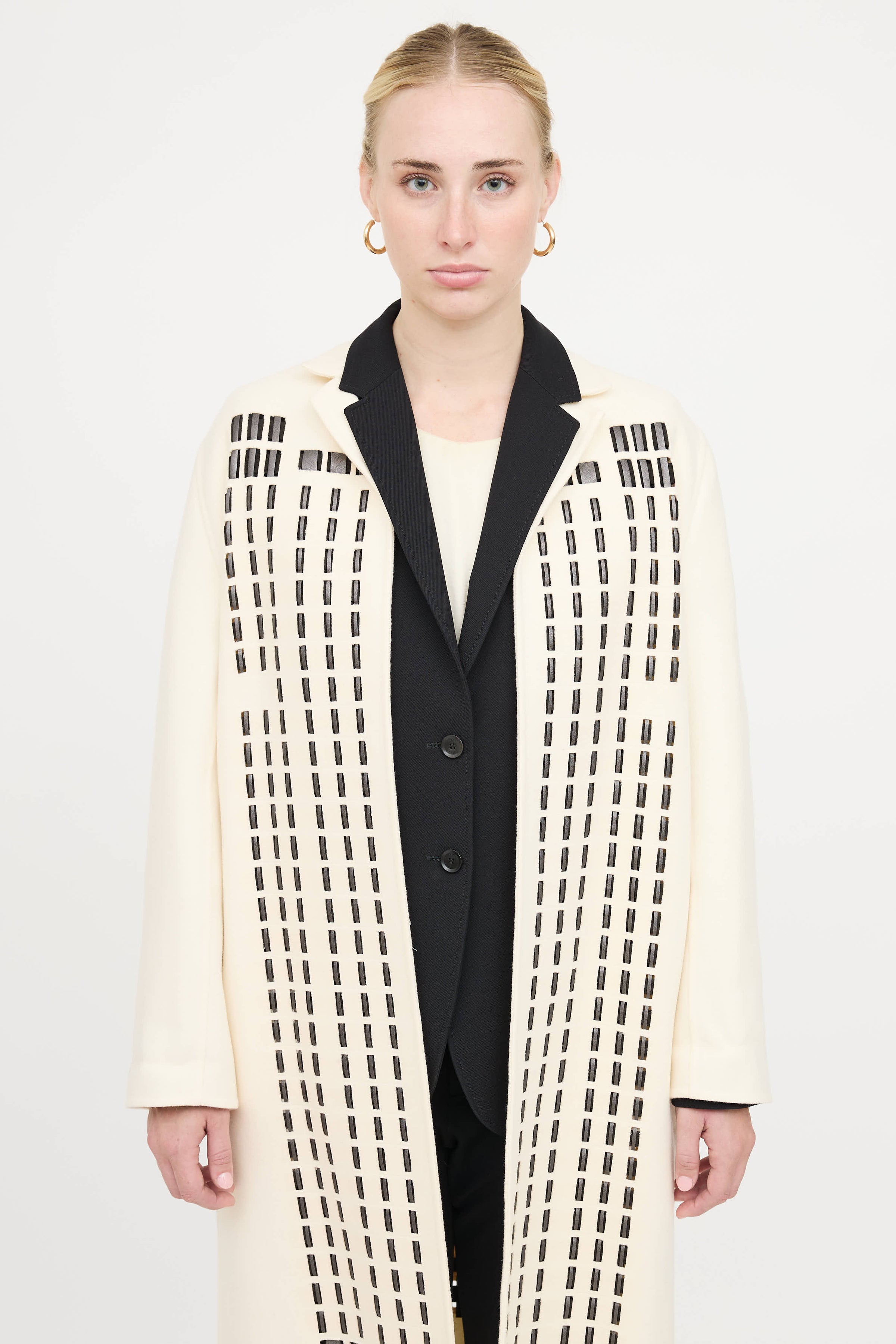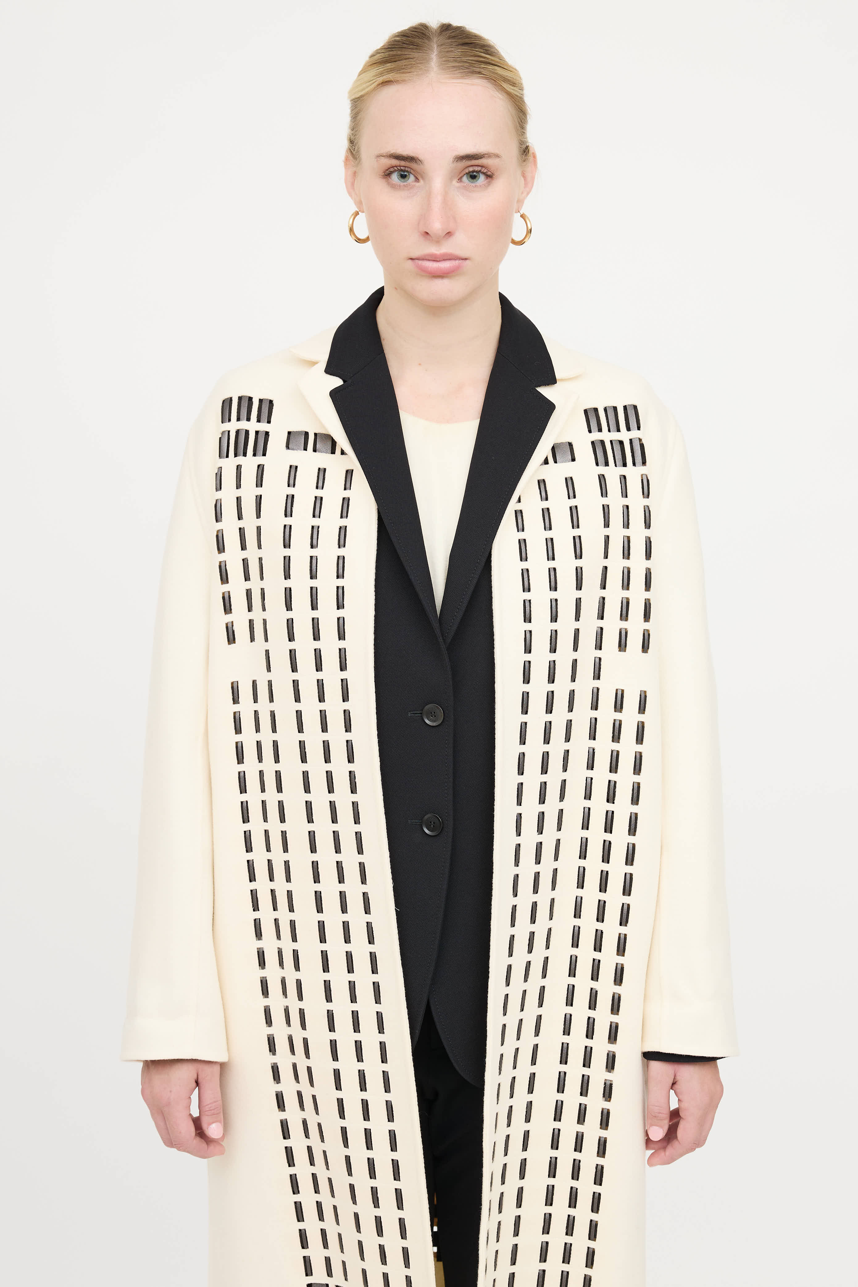 Pre-owned Akris cream and black long sleeve coat featuring notched lapel collar, open front, woven cutout detailing, and slits at hem and cuffs.