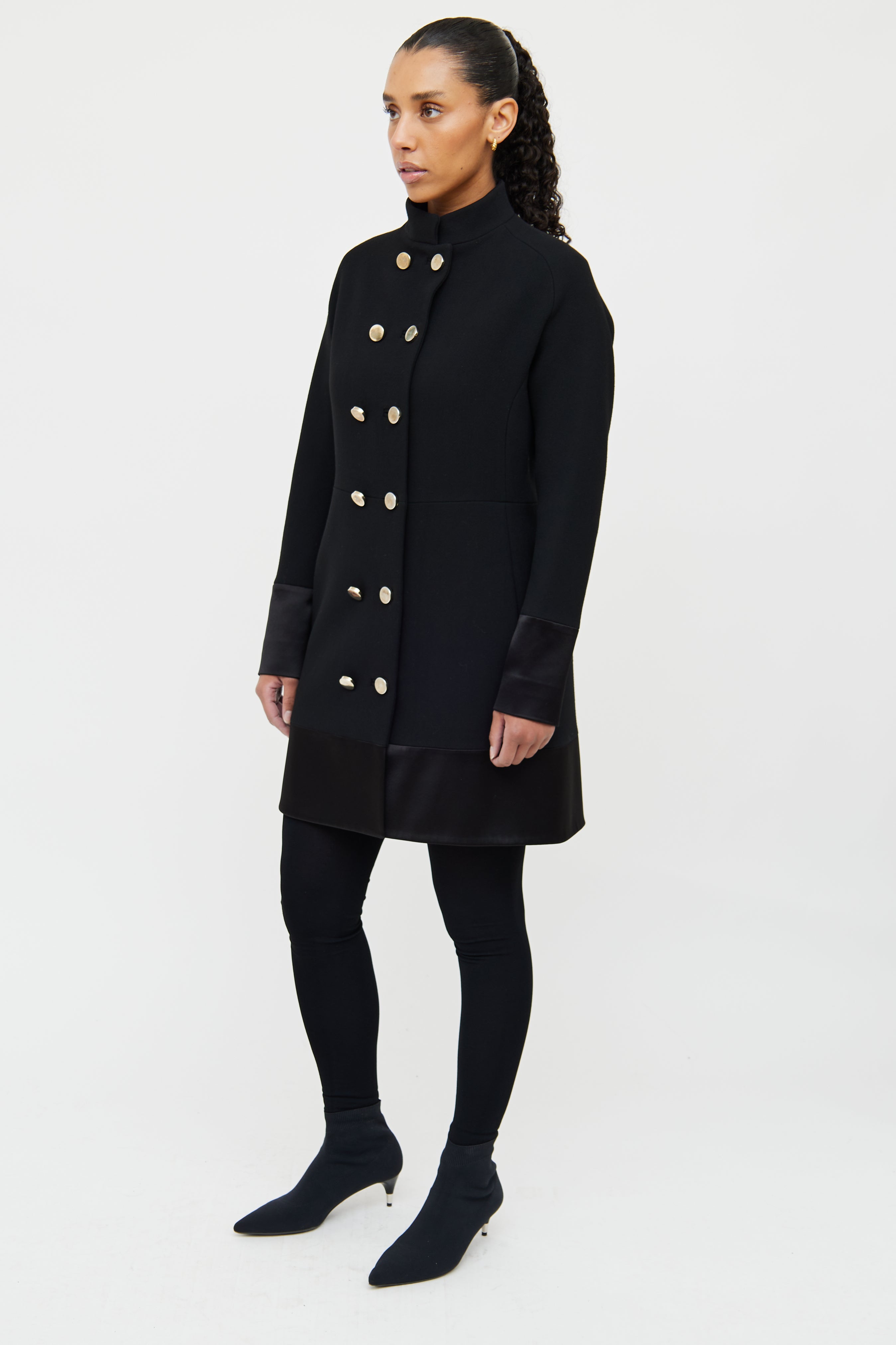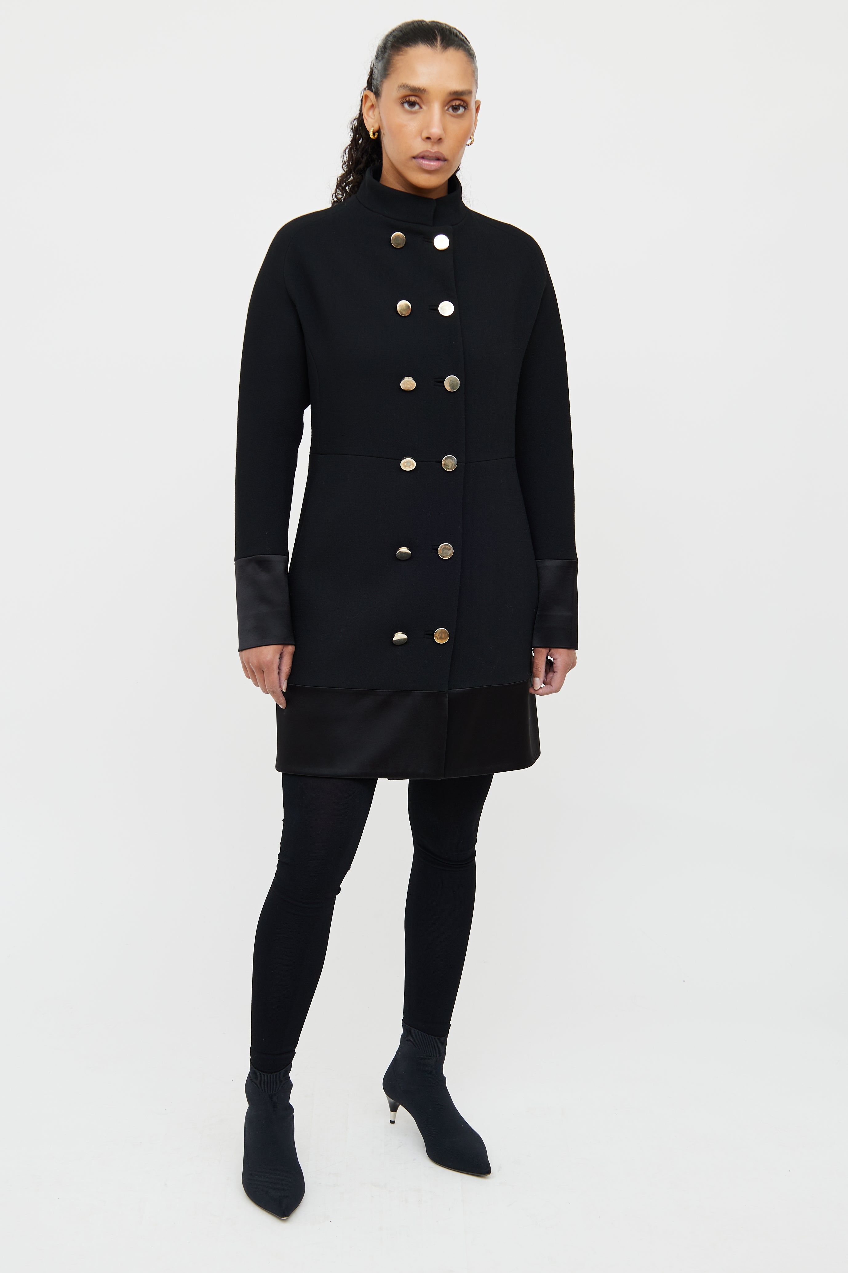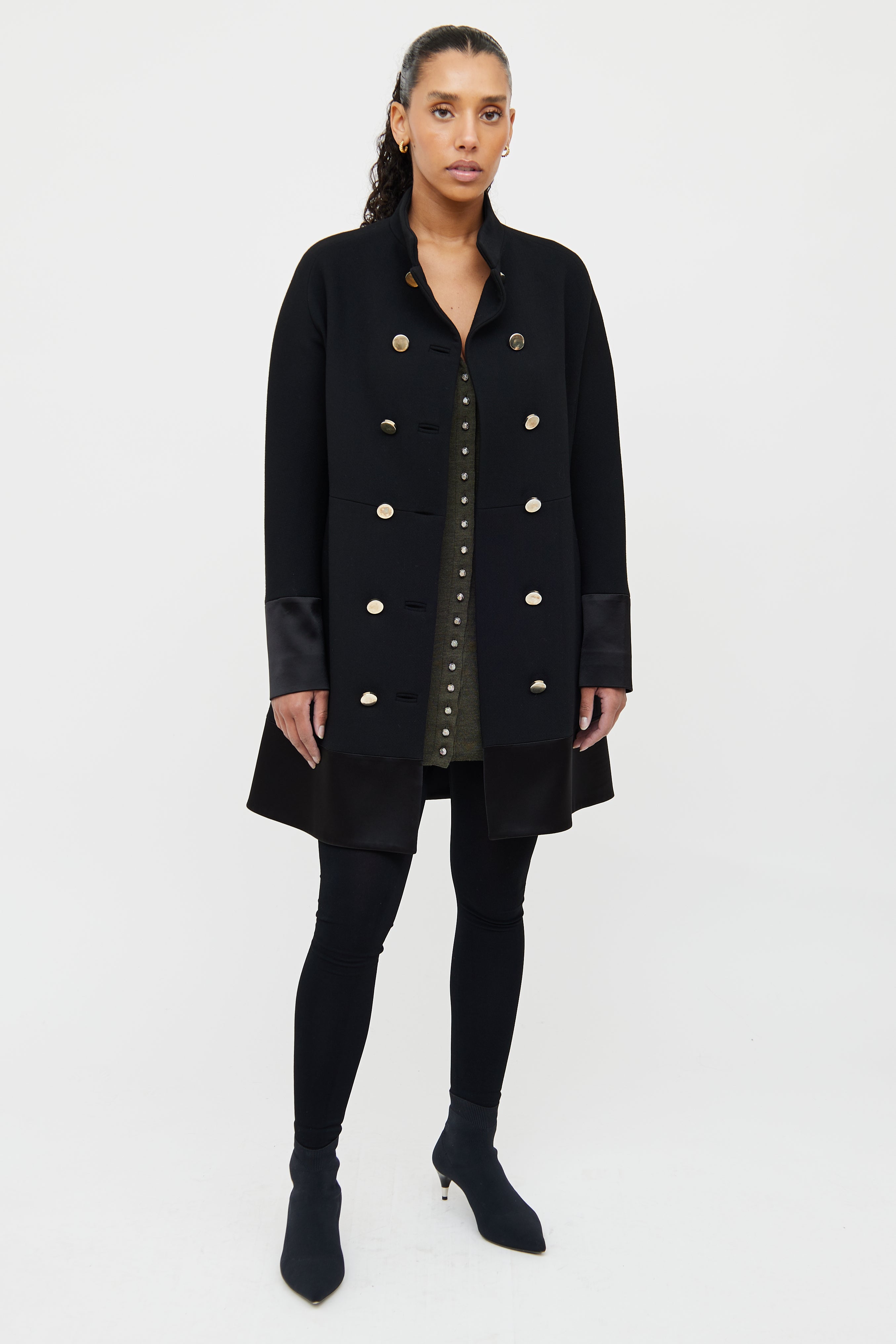 Pre-owned Balenciaga black wool coat featuring double breasted closure with gold tone buttons, silk panel at bottom, two in seam pockets, full length sleeves and stand collar. Lined.