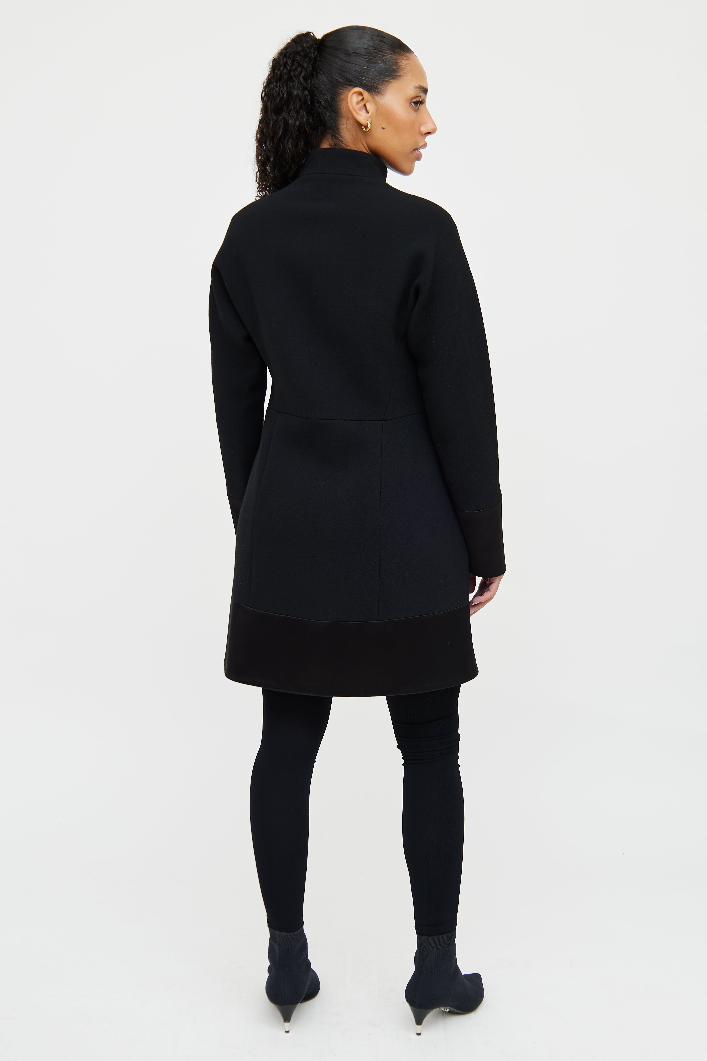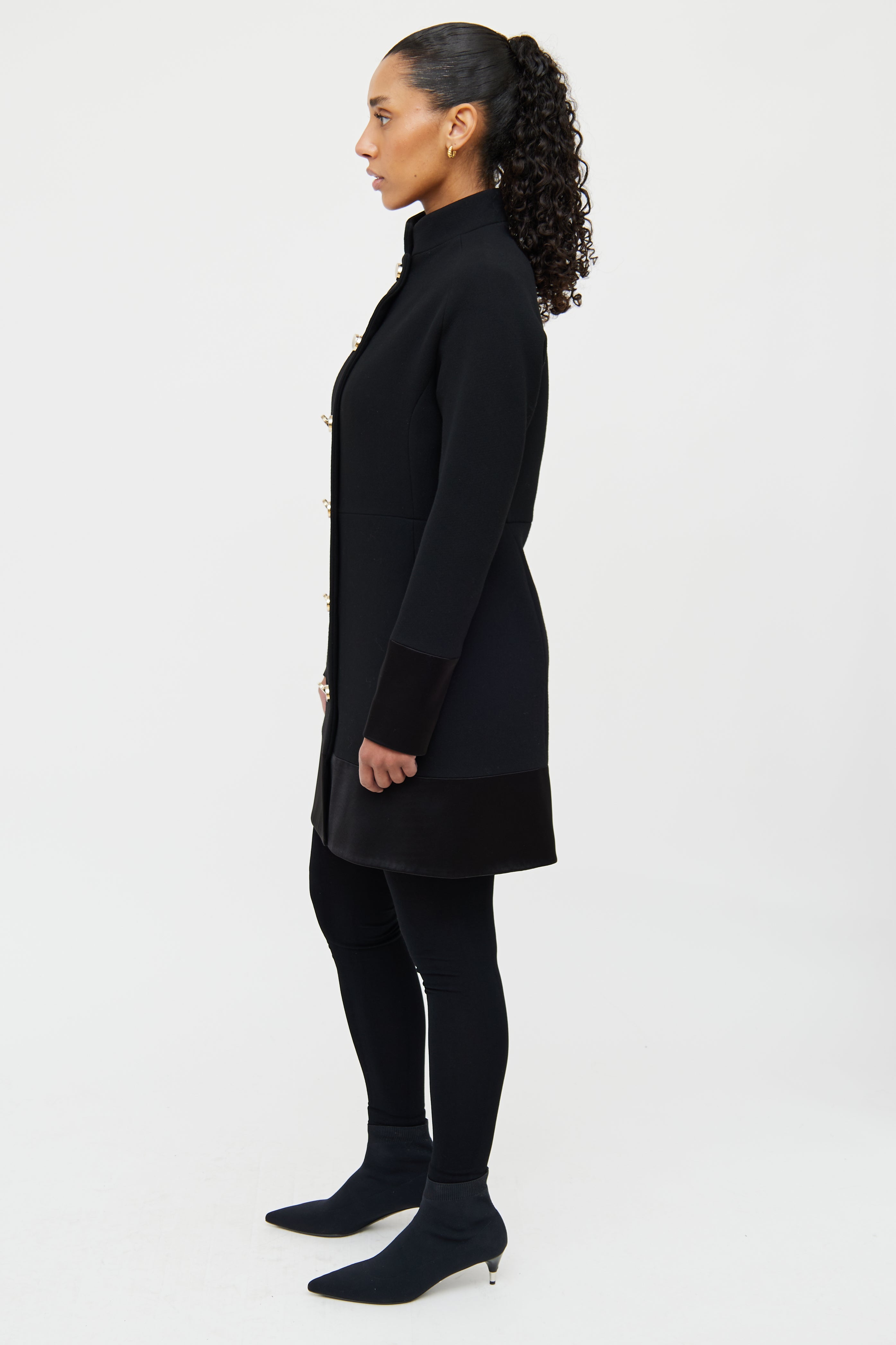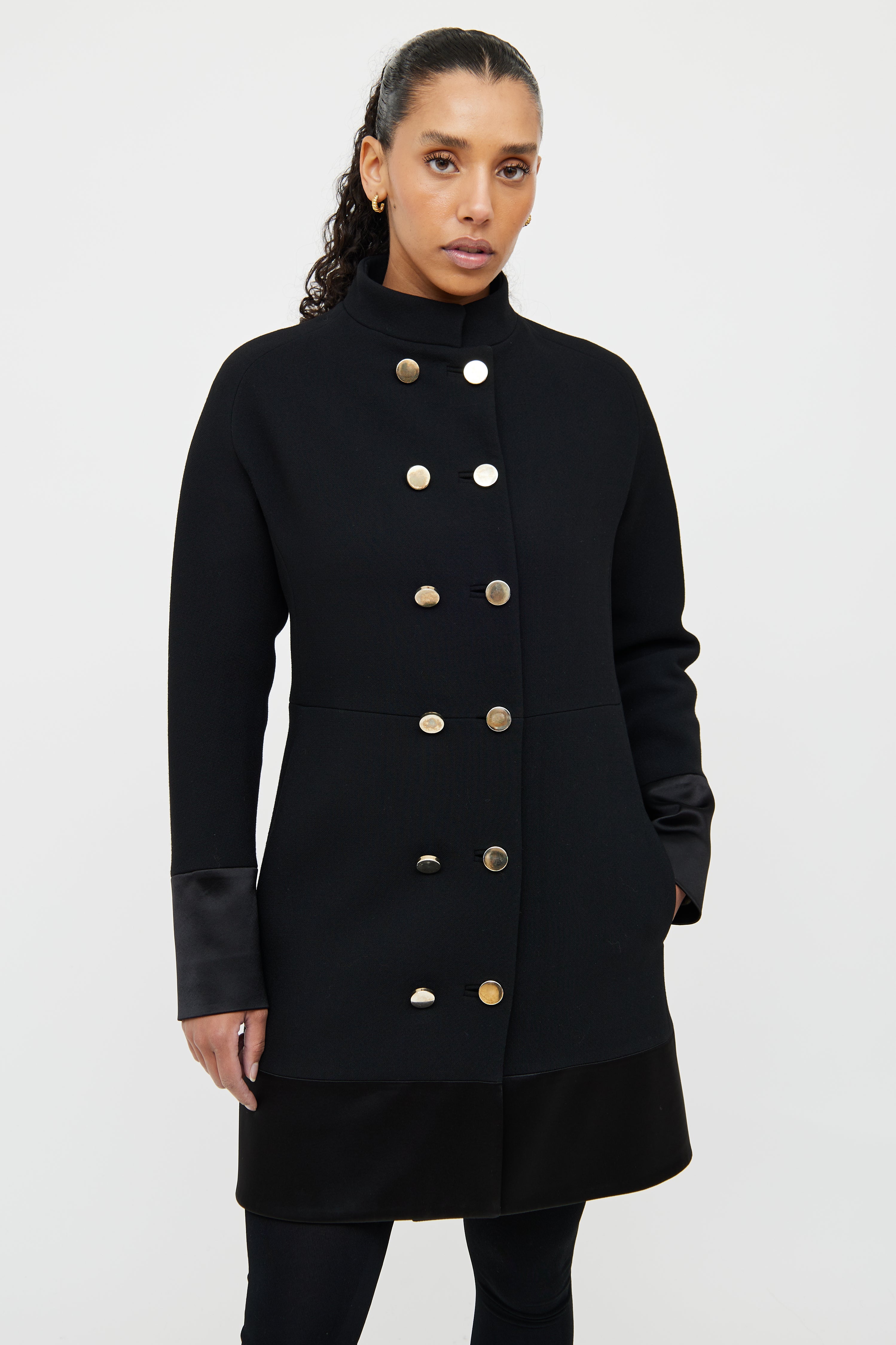 Pre-owned Balenciaga black wool coat featuring double breasted closure with gold tone buttons, silk panel at bottom, two in seam pockets, full length sleeves and stand collar. Lined.