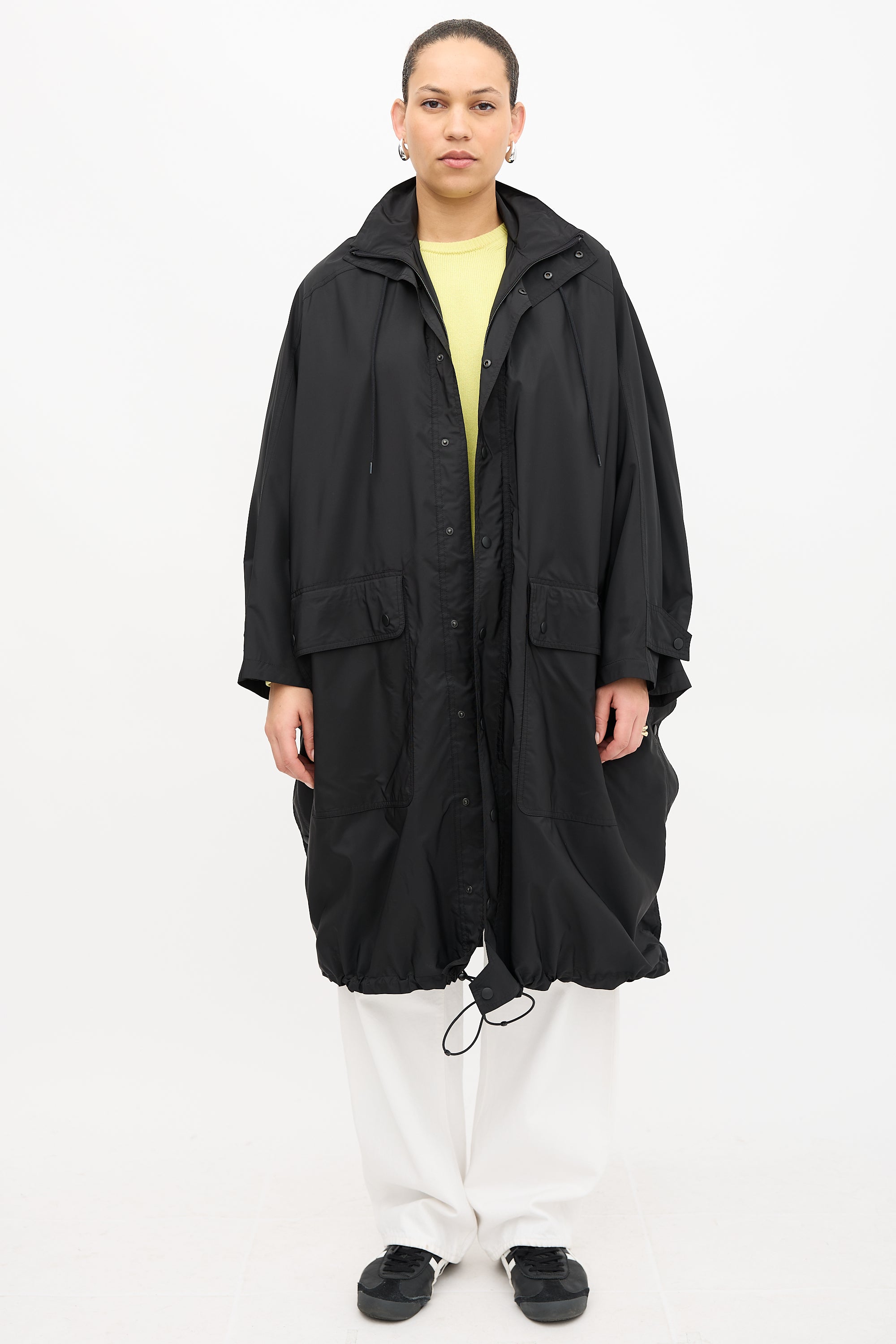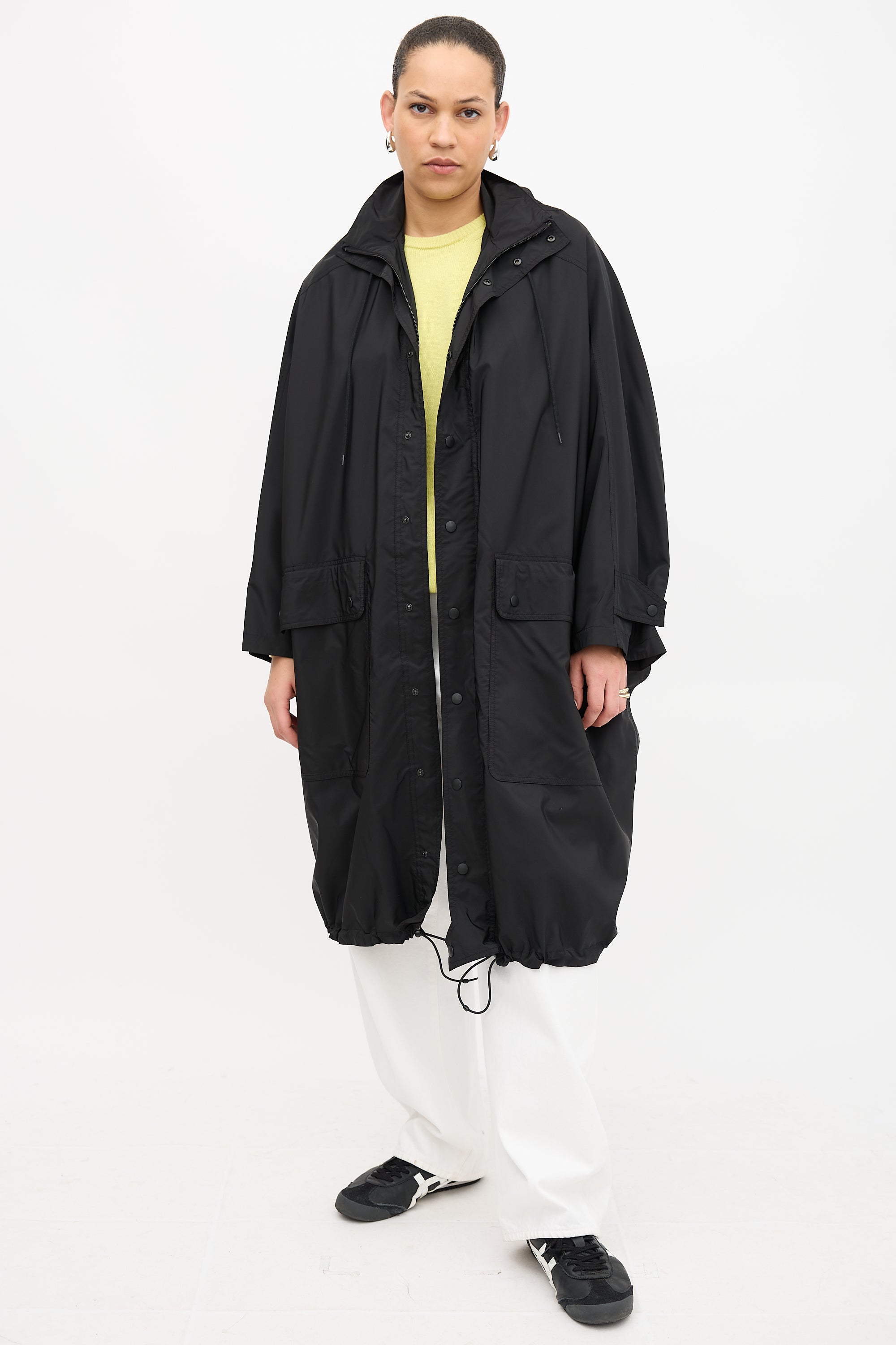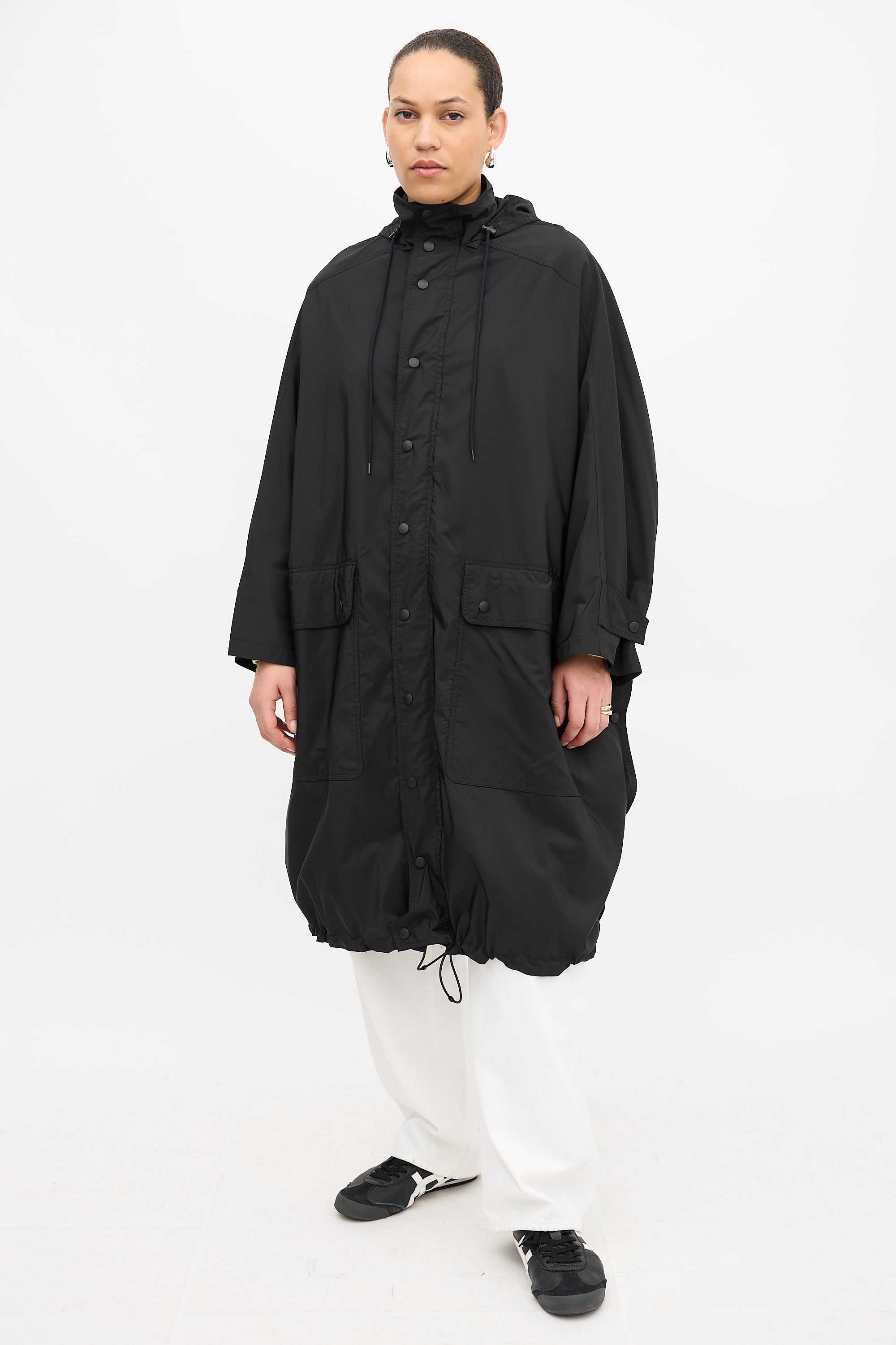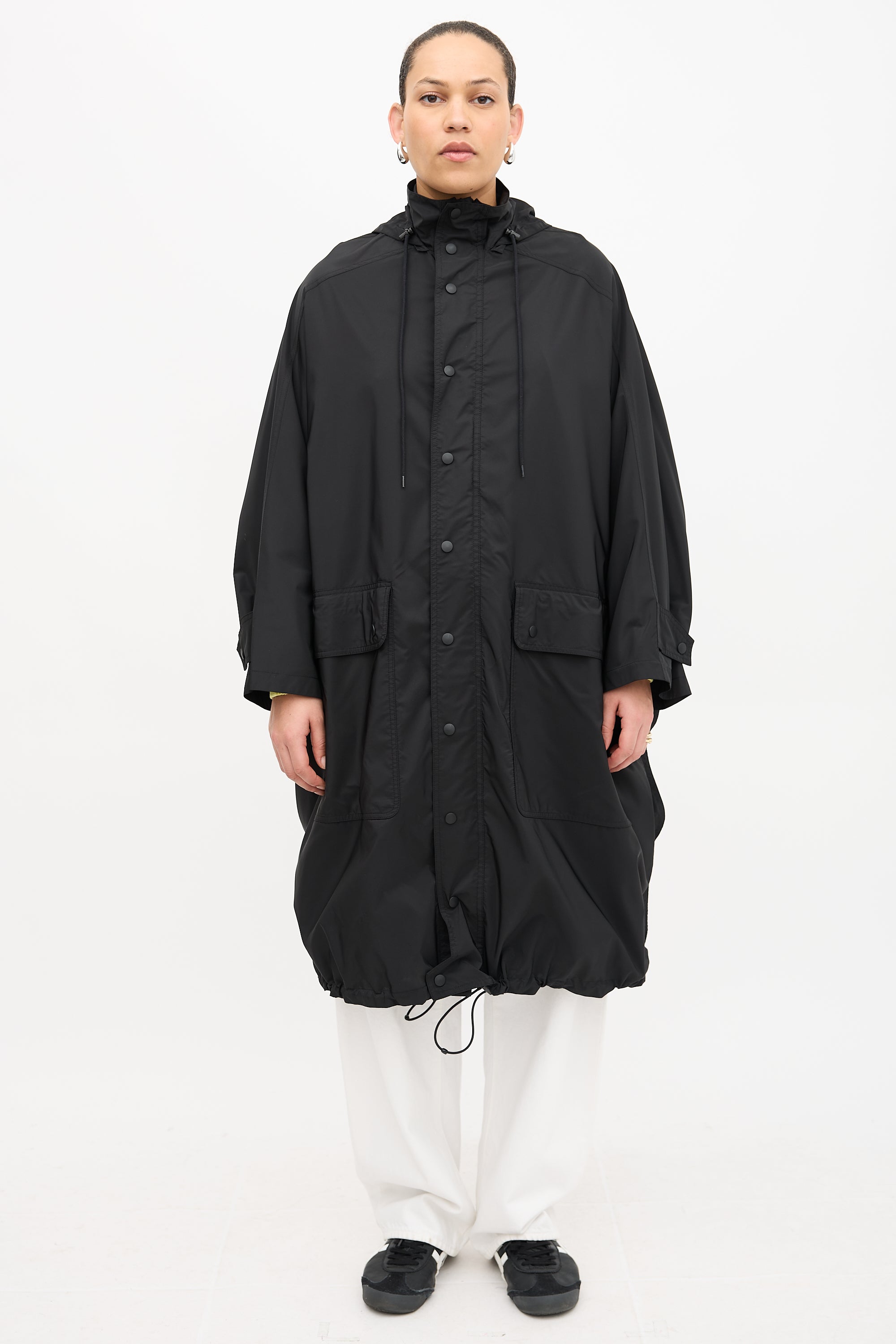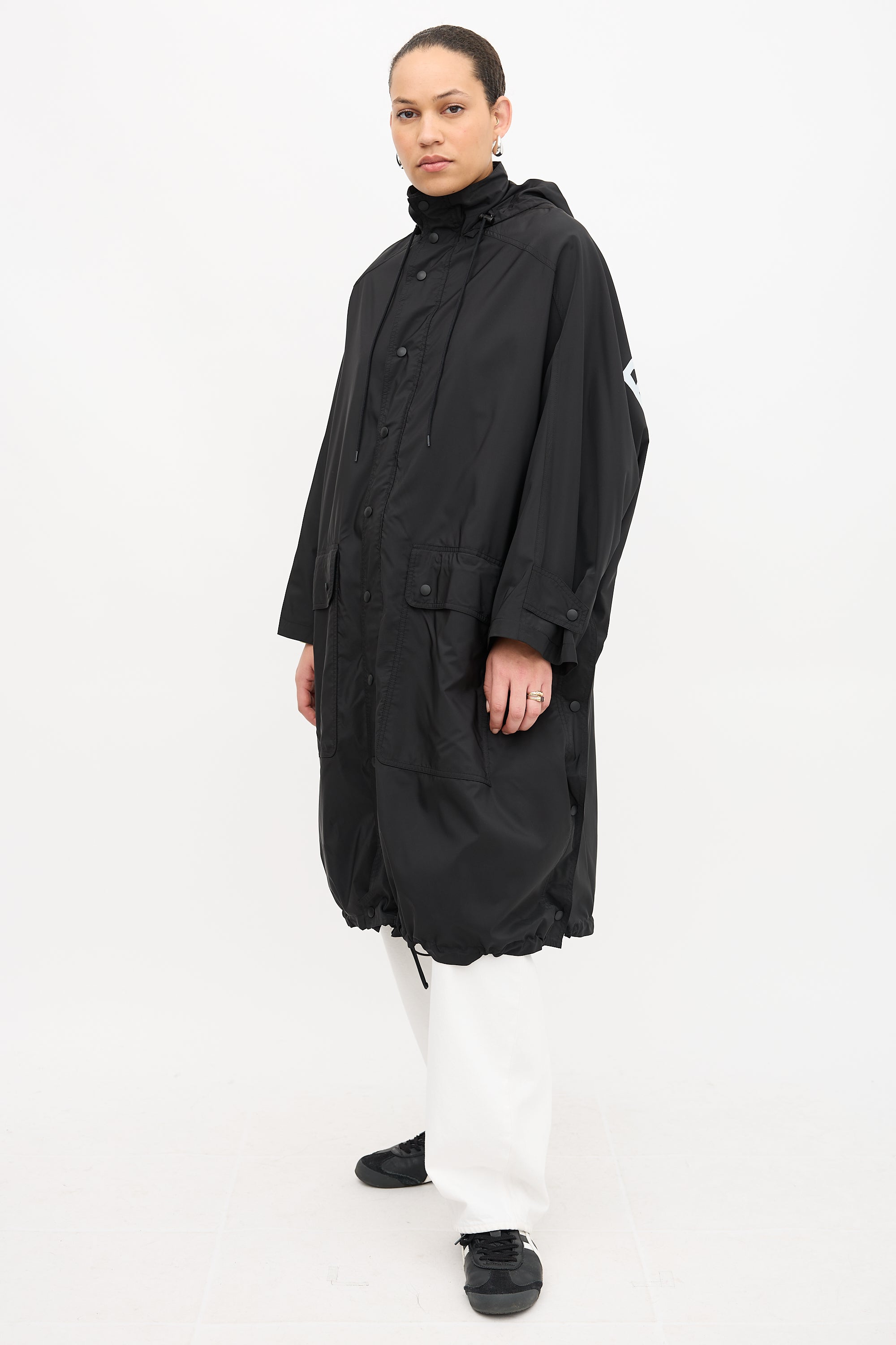 Pre-owned Balenciaga black parka featuring stand collar, toggle drawcord hood, two way front zip closure, snap button placket, printed logo across back, two front flap pockets, drawcord hem, and snap buttoned side vents and cuffs. Lined.