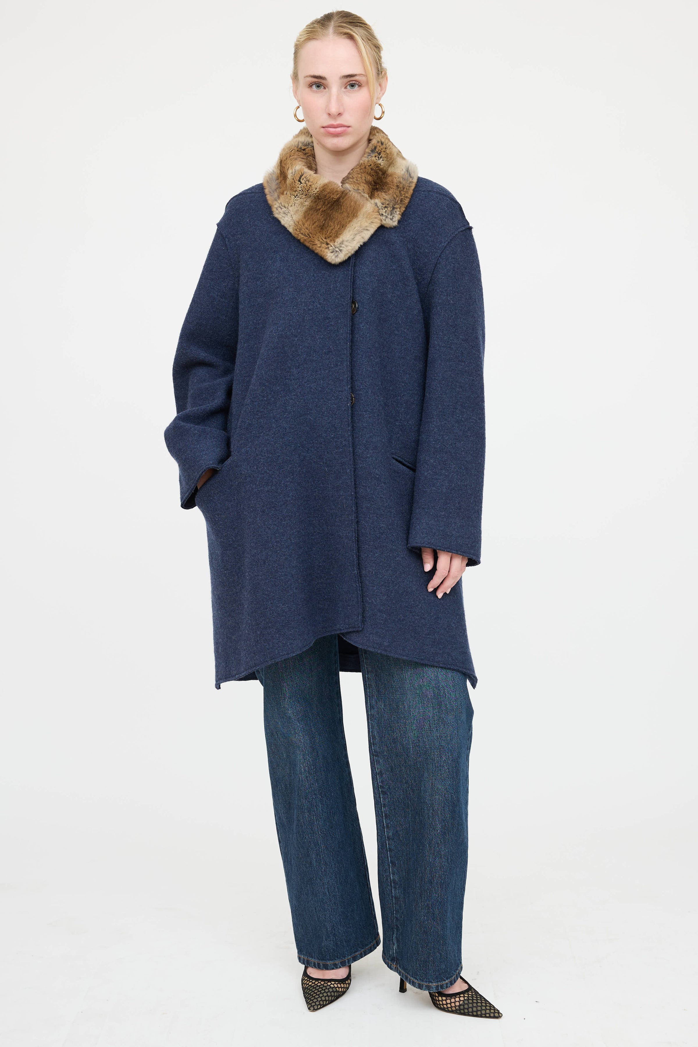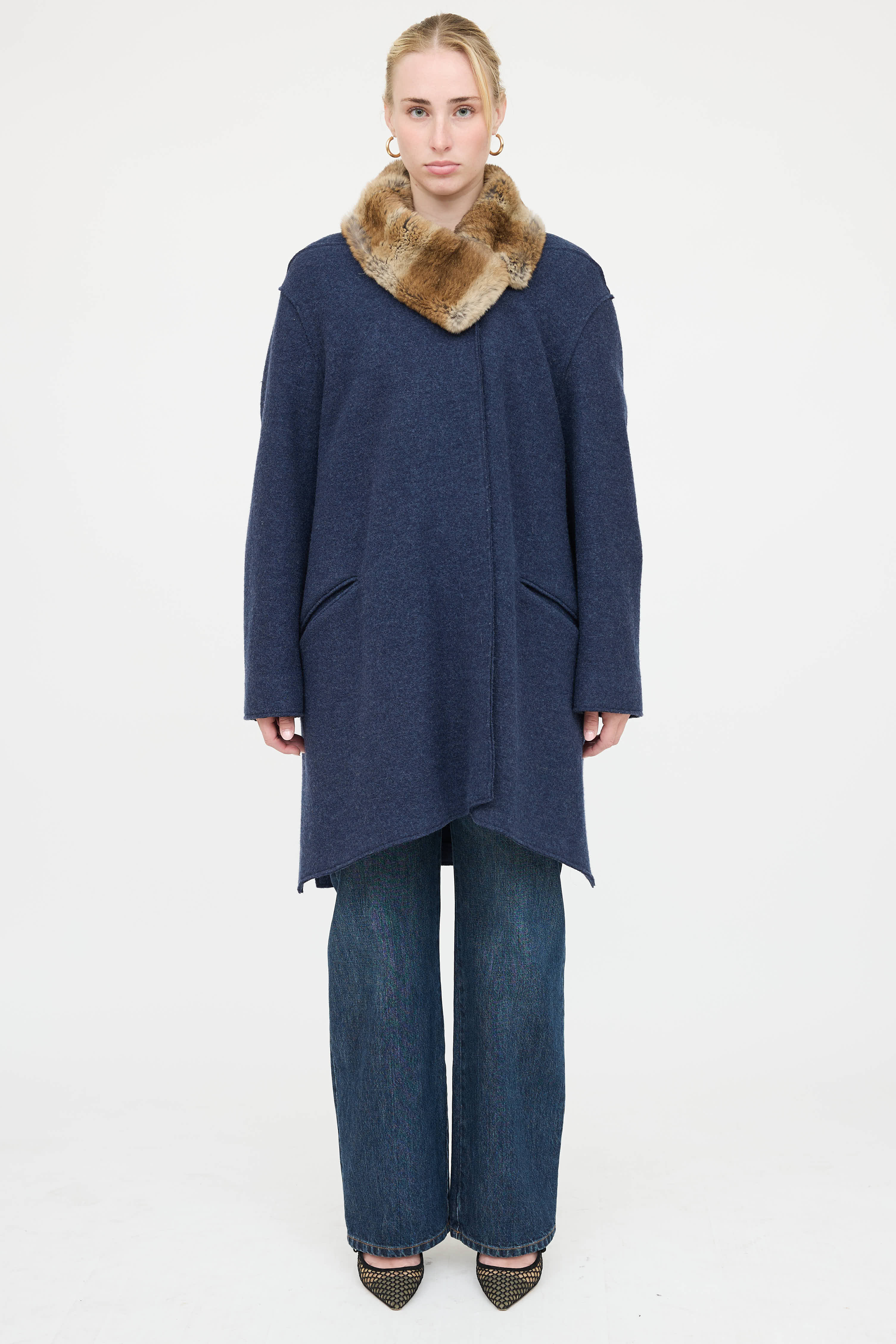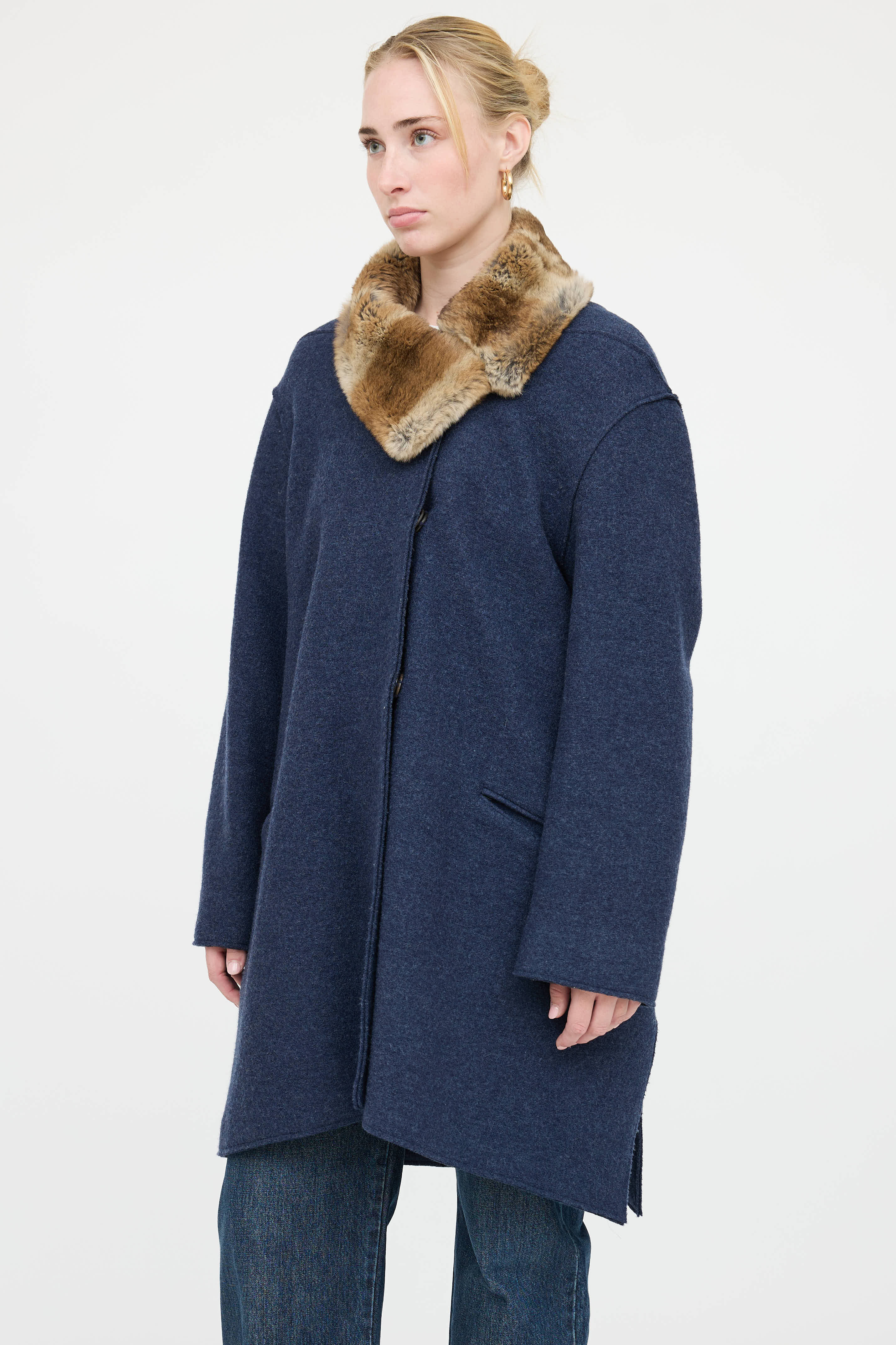 Pre-owned Blumarine blue long sleeve coat featuring round neckline, detachable fur collar, snap button front, slit pockets at front, and slits at hem.
