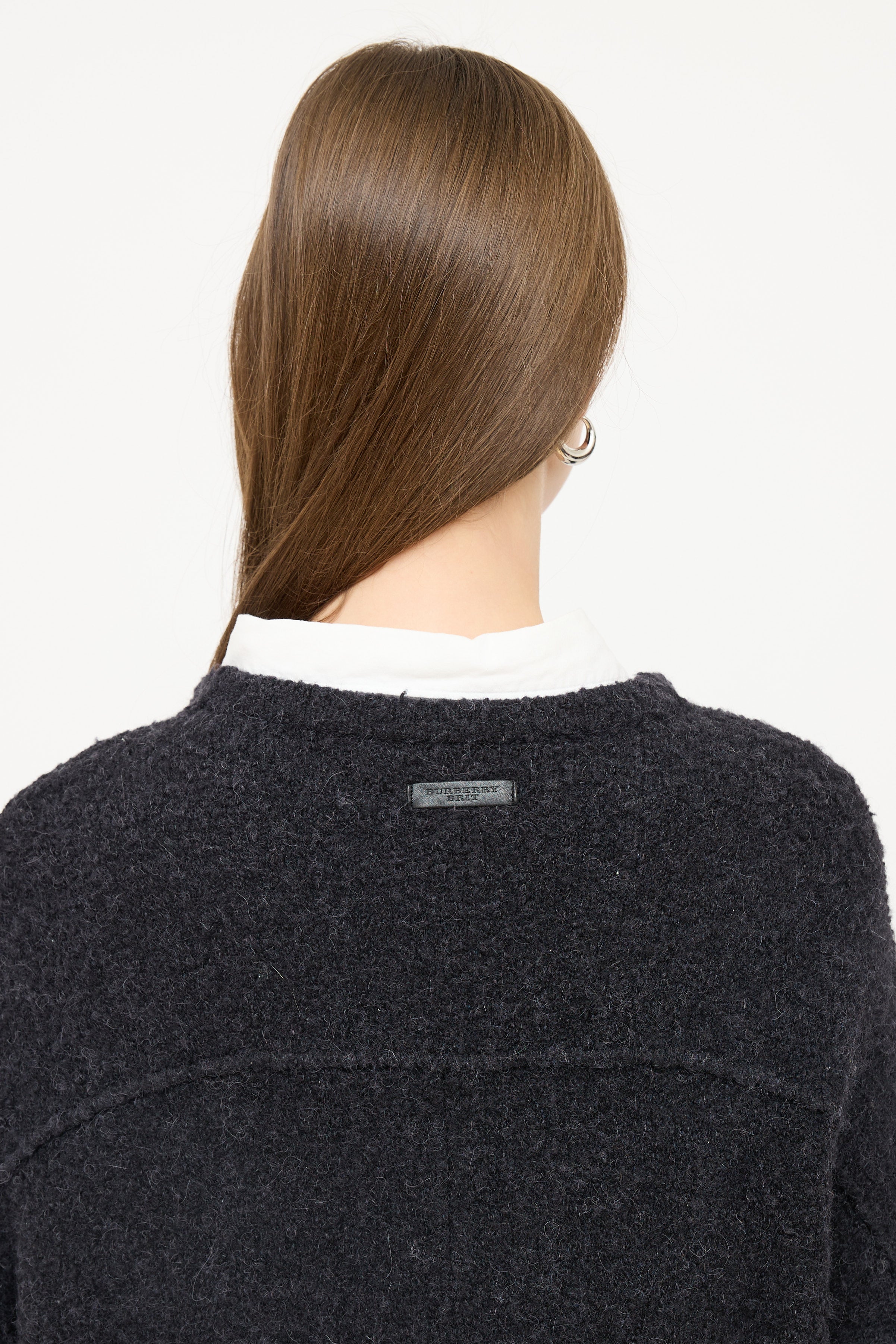 Pre-owned Burberry Brit dark grey wool boucle coat featuring a round neckline, long cuffed sleeves, two patch pockets at hip, leather logo patch at back, and snap button up closure.