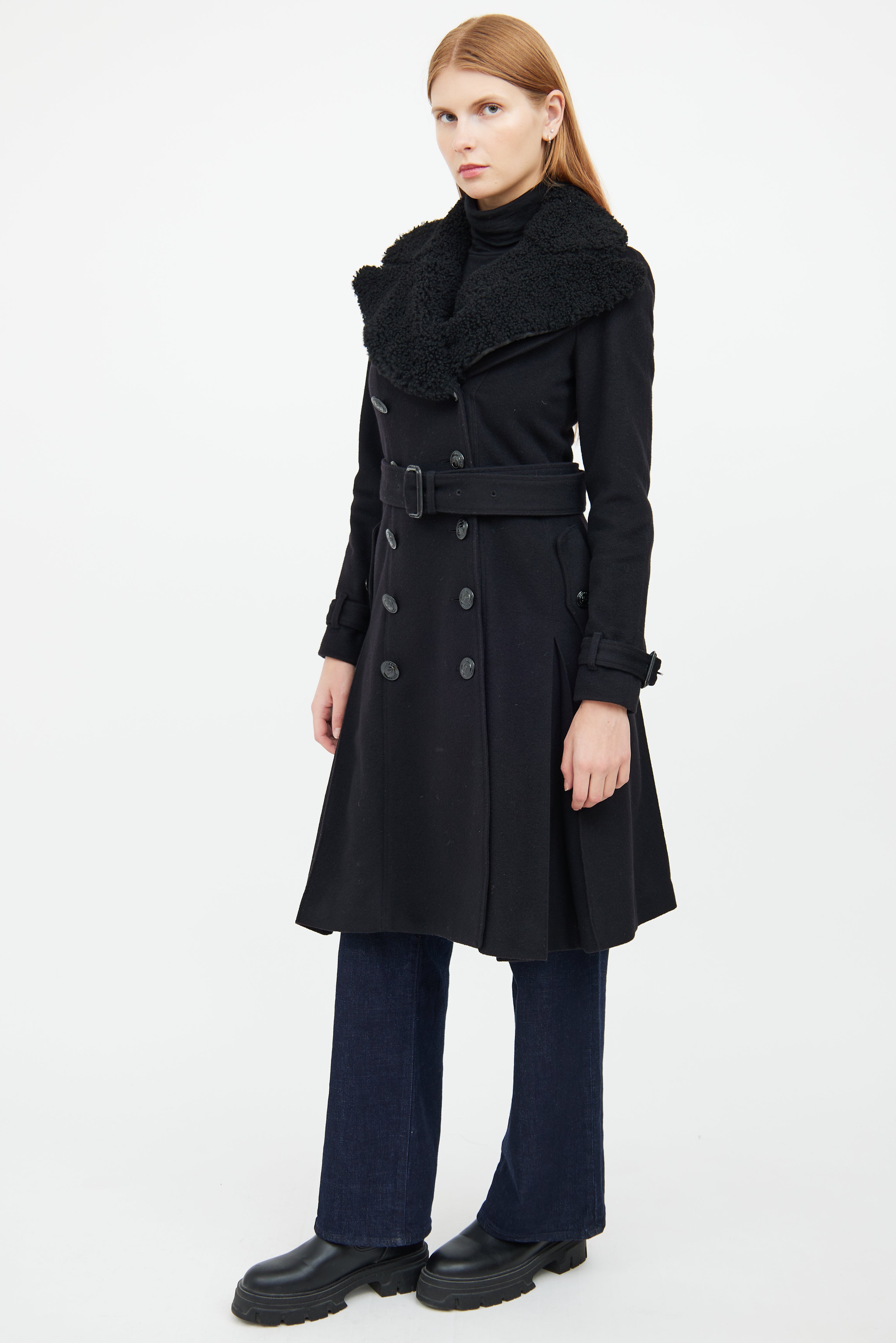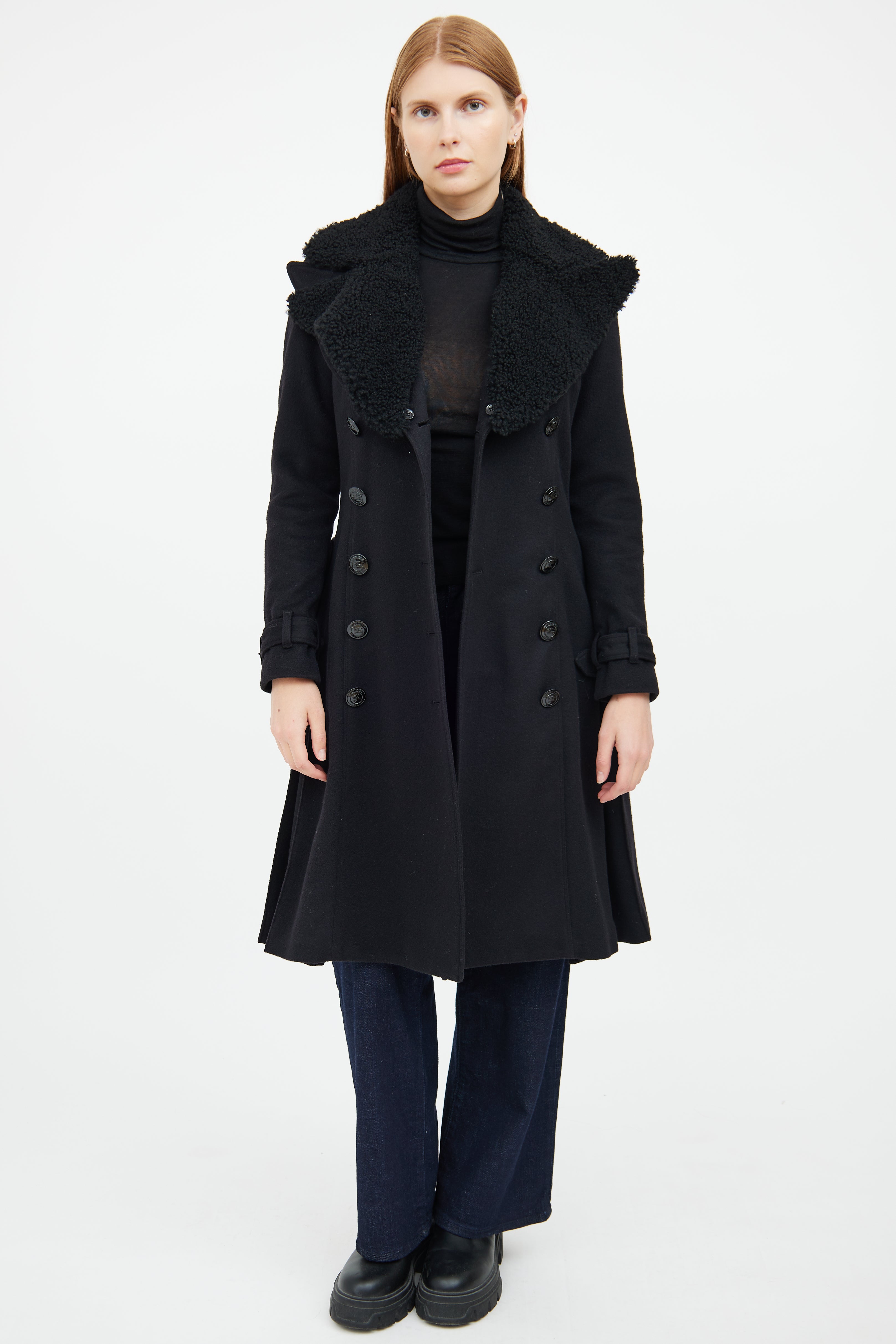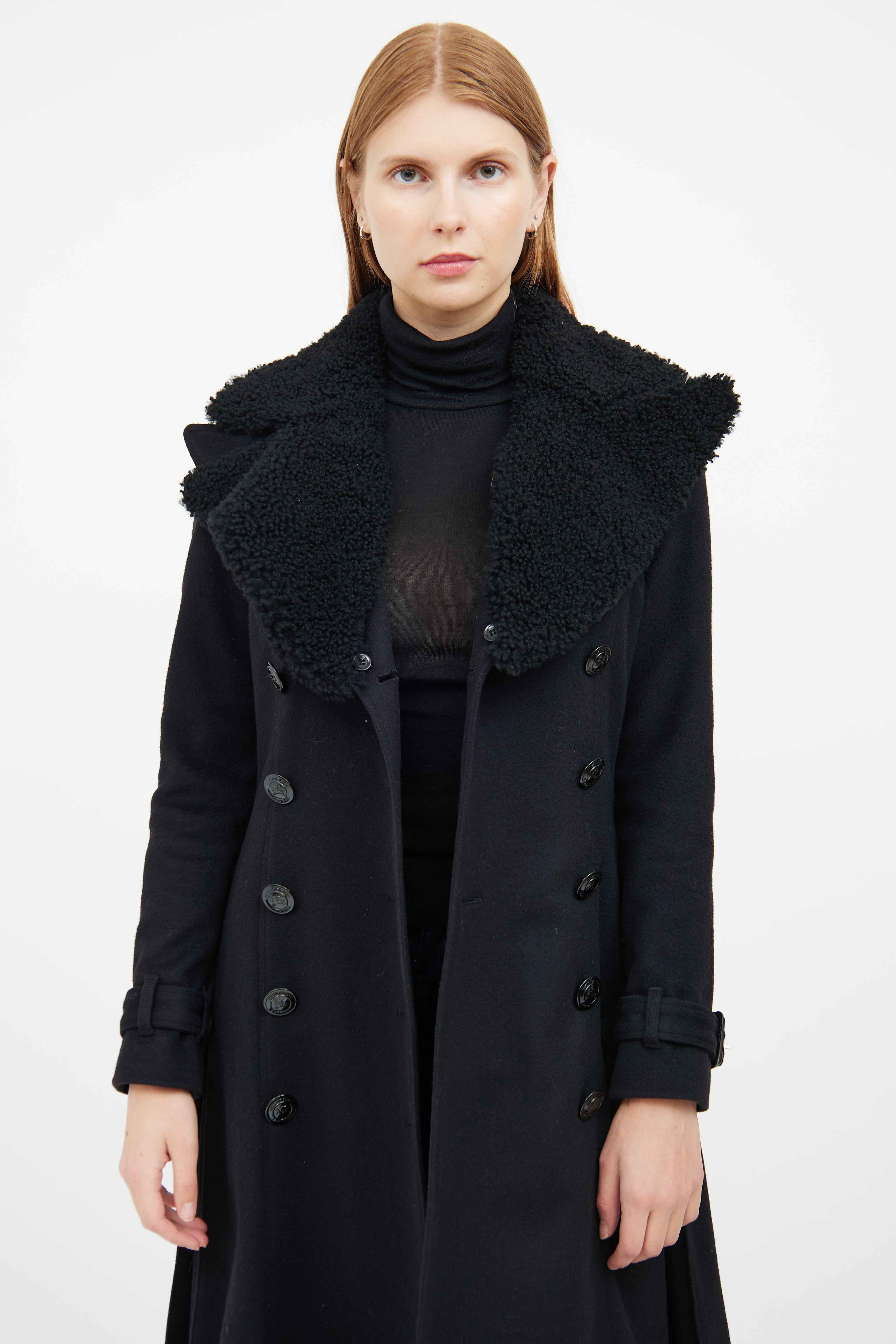 Pre-owned Burberry London black wool jacket featuring double breasted closure with logo buttons, long sleeves with cuff straps, two pockets with button closure, removable shearling collar, storm flap at back, three inverted pleats at hem and fully lined.