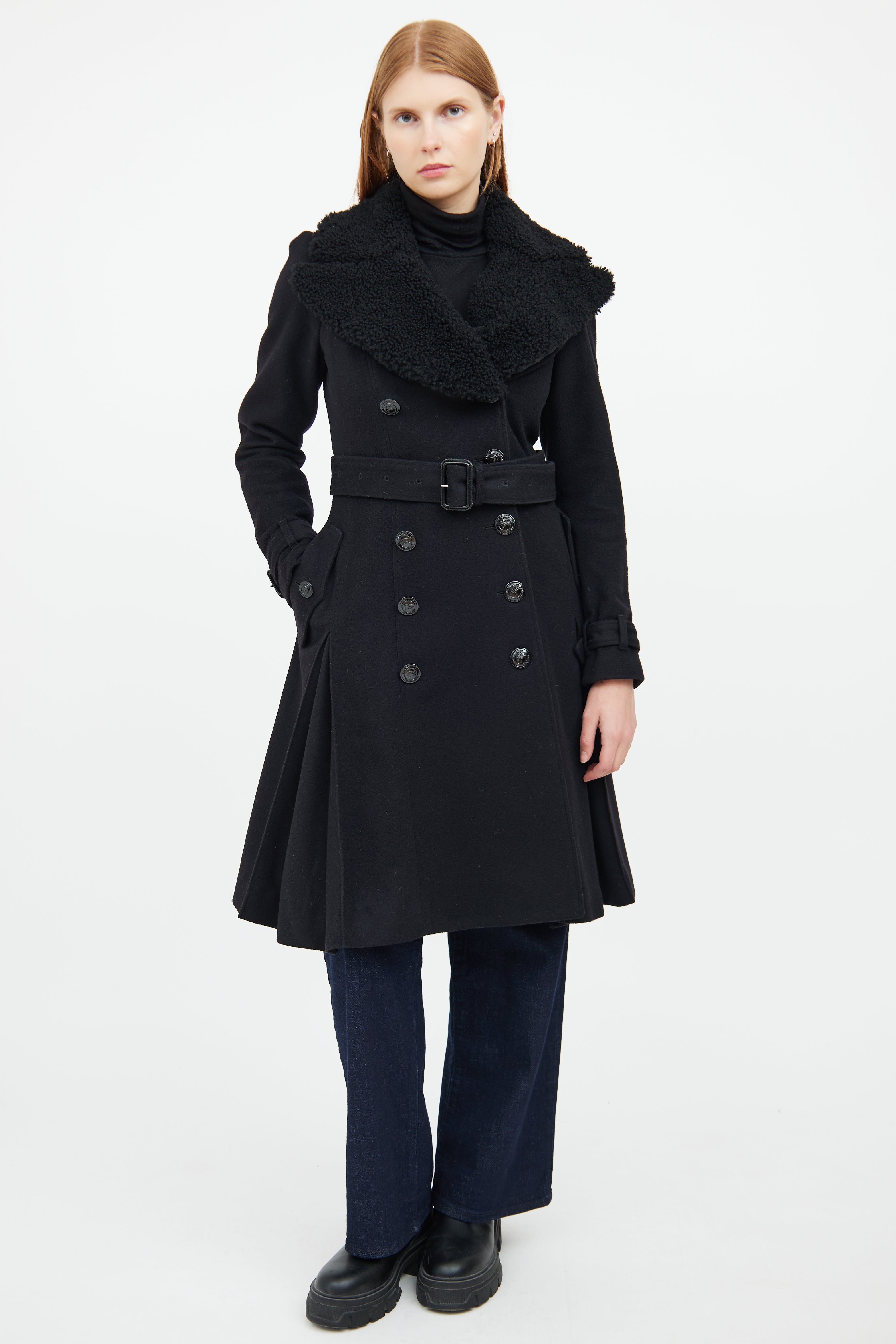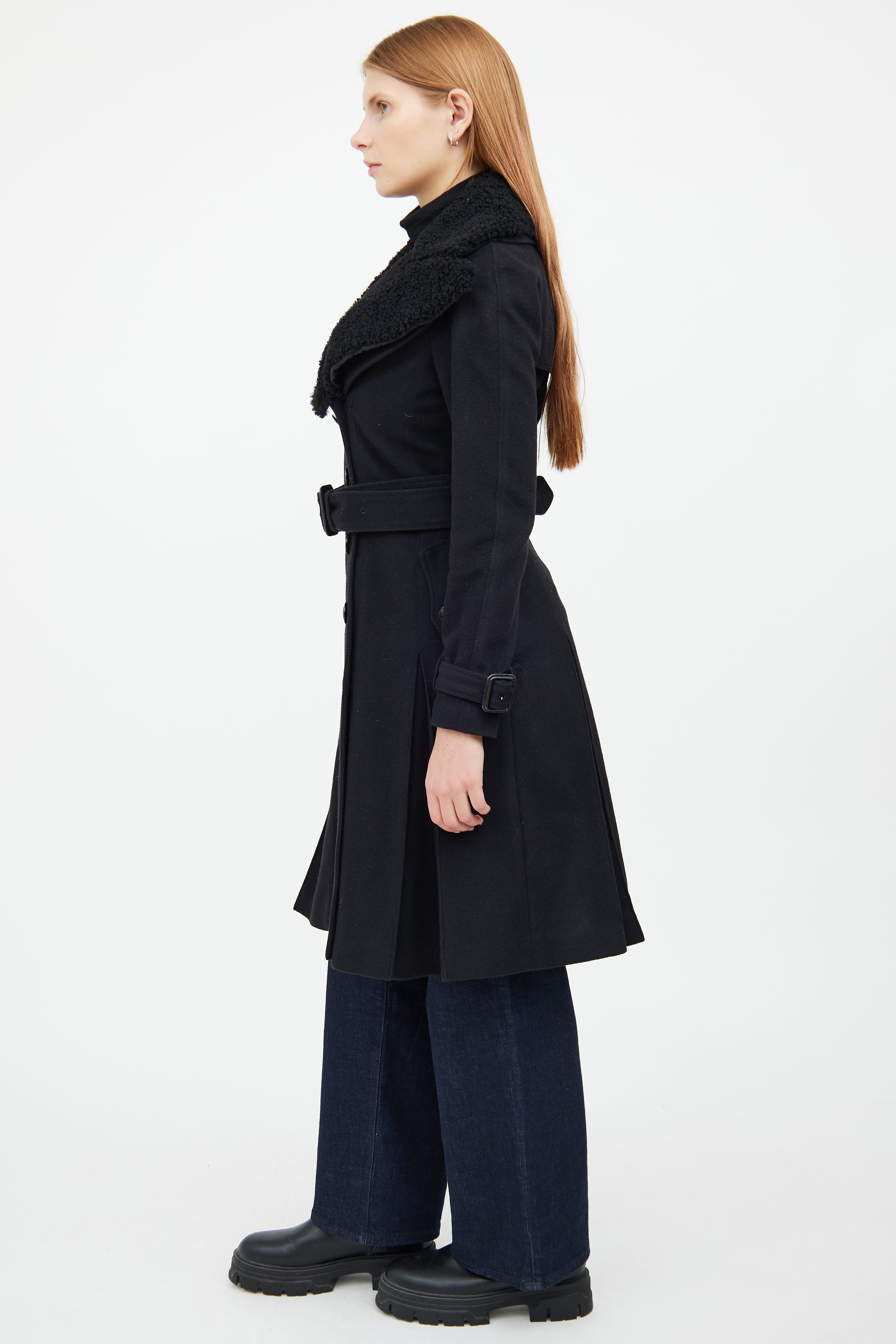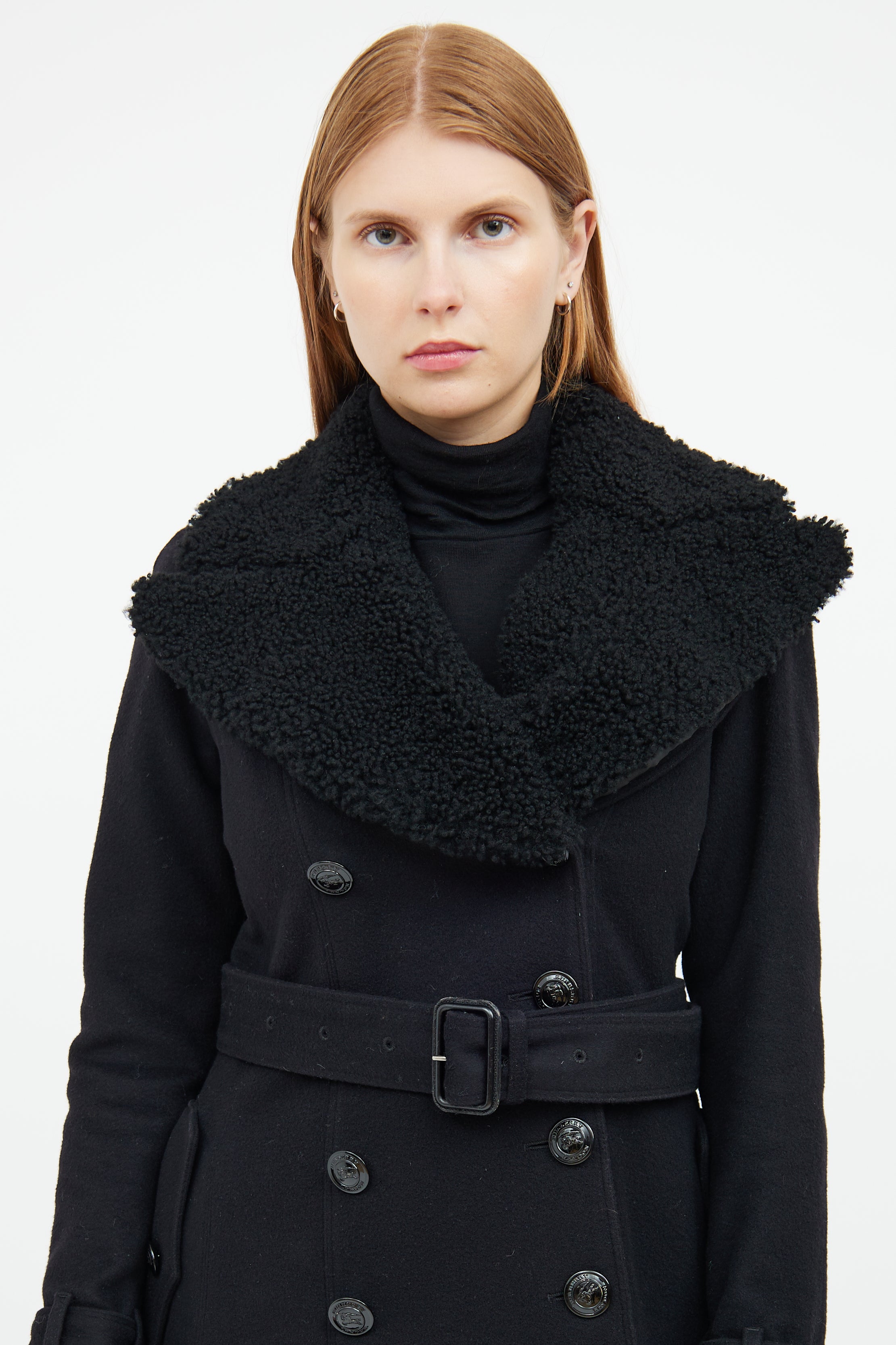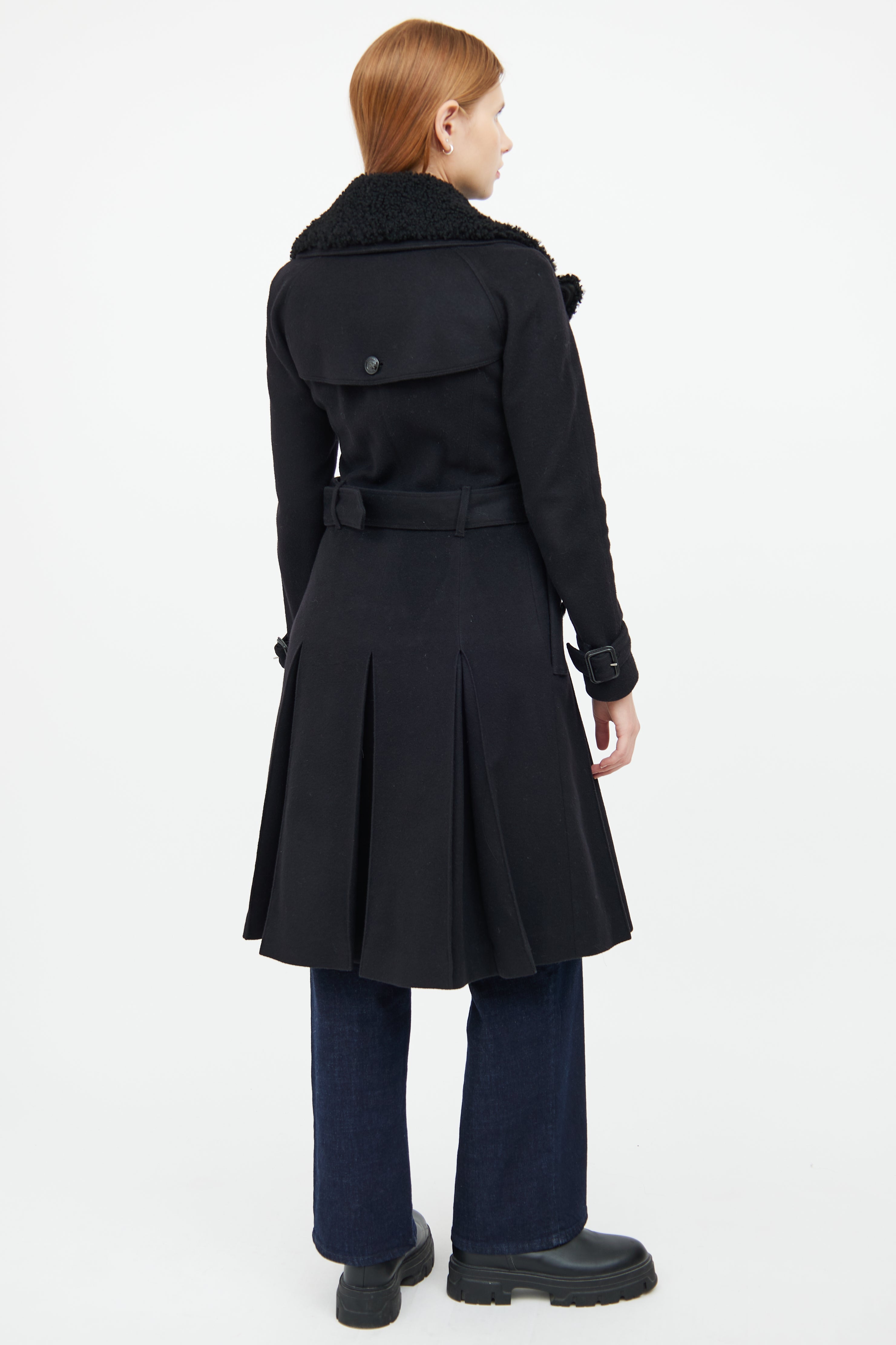 Pre-owned Burberry London black wool jacket featuring double breasted closure with logo buttons, long sleeves with cuff straps, two pockets with button closure, removable shearling collar, storm flap at back, three inverted pleats at hem and fully lined.