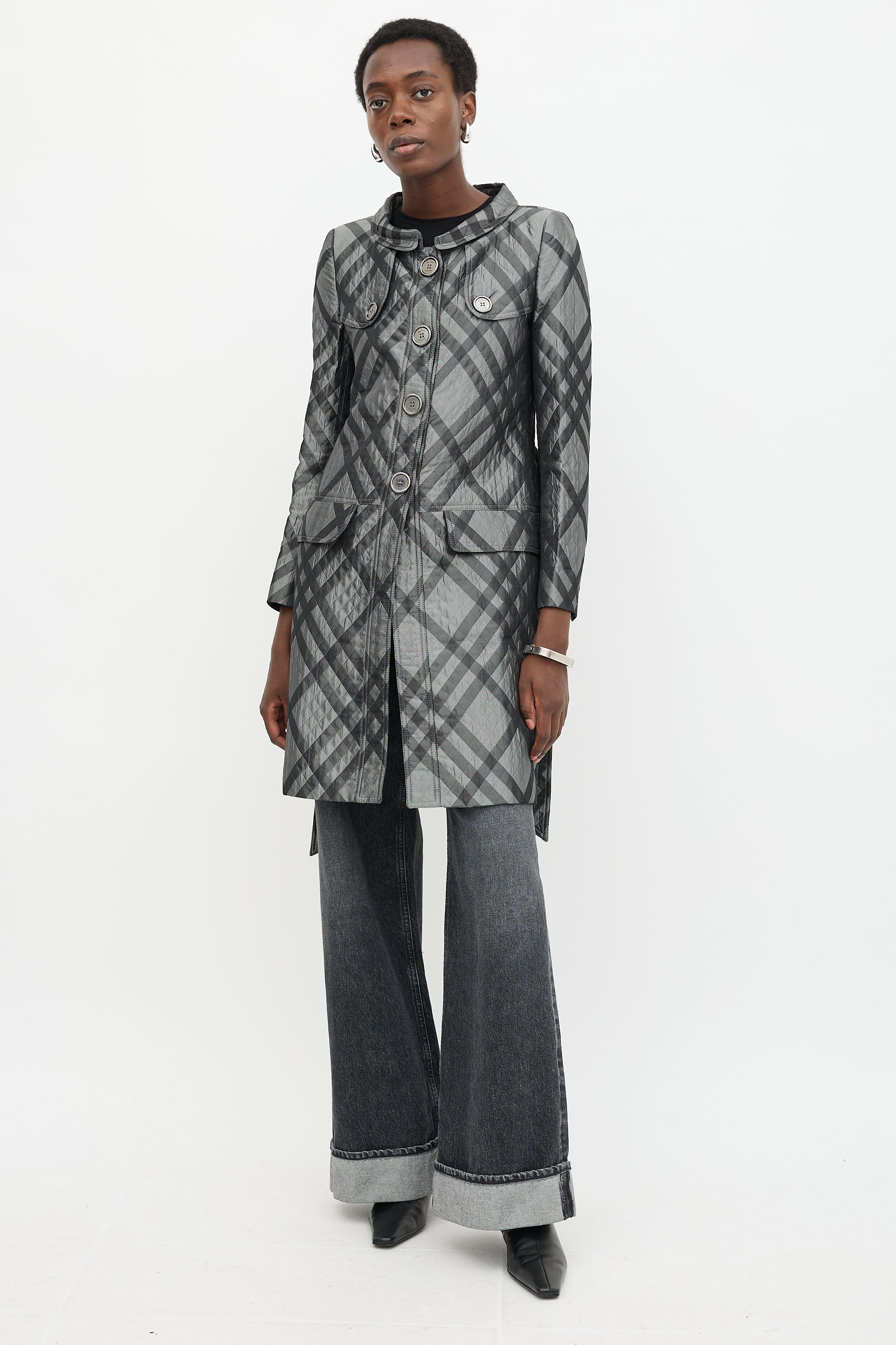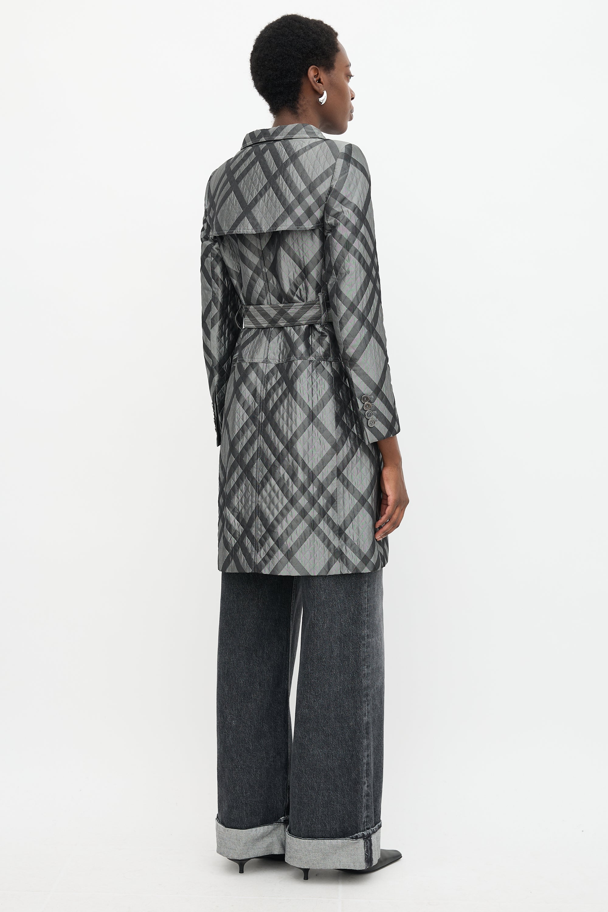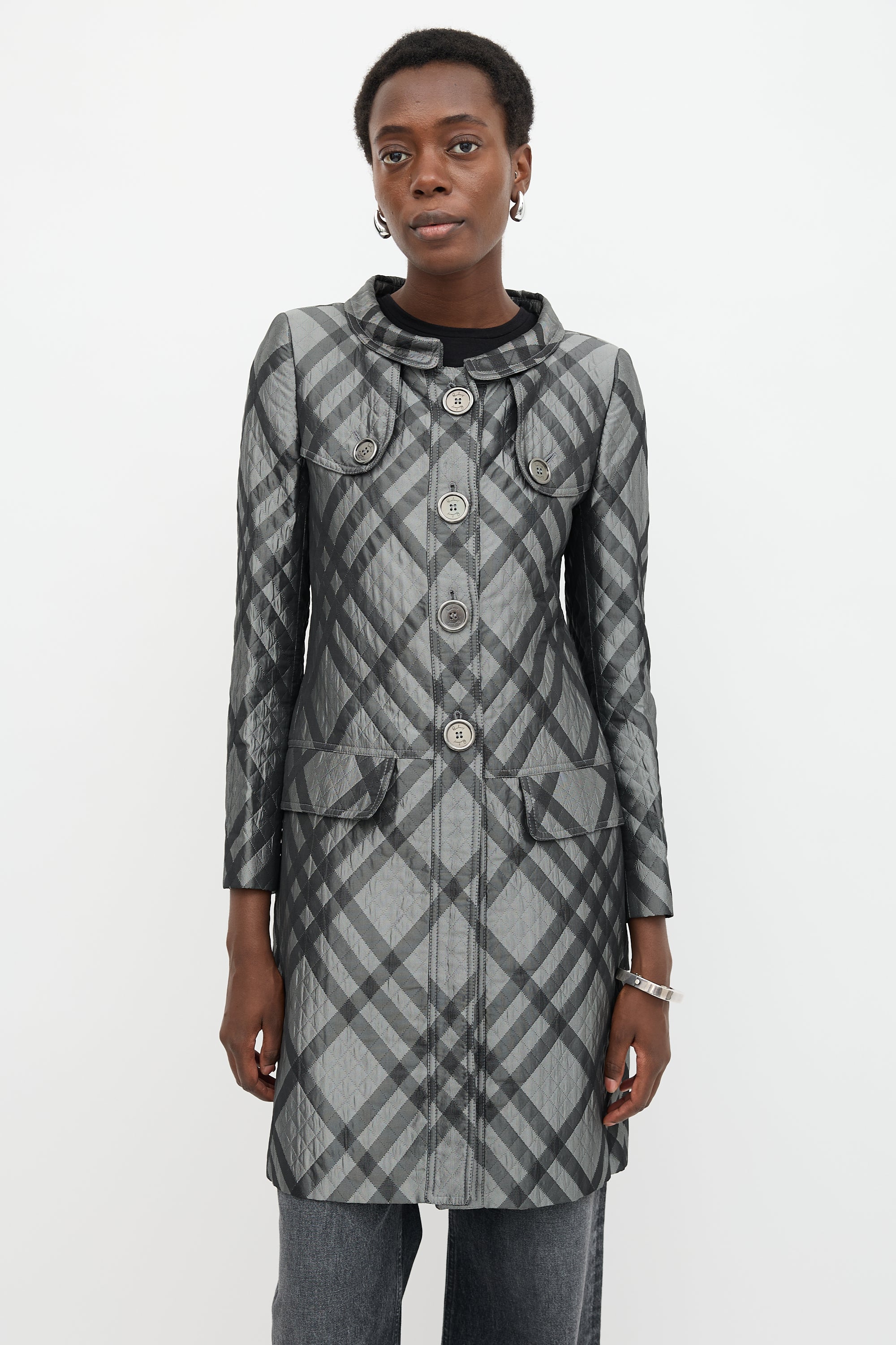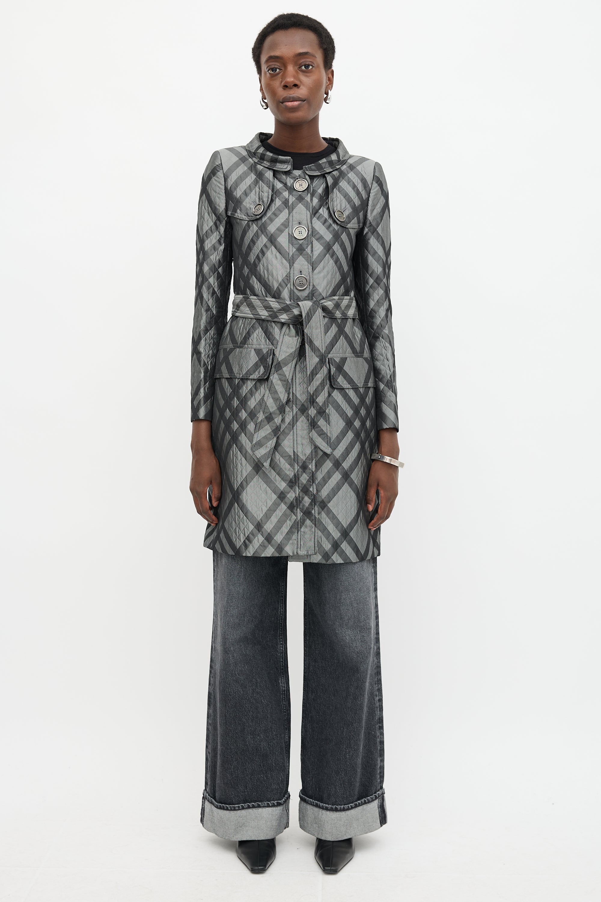 Pre-owned Burberry grey satin quilted coat featuring a check pattern throughout, club collar, buttoned storm guards, back storm shield, matching self-tie waist belt, button front, padded shoulders, two flap pockets at front, and buttoned cuffs. Lined.