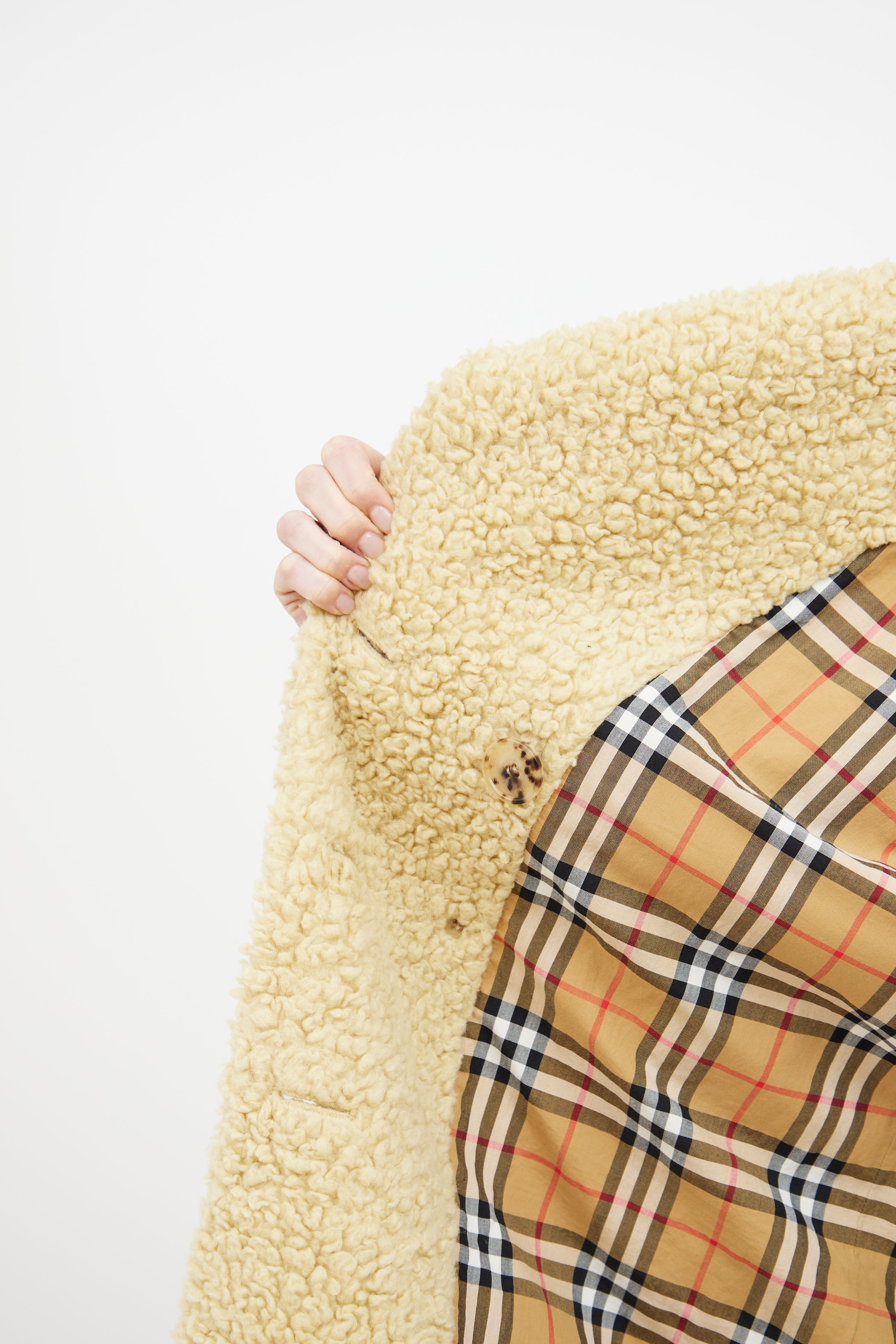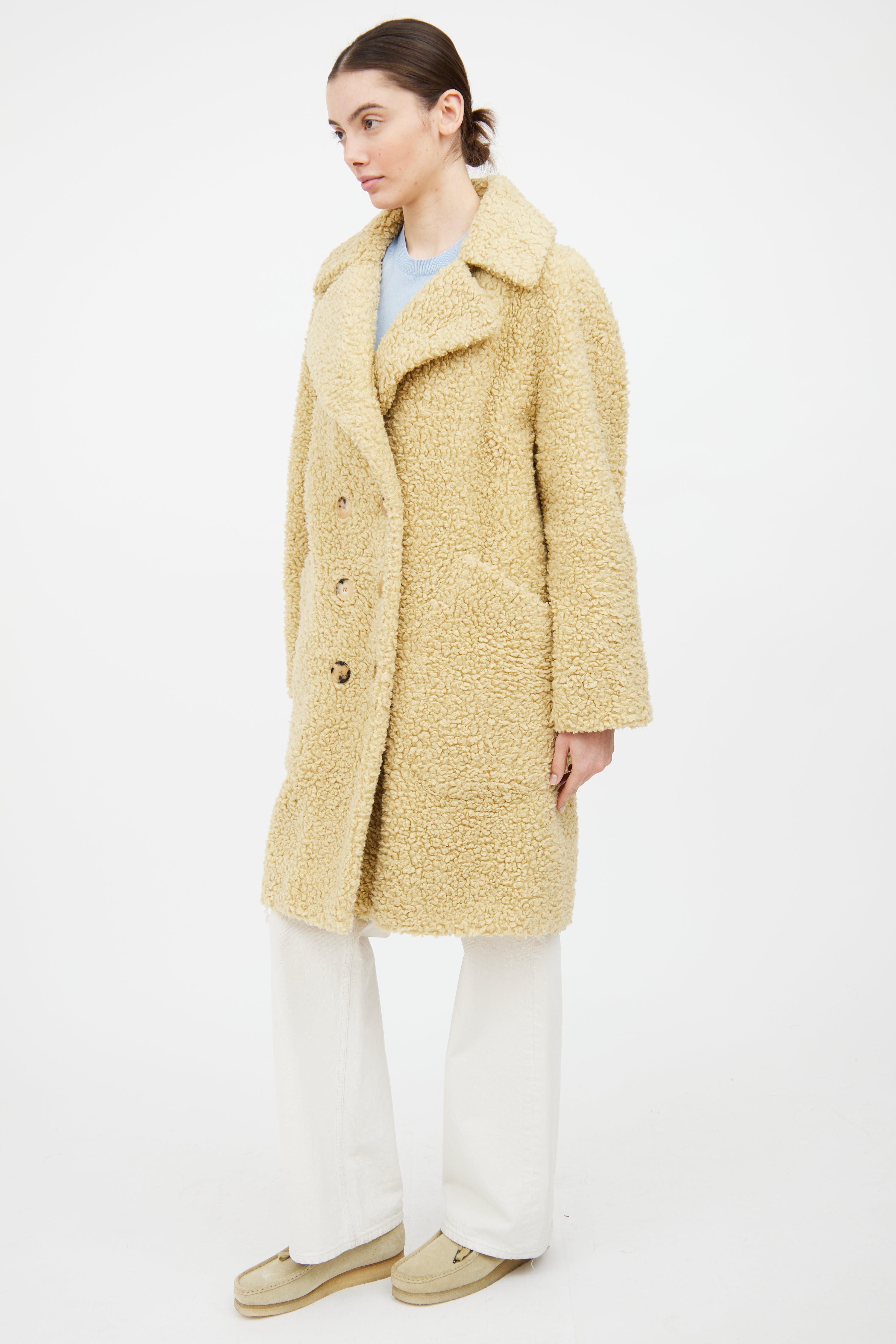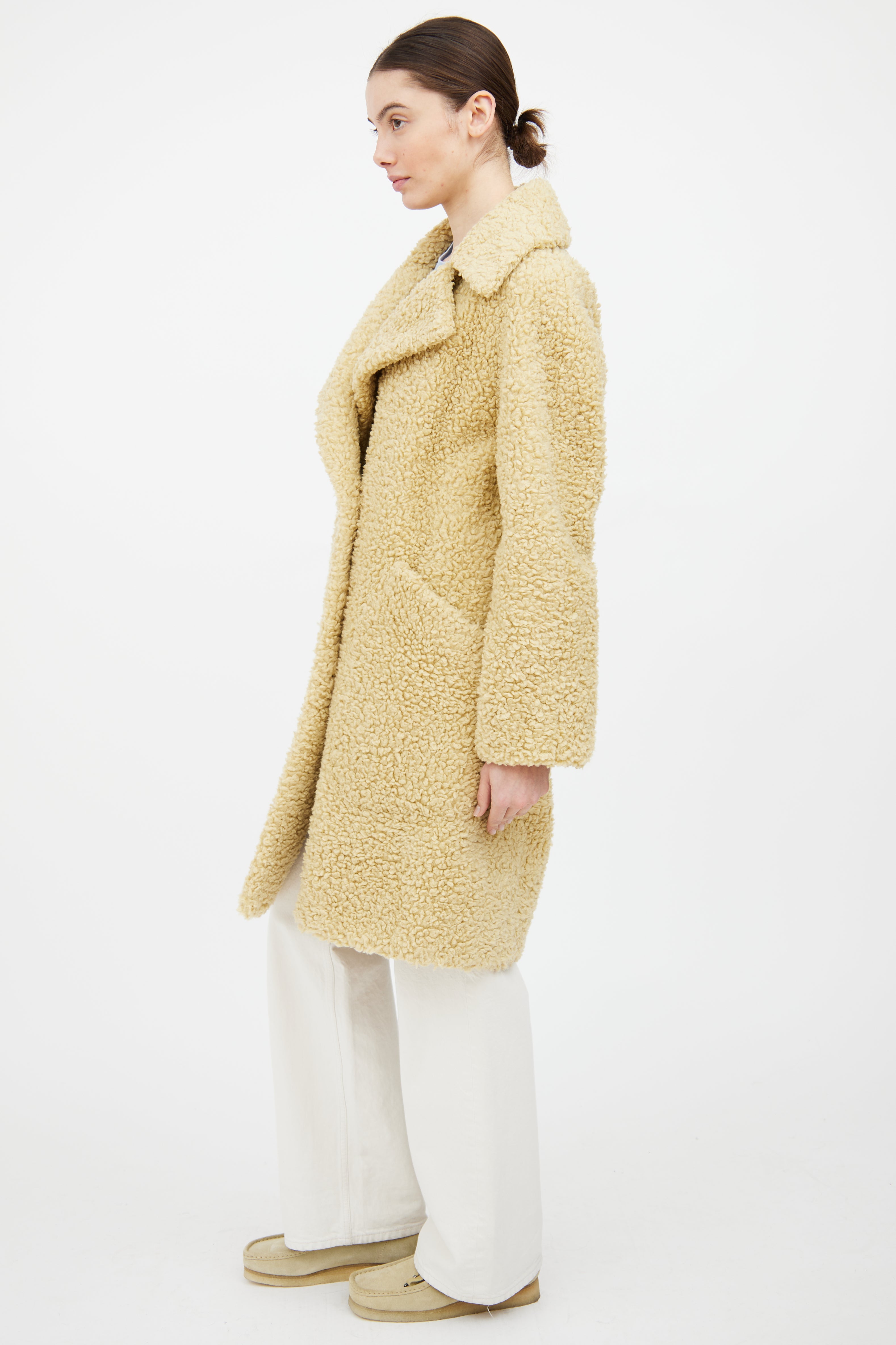 Pre-owned Burberry yellow teddy coat featuring a notched lapel, long sleeves, two slip pockets at hip, and button up closure. Lined.
