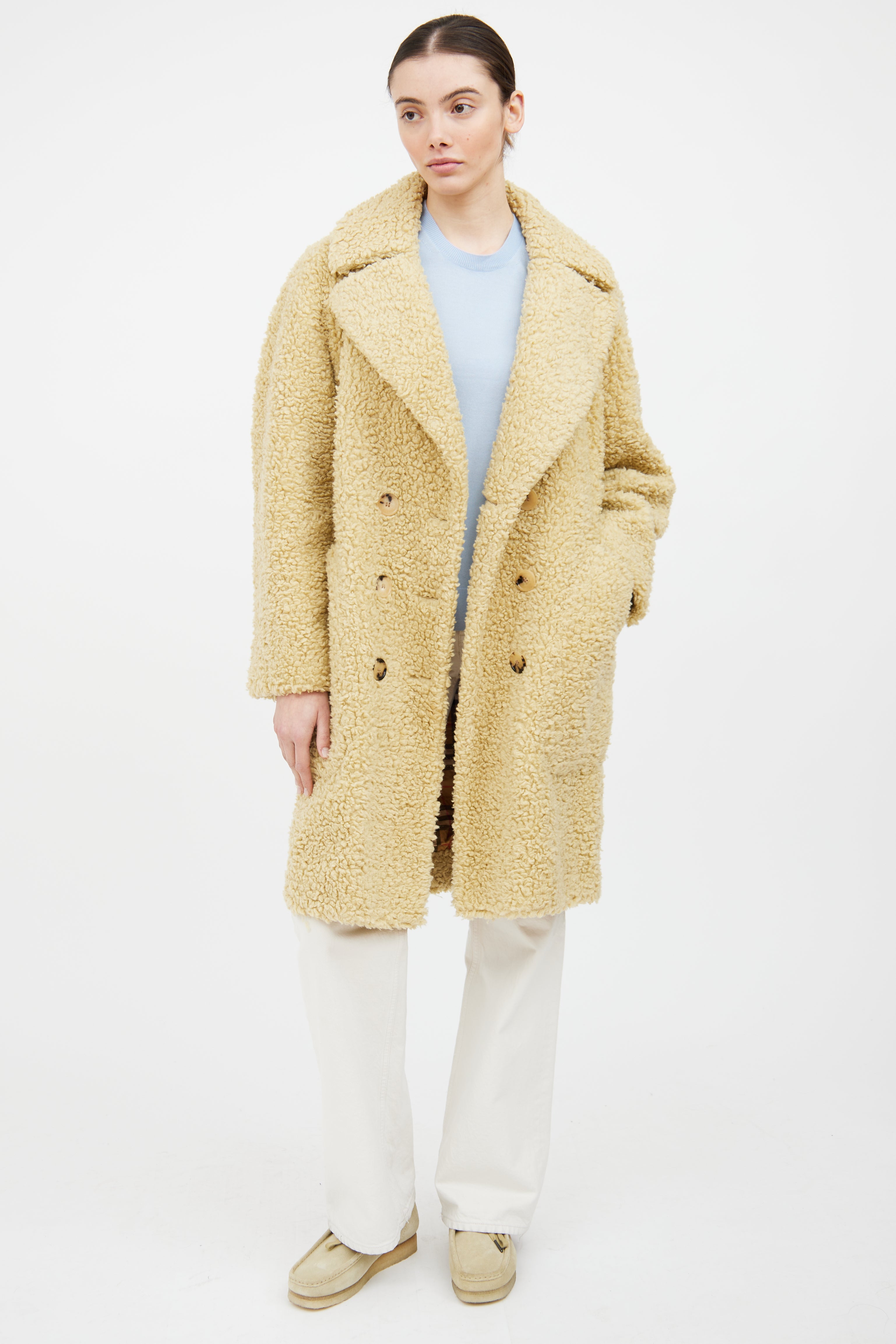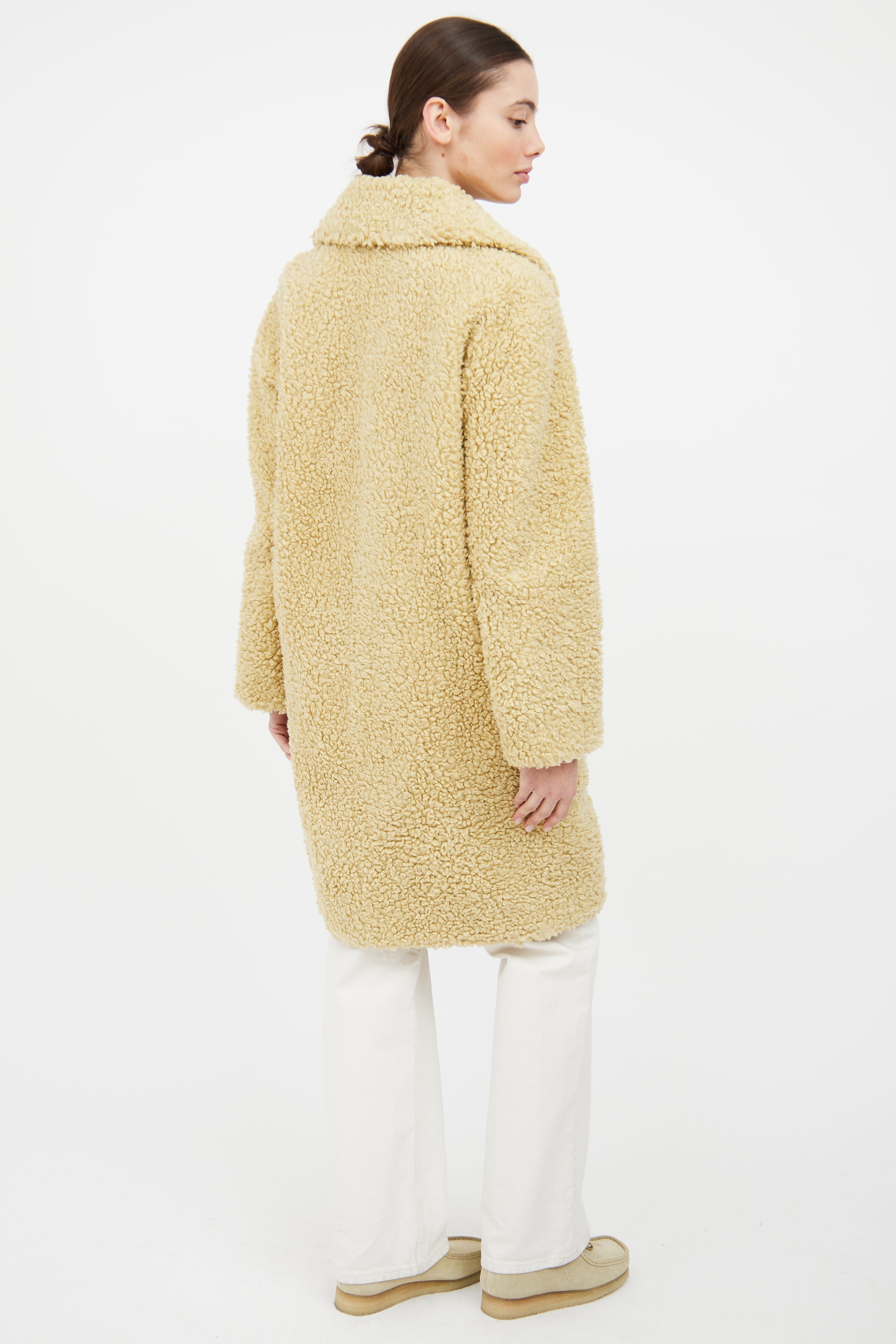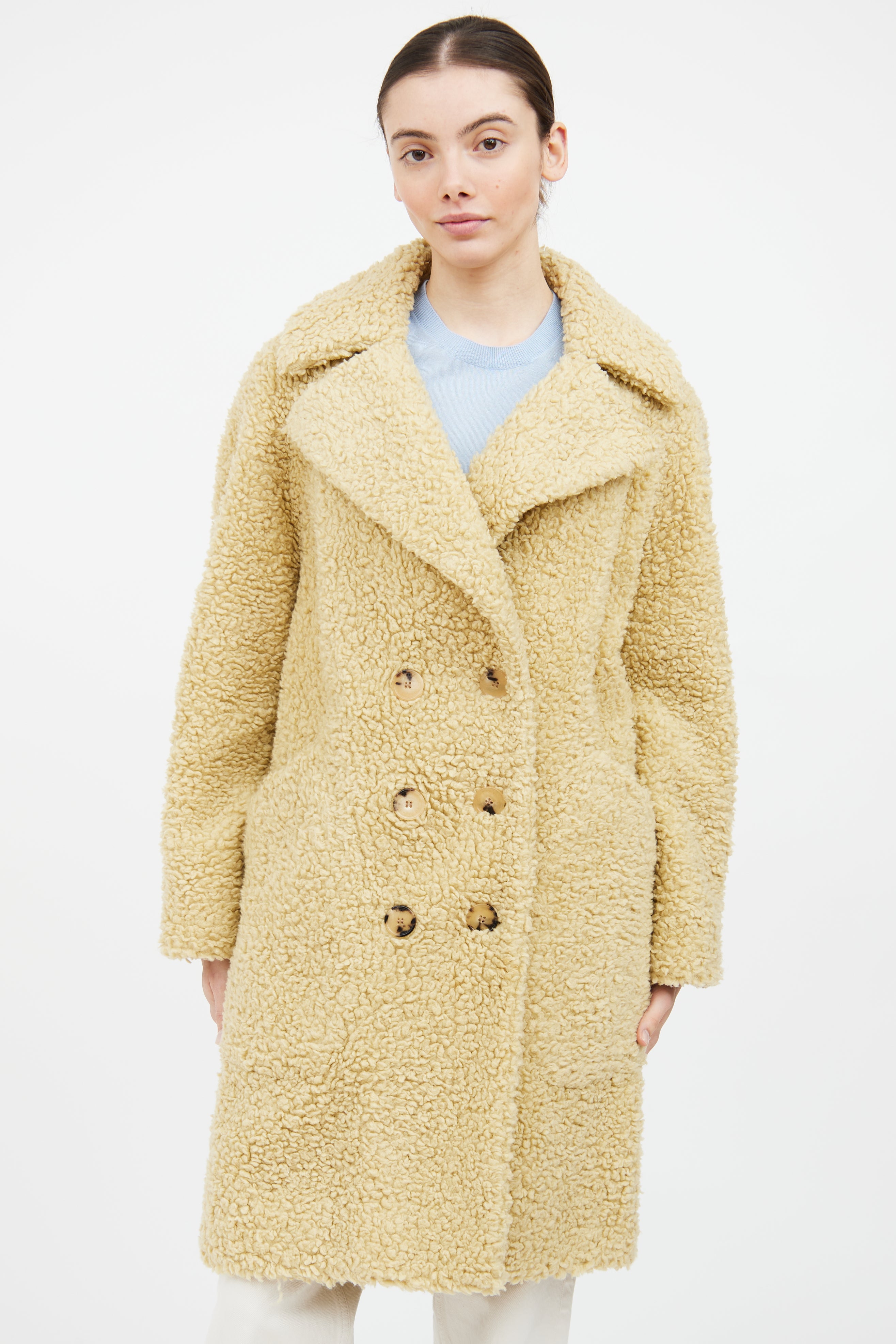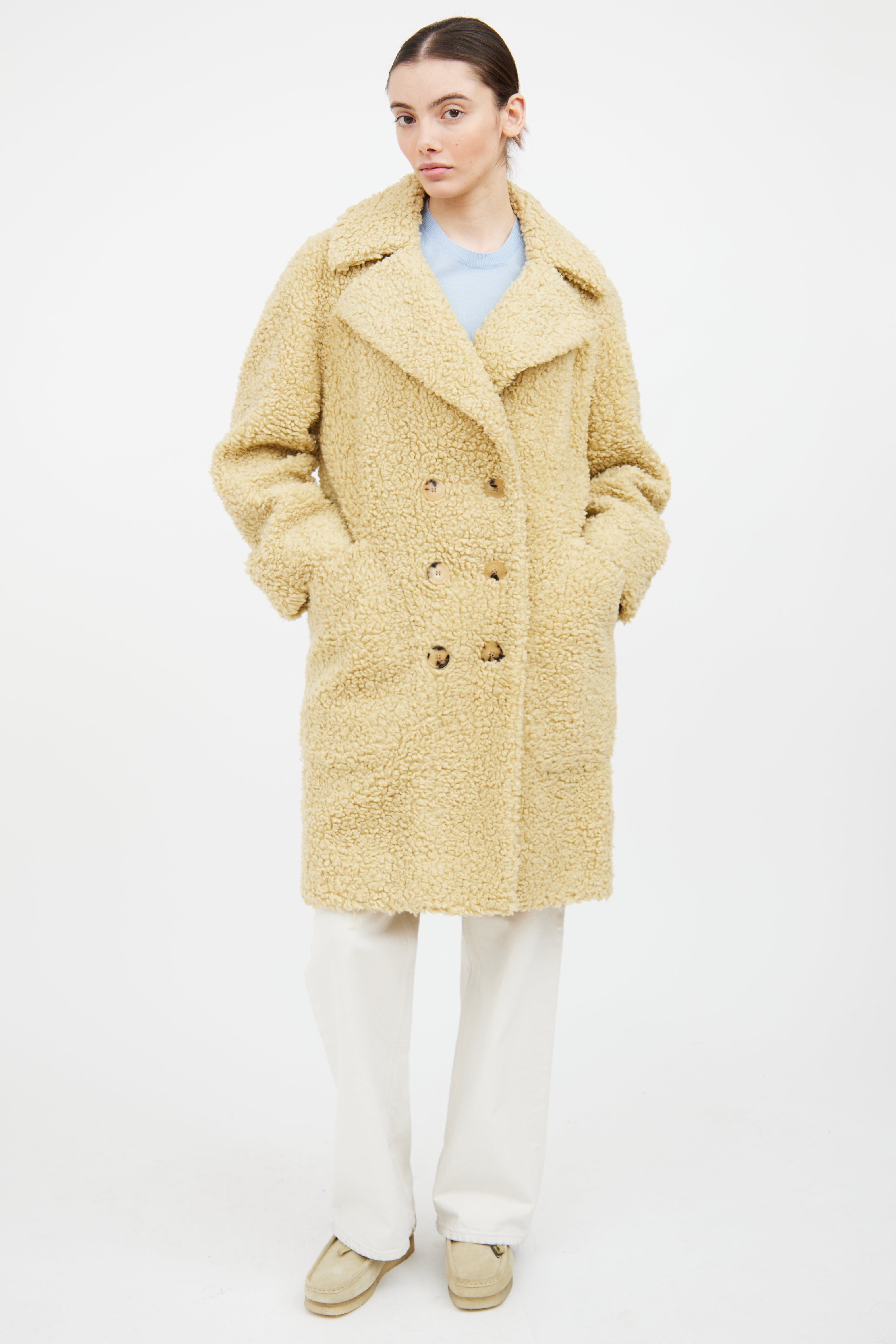 Pre-owned Burberry yellow teddy coat featuring a notched lapel, long sleeves, two slip pockets at hip, and button up closure. Lined.
