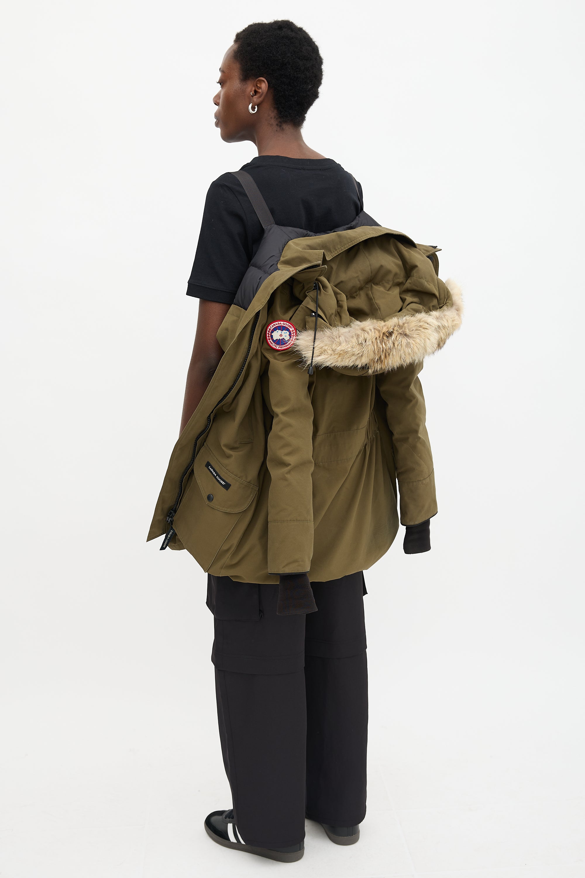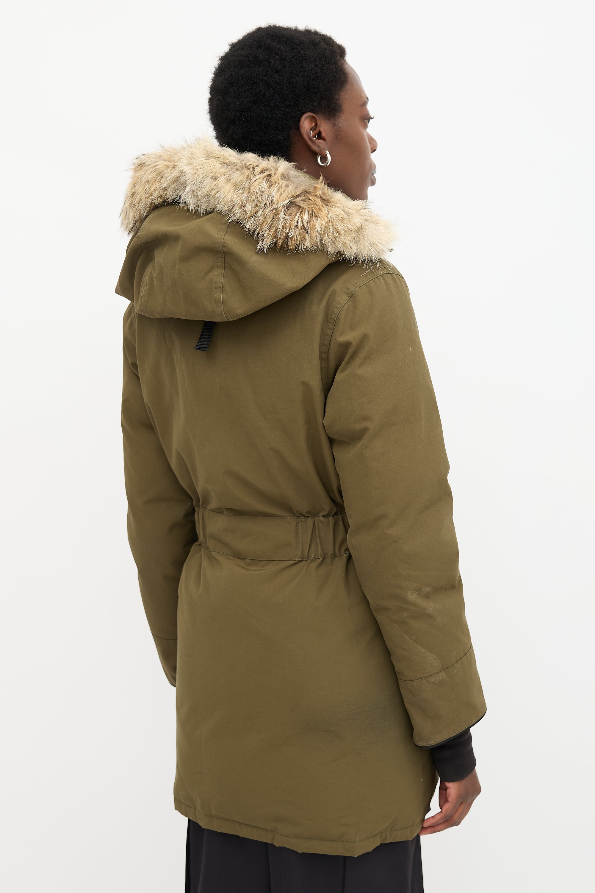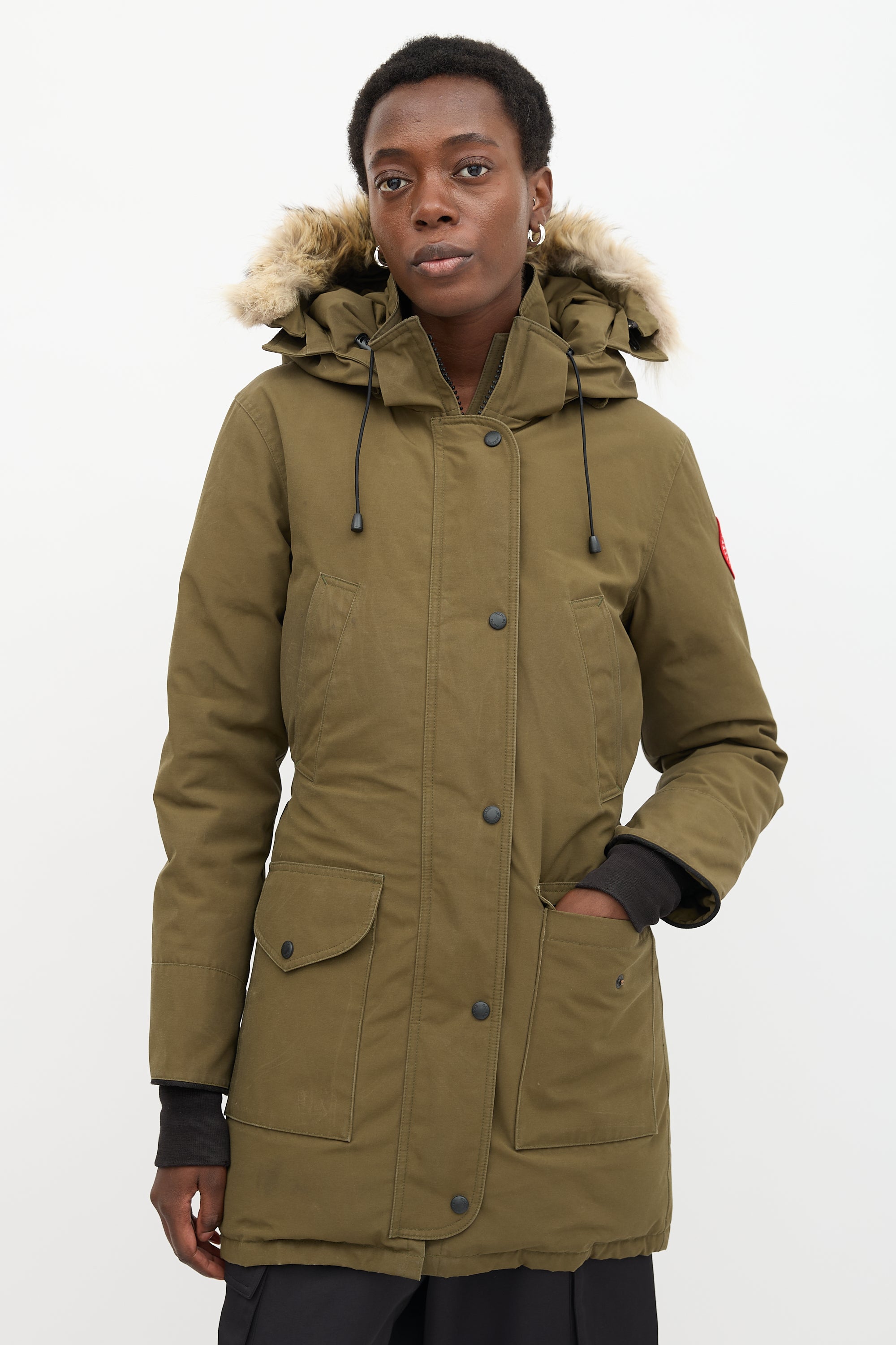 Pre-owned Canada Goose green down Trillium parka featuring a stand collar with detachable fur trimmed hood, front zip with snap button fastening, multicolour logo patch at left shoulder, welt pockets, patch pockets, interior shoulder straps, and layered ribbed cuffs. Lined.