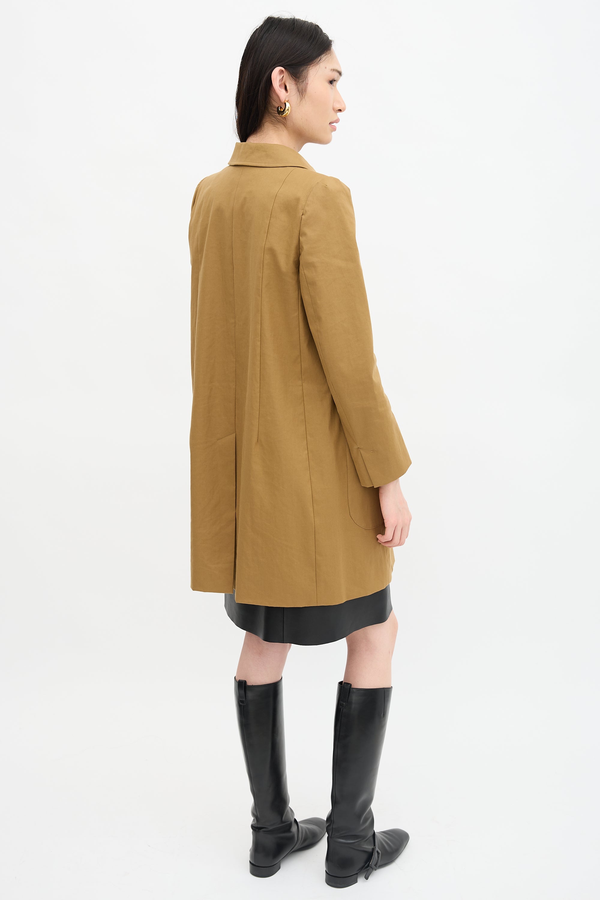Pre-owned Carven brown coat featuring Peter Pan collar, double breasted button front, four front pockets, back vent, padded puff shoulders, and slit cuffs. Lined.