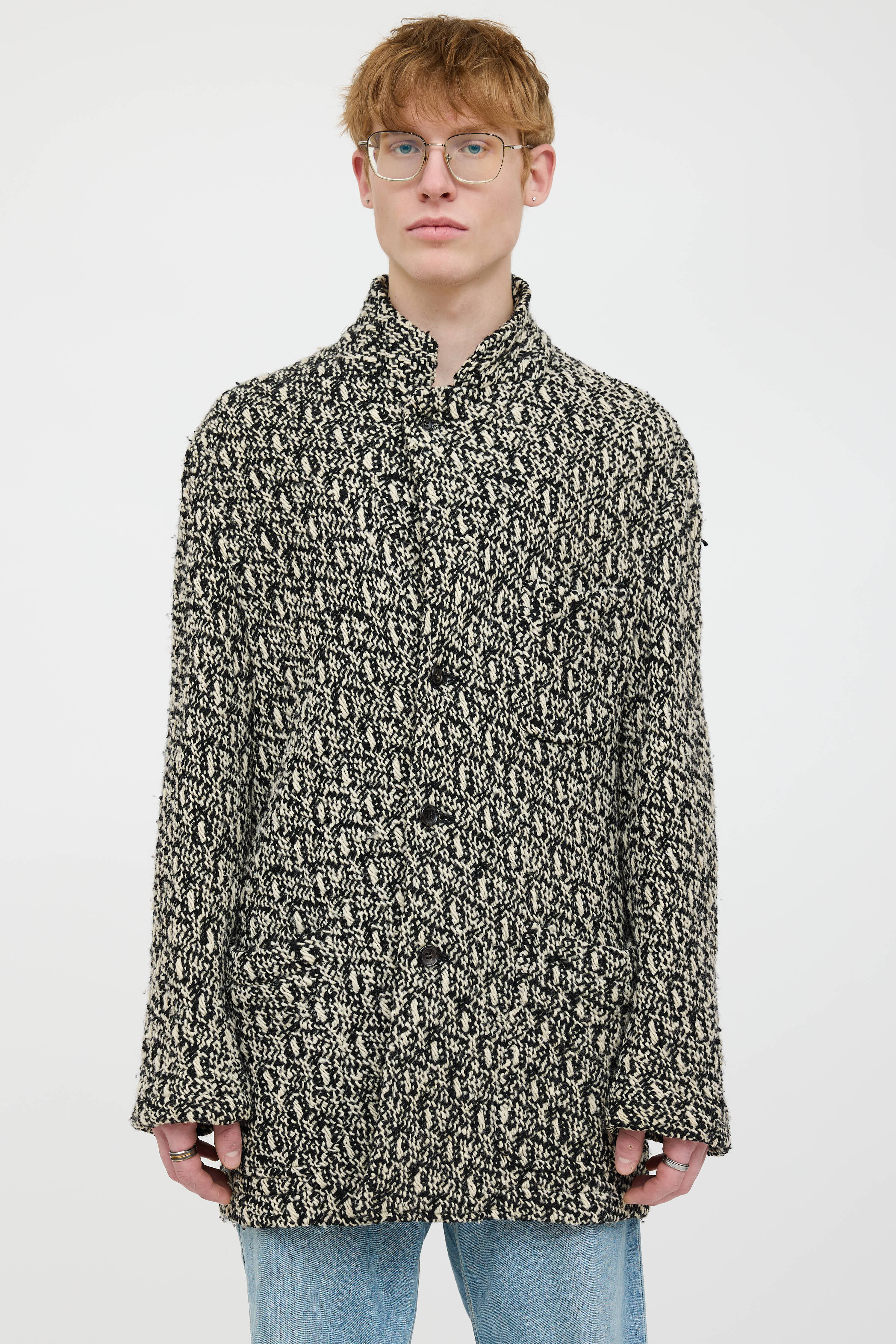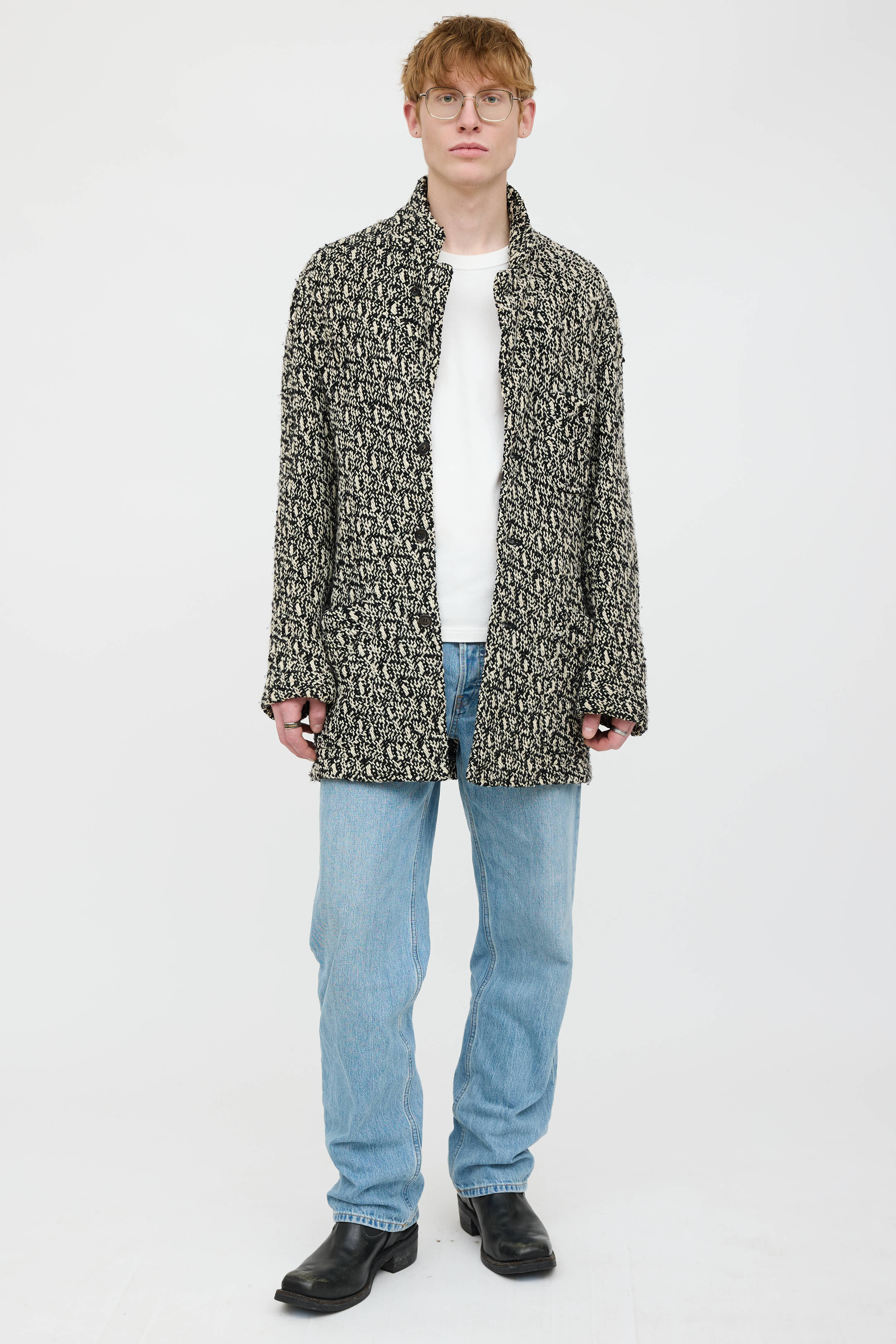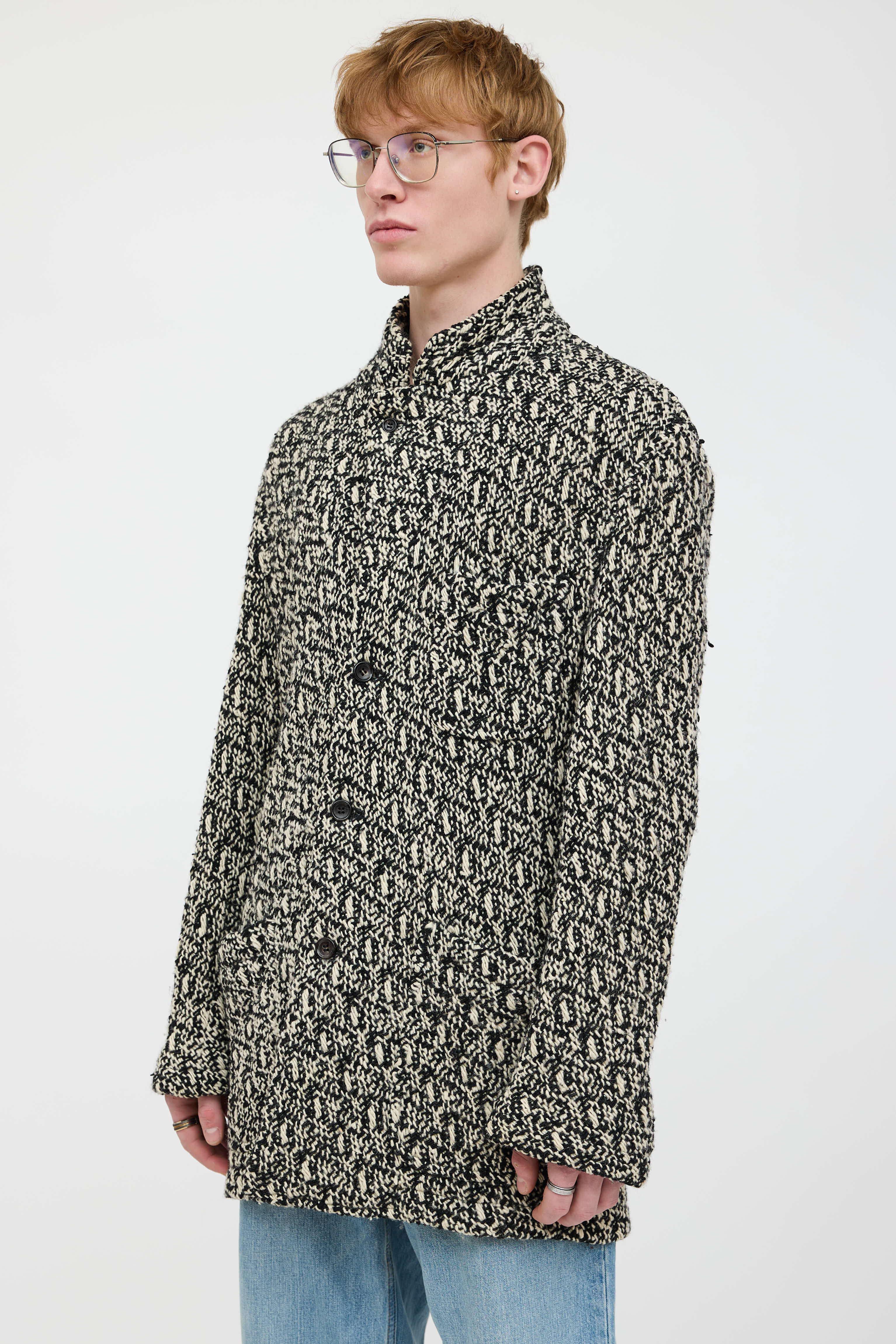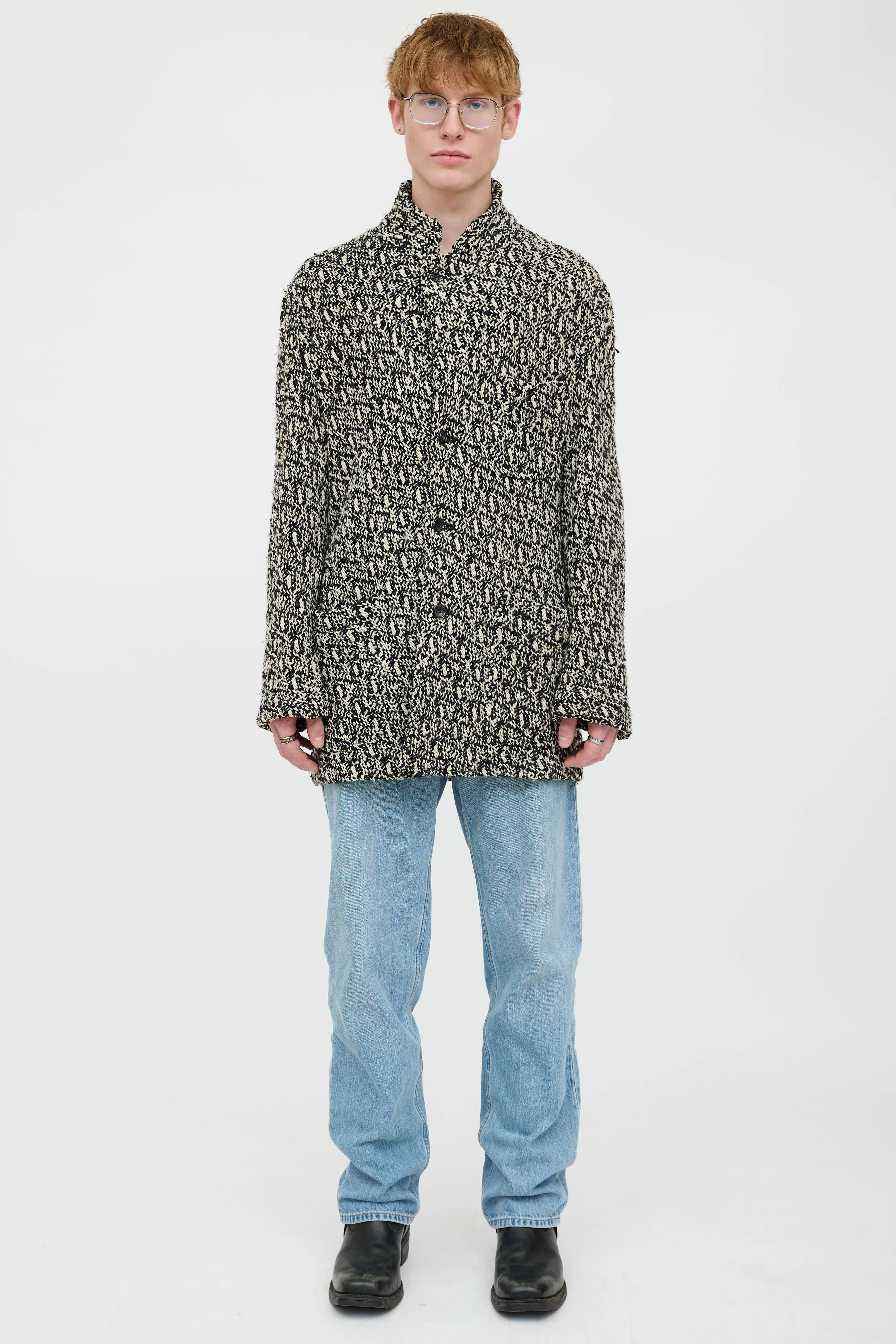 Pre-owned Comme des Garçons Homme Plus black wool coat featuring a white woven pattern throughout, notched collar, long sleeves, one patch pocket at chest, two patch pockets at hip, and button up closure.
